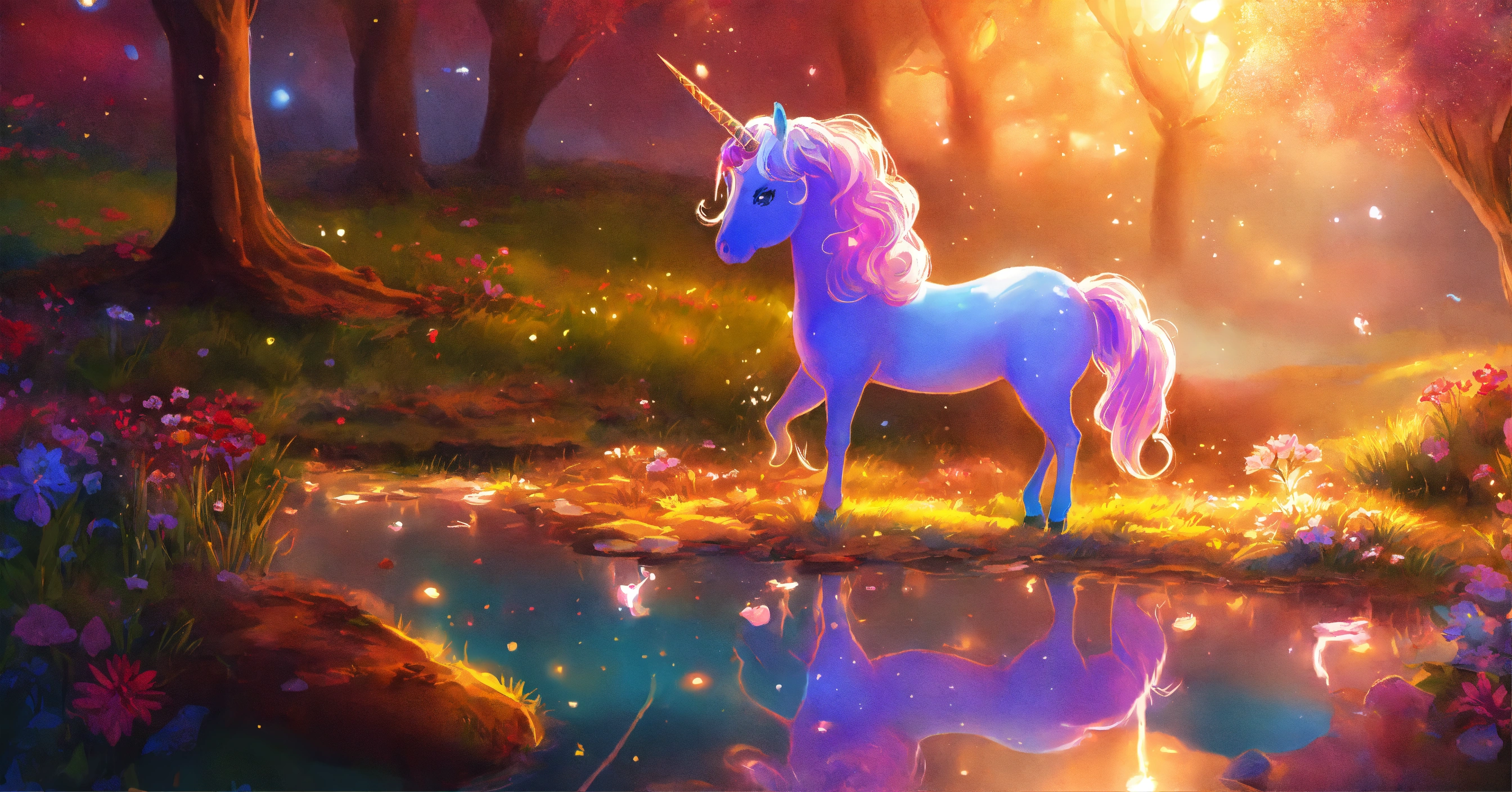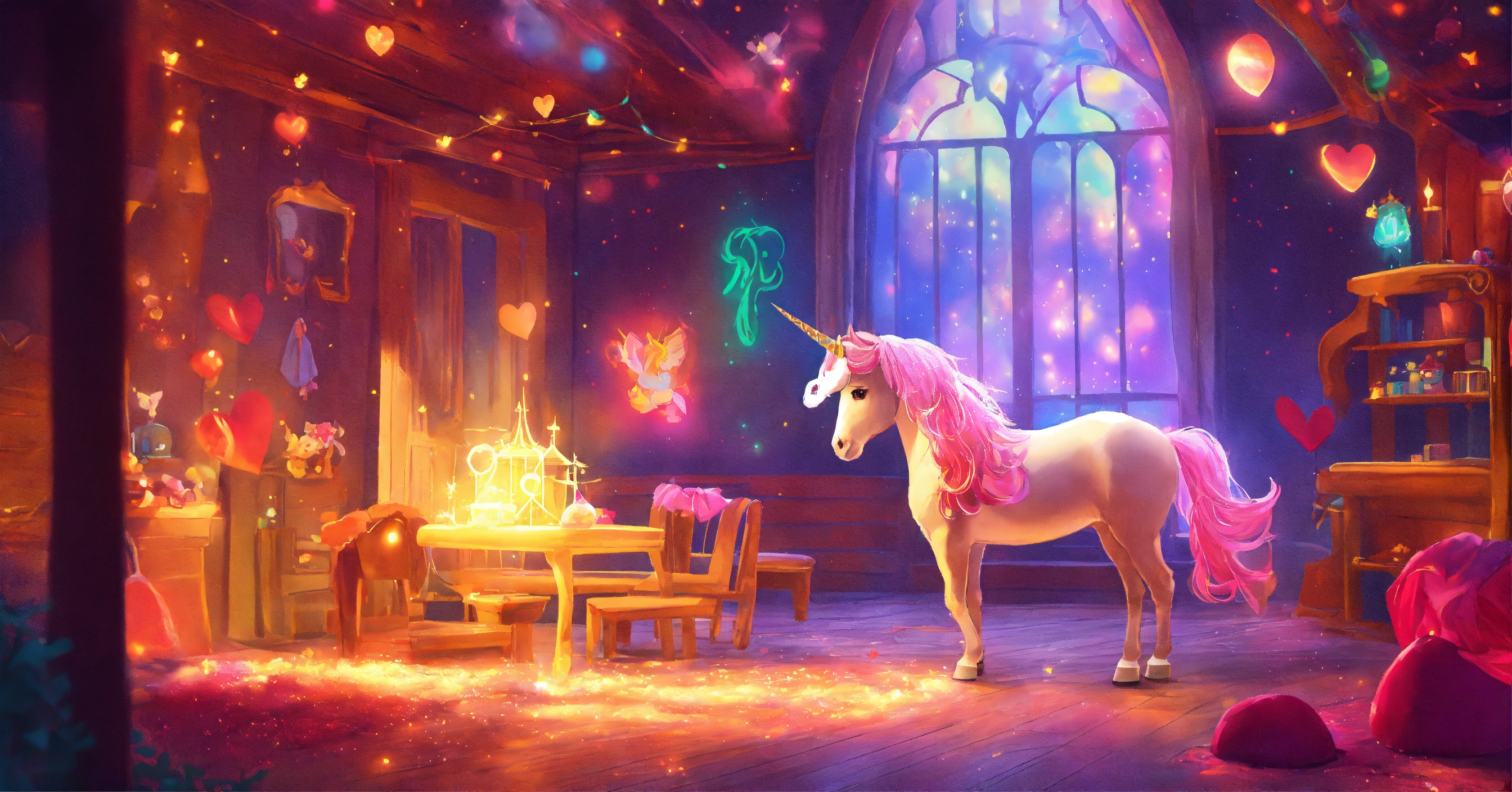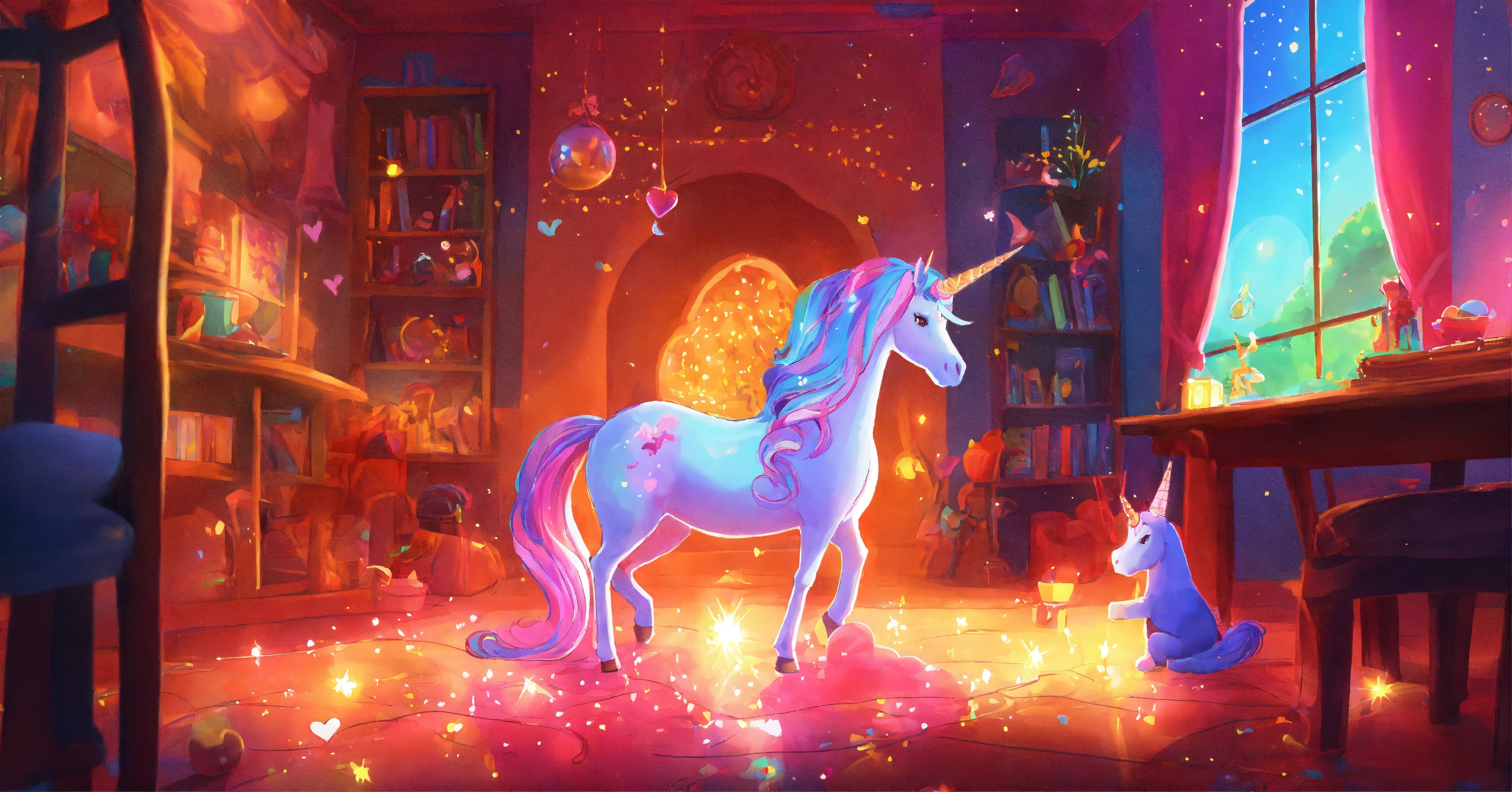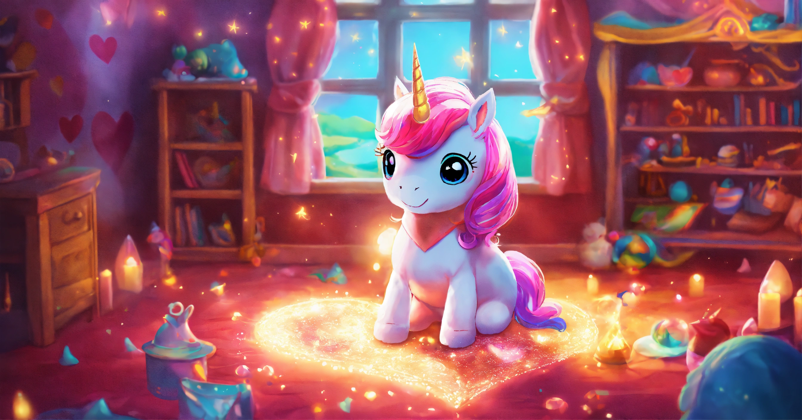 Dibuja una escena que refleje la luz interior de brillo el unicornio, demostrando que la verdadera magia reside en su corazón, 8k, colores vbrantes, estilo cuento para niños.