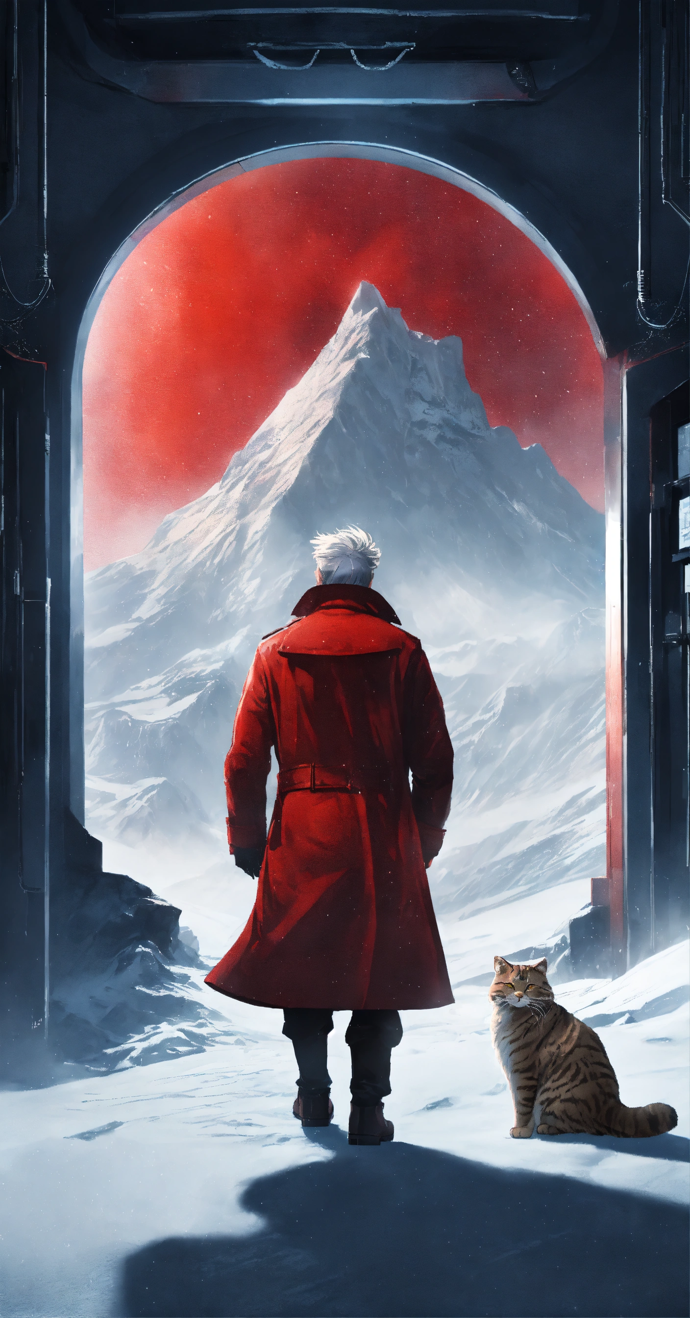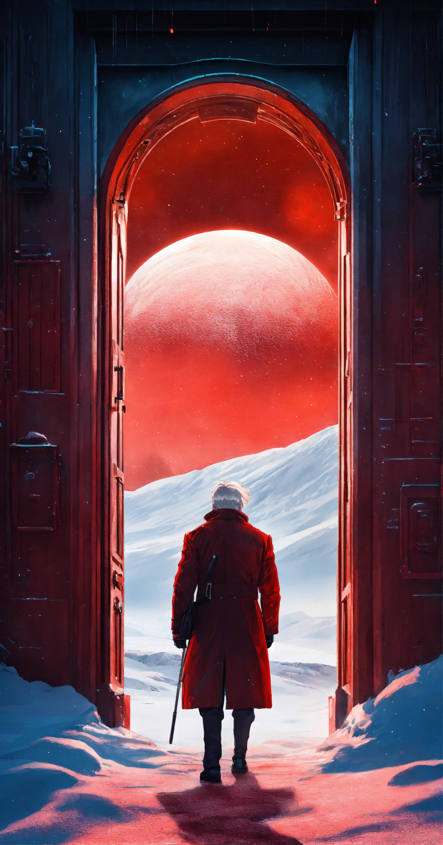 Red door in the middle of a polar expanse with silver-haired man in trenchcoat with siberian cat, universe behind the door, average plan, frostpunk, retrowave