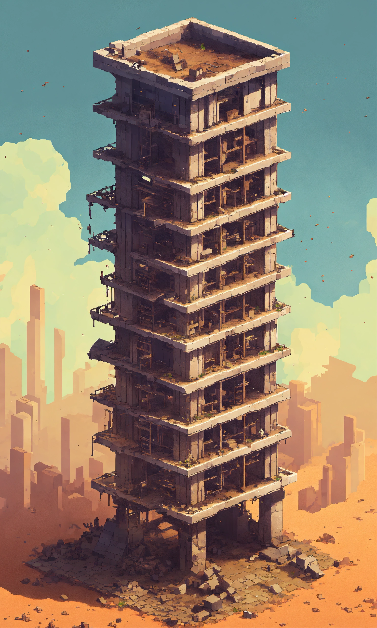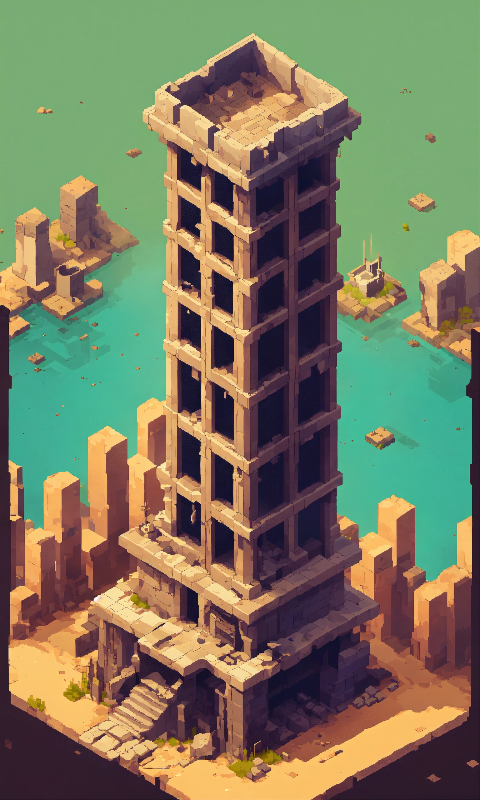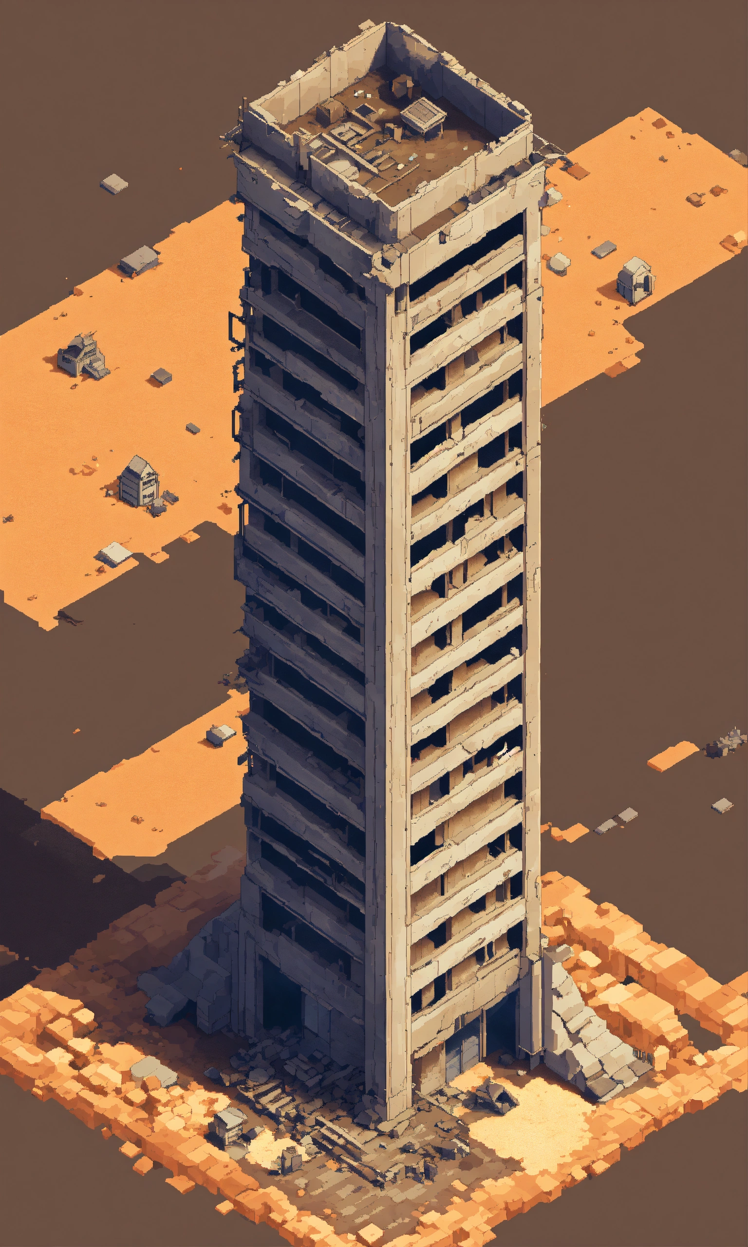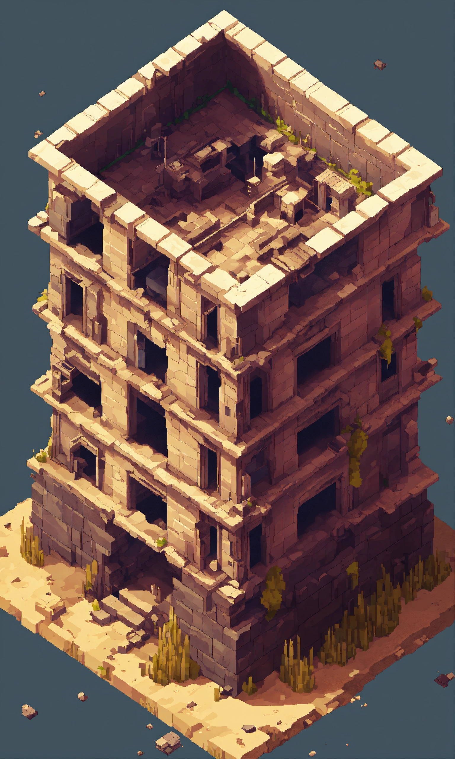 Short, plain, level one lone tower of a badly constructed crumbling post-apocalyptic human settlement building after apocalypse. isolated, plain background. top down isometric tower defense mobile game extremely simplistic pixel art.