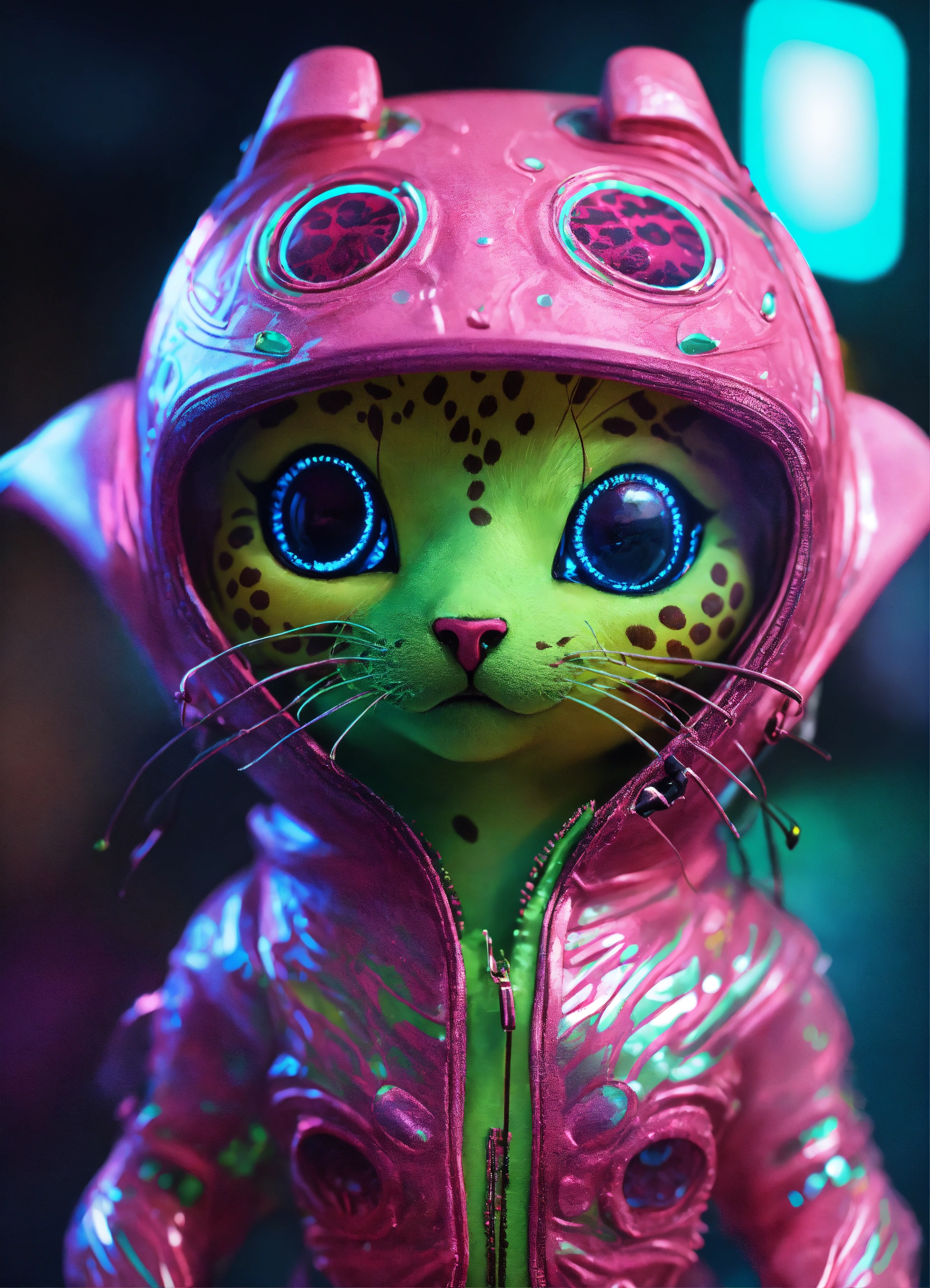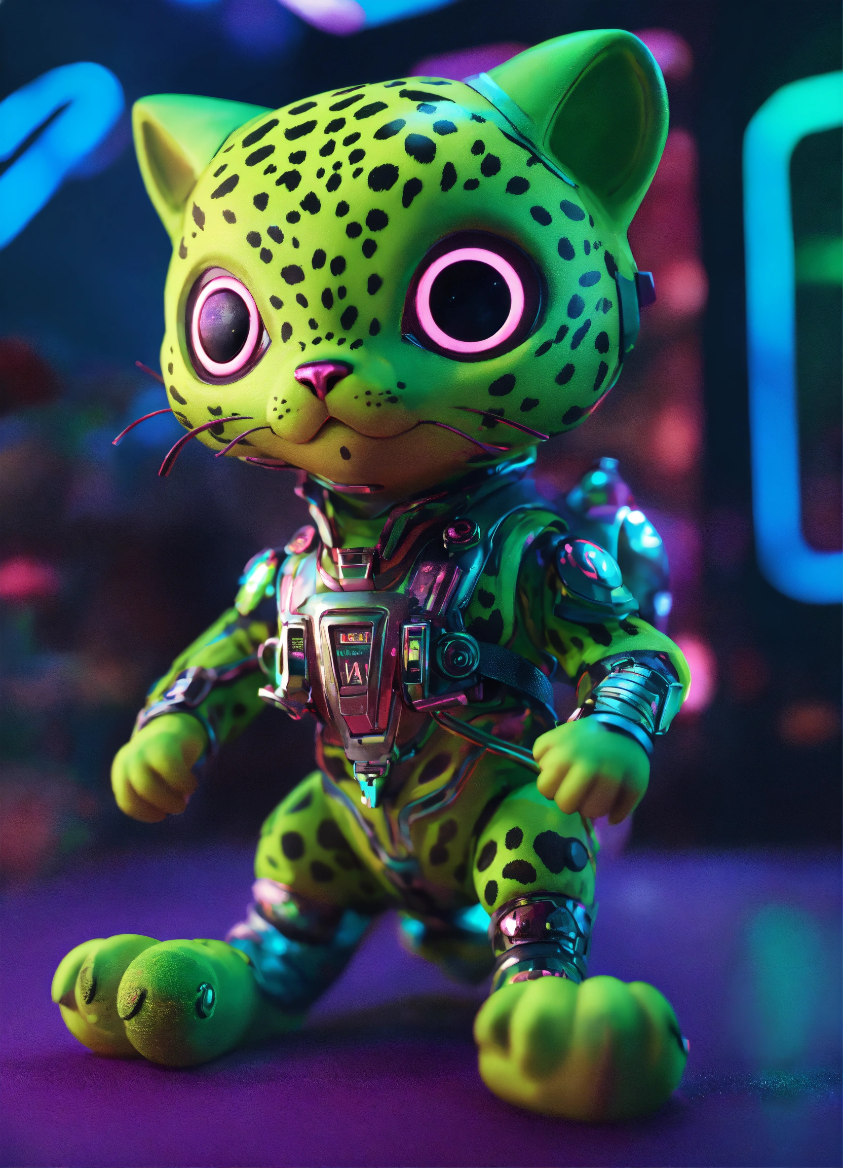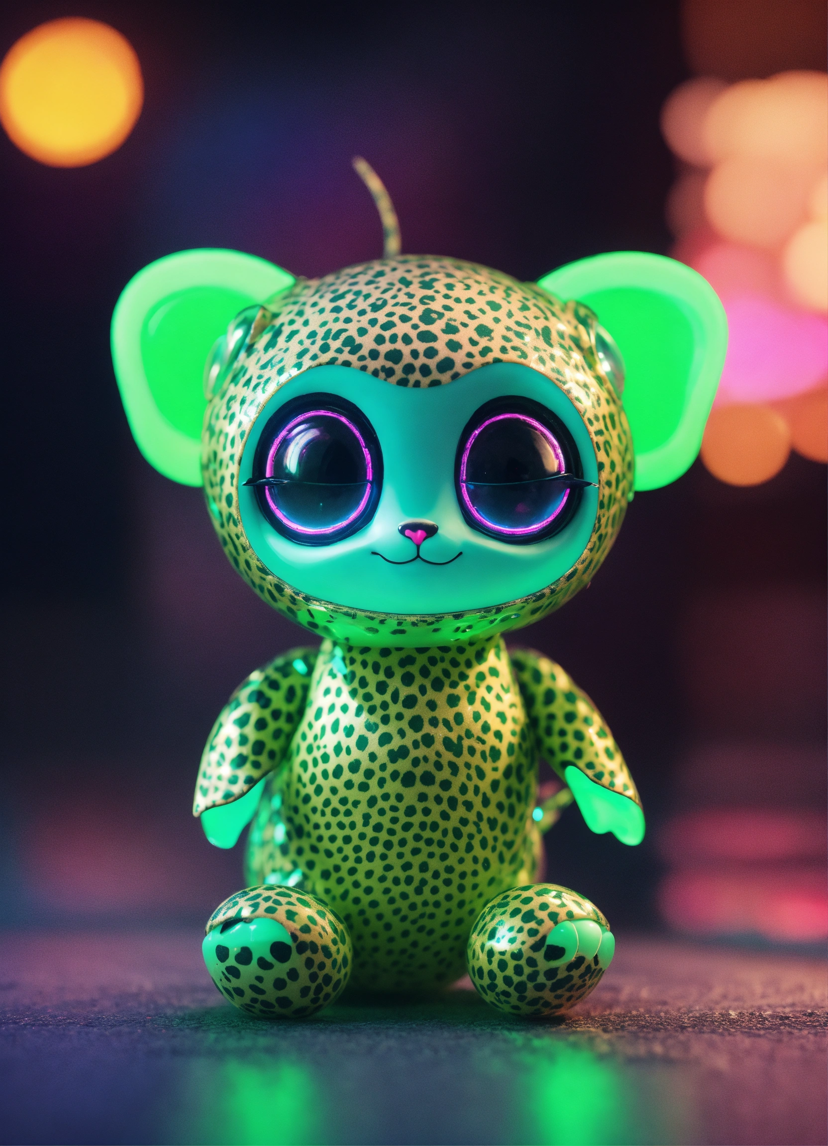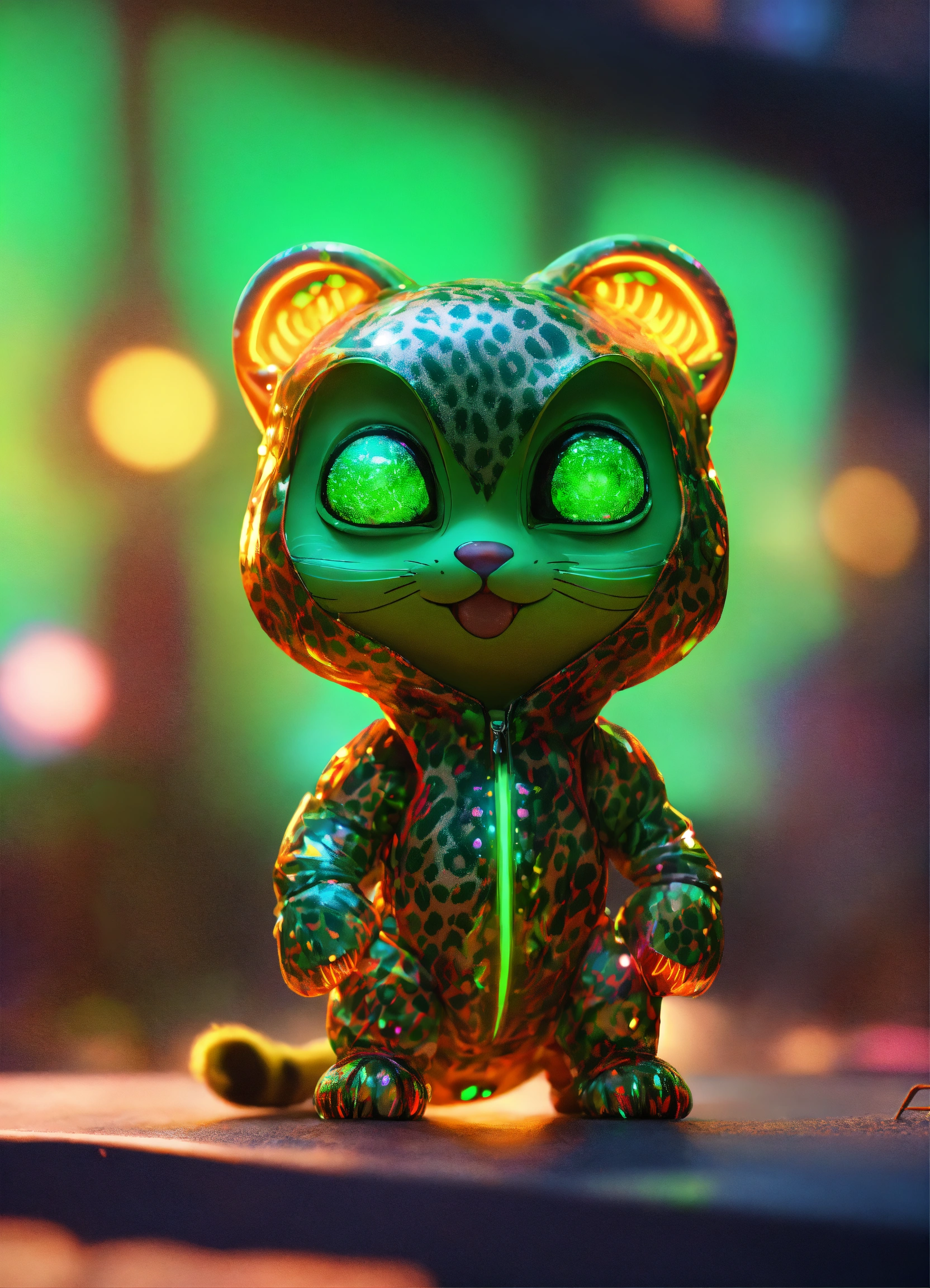 Gelly cute adorable alien monster, full-body, neon glow colors, highly intricate details, 3d, cgi, realistic light, trending on cgsociety, glowing eyes, facing camera, neon details, ultra realistic details, portrait, sci fi atmosphere, global illumination, shadows, octane render, 8 k, ultra sharp, cat attributes, smooth skin, friendly, luxury toy, green, leopard print
