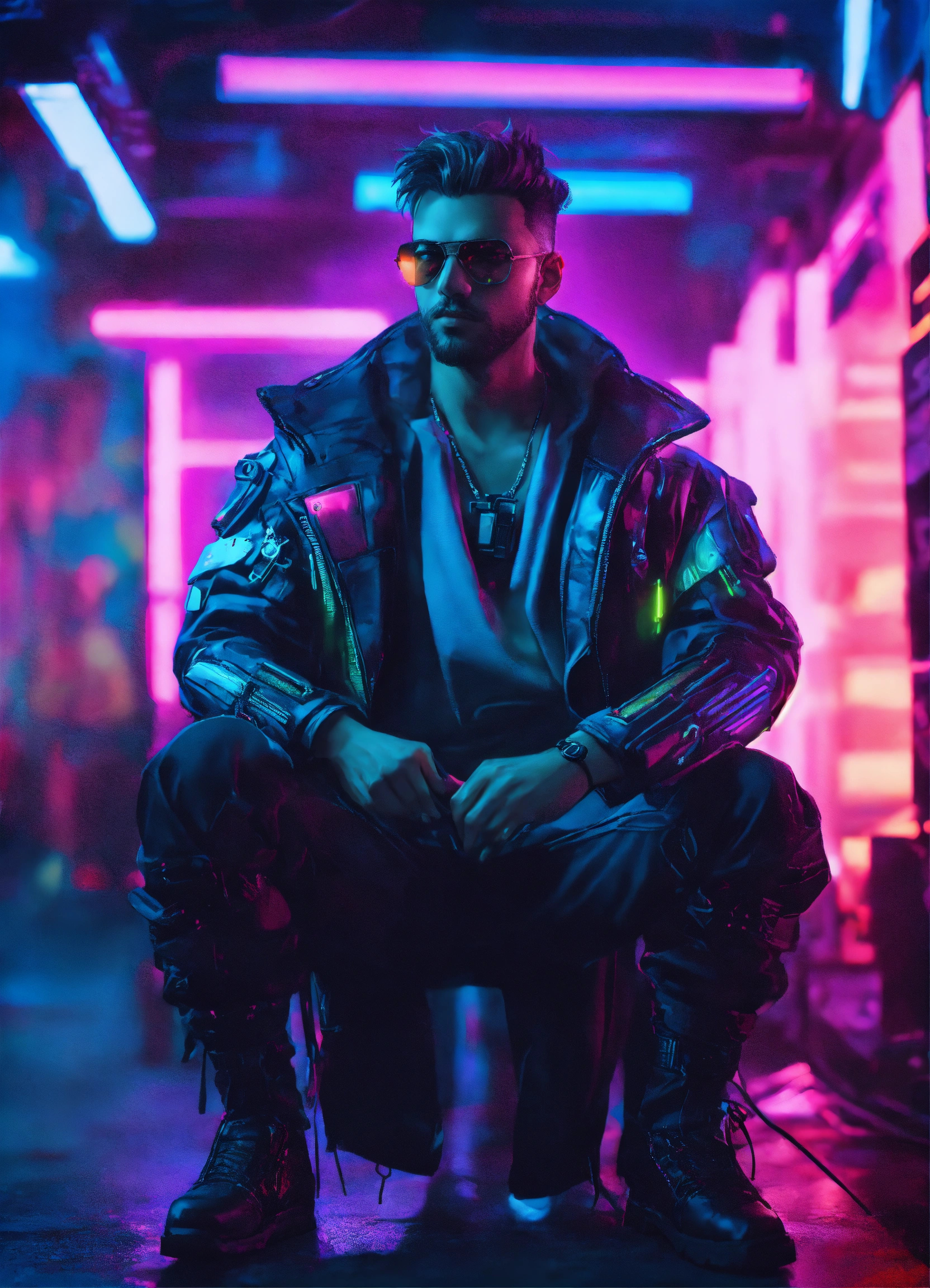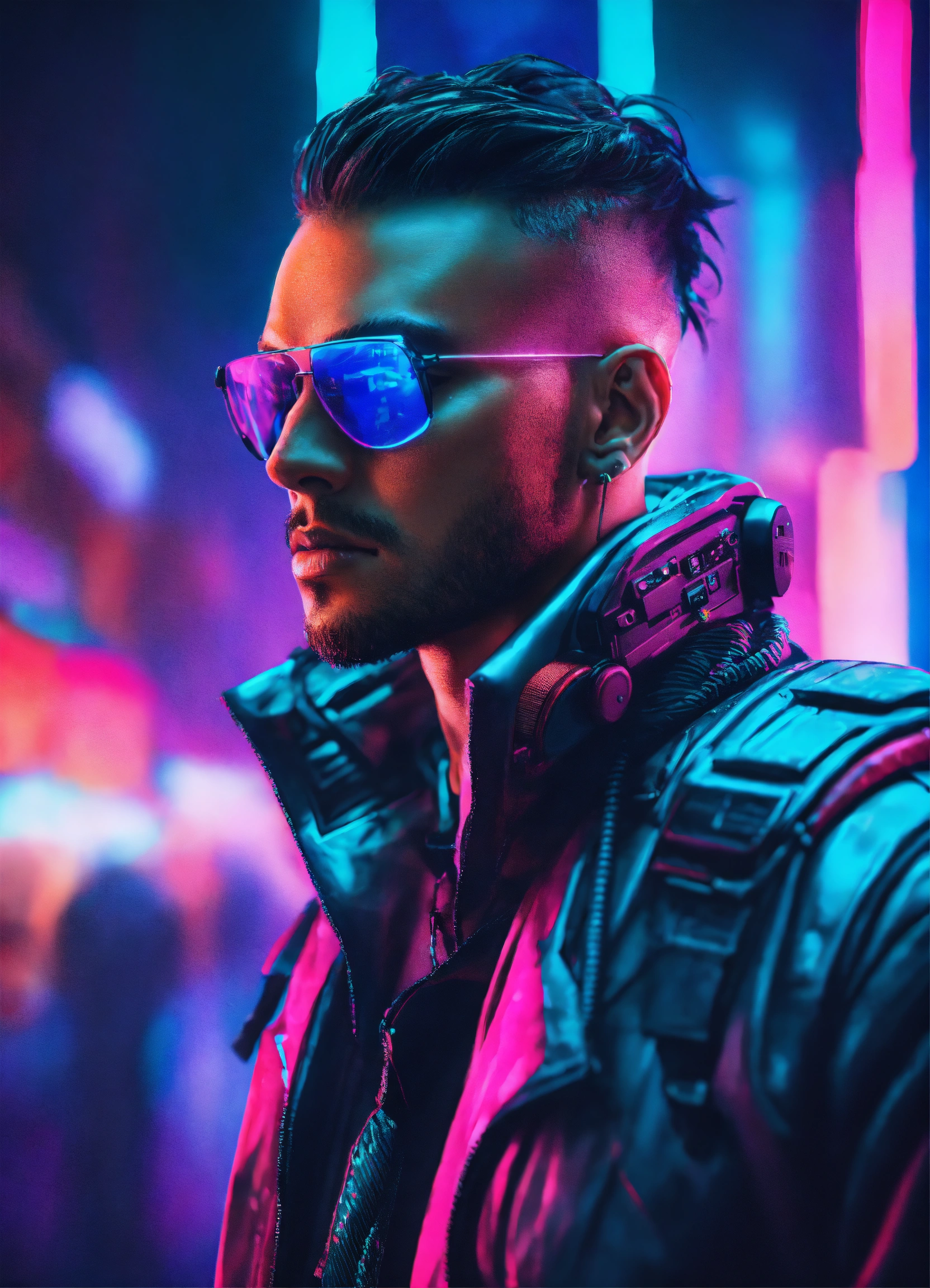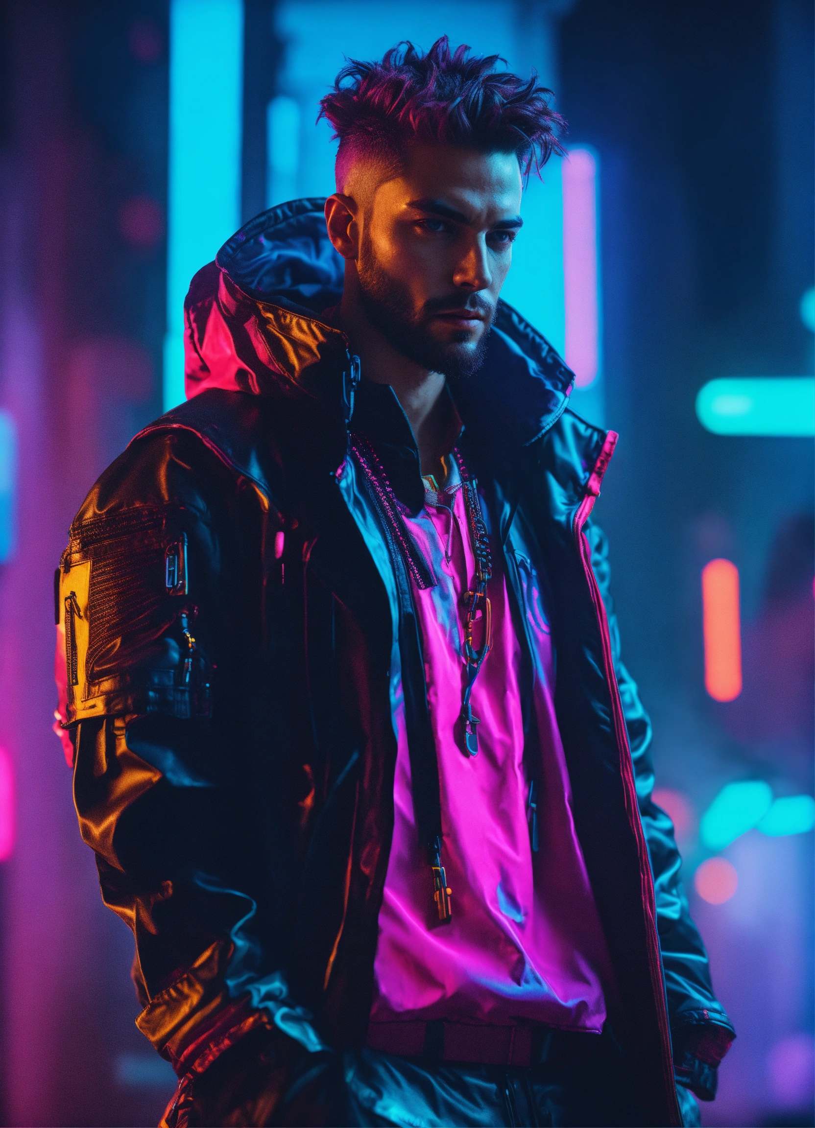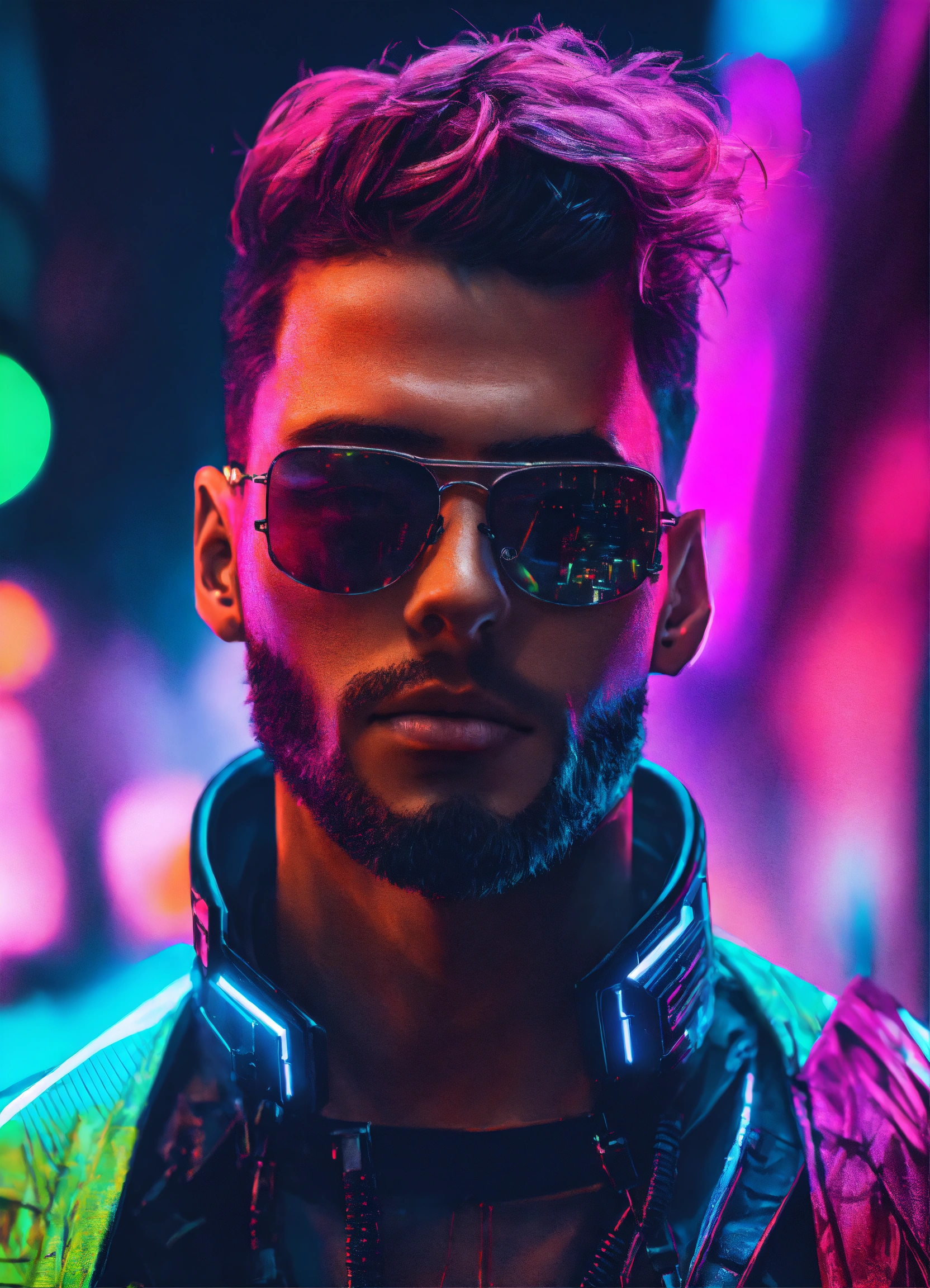 Cinematic photography cyberpunk style male visionary leader neon colors, realistic details, ultra 8k resolution