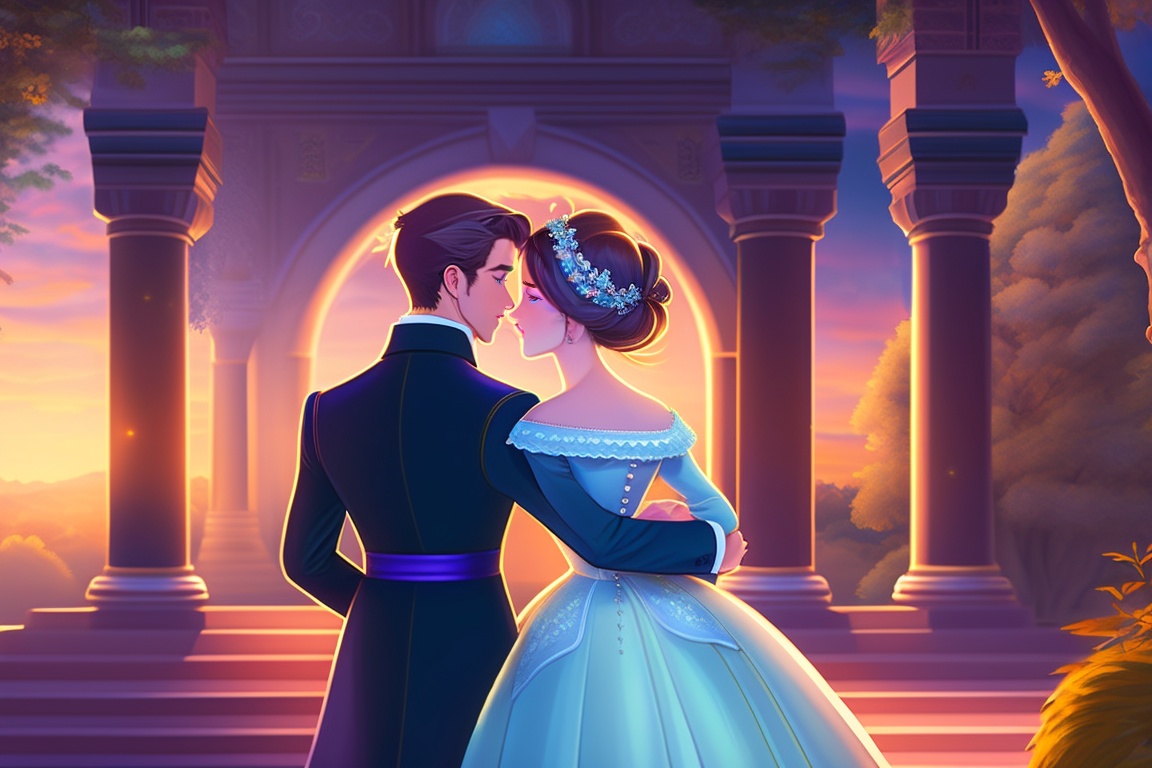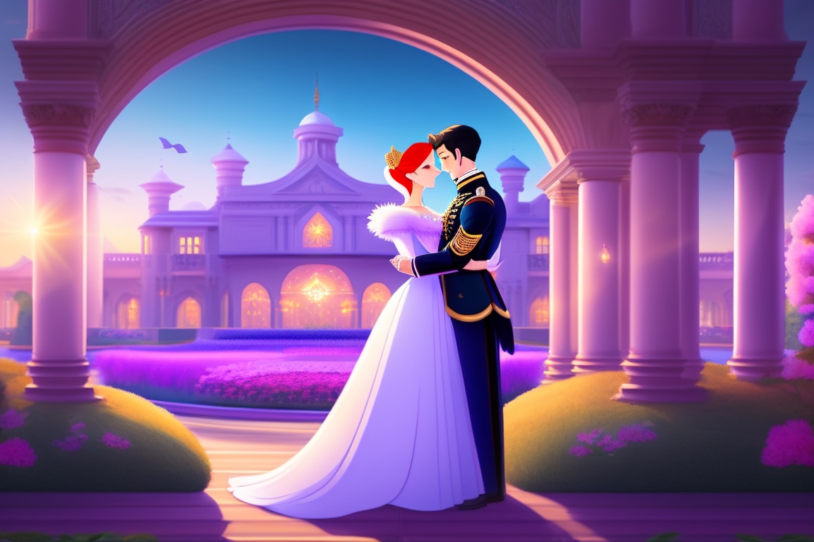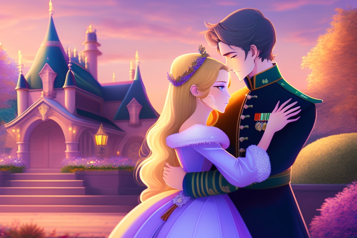 A prince and princess hug each other in front of palace in garden at dawn, sunshine, surreal --ar 16:9 a prince and princess hug each other in front of palace in garden, anime style faces, clear face, no blur face, un zoom