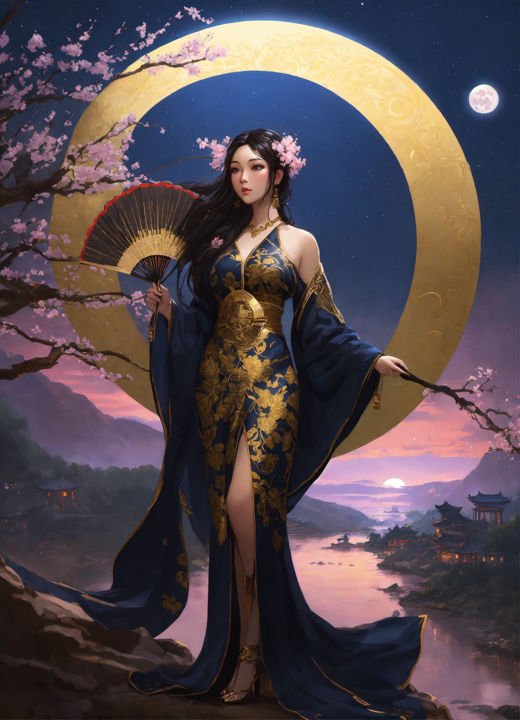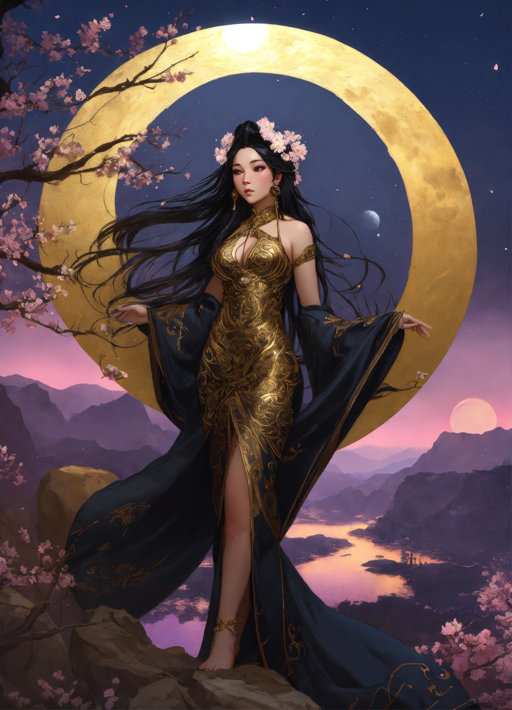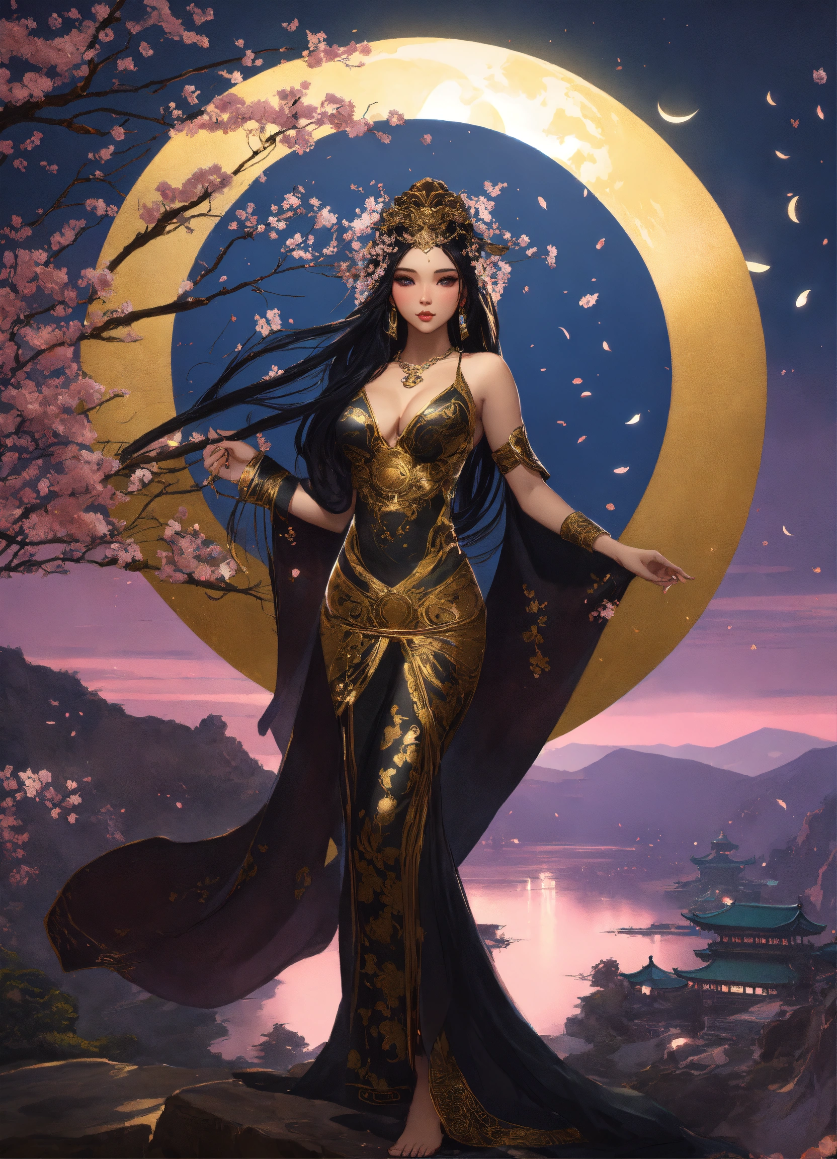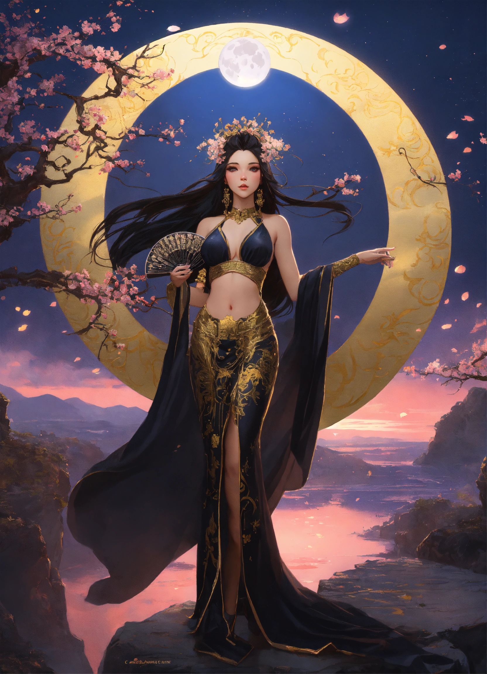 Full body back of a mysterious asian goddess in a gold-decorated black dress against a large moon, holding a black fan in one hand. a goddess with her long hair down her long hair. plum blossom night. m.c.p.a. ink art, fantasy landscape, intricately detailed eyes, 8k resolution concept art portrait by greg rutkowski, artgerm, wlop, alphonse mucha dynamic lighting hyperdetailed intricately detailed splash art trending on artstation unreal engine 5 volumetric lighting