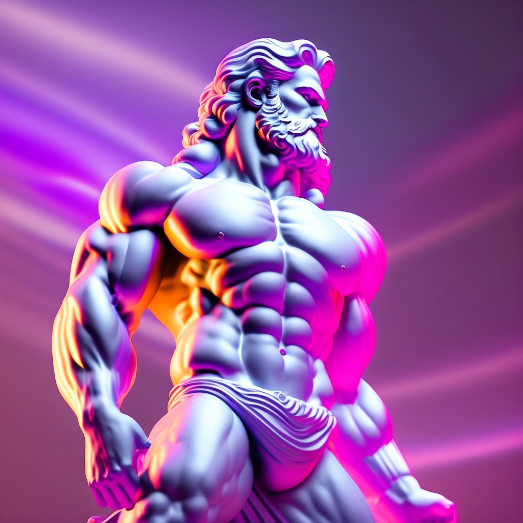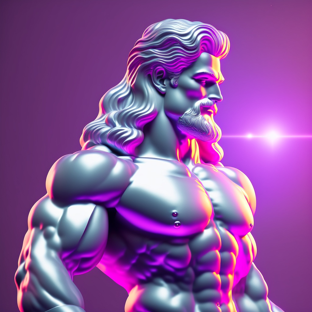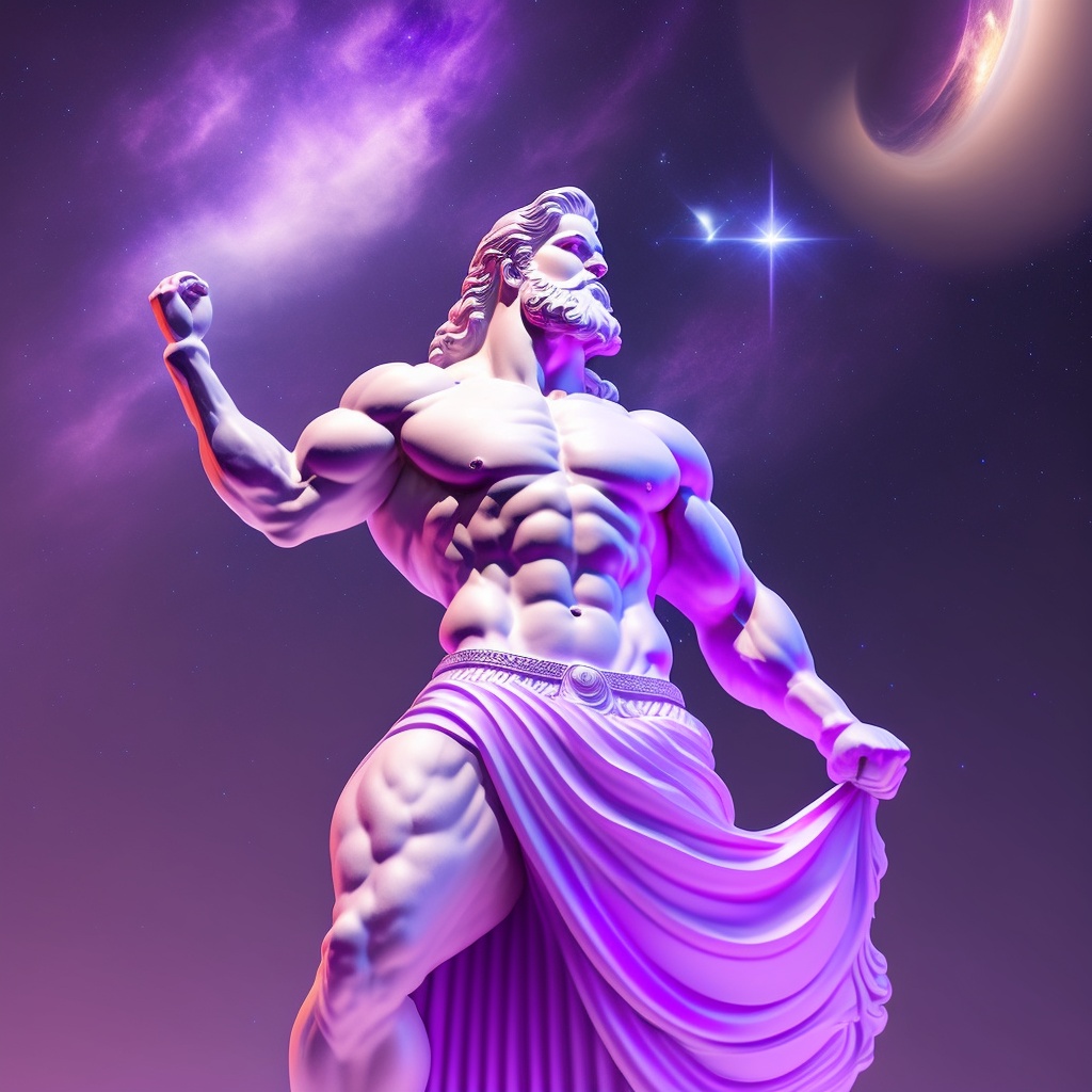 A marble, purple greek god statue in the universe with muscular looking. realistic, 4k, particul, real life, galaxy, universe background, dark, purple