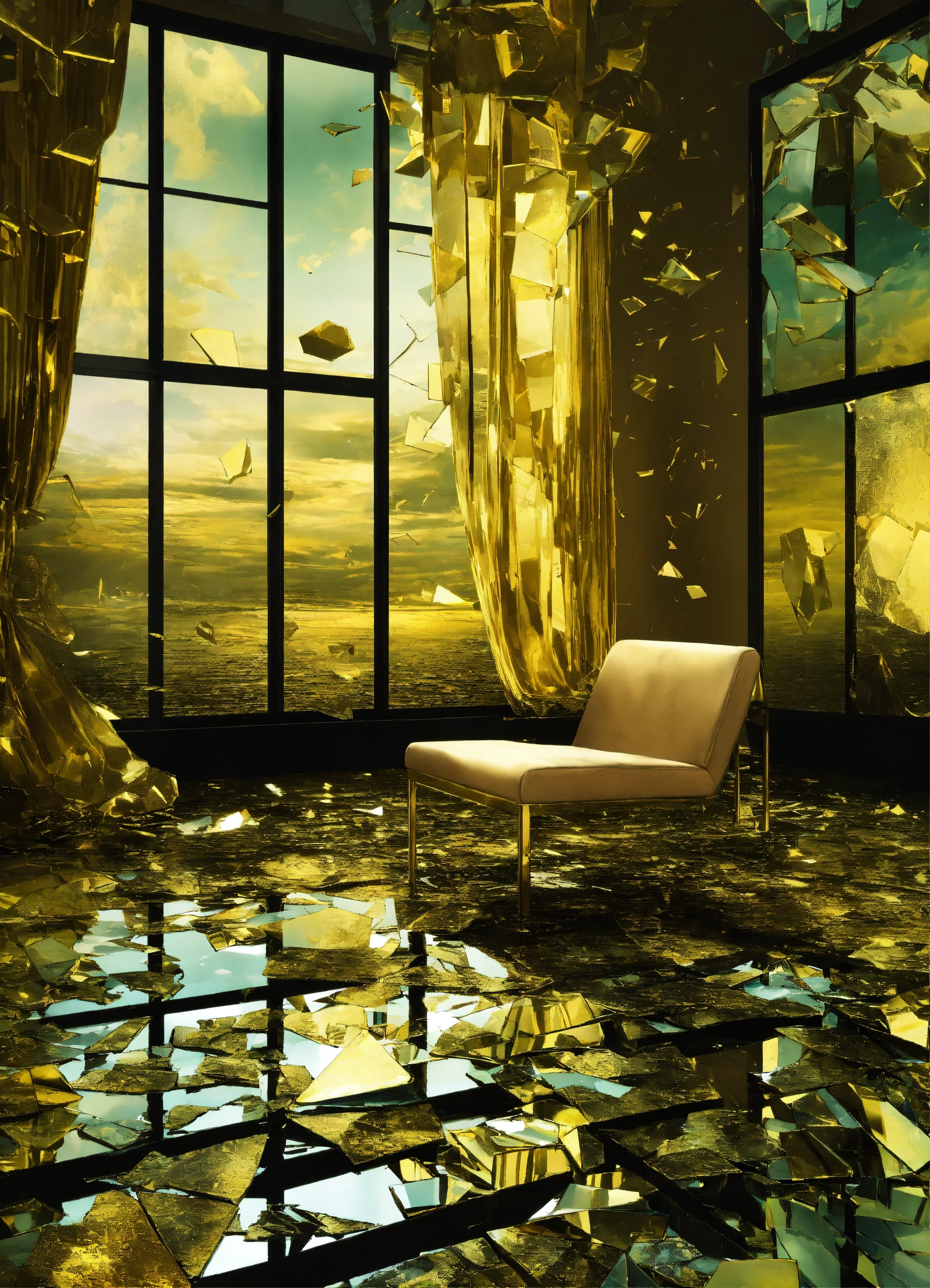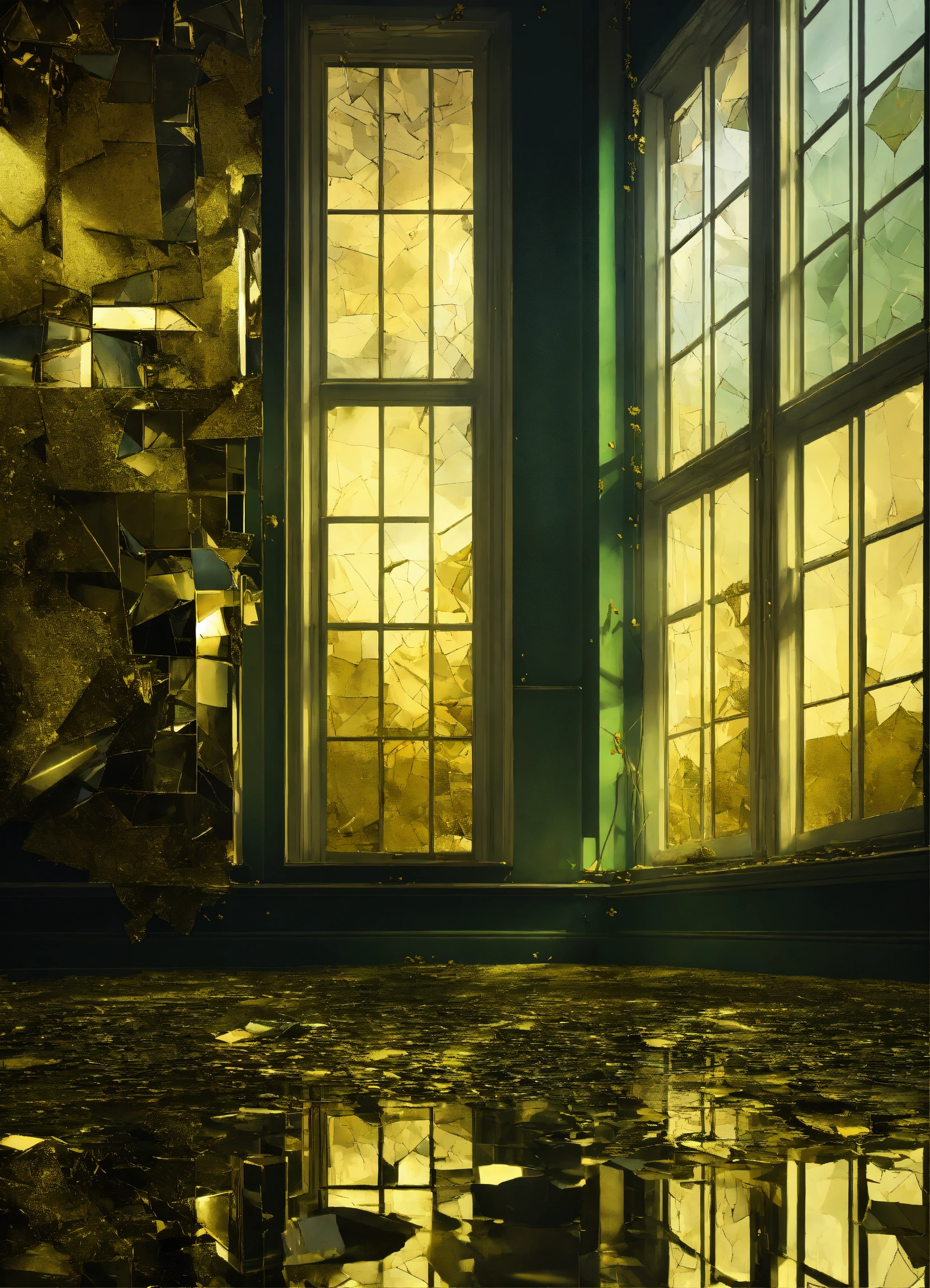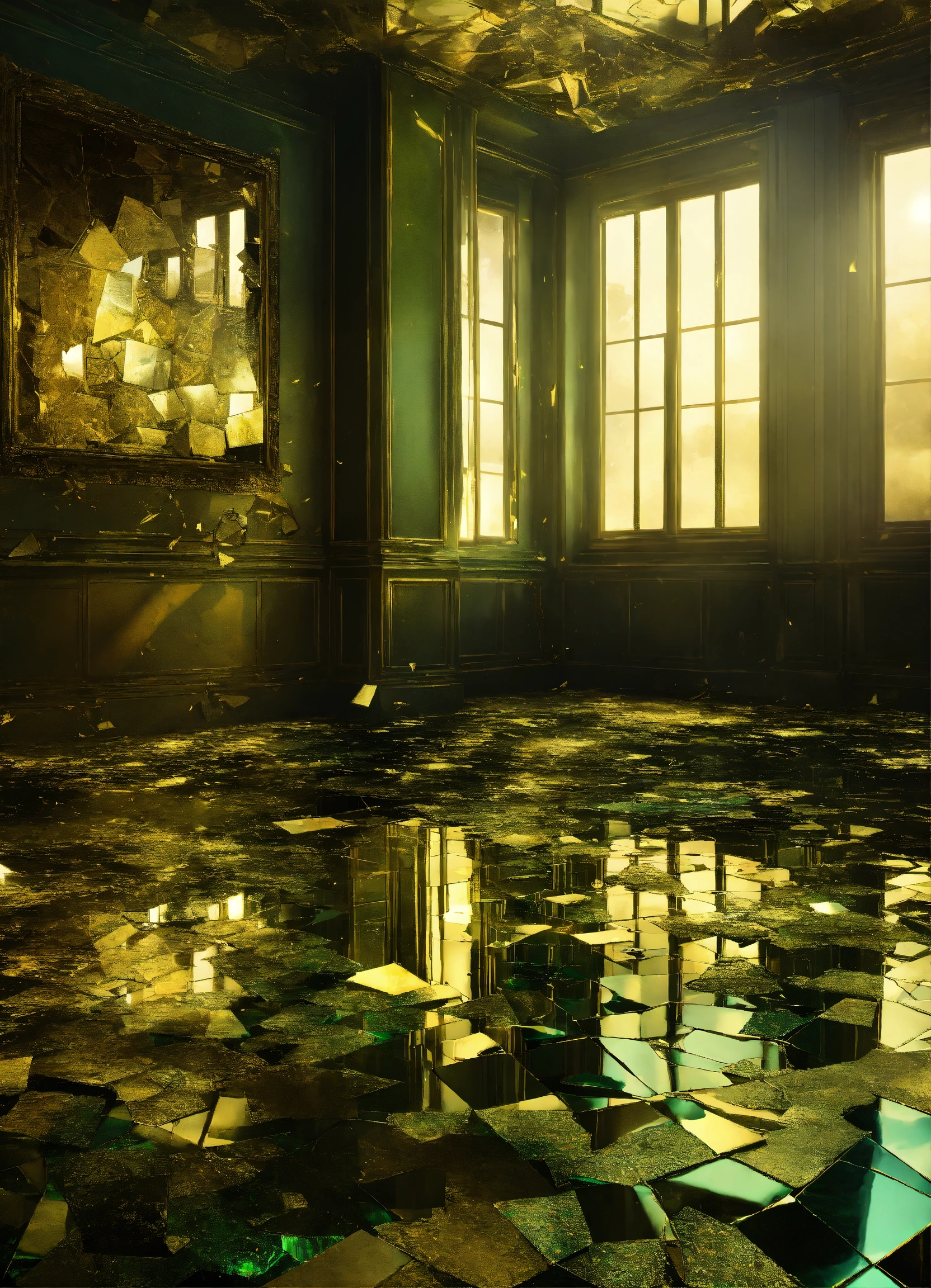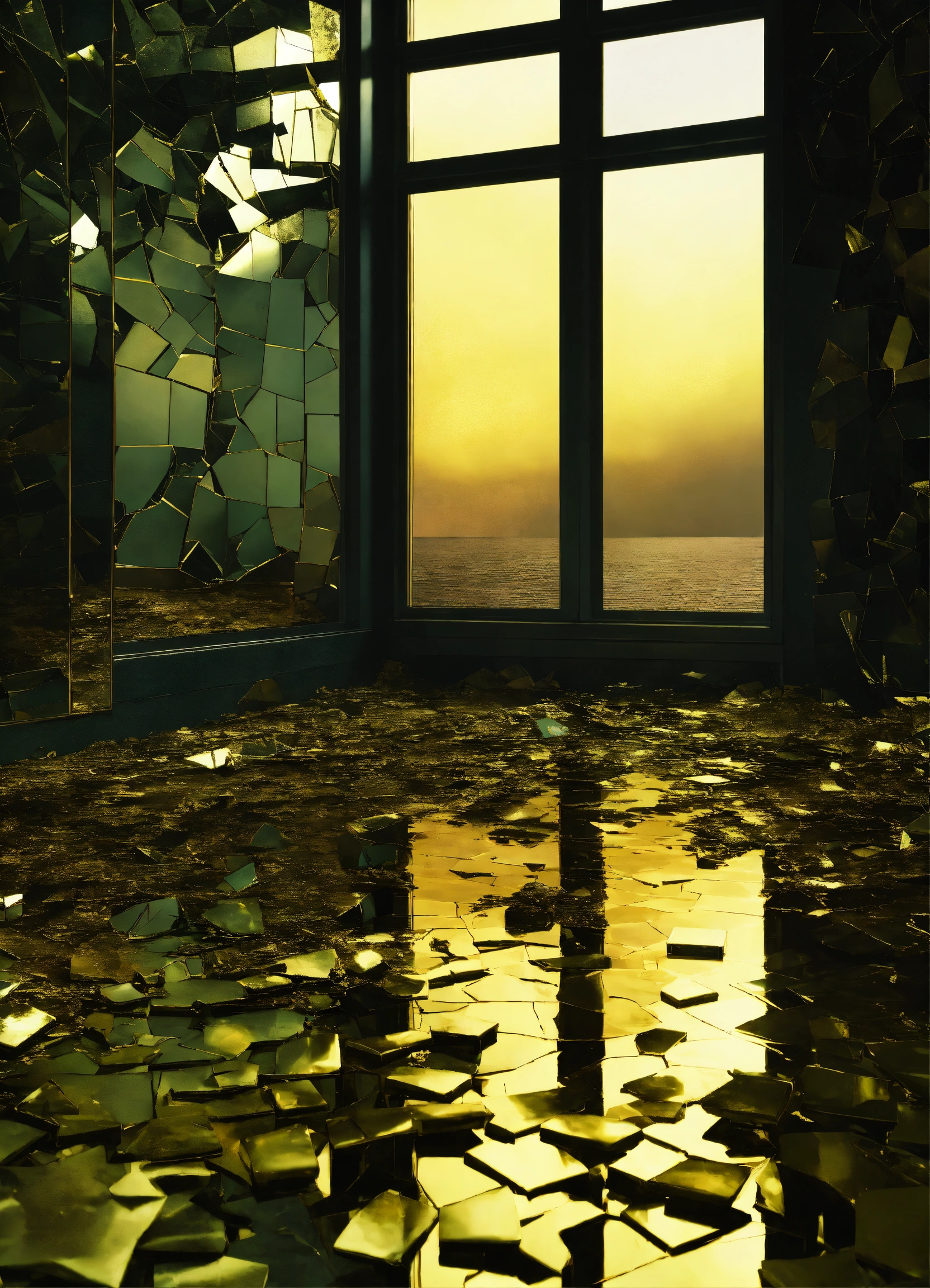 Digital surrealism shattered dreamscape, fragments of forgotten memories, broken reflections in a room with a largecwindow of thecsea iridescence, muted shiny juxtaposed with stark monochrome, echoes of silence in the void, dekoredet with gold roses of the floor black and olive green, gold decoreted