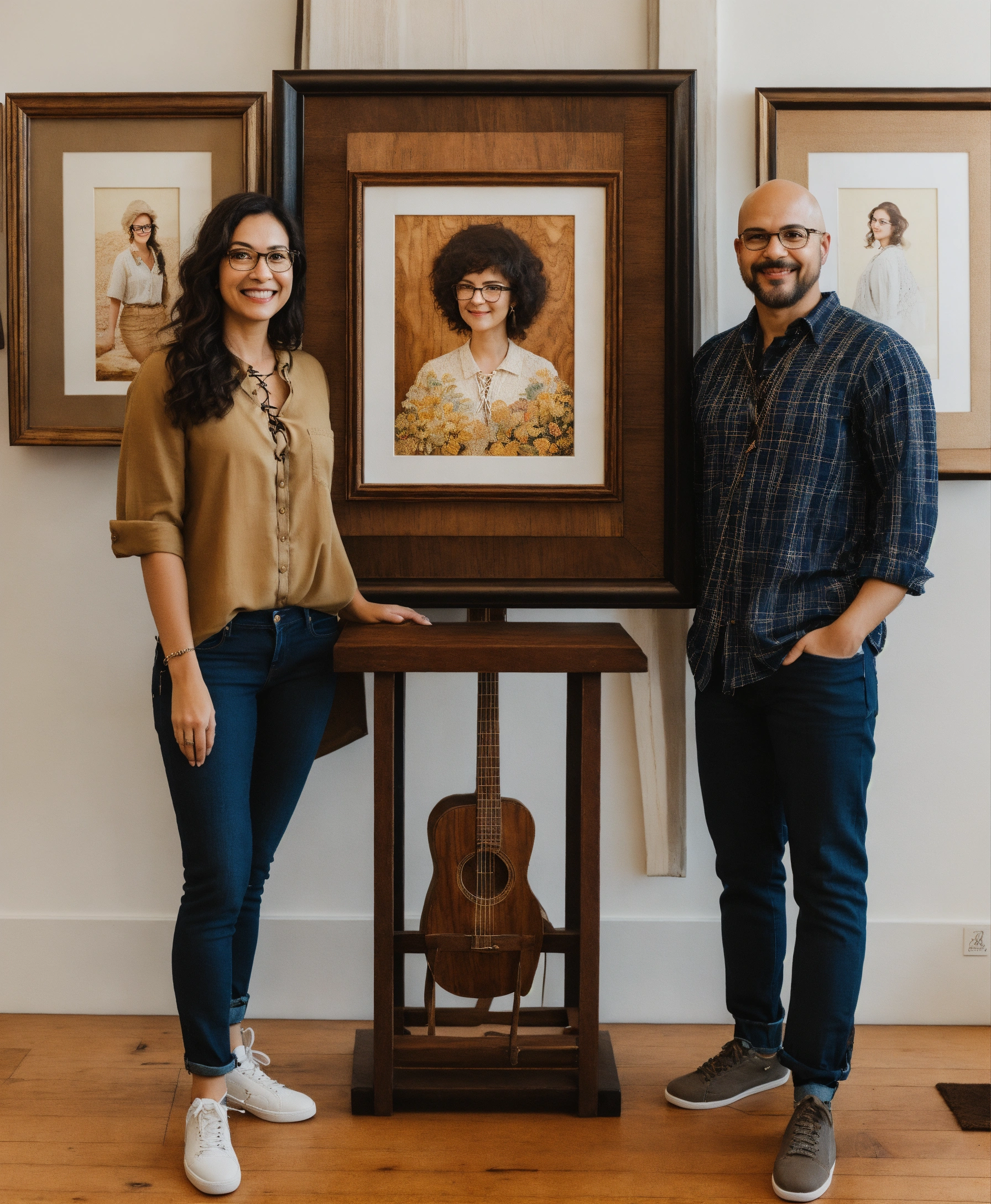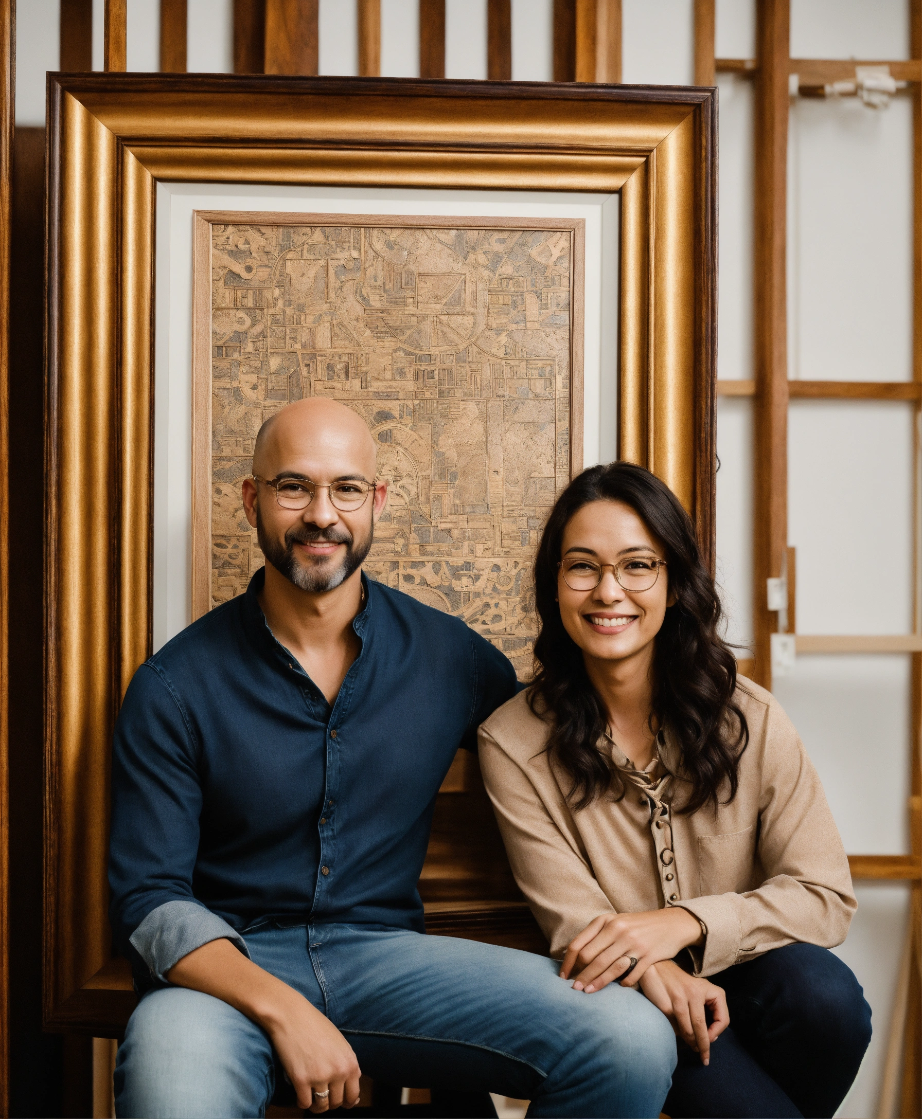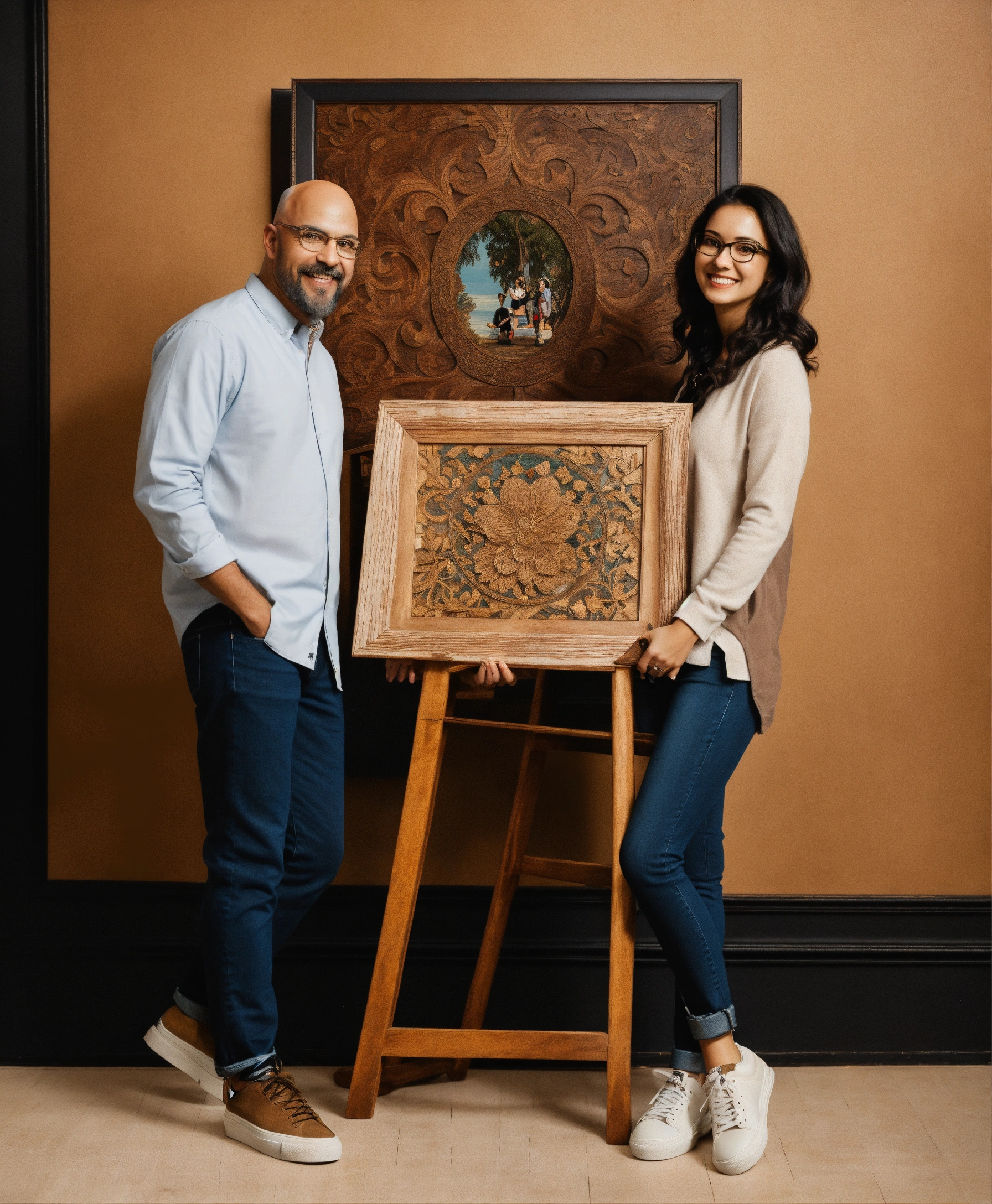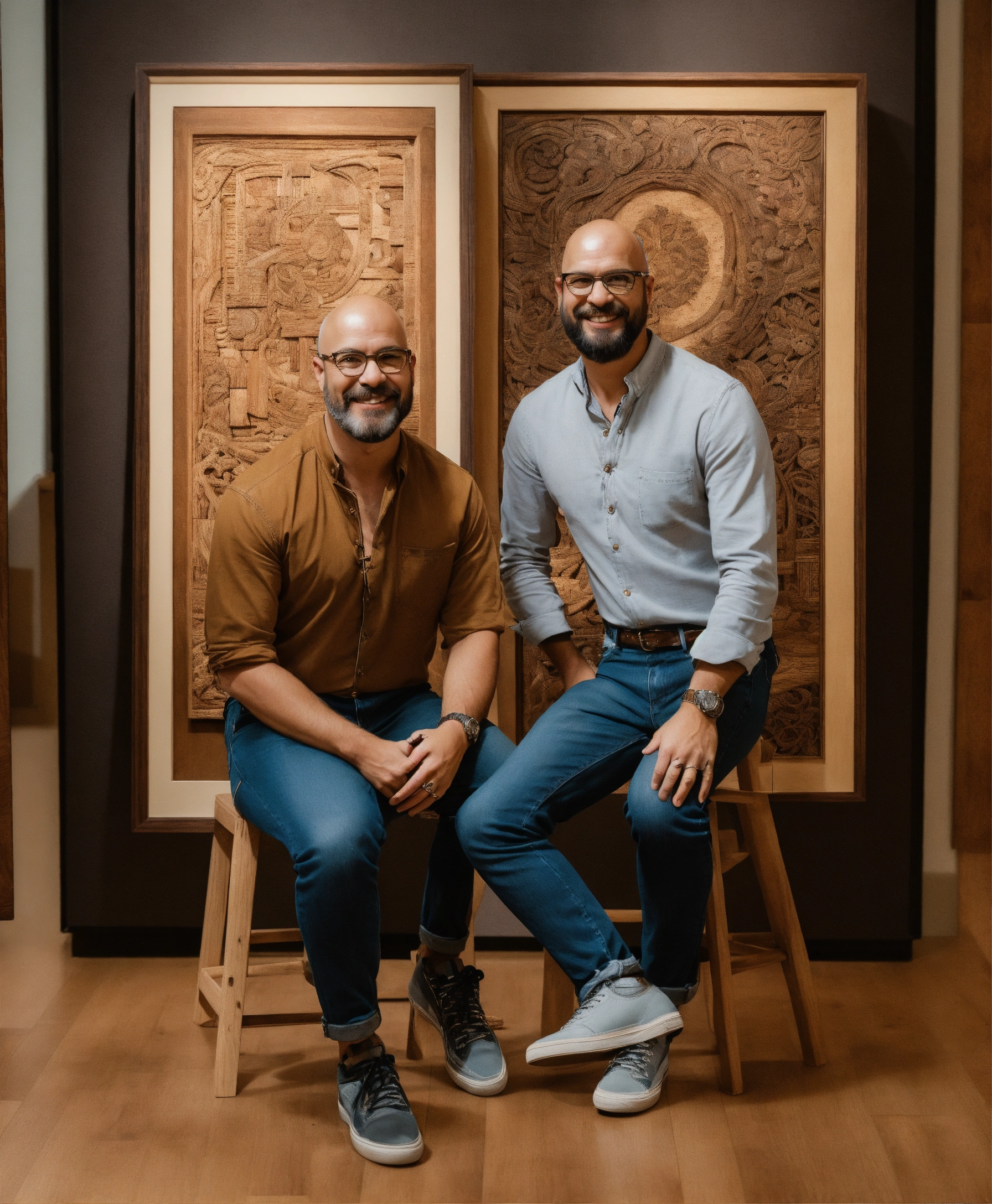 The image features two adults, a woman and a man, posed against a white backdrop. both individuals are sitting on wooden stools. the woman, with wavy dark hair, is wearing a dark-colored top, jeans, and sneakers. she holds a framed artwork with a design that seems to depict a stylized figure. to her side, the man, who has a bald head and is wearing glasses, a light-colored shirt, jeans, and lace-up shoes, holds another framed piece showcasing a more intricate, possibly wood-carved design. both are looking at the camera, presenting their respective artworks. the overall mood of the photo seems light-hearted and proud, with the subjects showcasing their artistic possessions or creations.