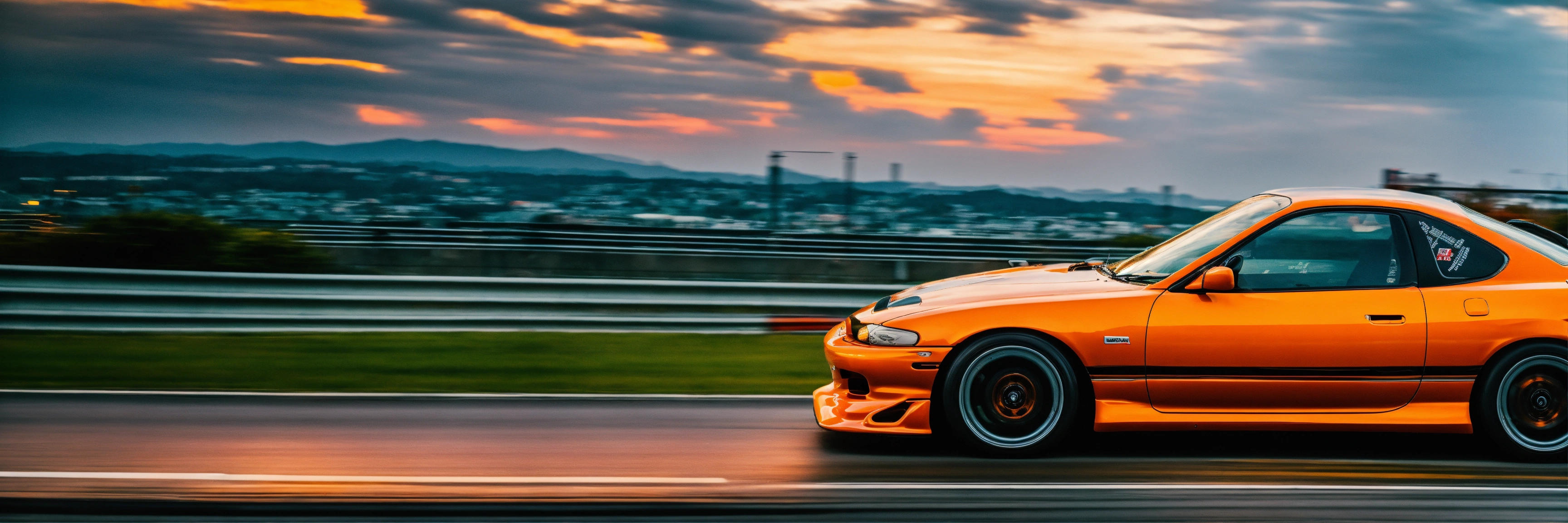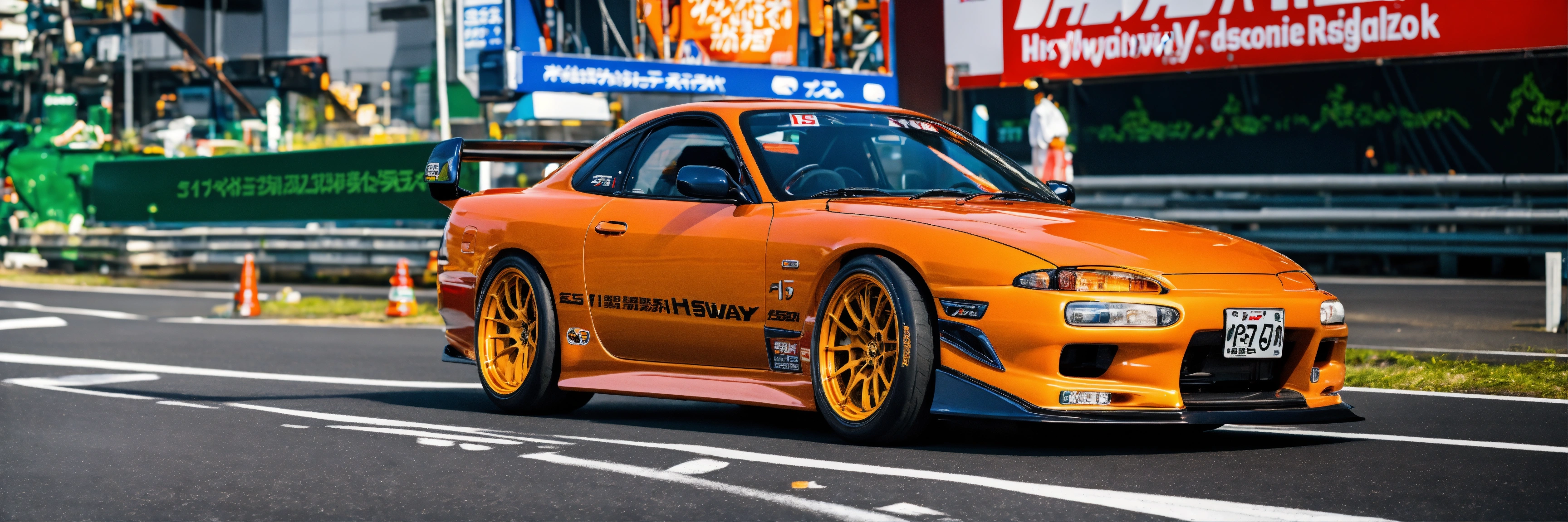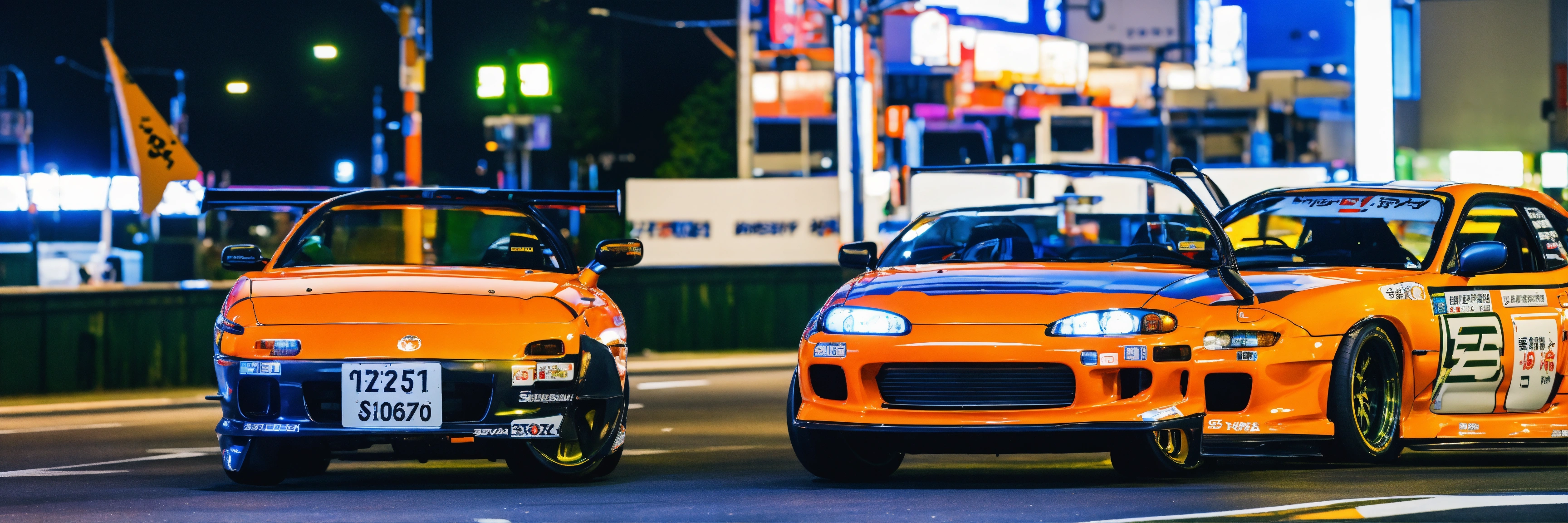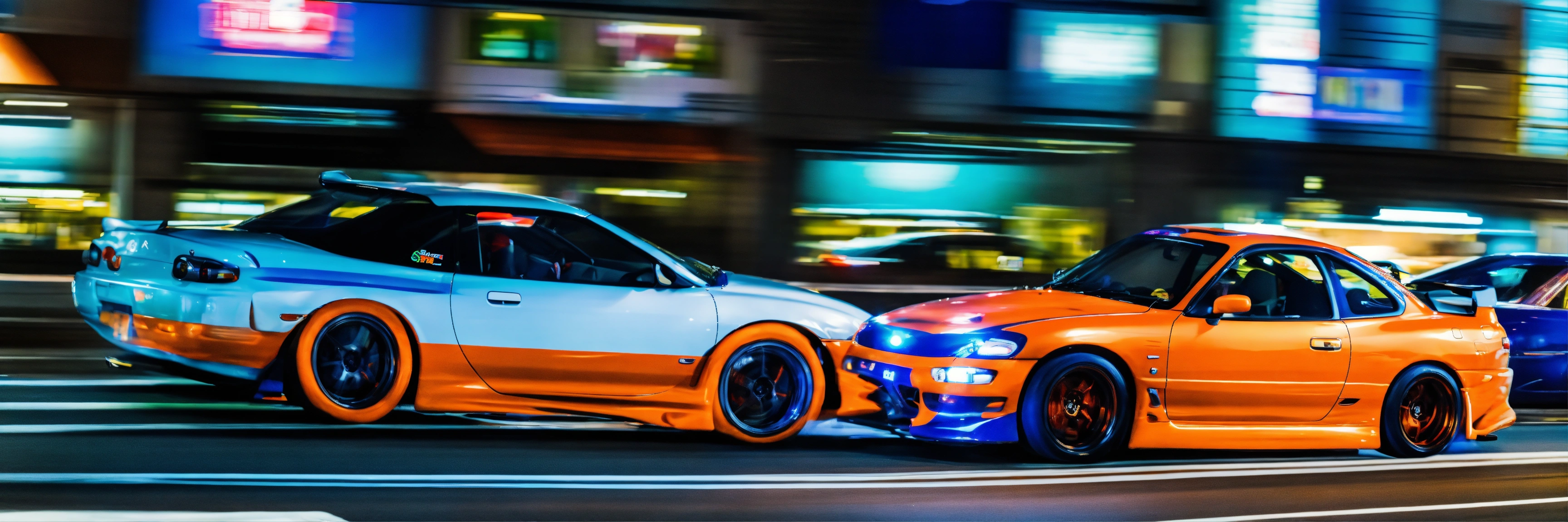 A colorful orange nissan silvia s15 with a spoiler racing a white mazda rx7 in tokyo hiway