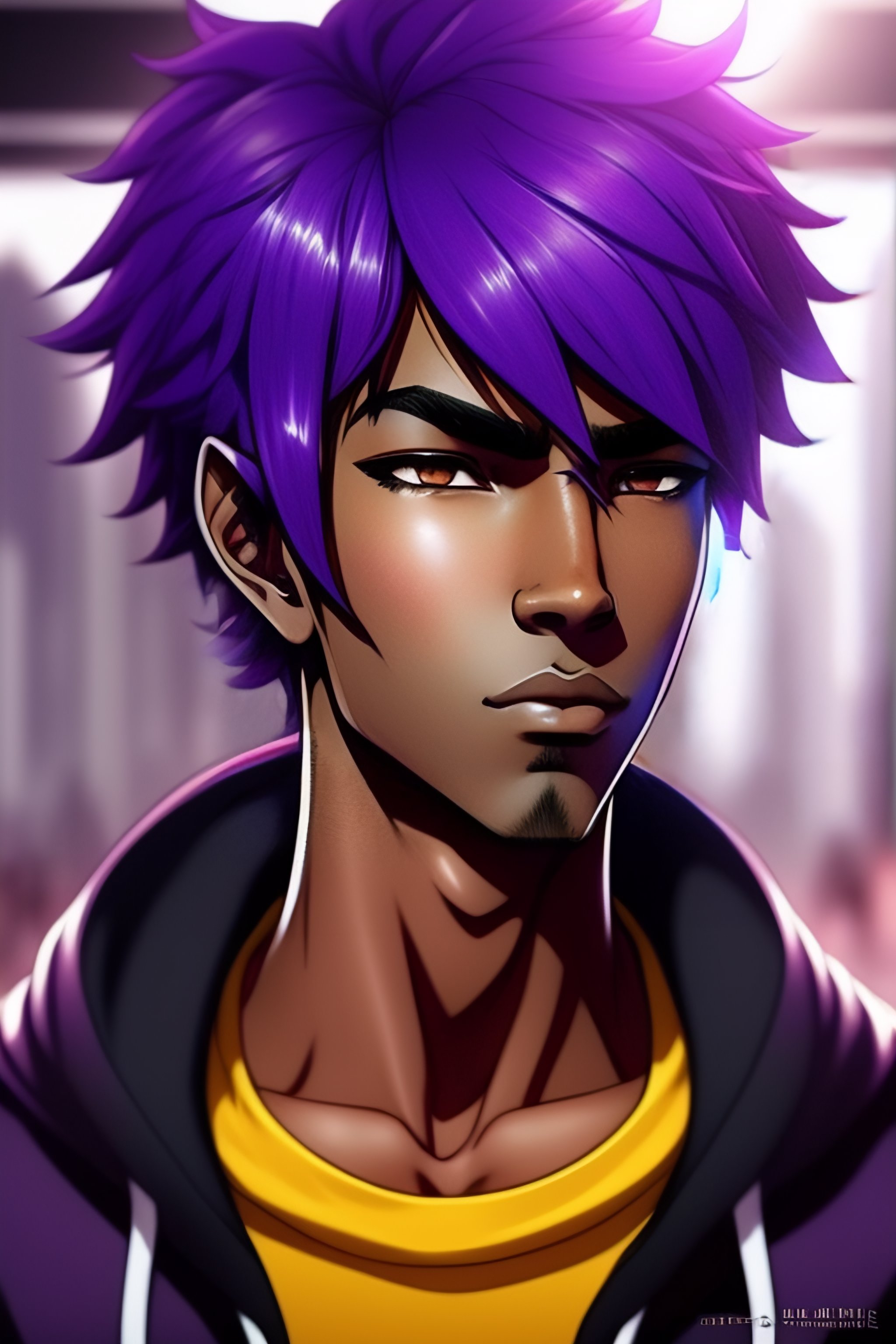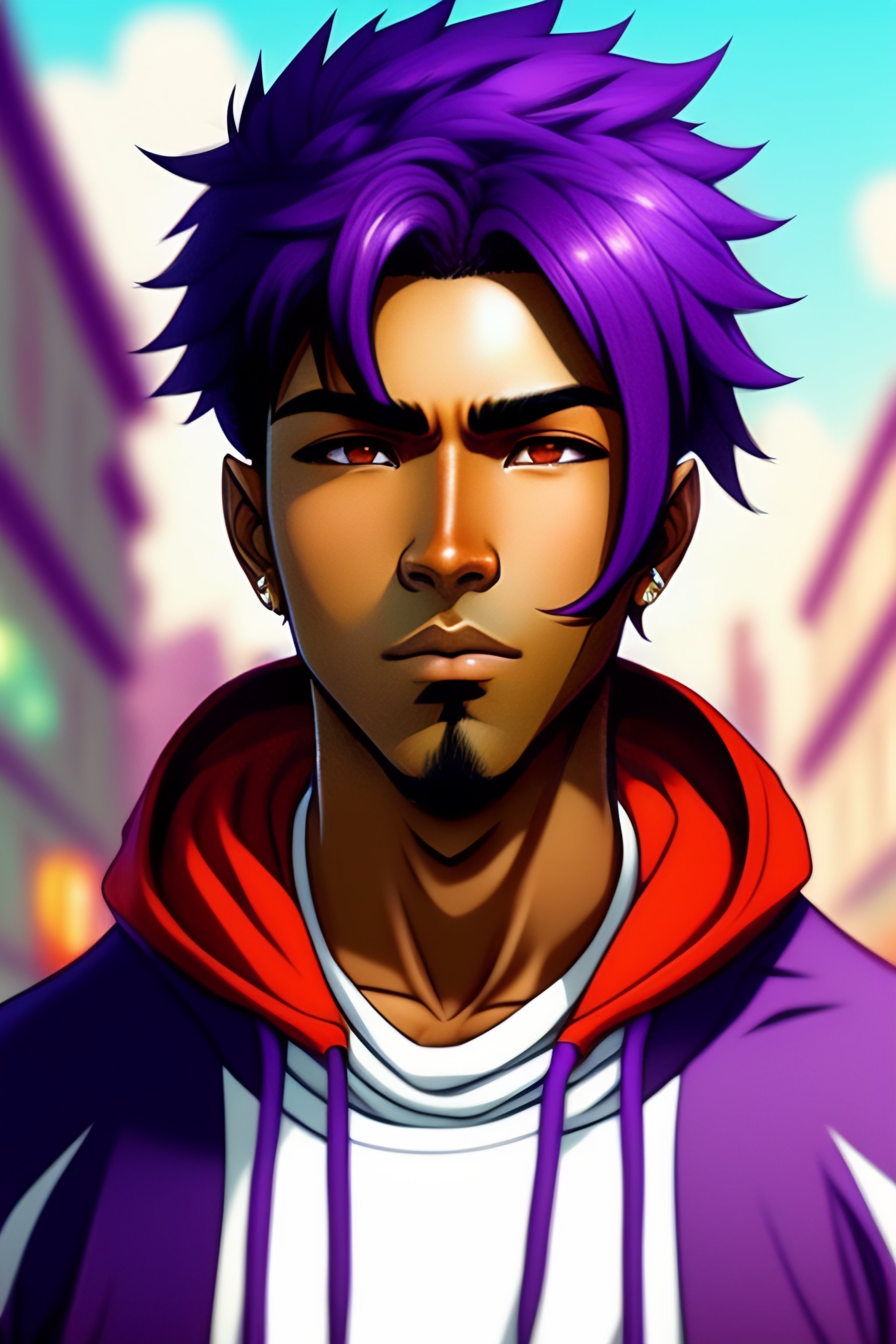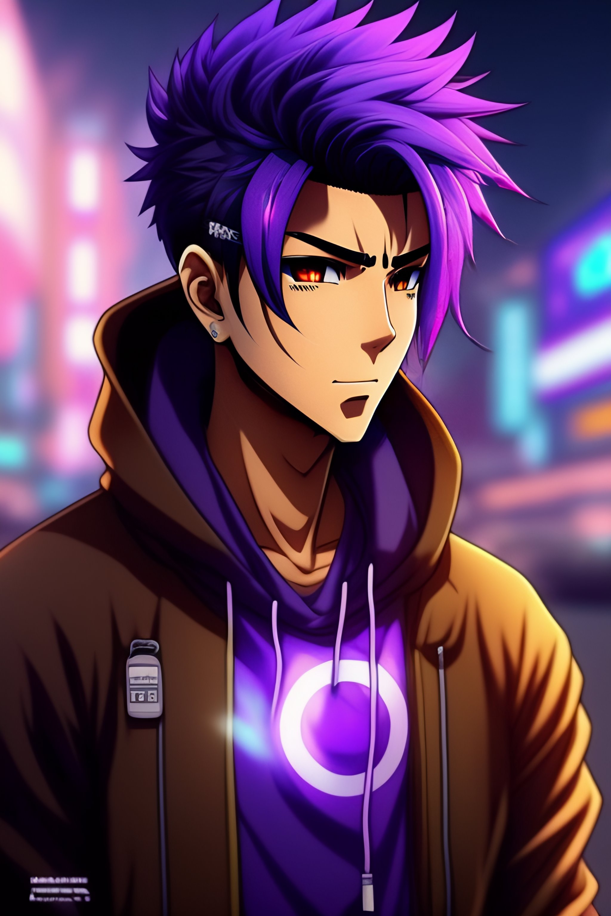 Purple hair anime brown guy, indian, dark skin, brown face, hoodie, light brown skin, hacker, no expression, no emotion, anime style, manga, cartoon, anime