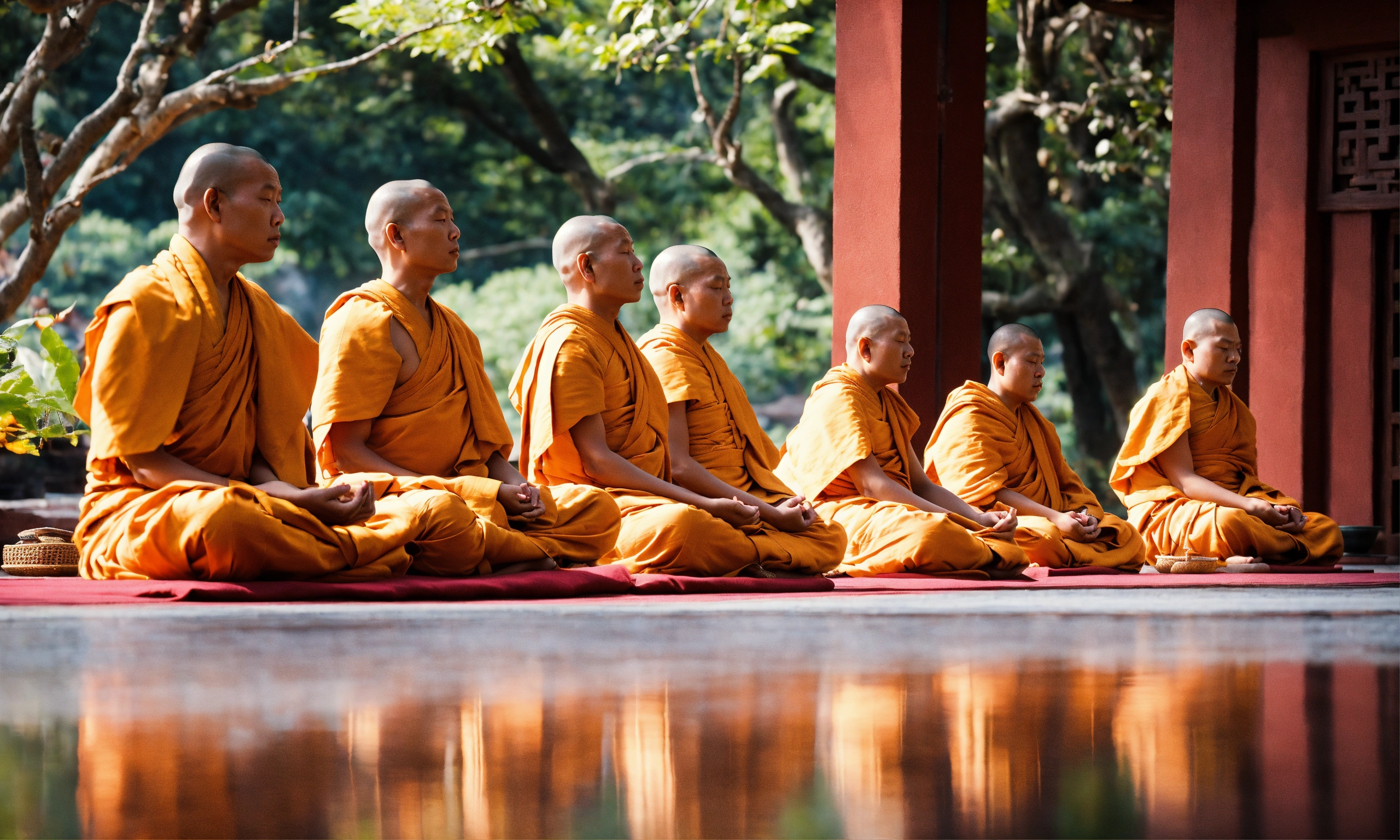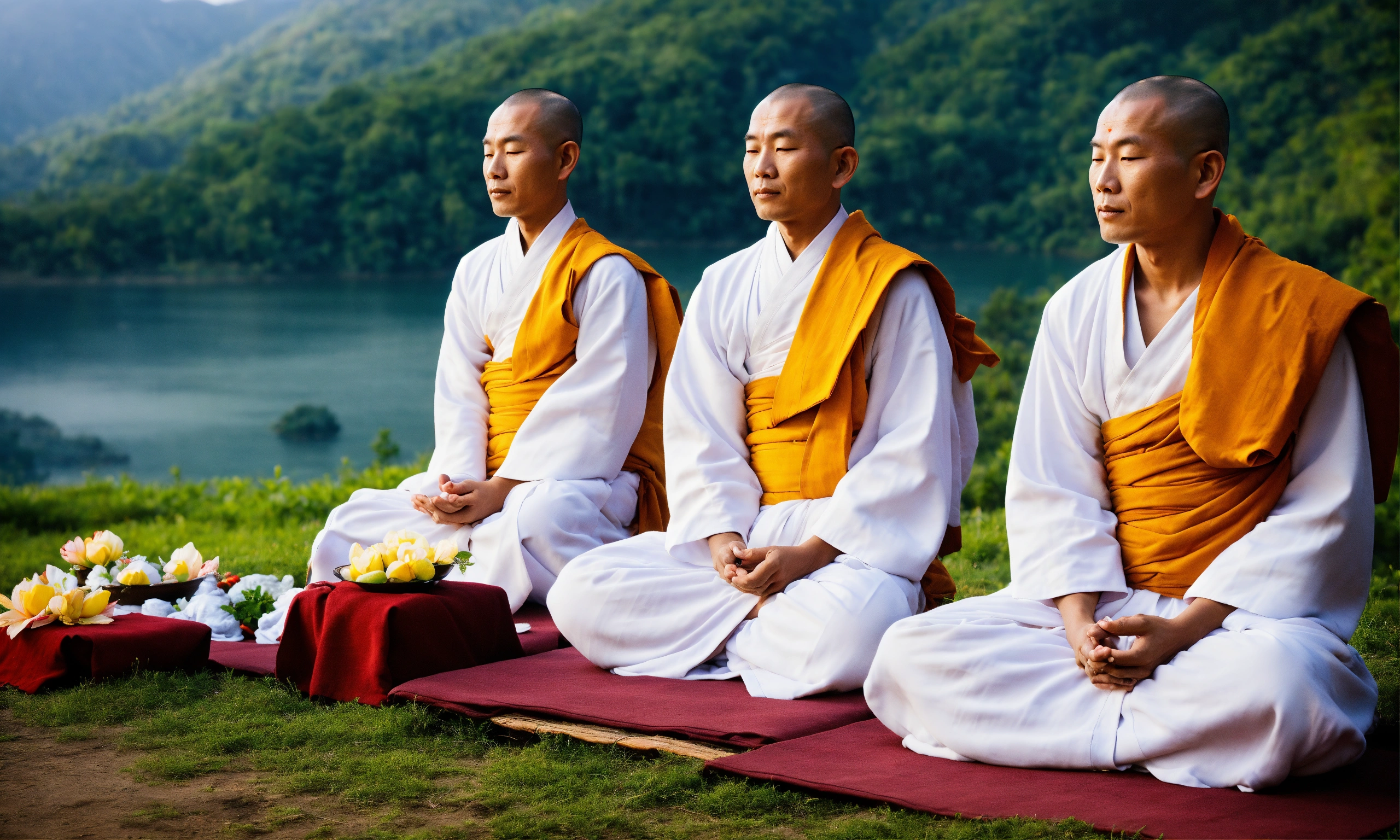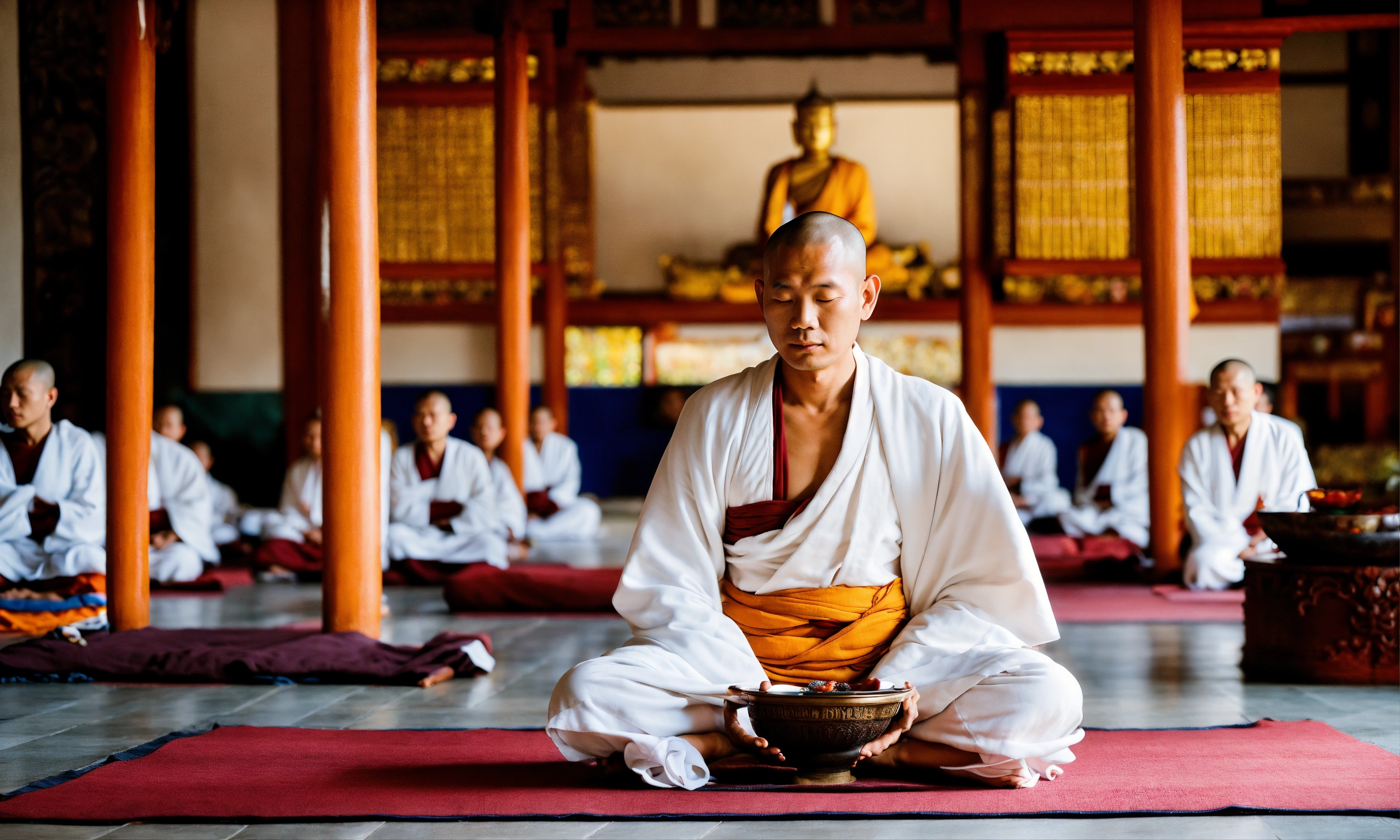 Tranquil buddhist monks wearing white robes sitting in meditation,
