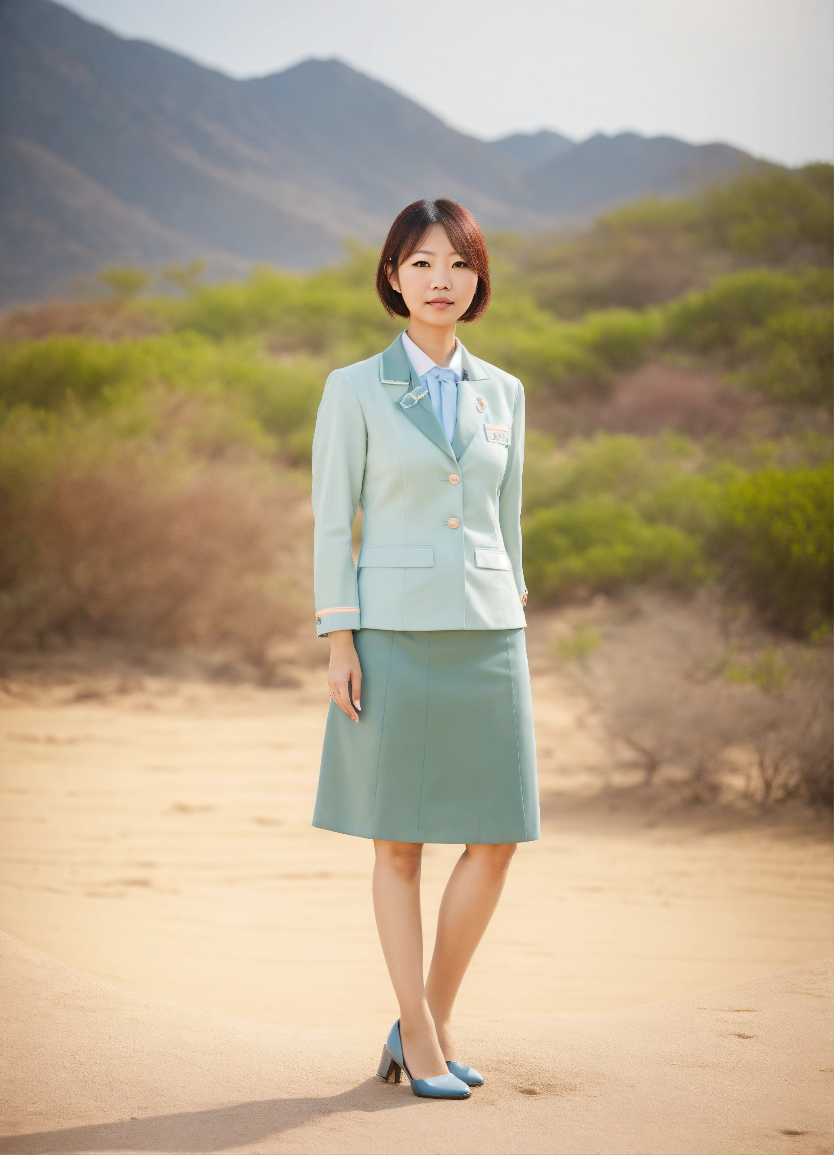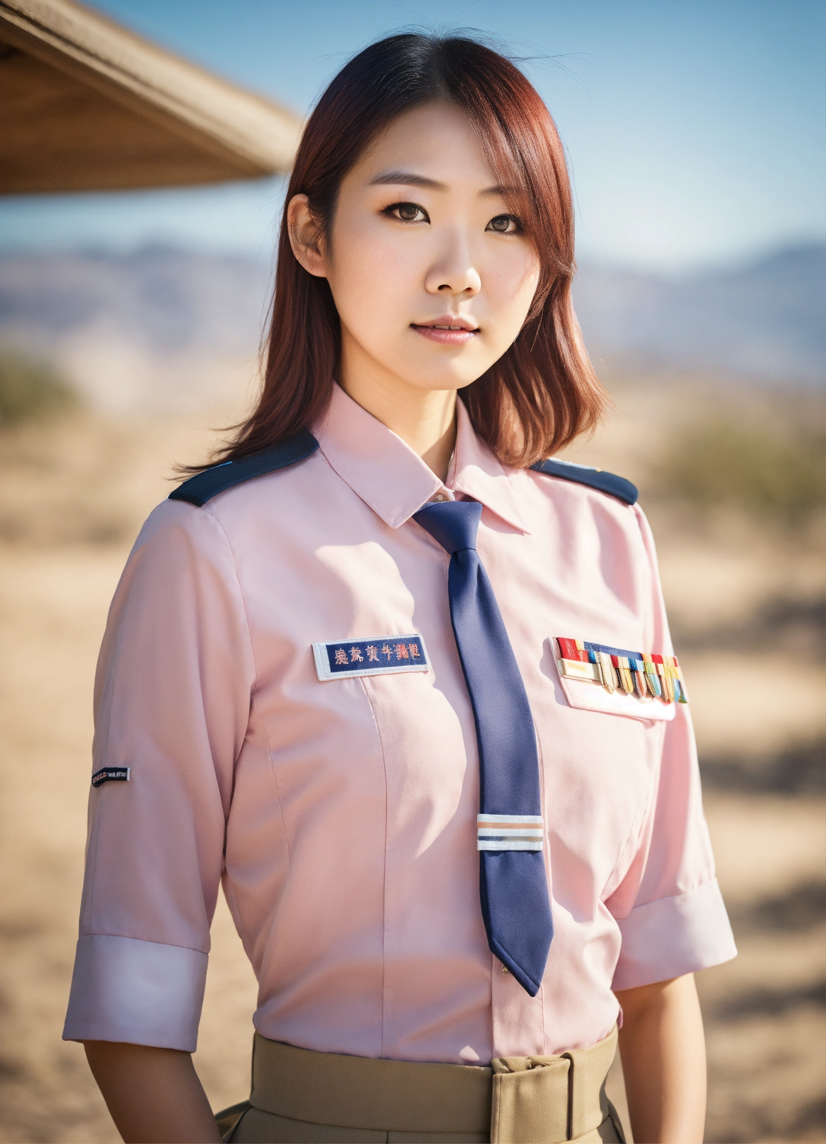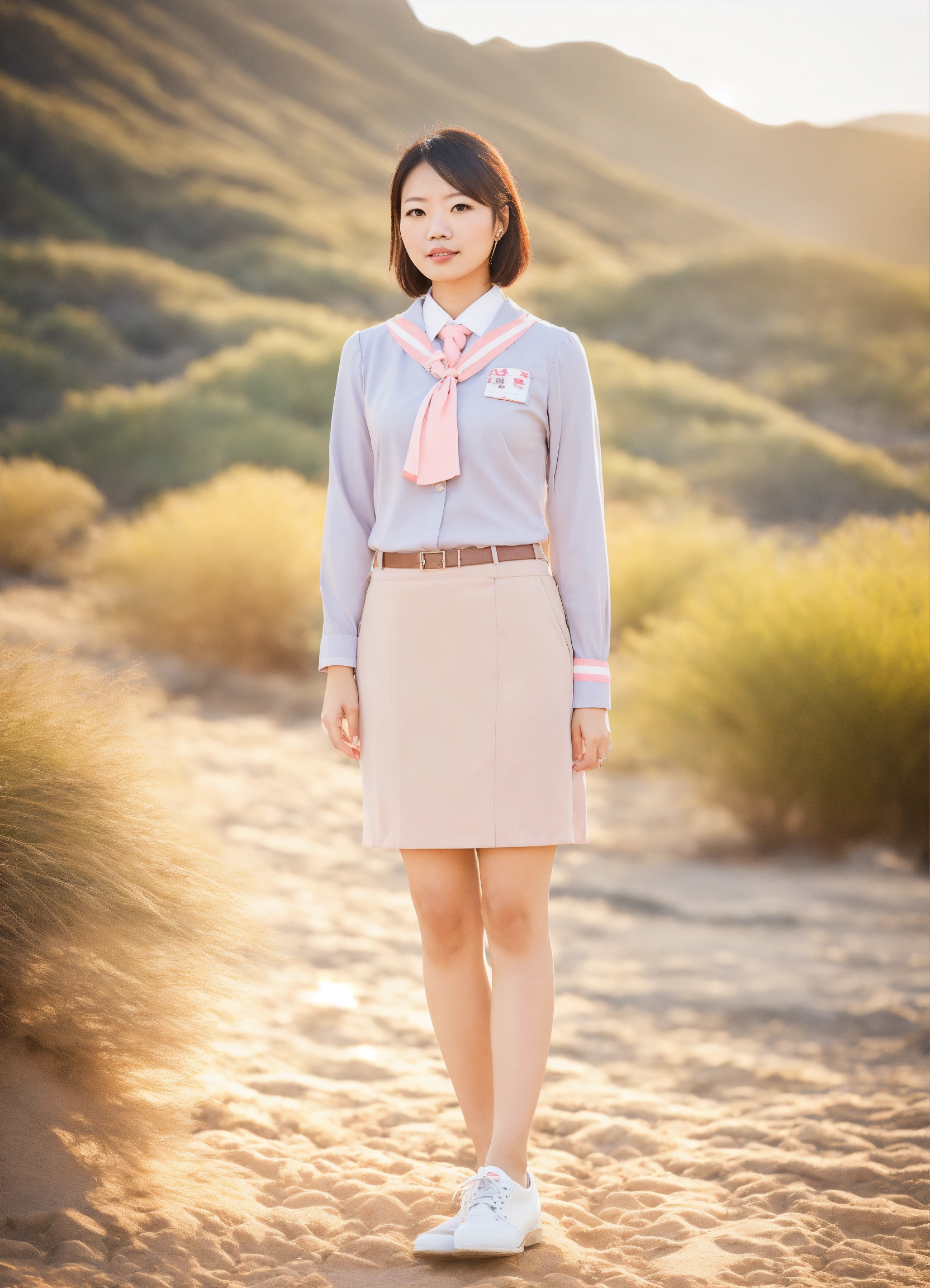 Portrait, japanese, office lady, shiny eyes, uniform, desert setting, full body, digital photograph, hong kong background, natural sunlight, subtle pastel hues.