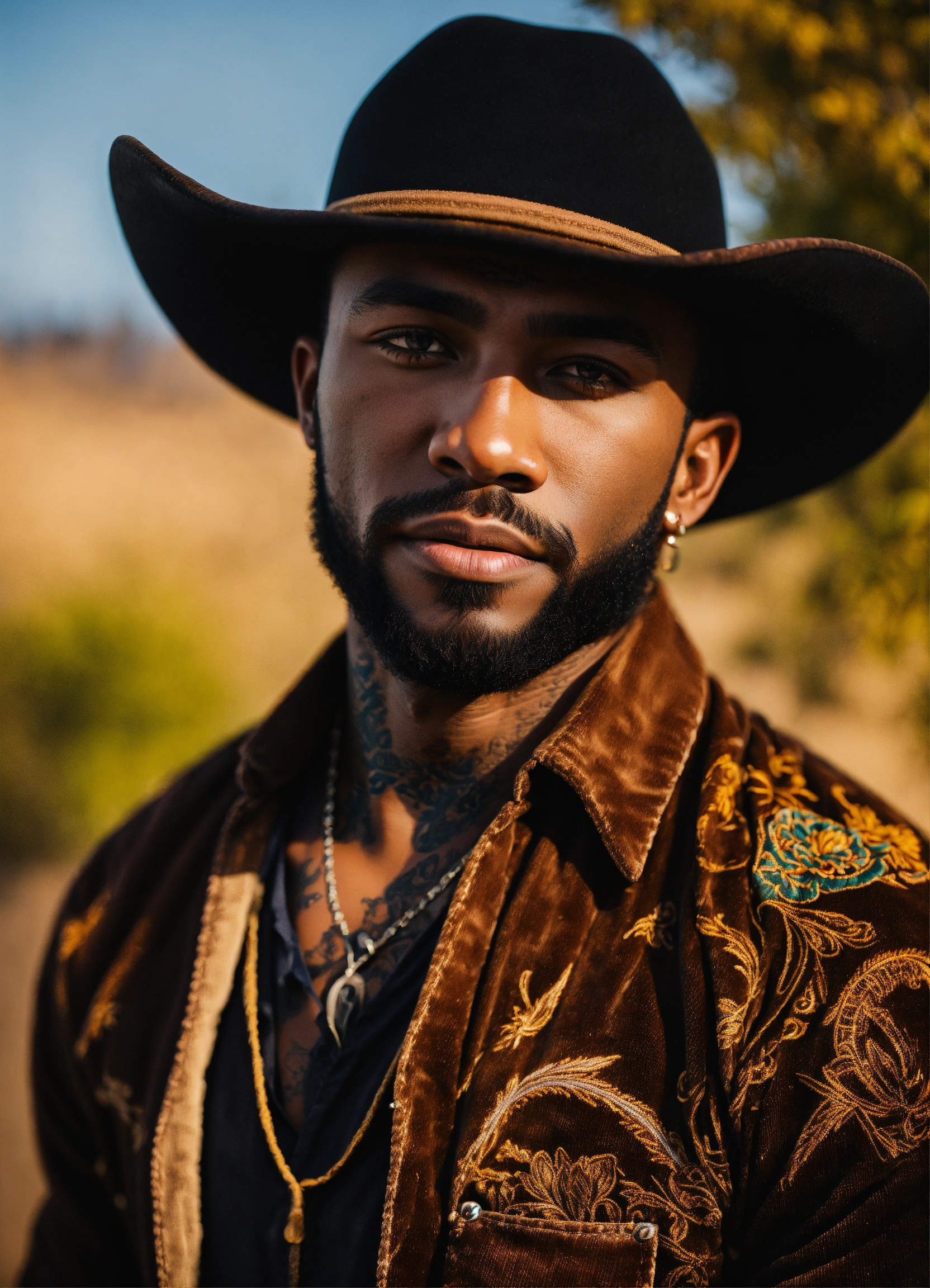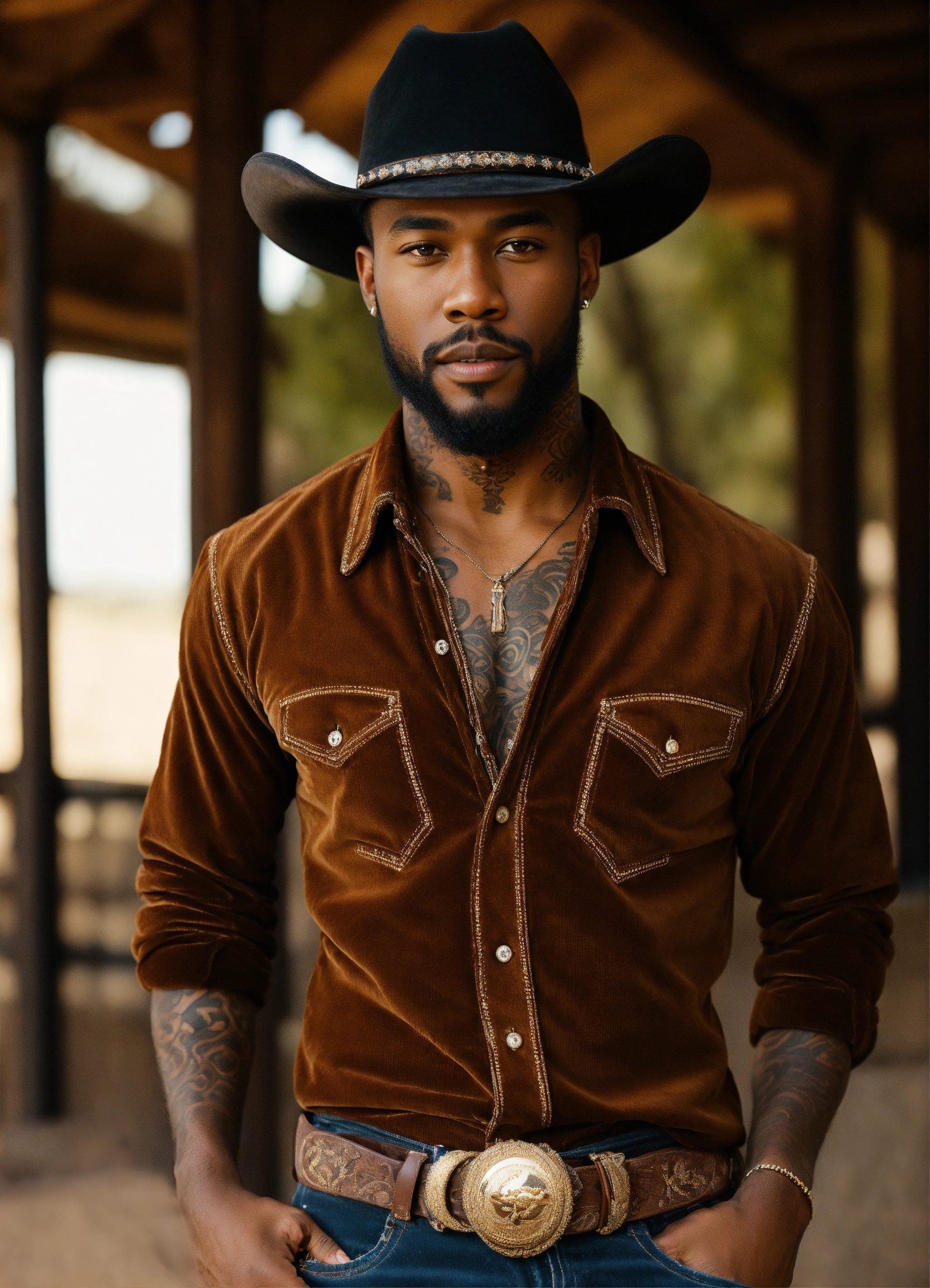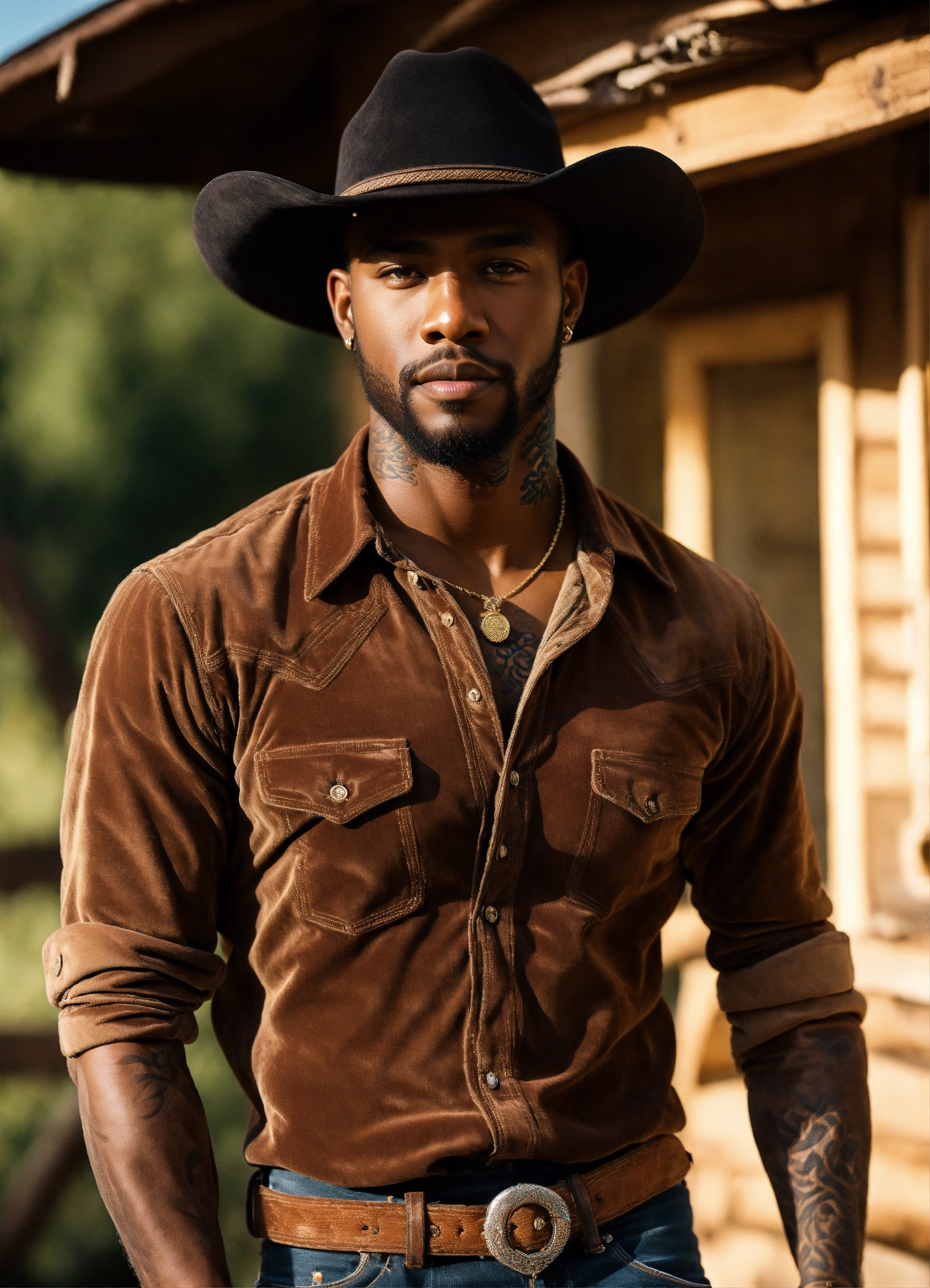 Handsome black male, cowboy, low beard, light eyes, chocolate skin, tattoos, black corduroy shirt, stetson hat