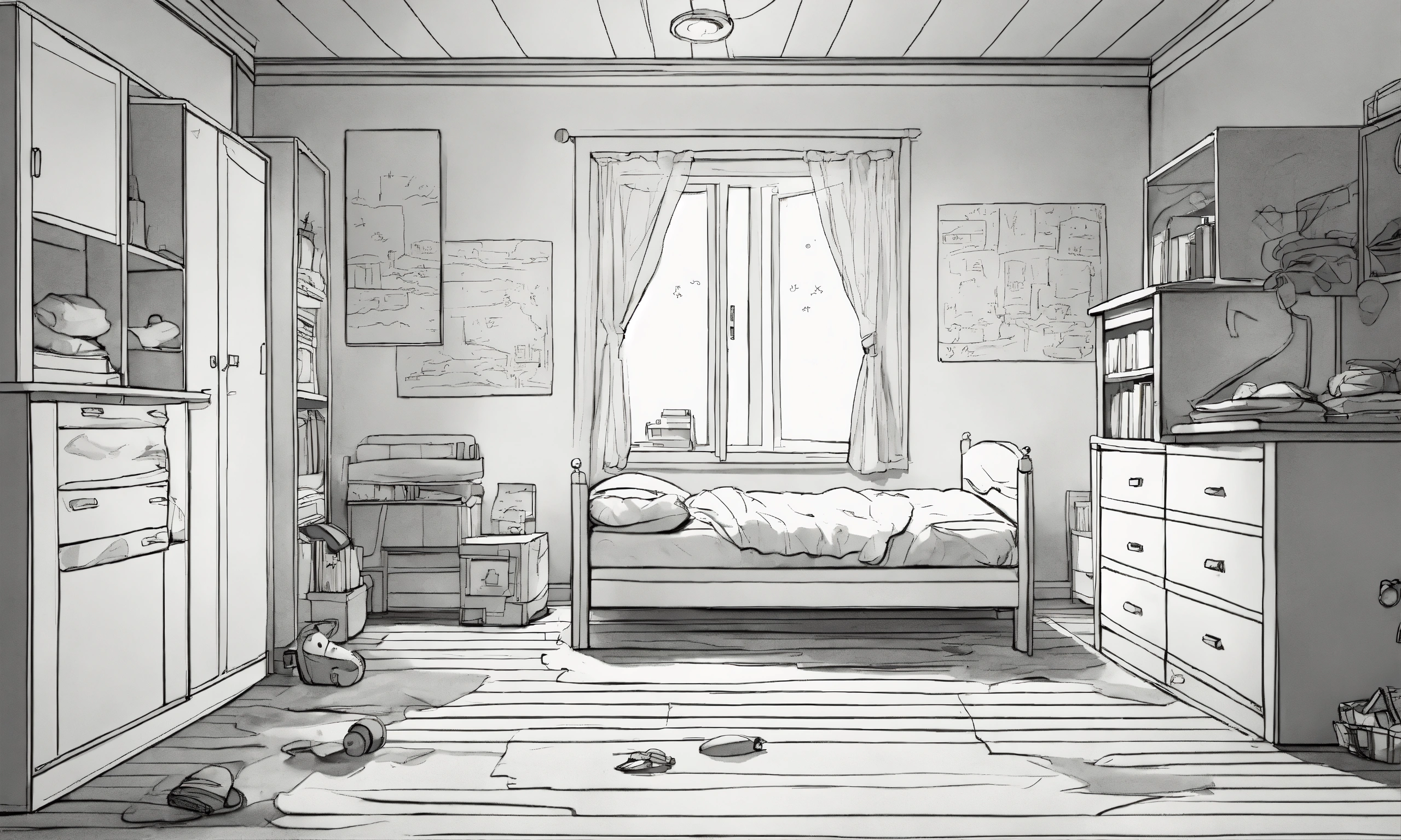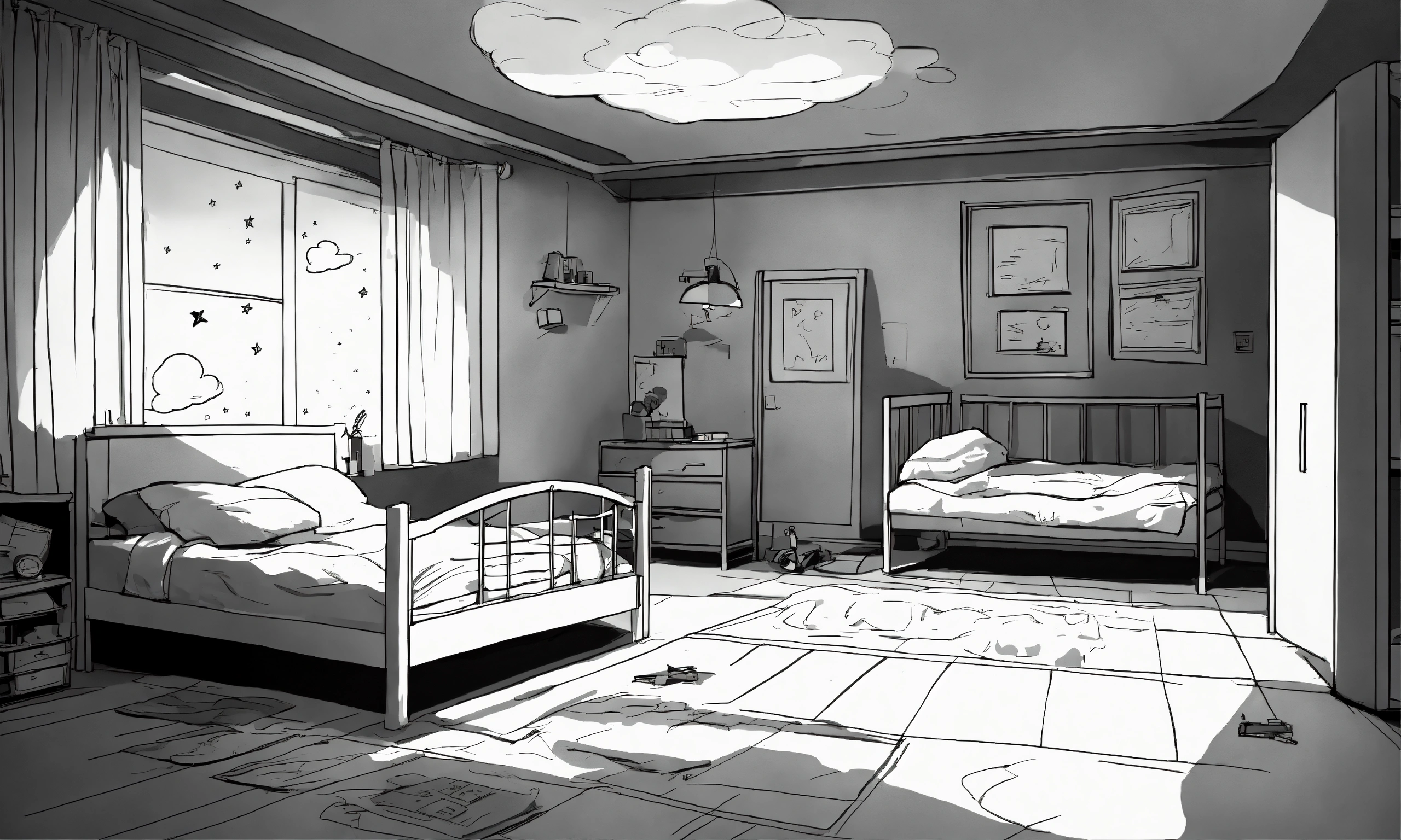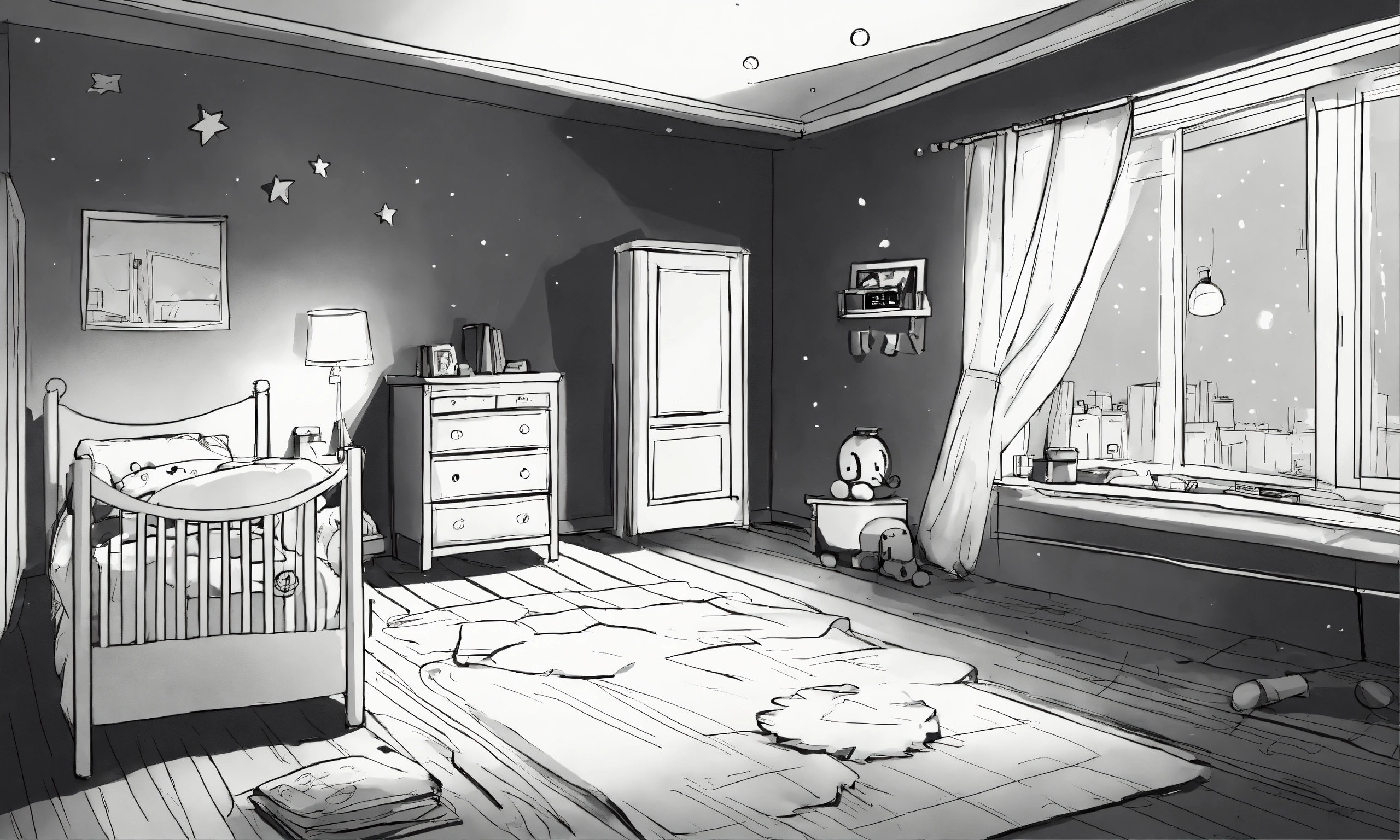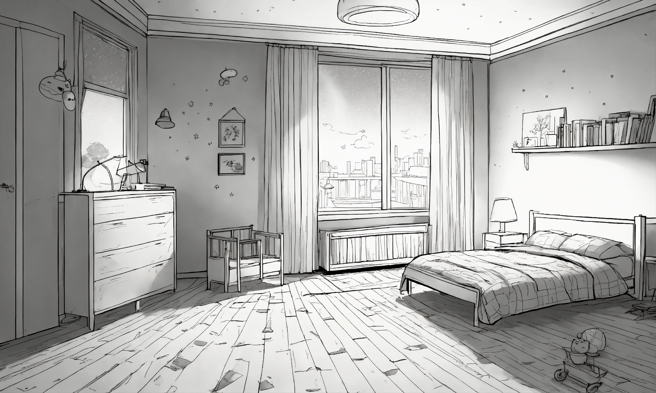 Minimalistic childrensbook like drawing of a huge and mostly empty children's bedroom at night without color