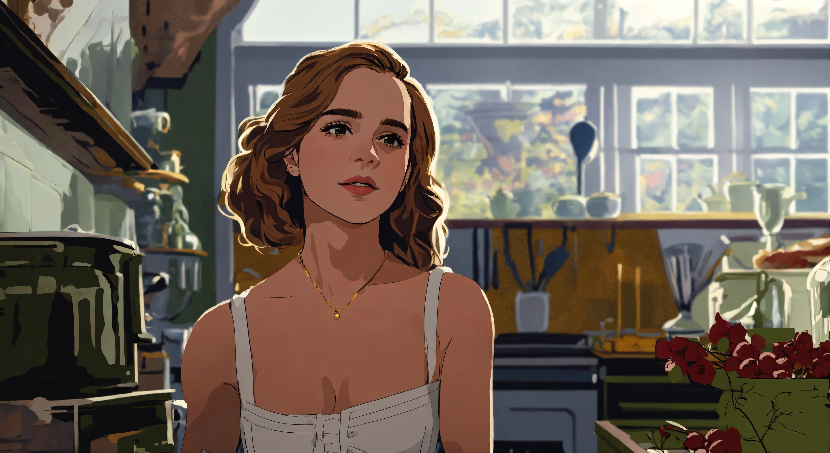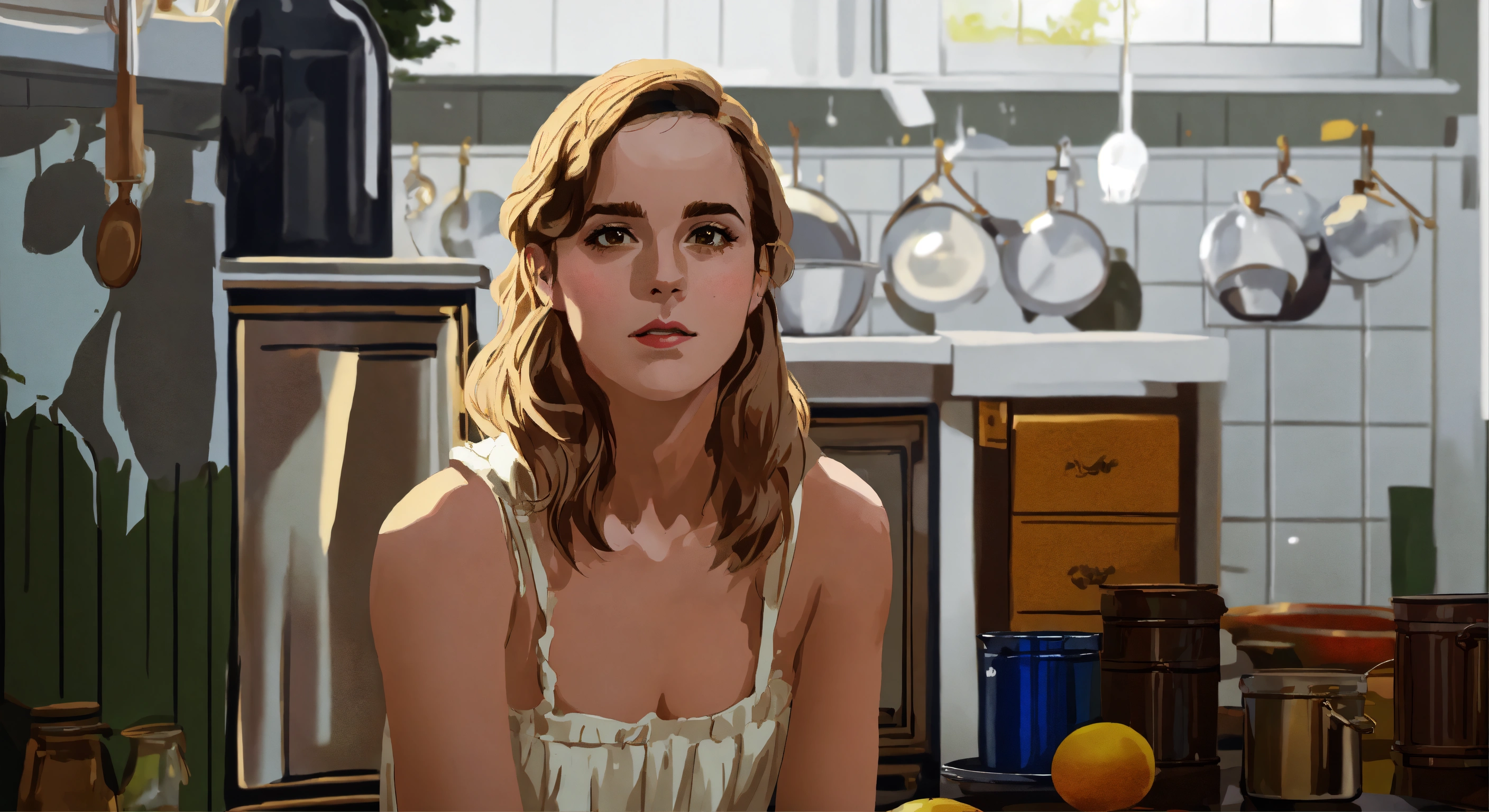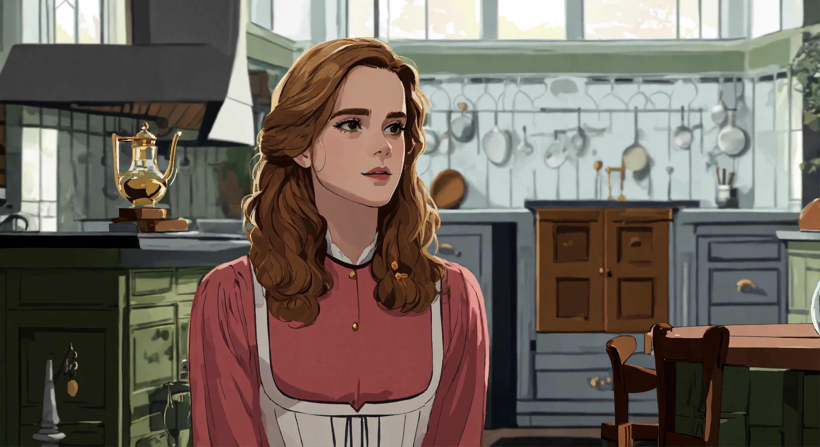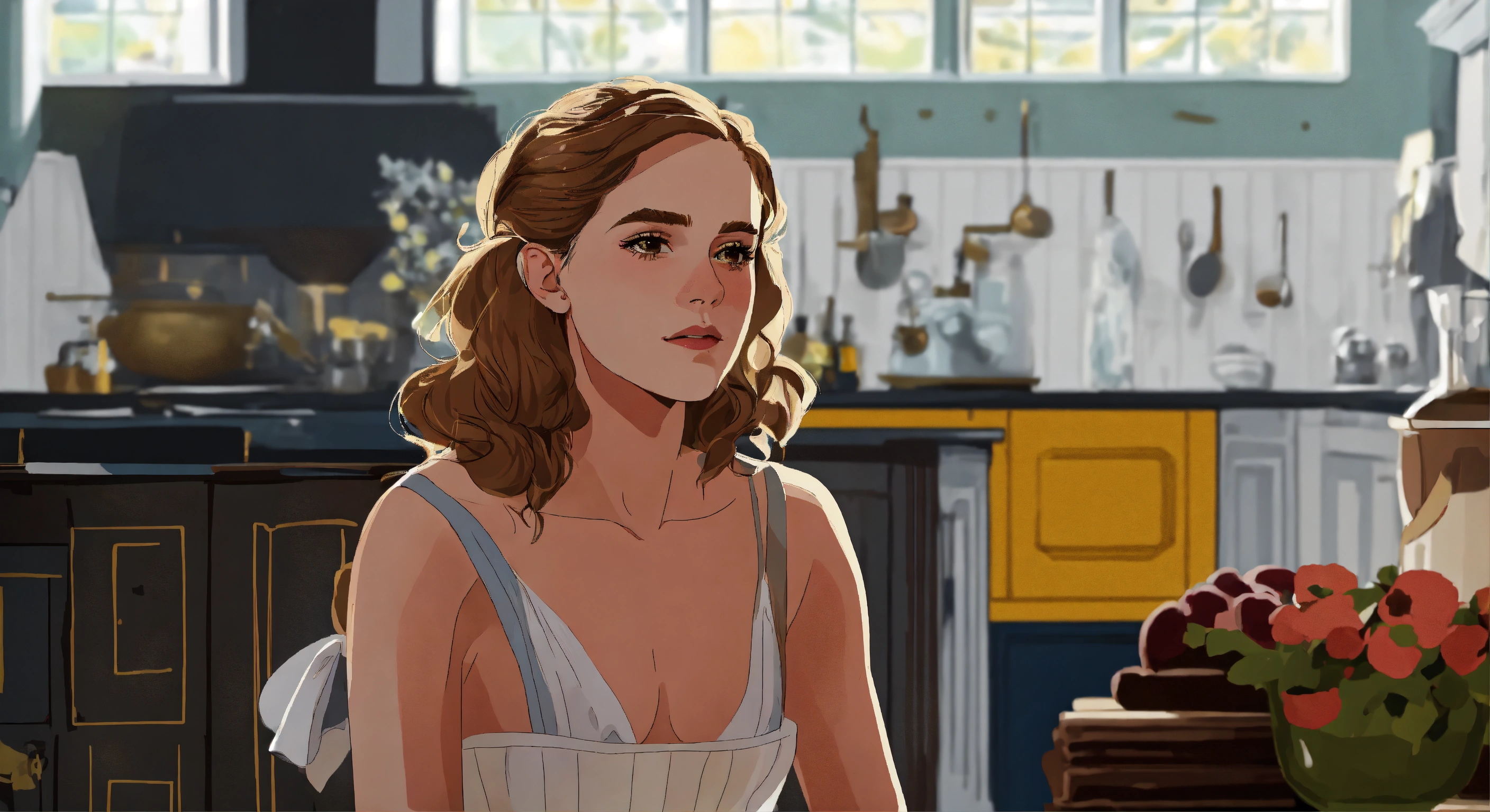 Emma watson as hermione granger in a white regency dress inside a regency kitchen a sophisticated country estate, naive style, schematic line illustration, flat colors, flat design poster, not too complex, modern, 4k, epic composition, flat vector art illustration, very realistic, vibrant colours, big shapes
