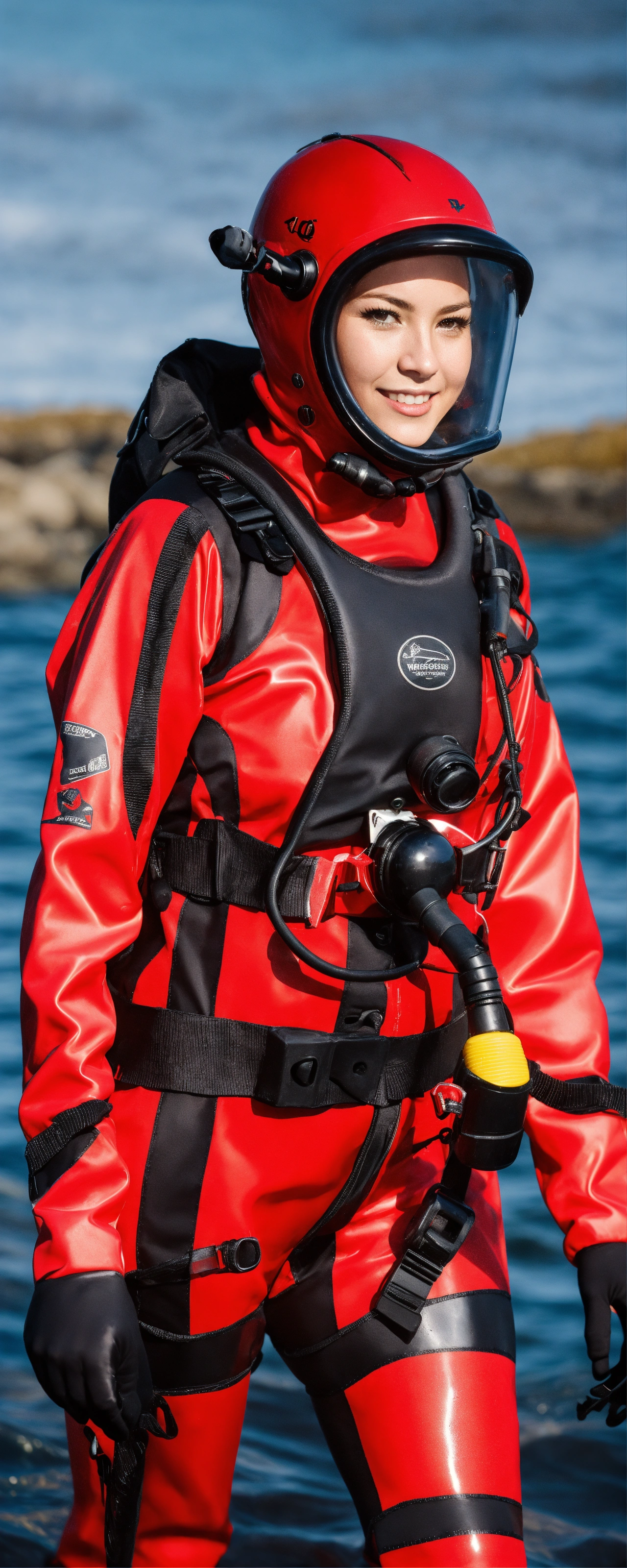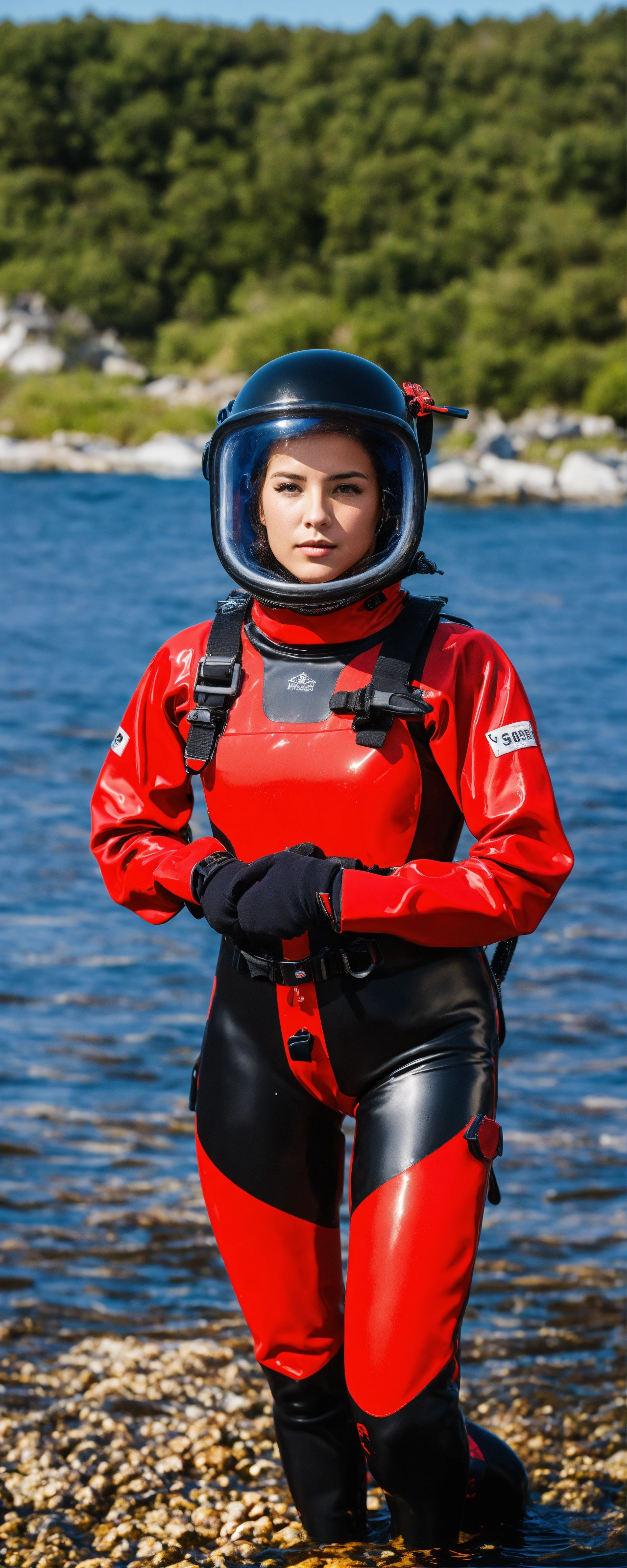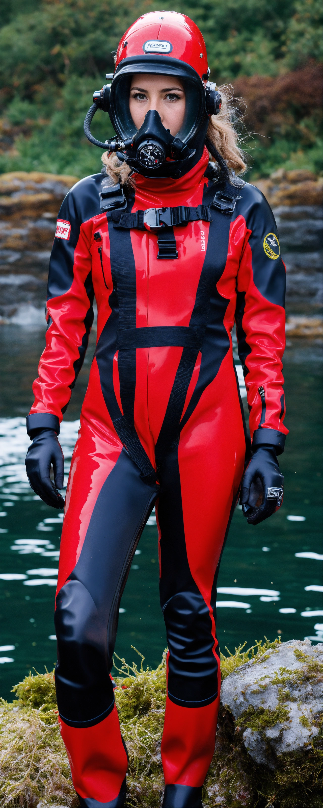 Female diver in red and black glossy viking drysuit