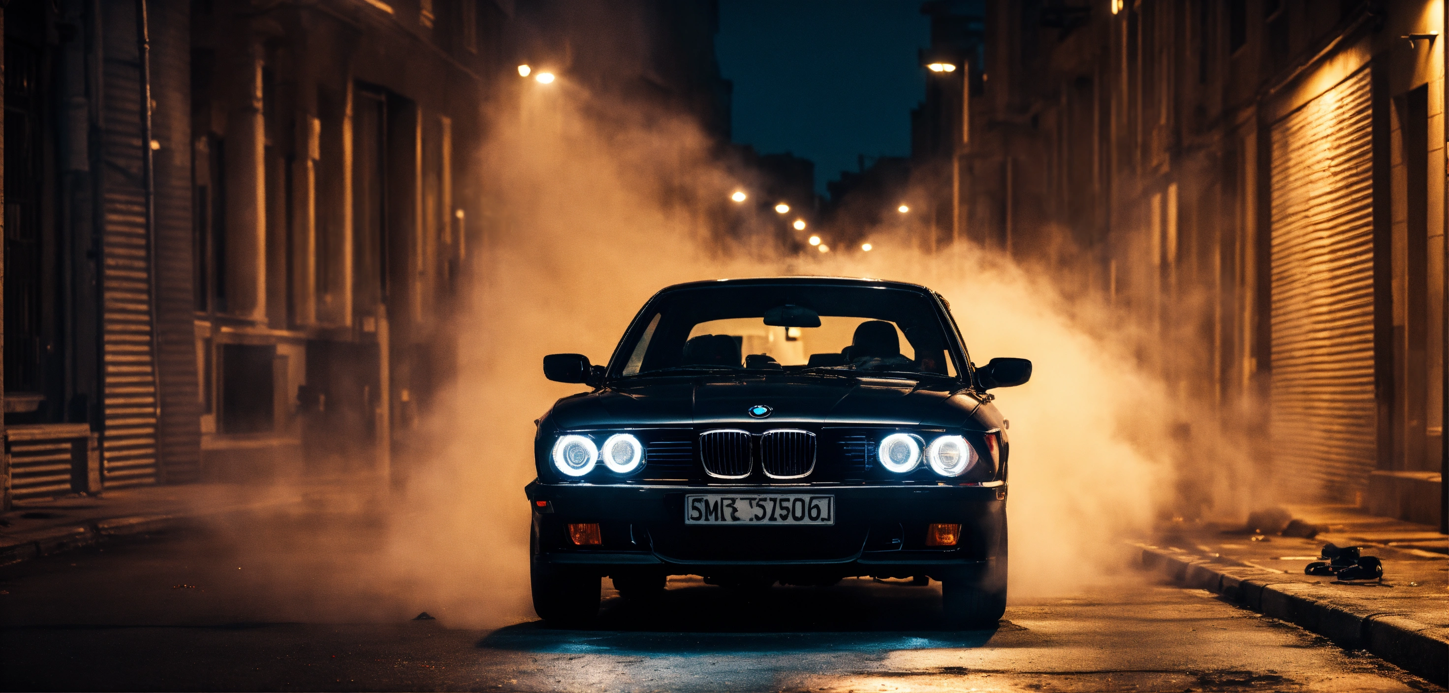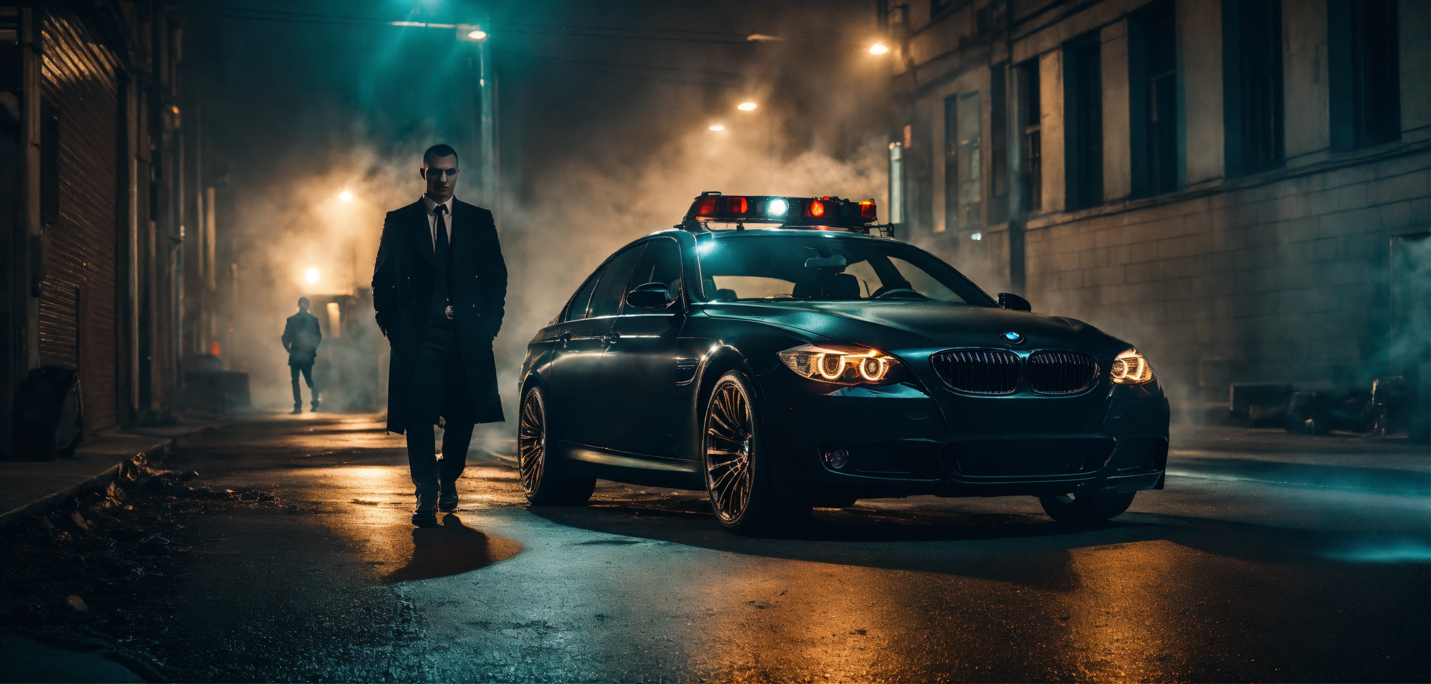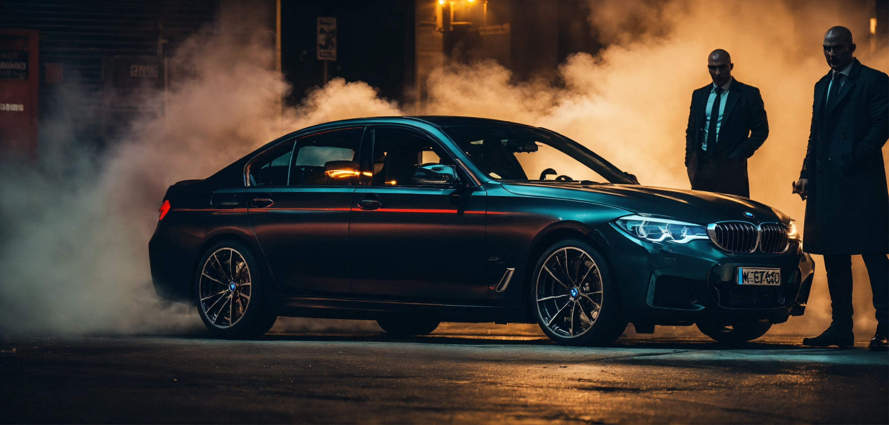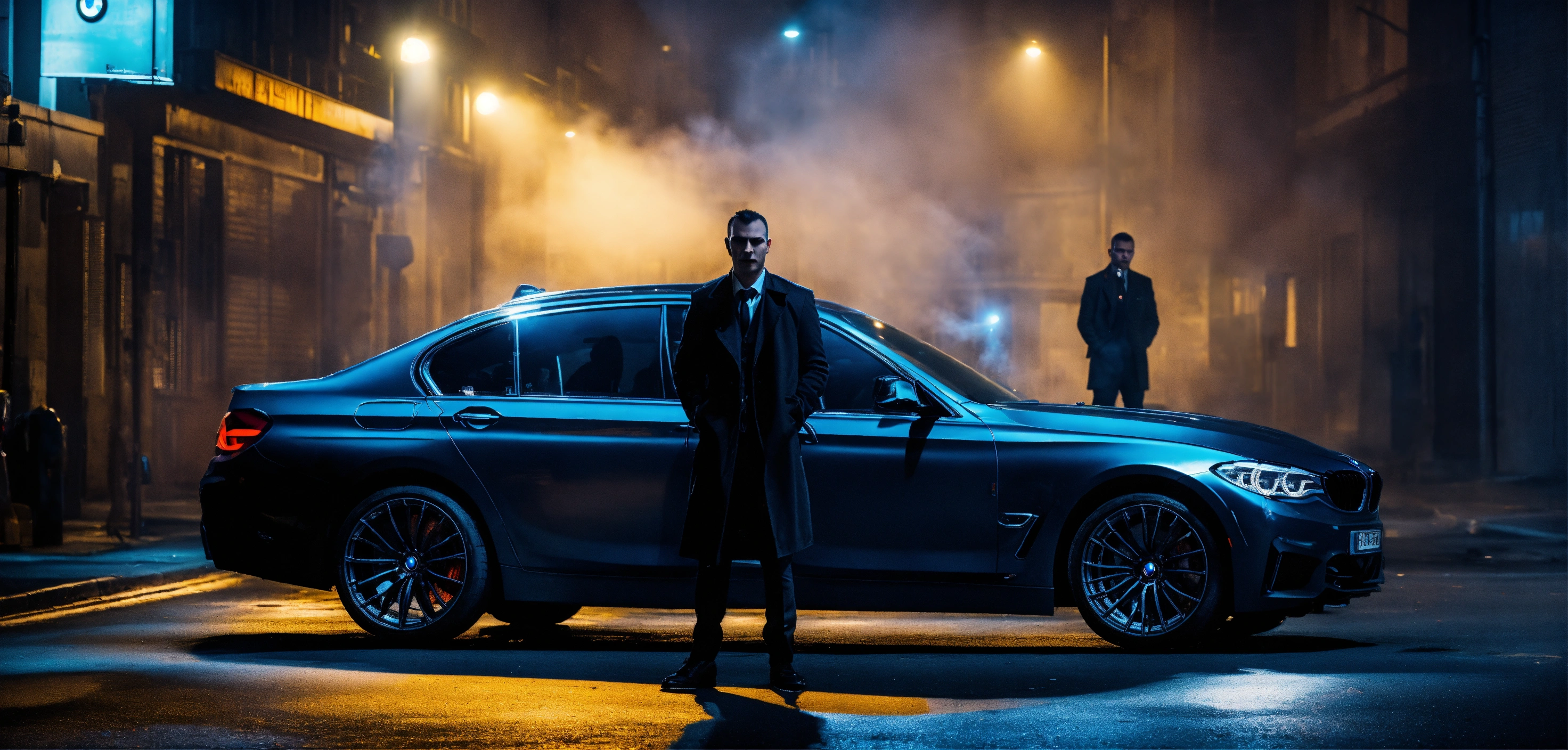 Cinematic look, urban side street by night haze, dim light, two bodyguards standing in front of a black modern bmw car, backlight of the car headlights, steaming manhole covers, underworld vampire movie style
