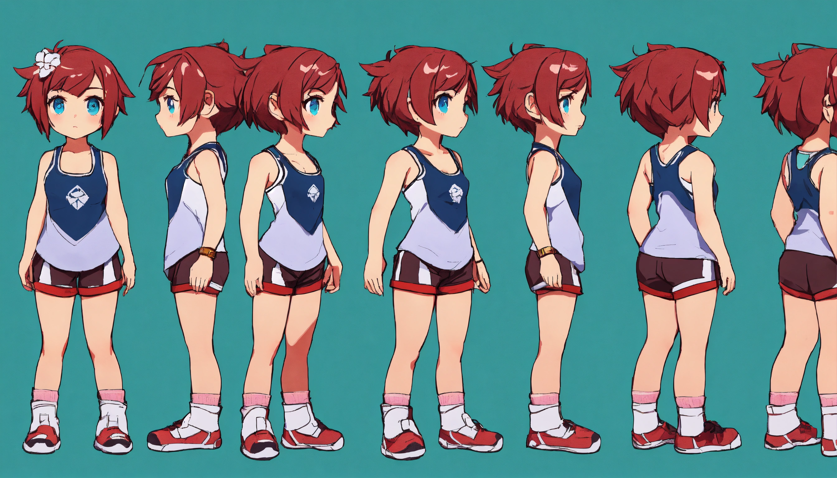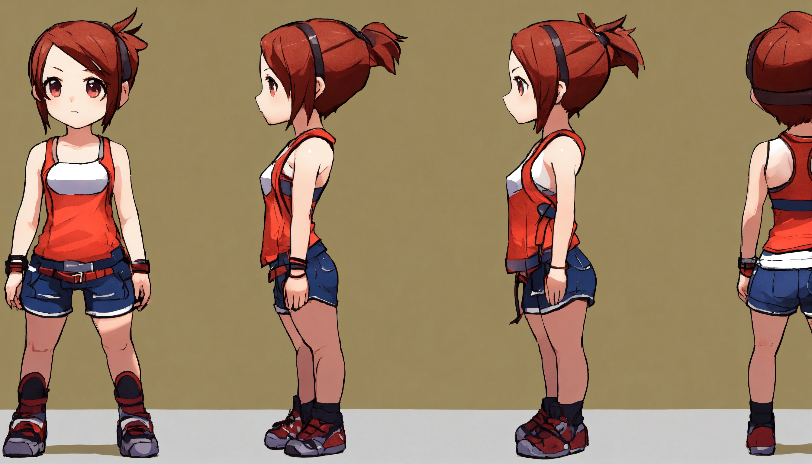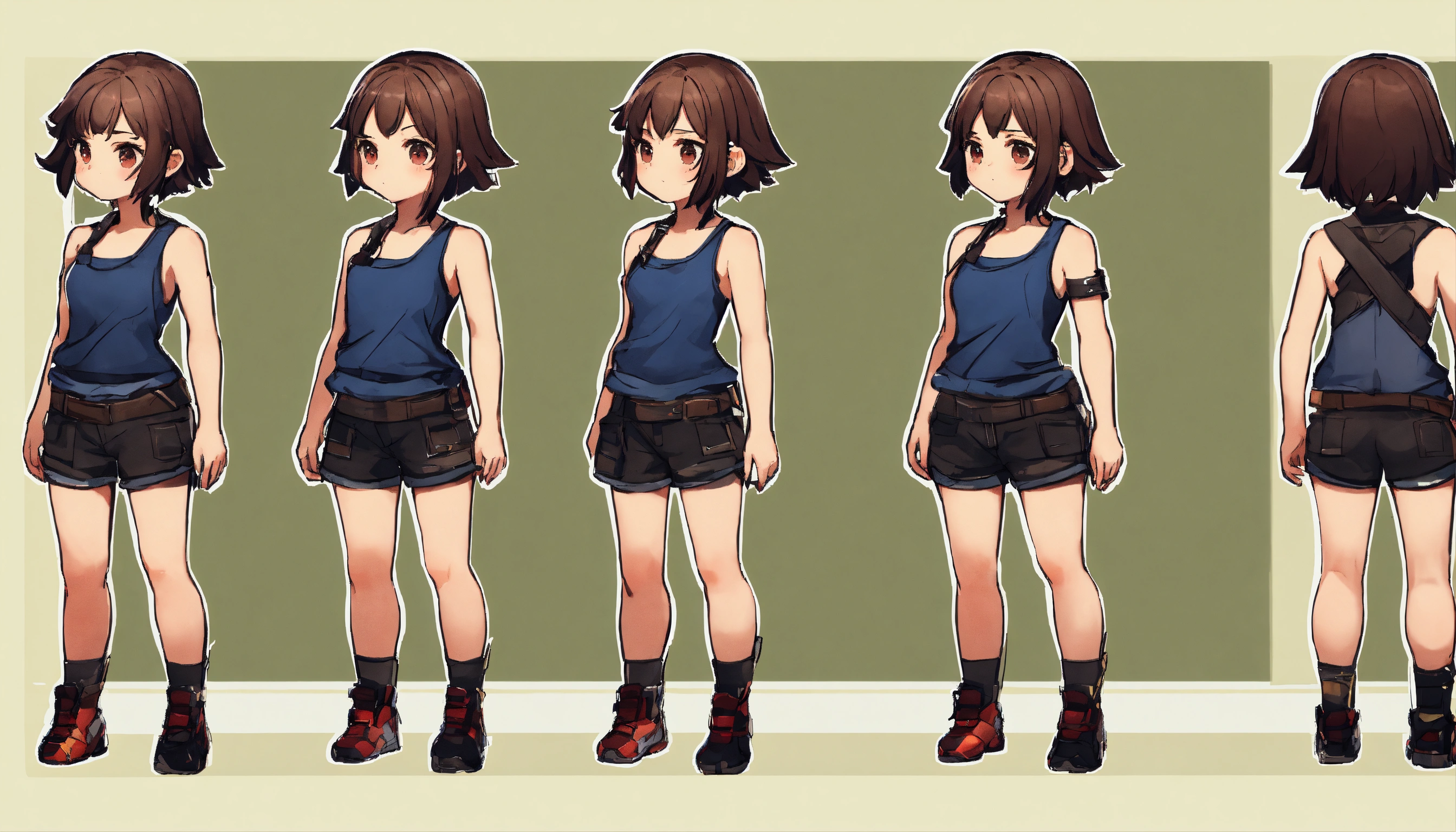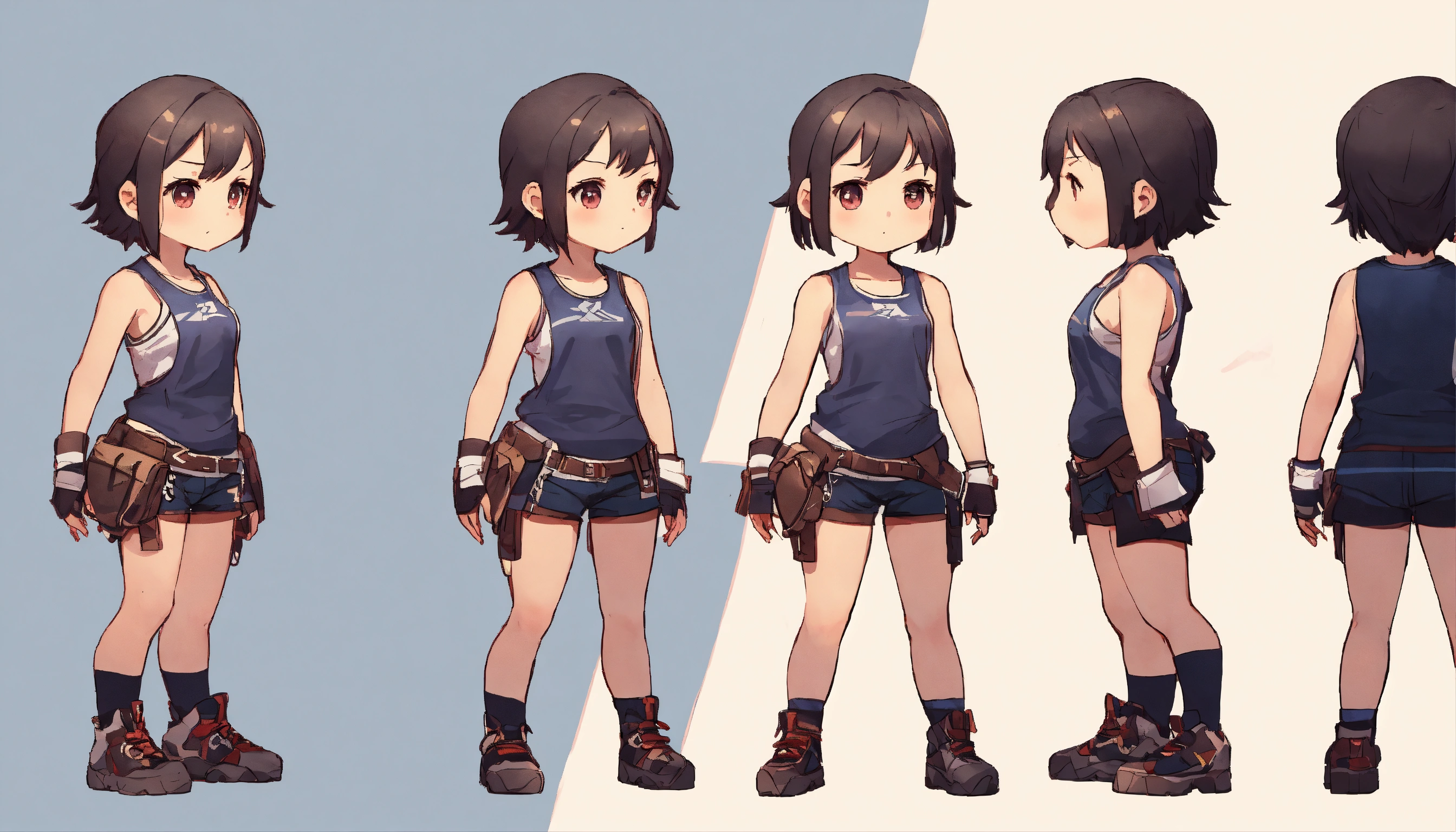 Game art, short haired girl wearing tank top and shorts, multiple poses, full body view, side view, chibi proportions, blank background, artstyle from the game ragnarok