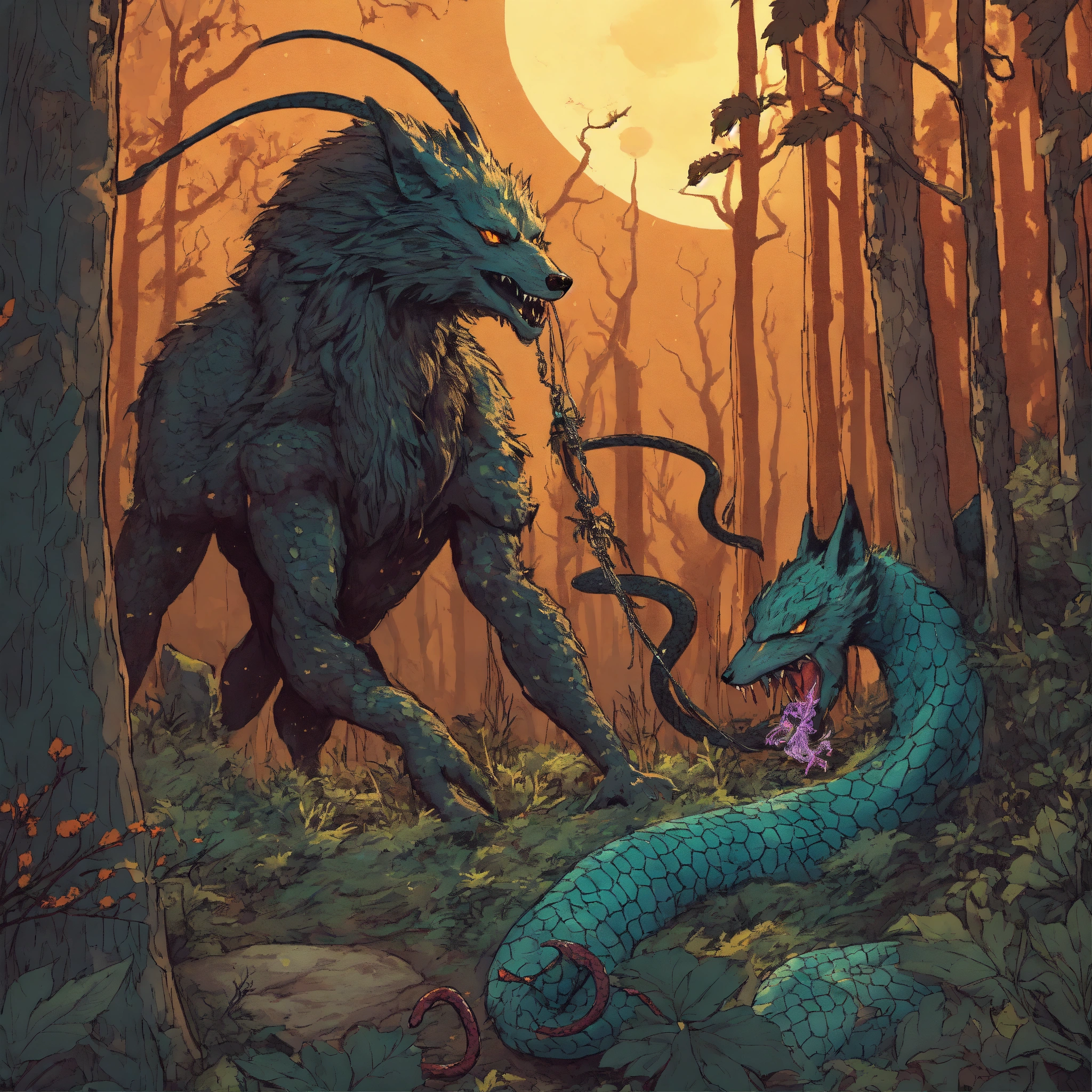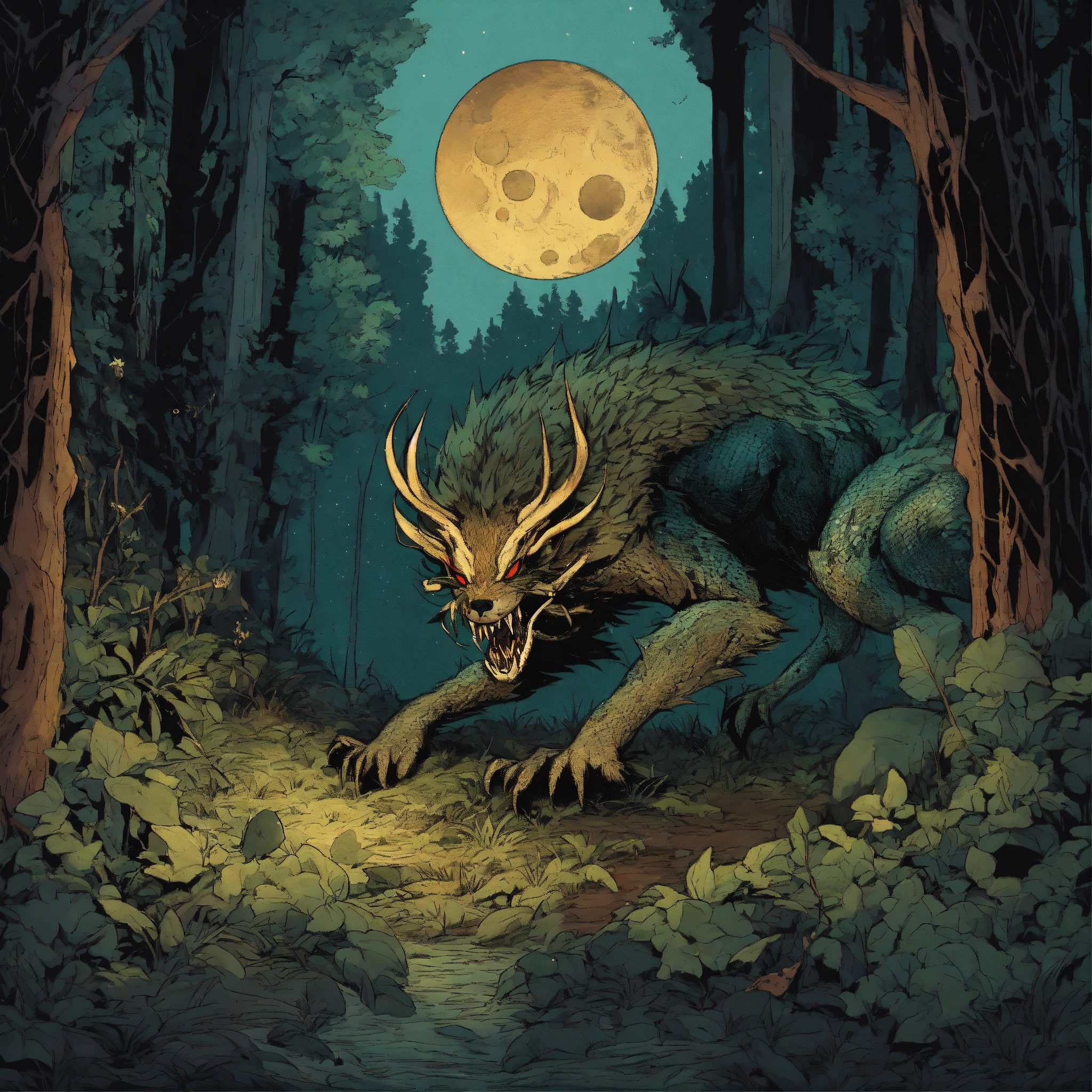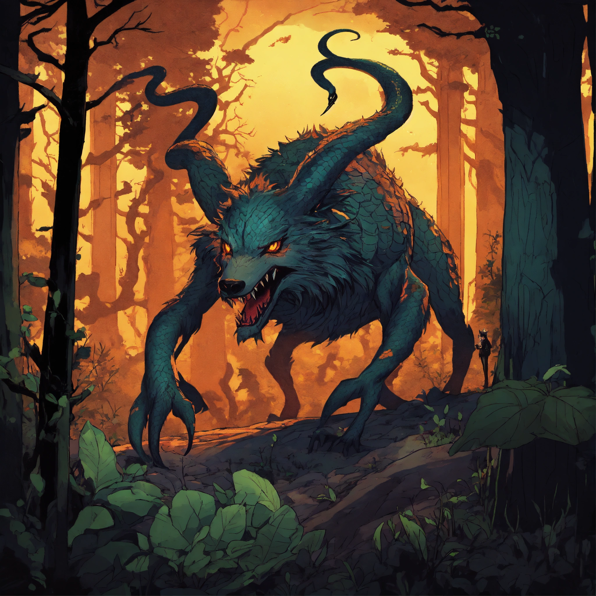 A fantasy monster that has the body of a spider with snake scales, and a wolf head, roams the forest at night, graphic novel art