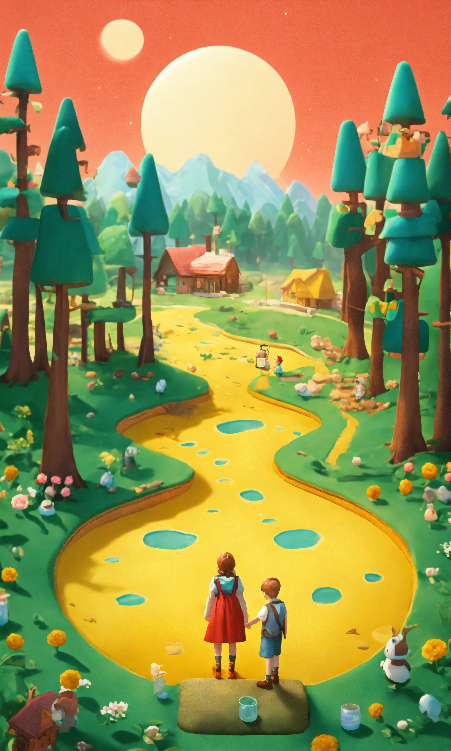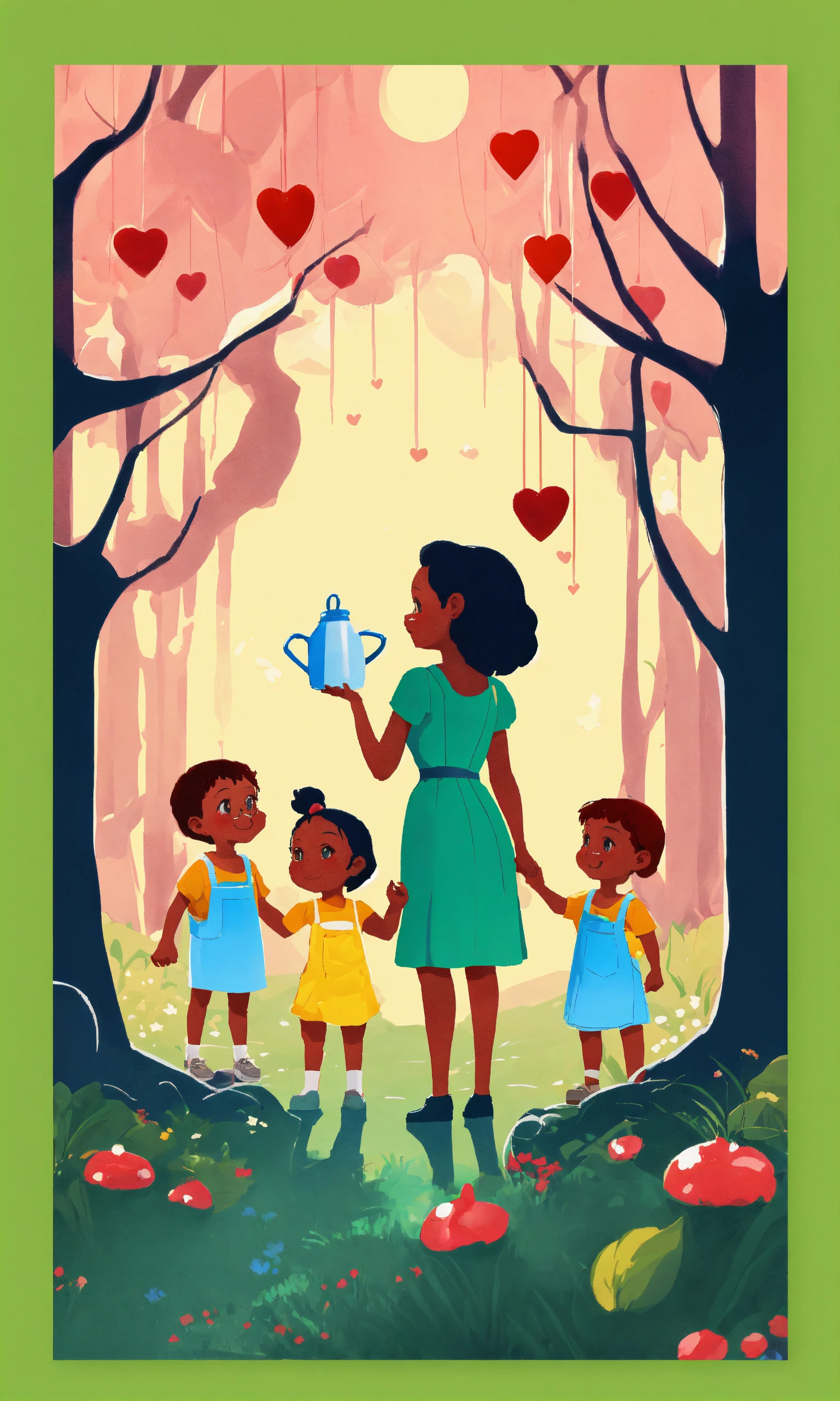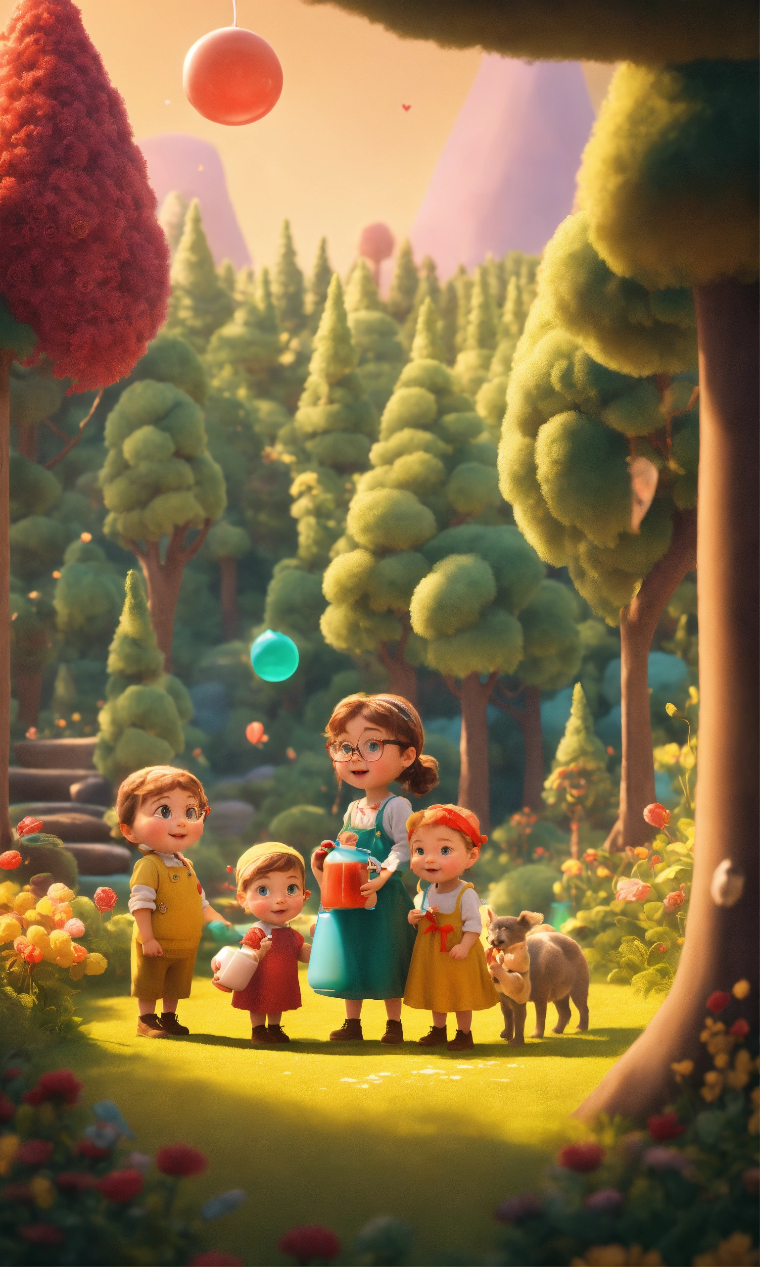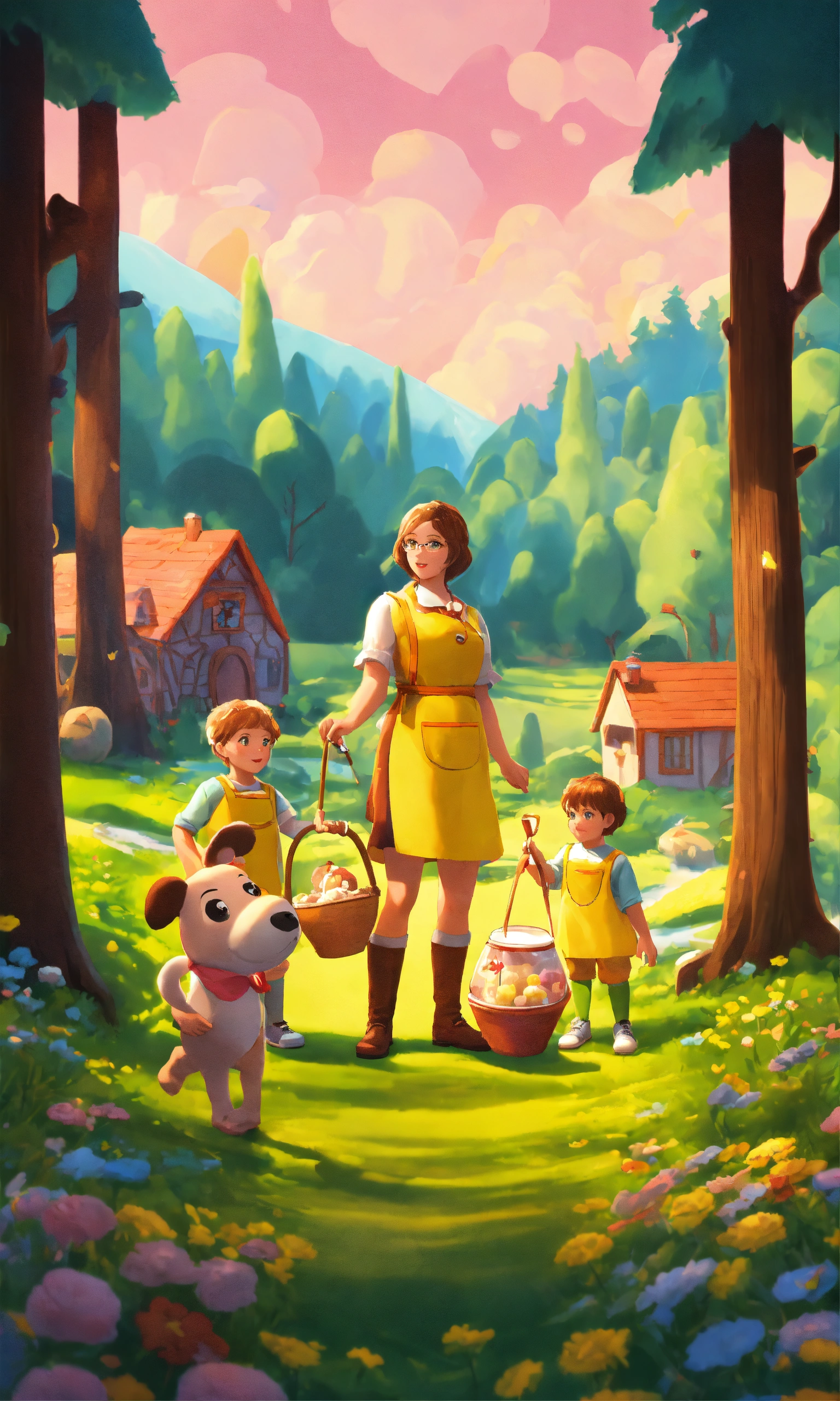 Create a 3d animated movie-style poster featuring a mother dressed in yellow holding a milk jug, standing next to her are three children a two-year-old baby in red, a six-year-old baby in green, and a ten-year-old girl in light blue and yellow. all of them have glasses of milk in their hands. in the background, create a milk-based forest landscape in the style of hansel and gretel, forming a heart shape around them. this composition should be in 4k full resolution, resembling a movie poster.