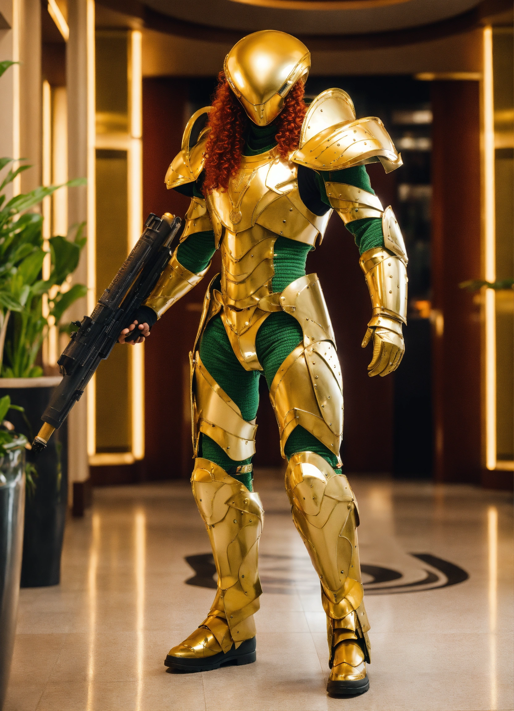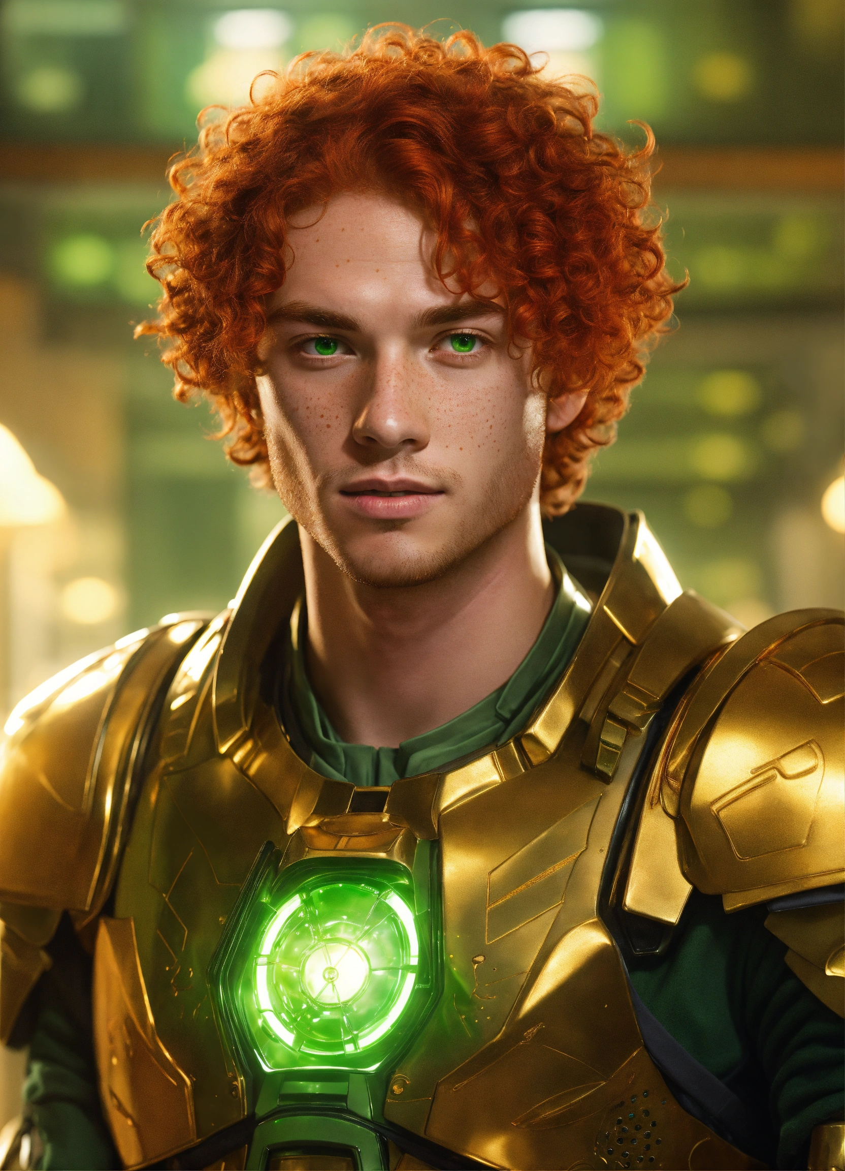 An alien university male student. red curly hair. angular face. round green eyes. freckled body, in gold battle armor. in upscale hotel lobby. athletic frame happy persona.