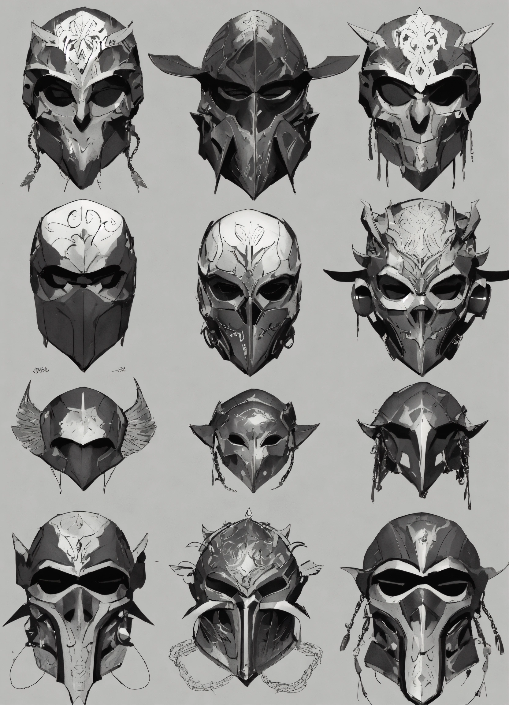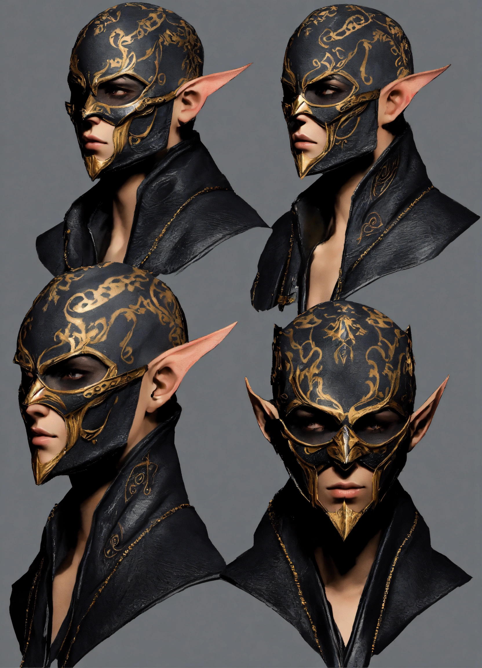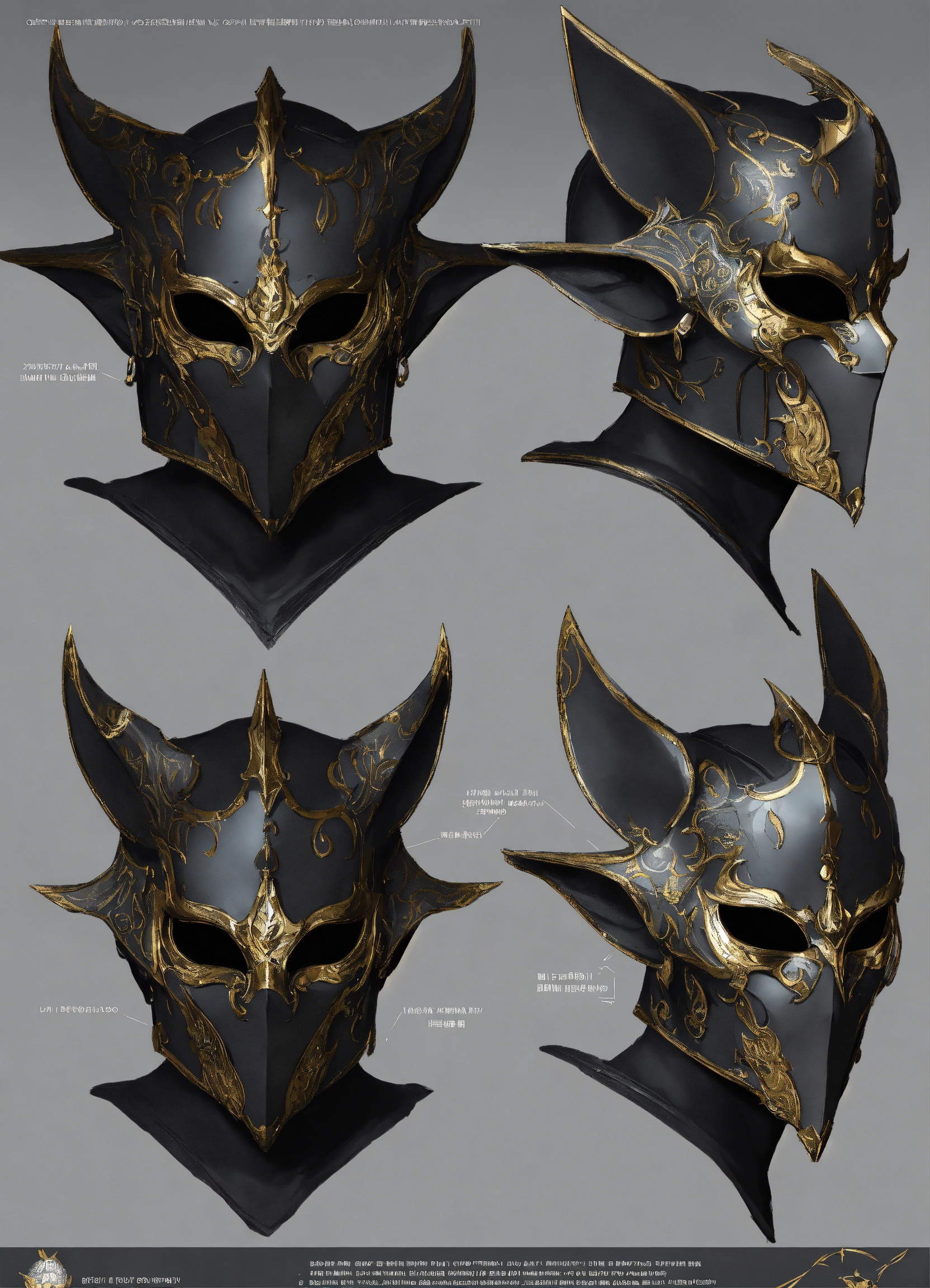 Black tattoo mask, character sheet, character design, chart, reference sheet, multiple views, high detail, fine details, concept art