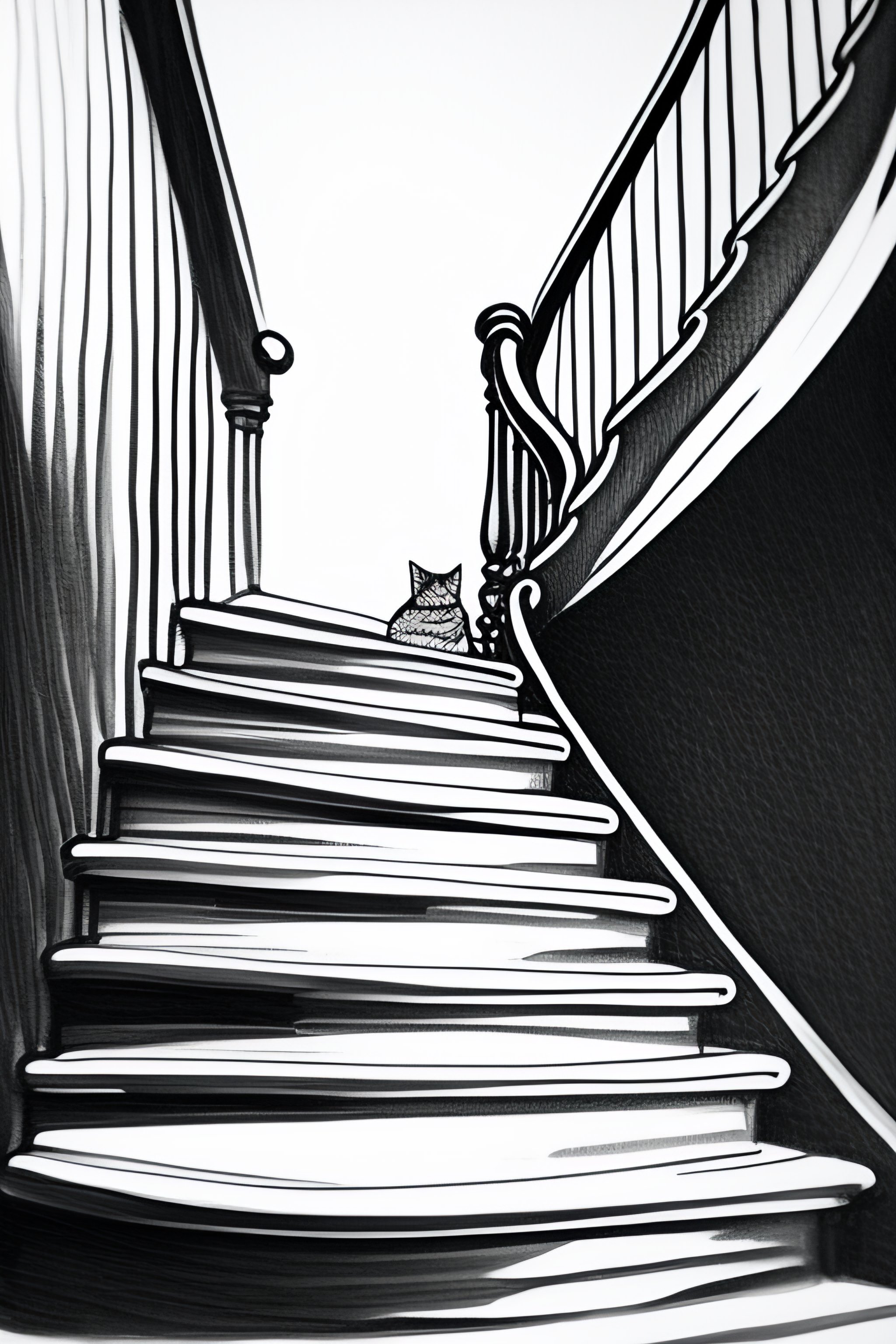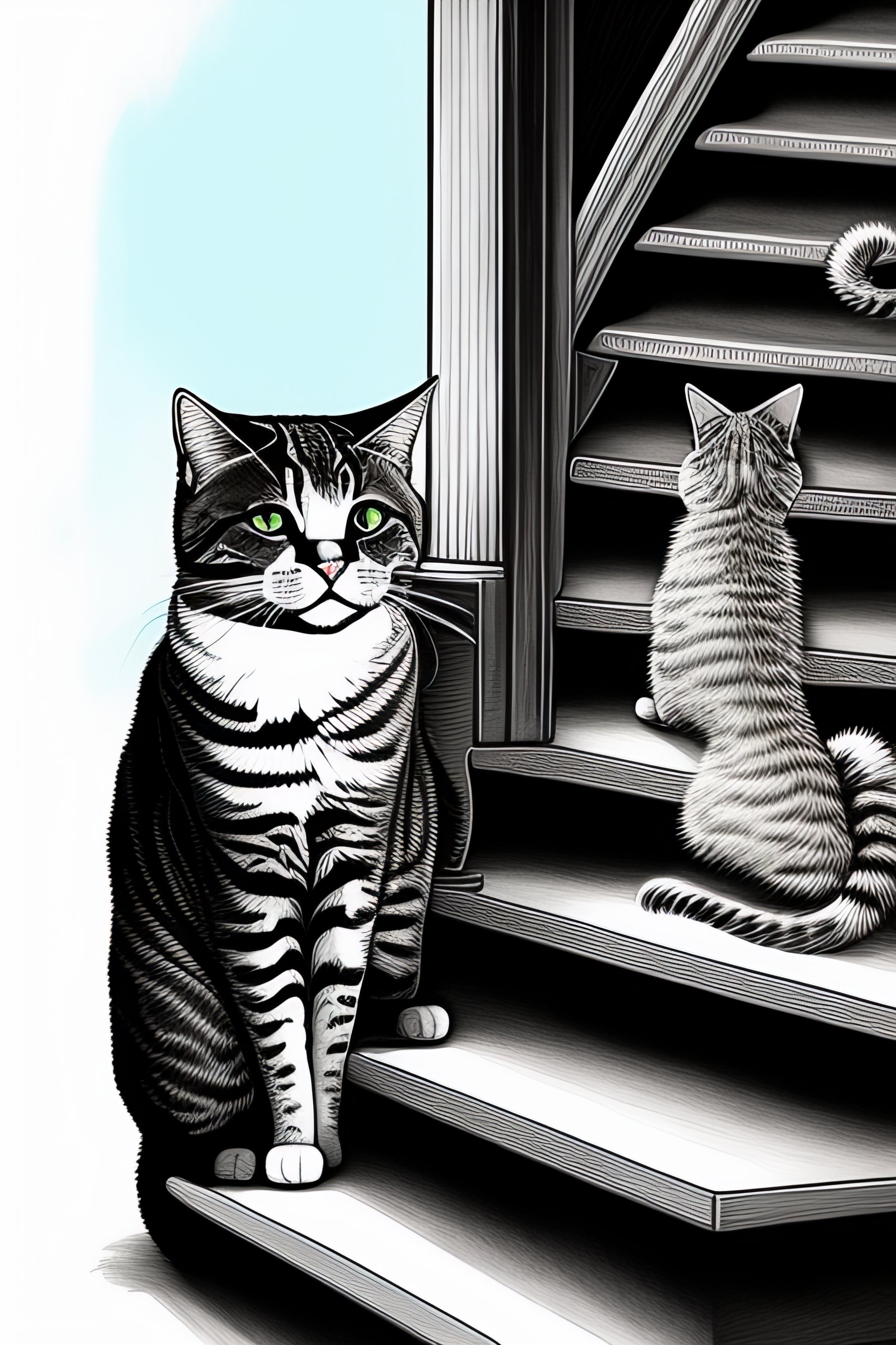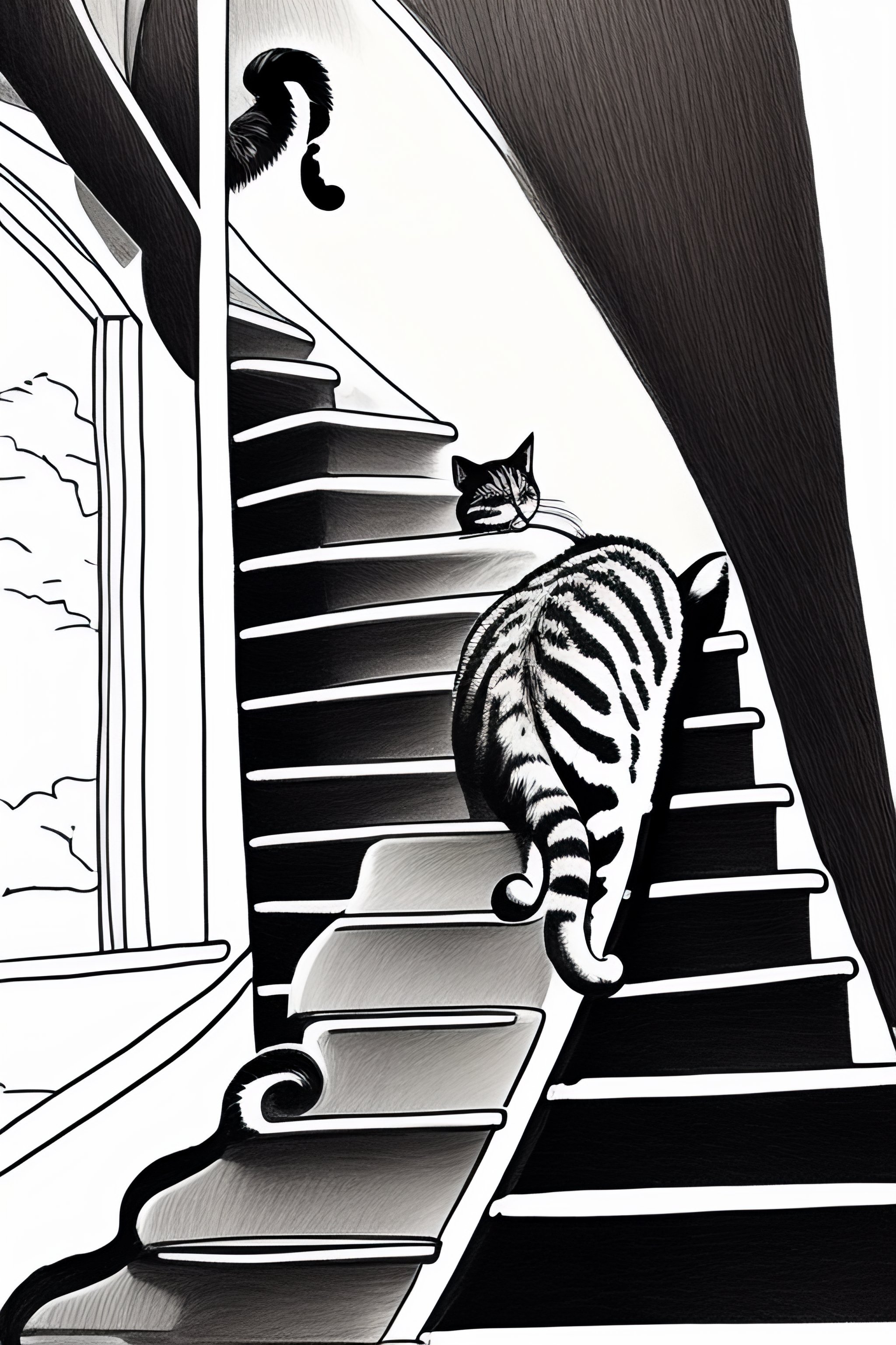 Line drawing of a cat tripping his owner down the stairs