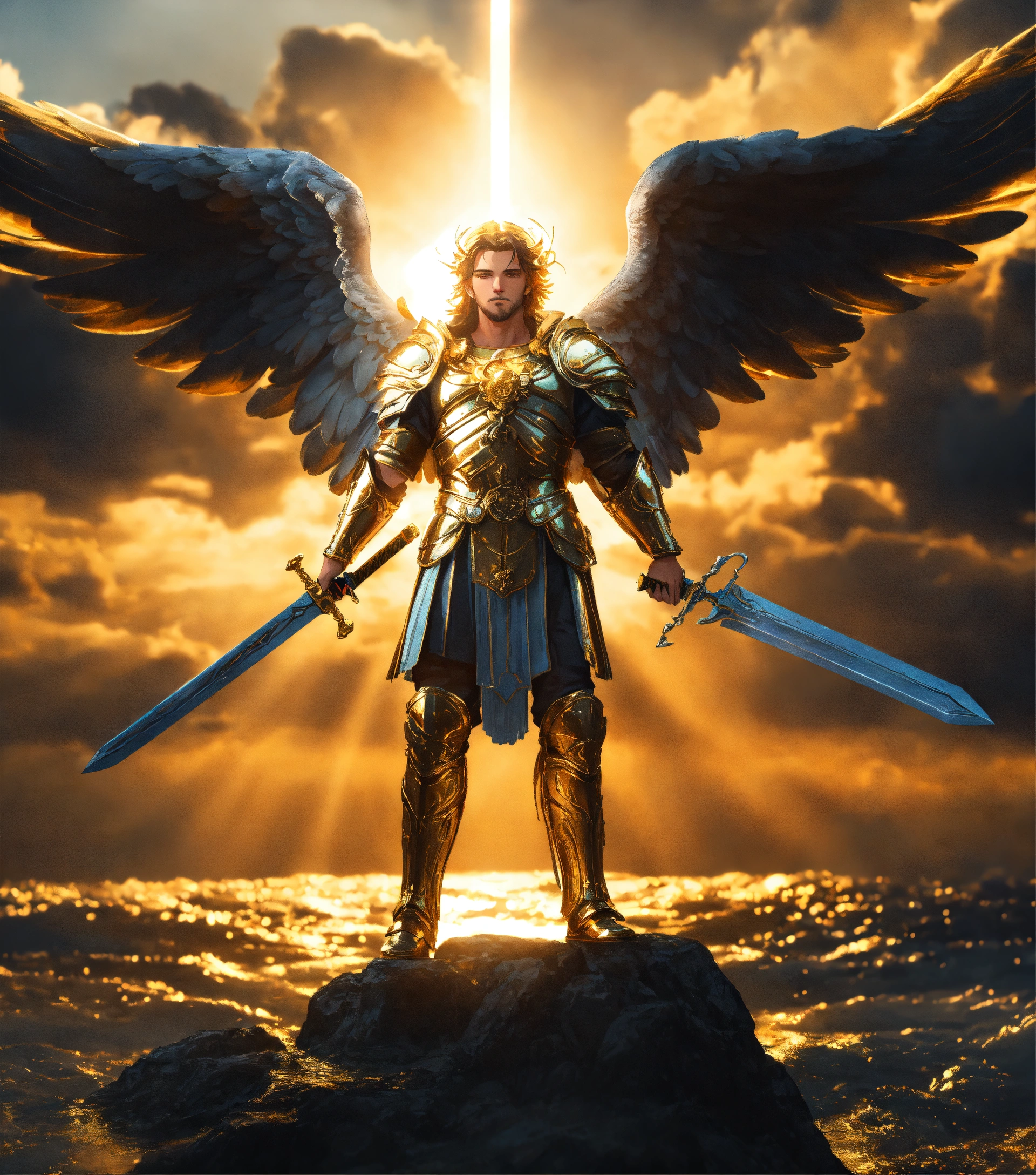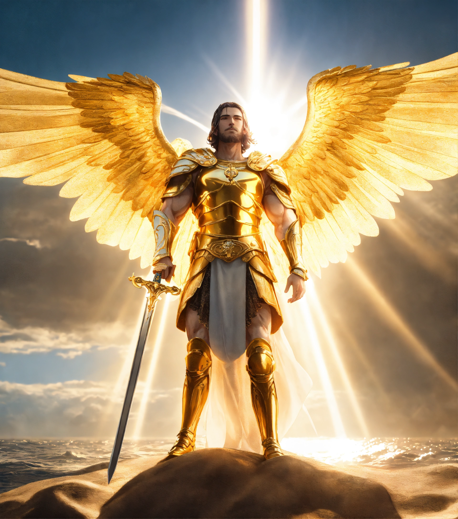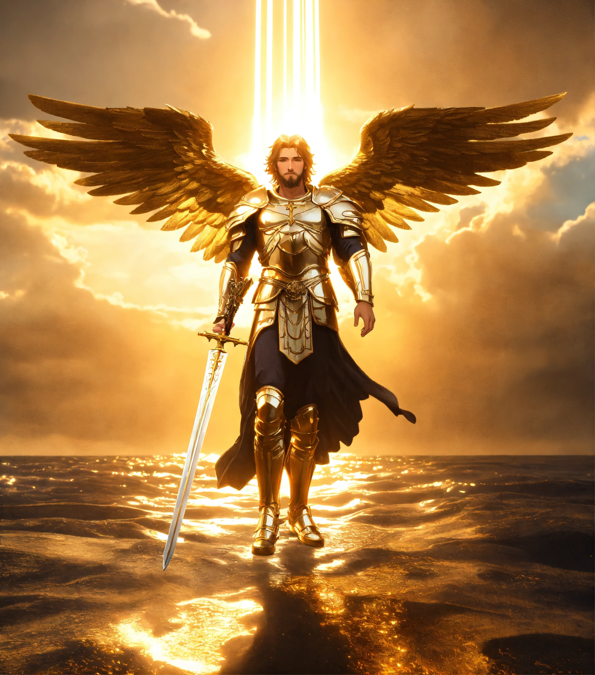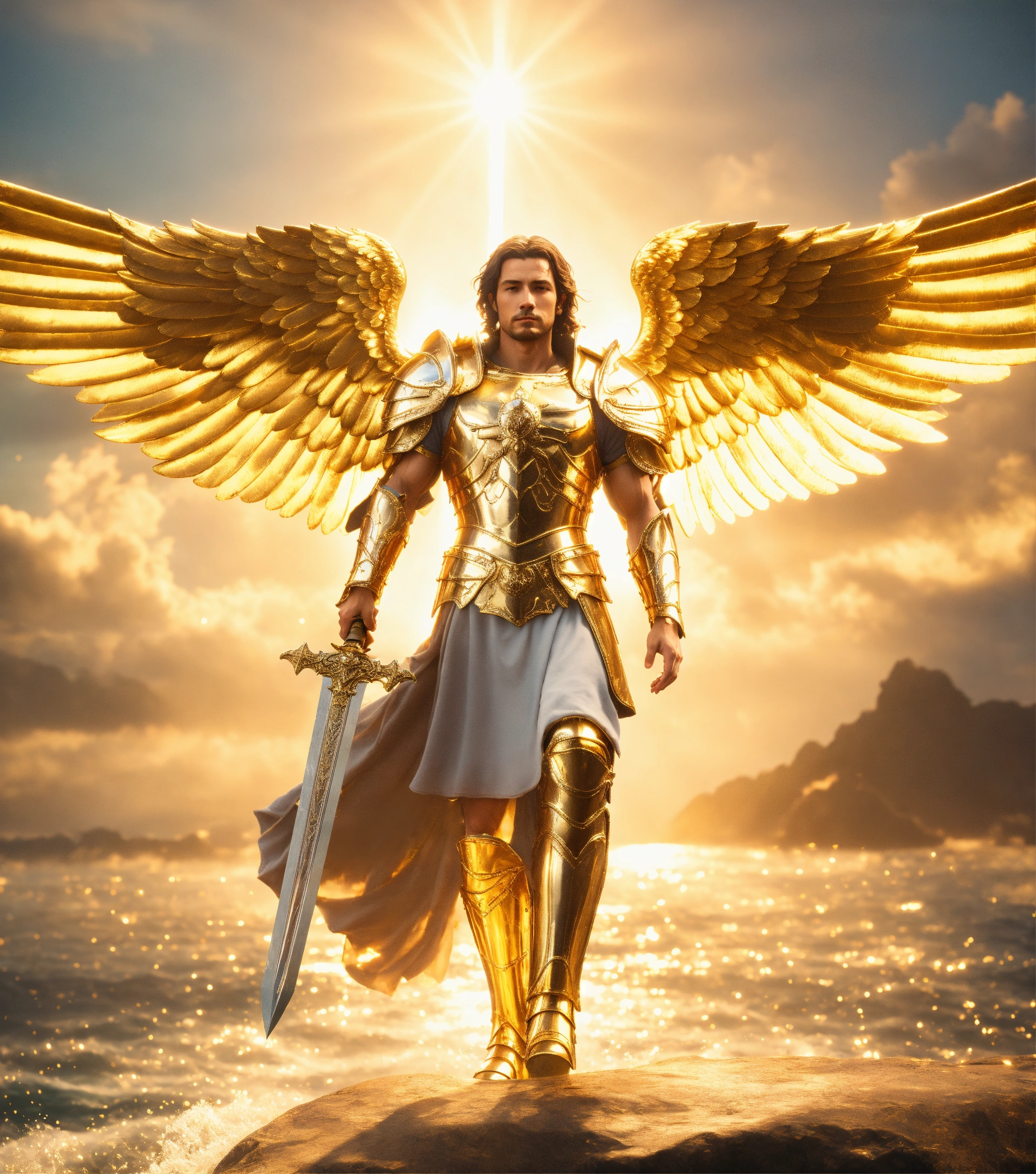 Unreal engine 8k full body catholic portrait of saint michael the archangel levitating above the ground with his angel wings spread out holding his sword and being poised for triumph wearing his gold gold armour and sunshine rays aura around his whole muscular body emanating everywhere in over the ocean
