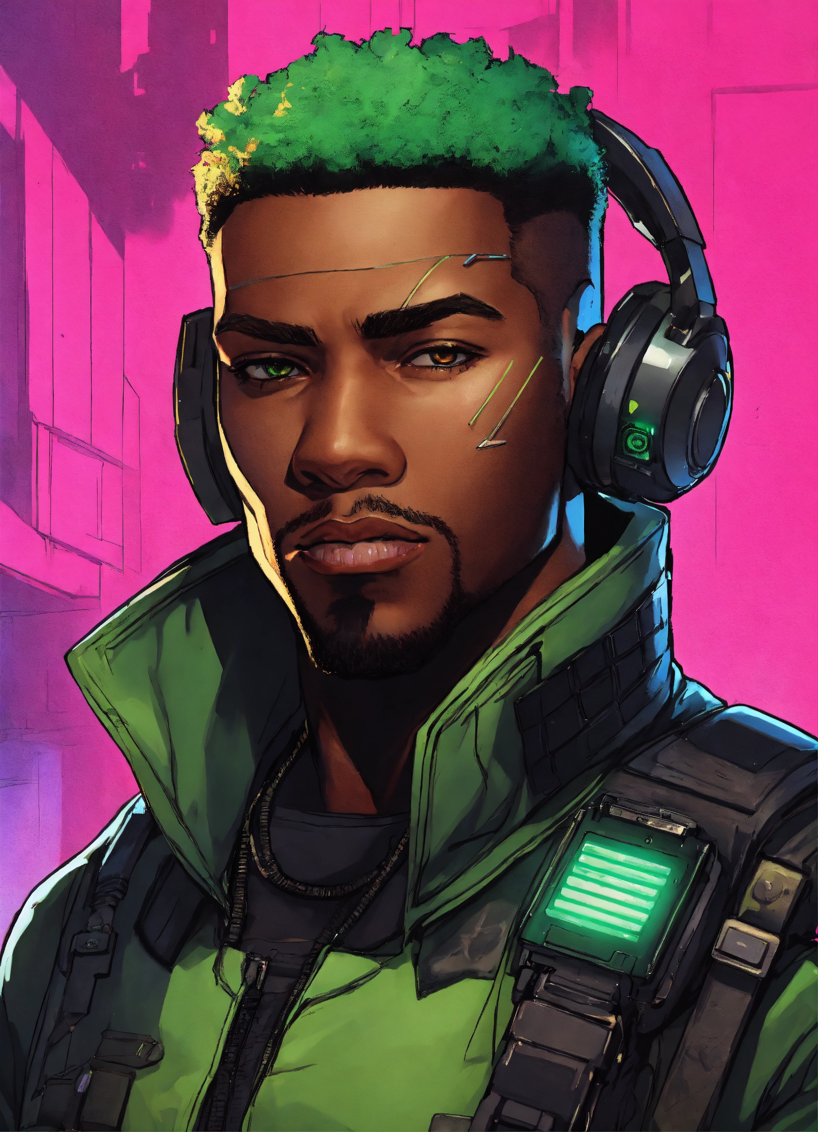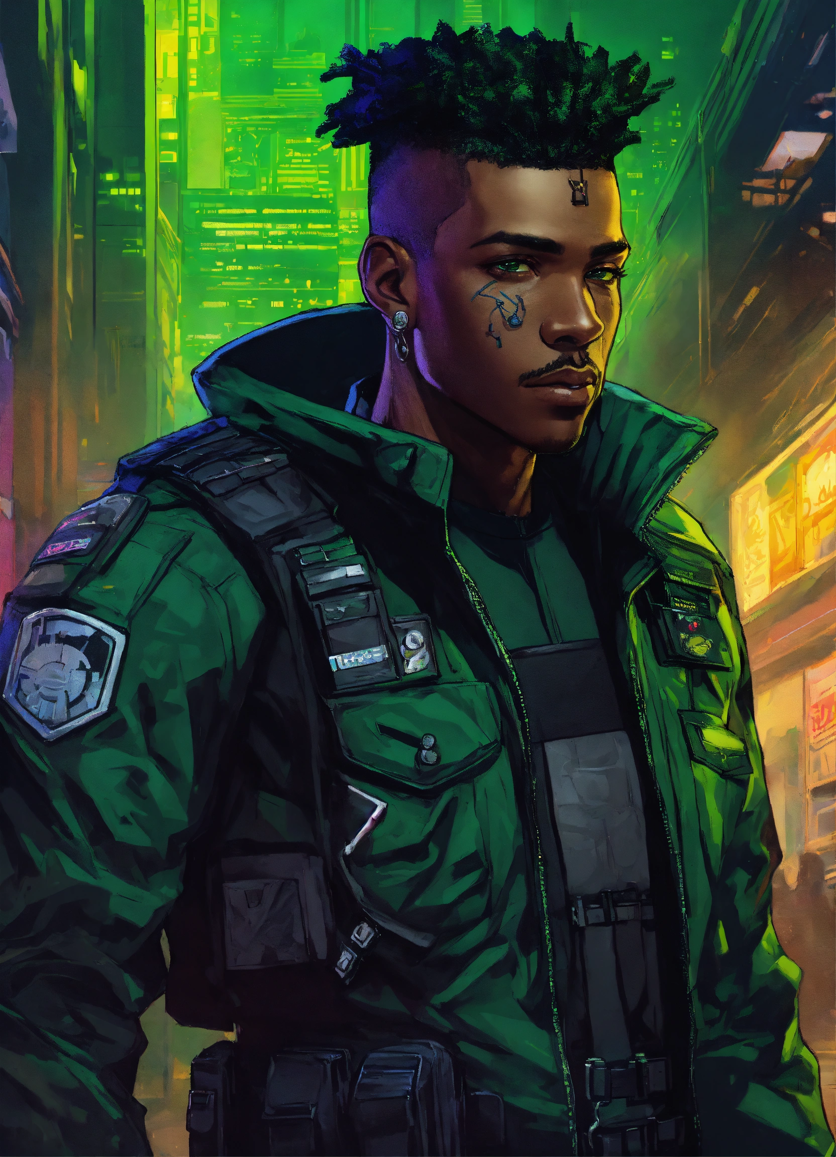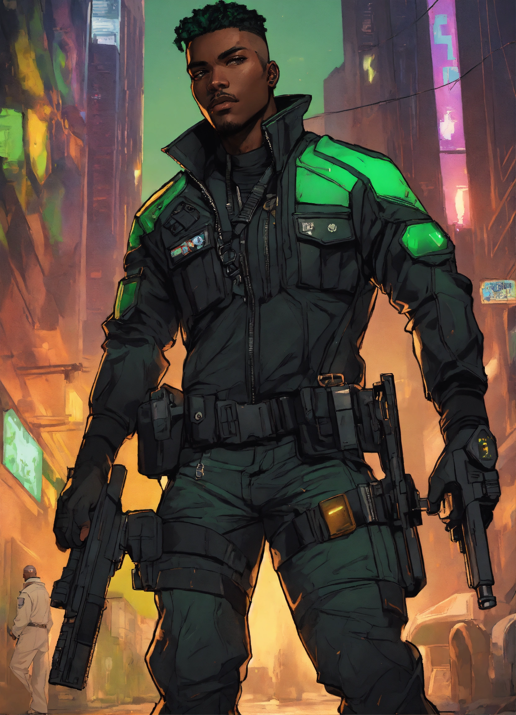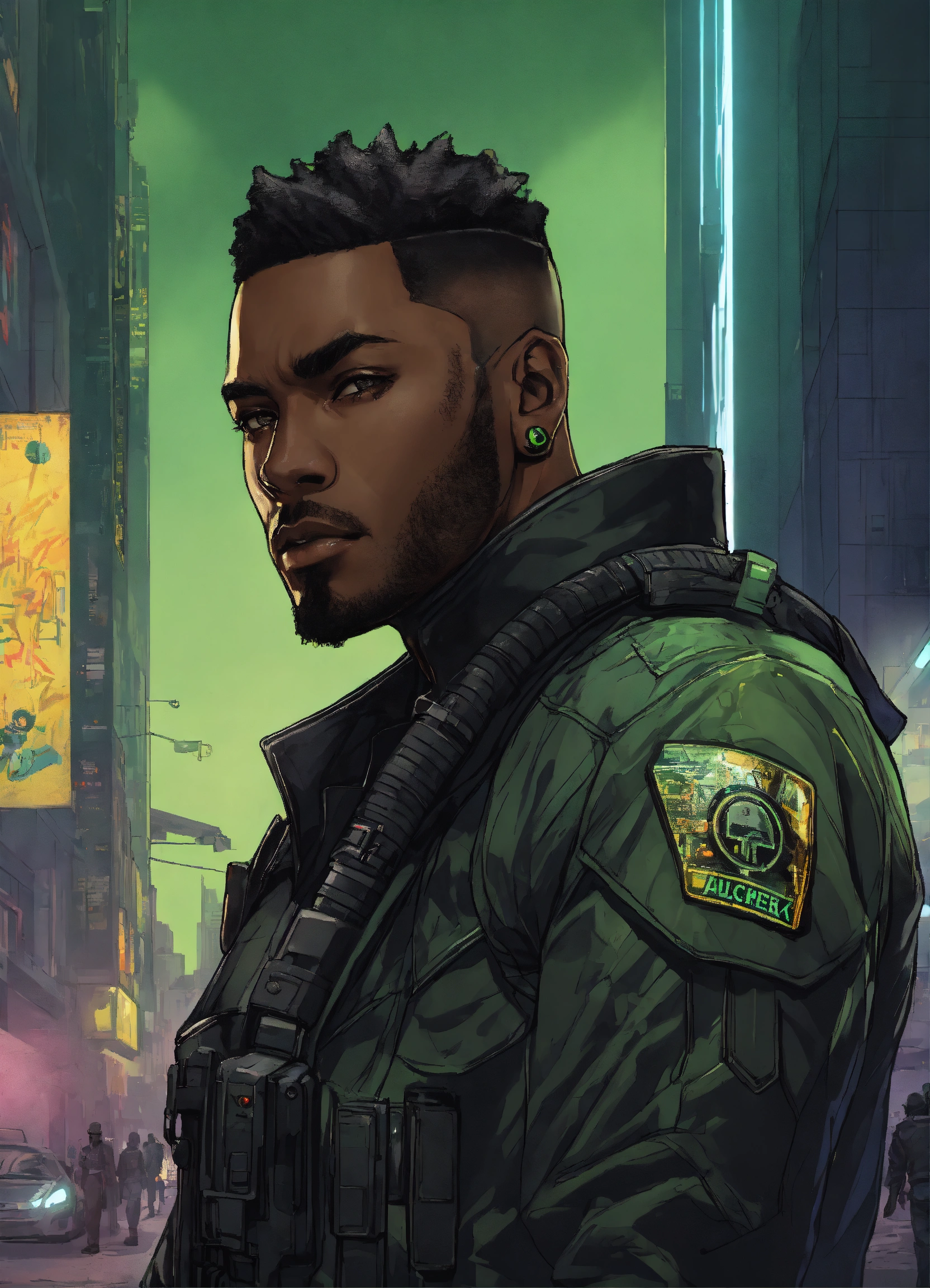 Cyberpunk male african american cyberpunk cop in a black uniform with green hair in an ally gritty realistic comic book style