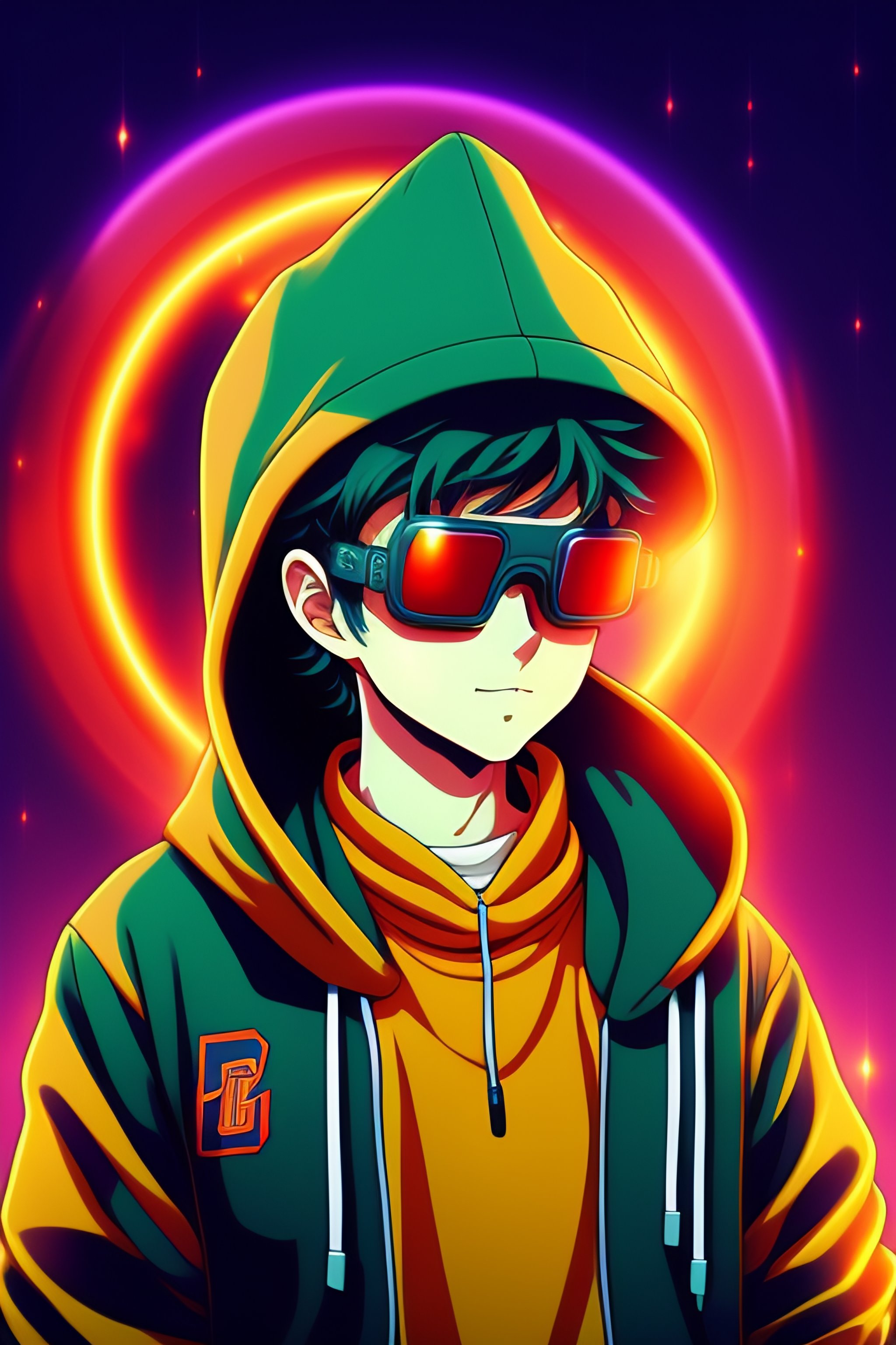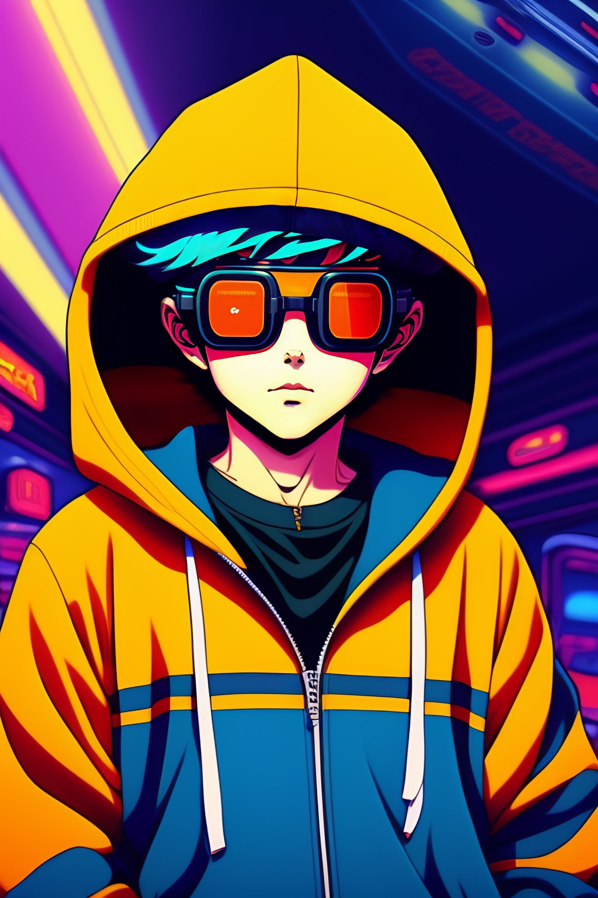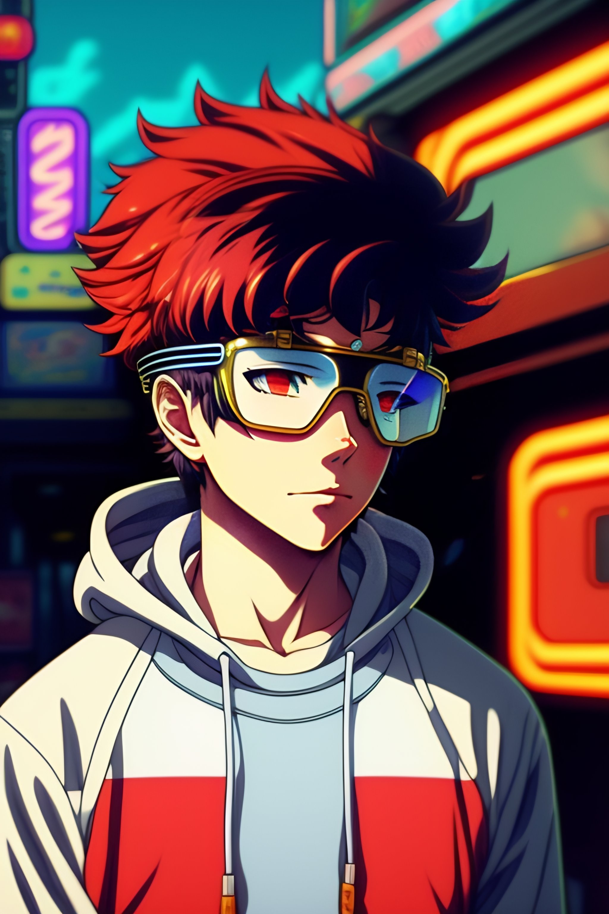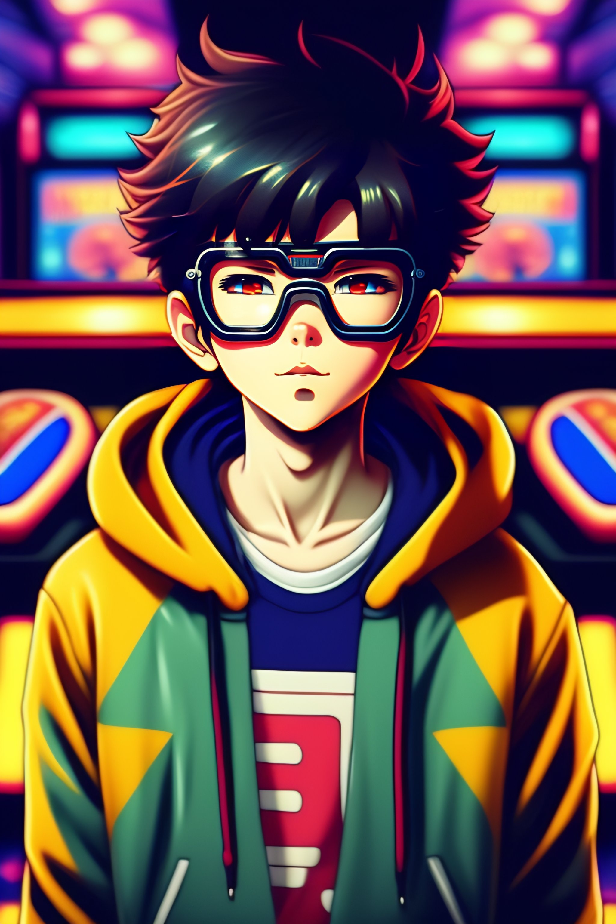 Vintage 90's anime style, retro.anime boy wearing steamounk goggles wearing hoodie, in a arcade, sci-fi., surreal.