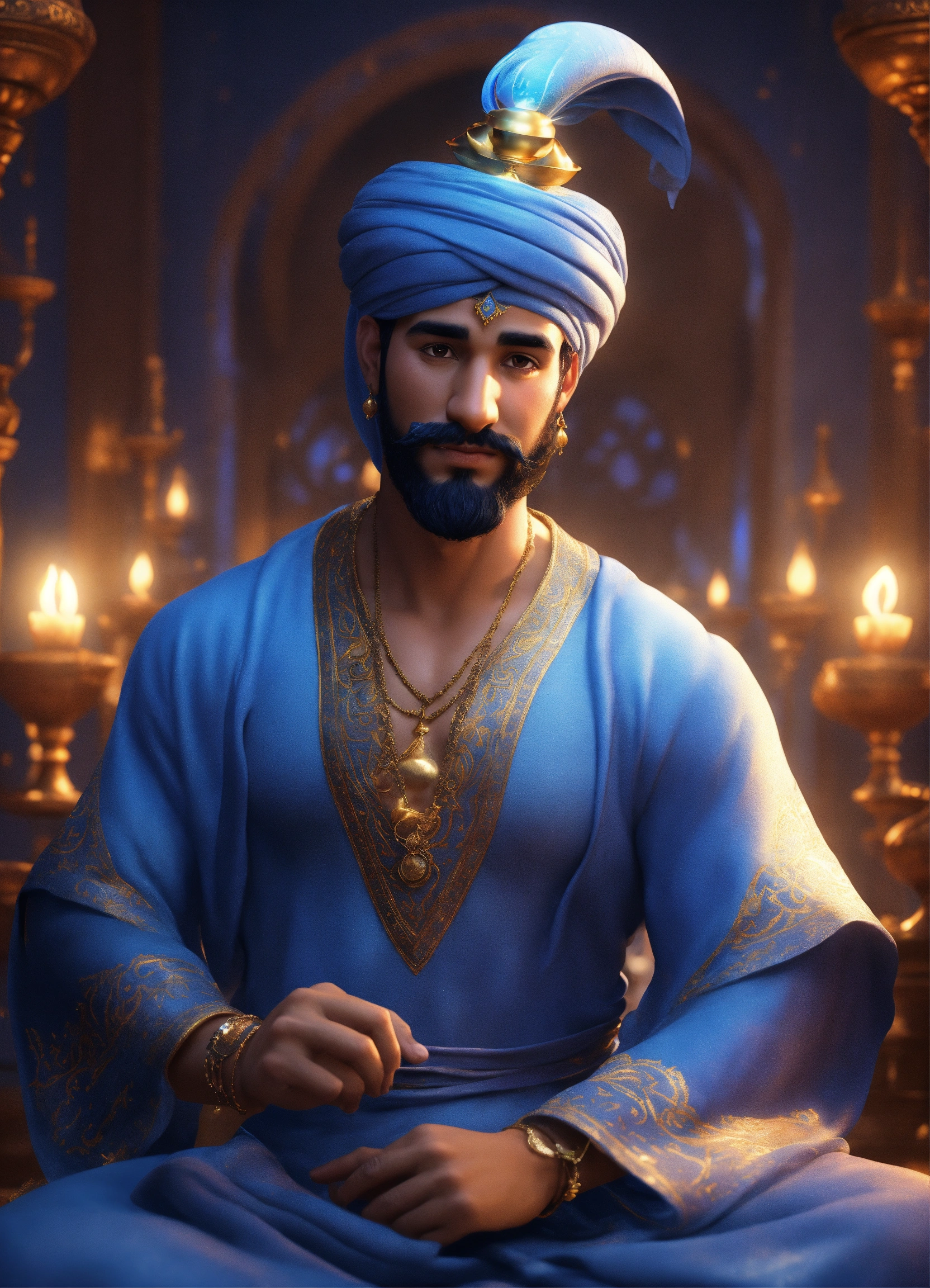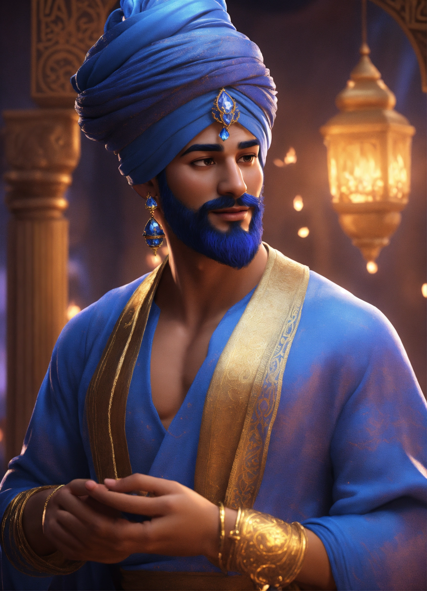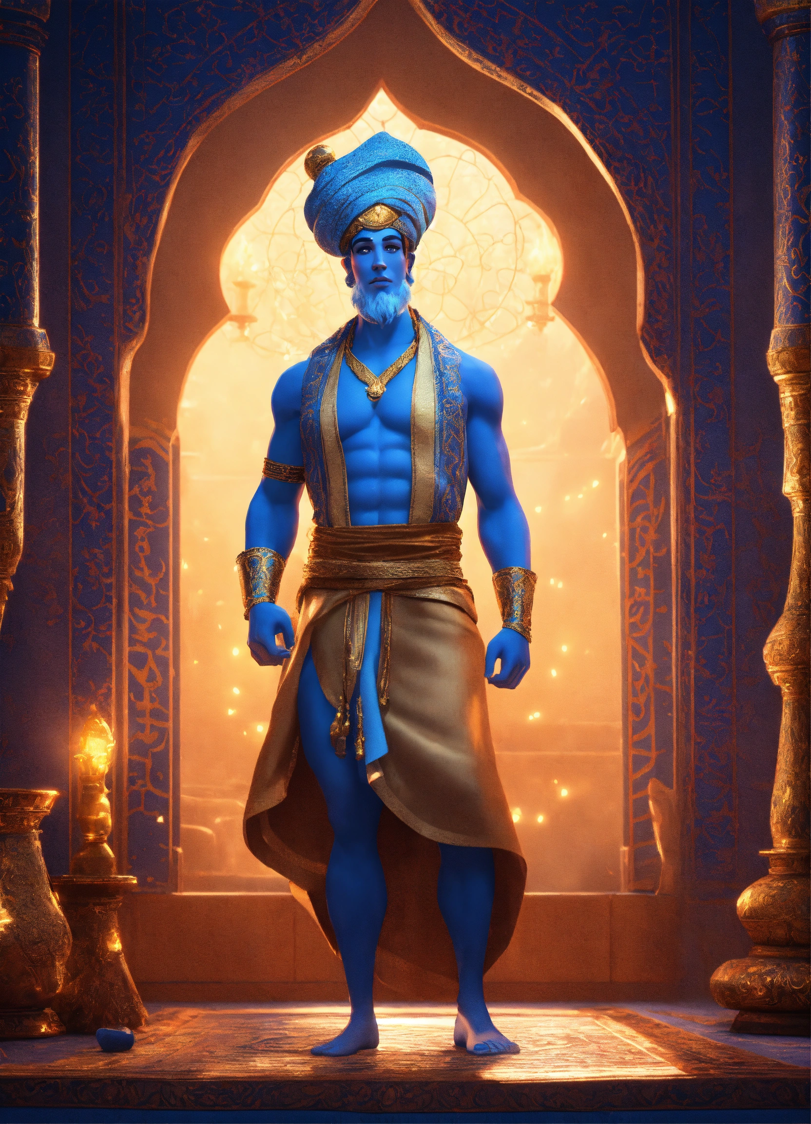 Create a 3d rendering of a magical blue arabian male genie inspired by the disney animation style. the genie must have blue skin, a playful but wise personality, and the ability to float or float. place your character in the atmosphere of the arabian nights. the image must be in high resolution format. on his head he should wear a classic arabic white keffiyeh. dynamic pose - the genie casts a spell with his hands (pixar art style)++ highly detailed digital painting, art stations, concept art, soft focus, hard focus, illustrations. cinematic, visual effects, hdr, unreal engine 5, ray tracing, soft light, 8k, high detail, sparkling backlighting, luxury gem, game art, 3d, cartoon, colorful, magical, mysterious
