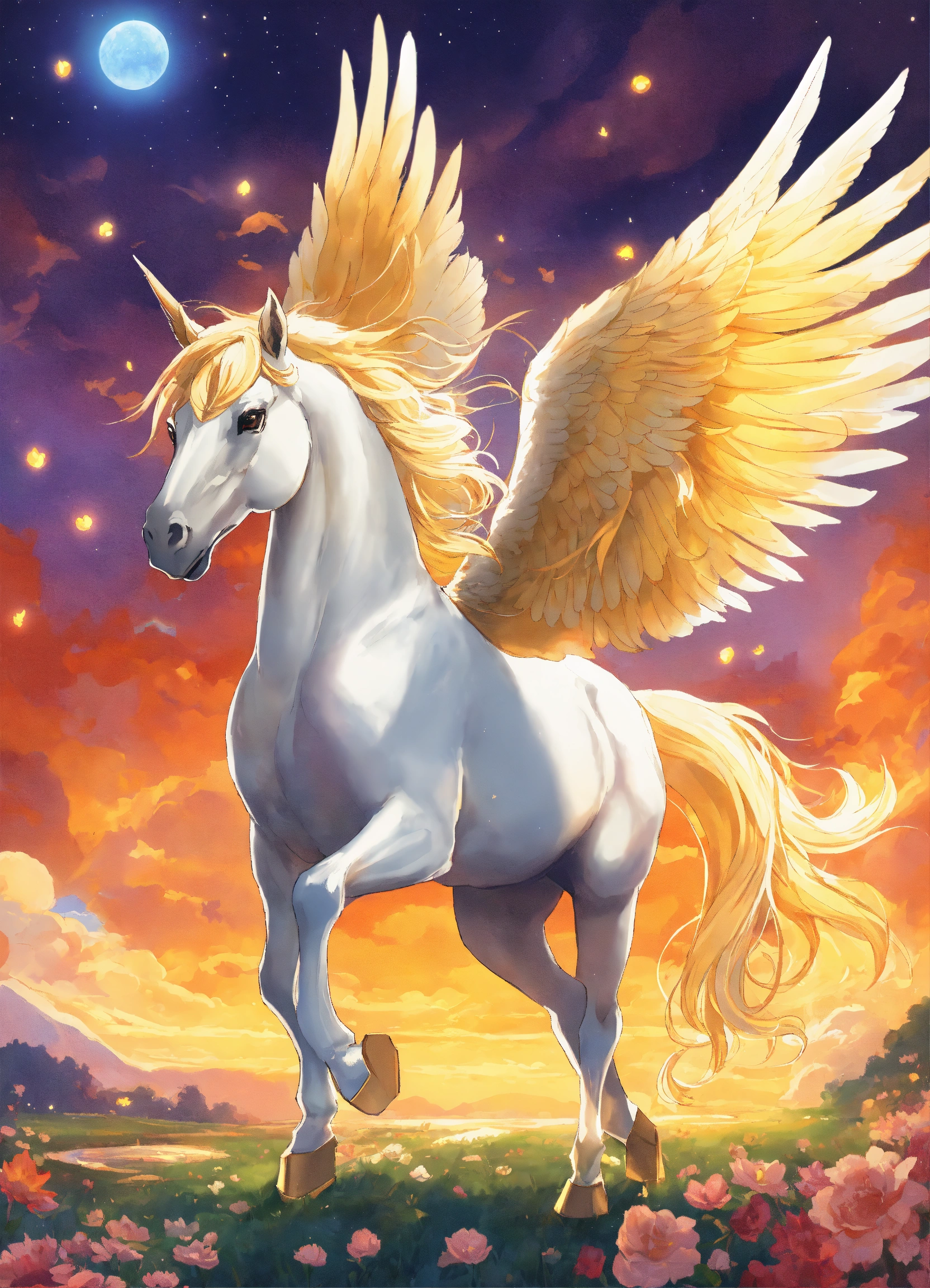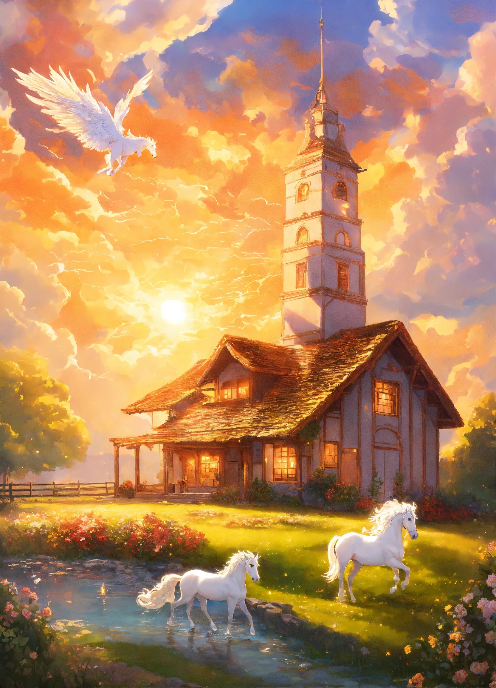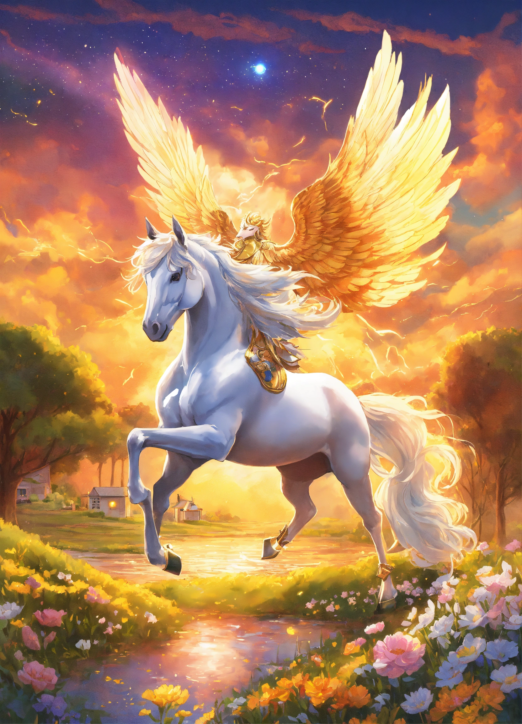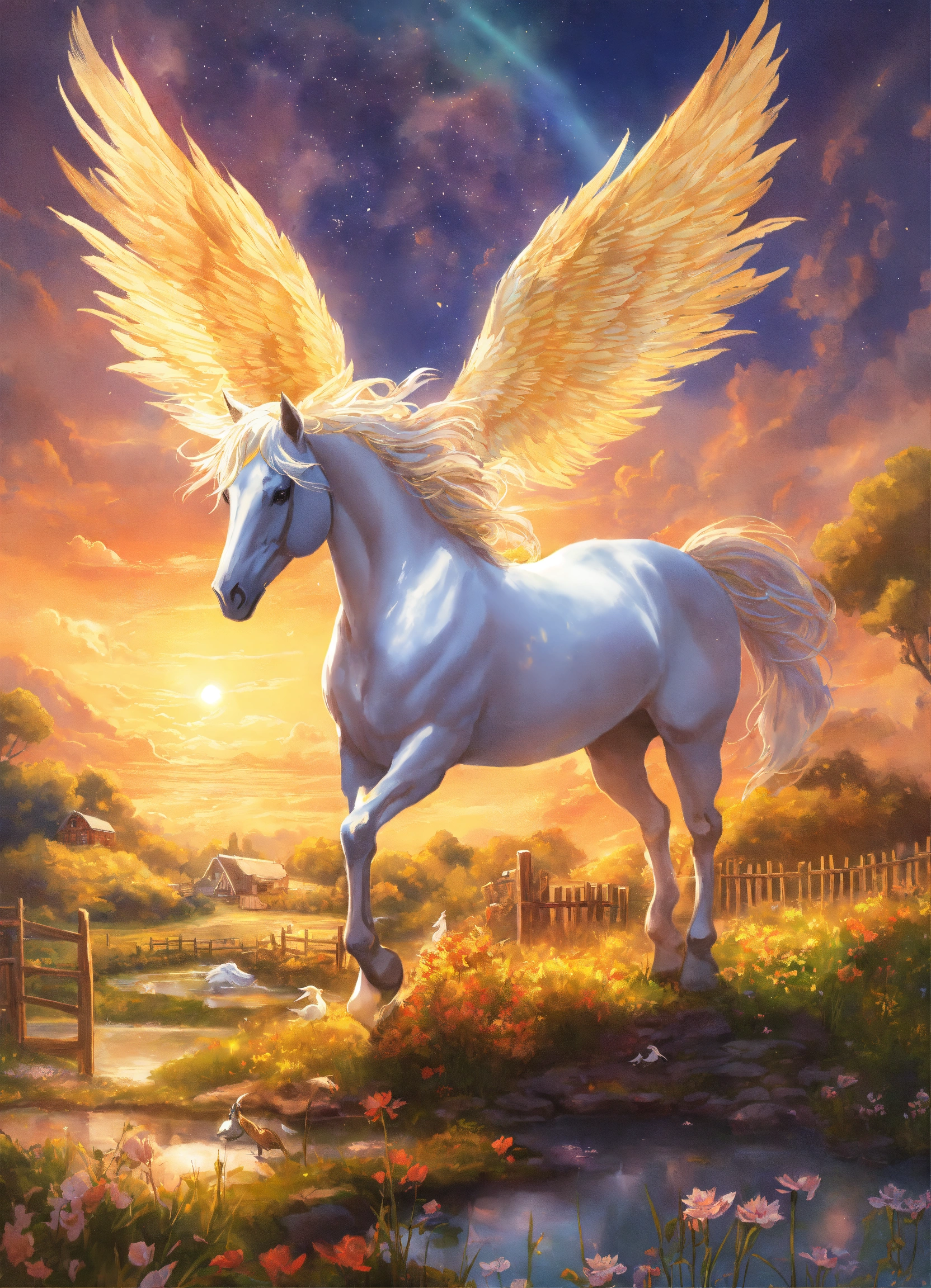 Create an anime-style image of a celestial farm full of pegasus. most rise gracefully in brilliant white, but one stands out with its shimmering golden fiery plumage, leaving behind a trail of flames. heavenly farm boasts pastel skies, iridescent lawns, and crystal ponds. a floating cloud shed shelters some pegasus and celestial beings look after them. the sun has a halo and the golden pegasus shines brightest. capture the divine animated farm scene by framing the image with a gorgeous golden border.
