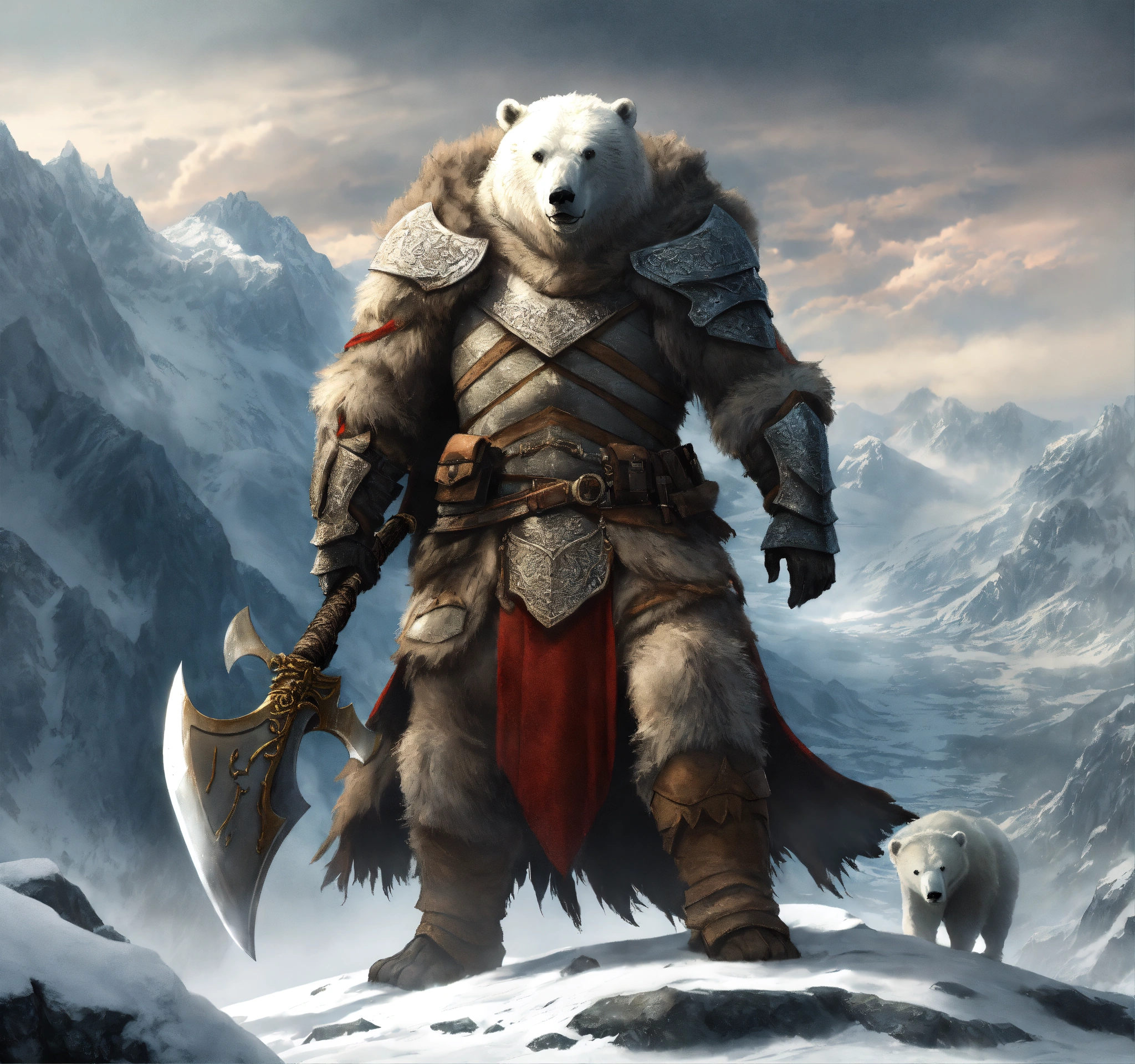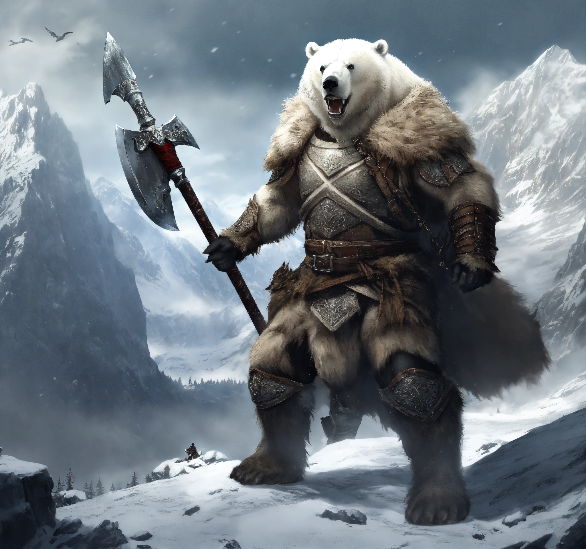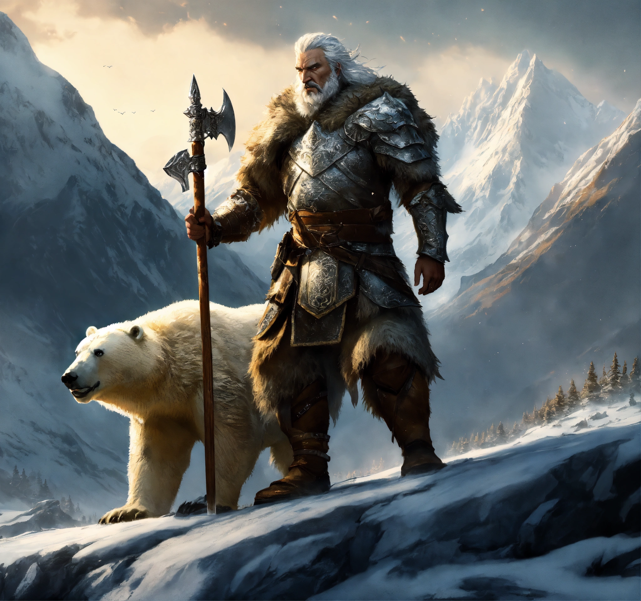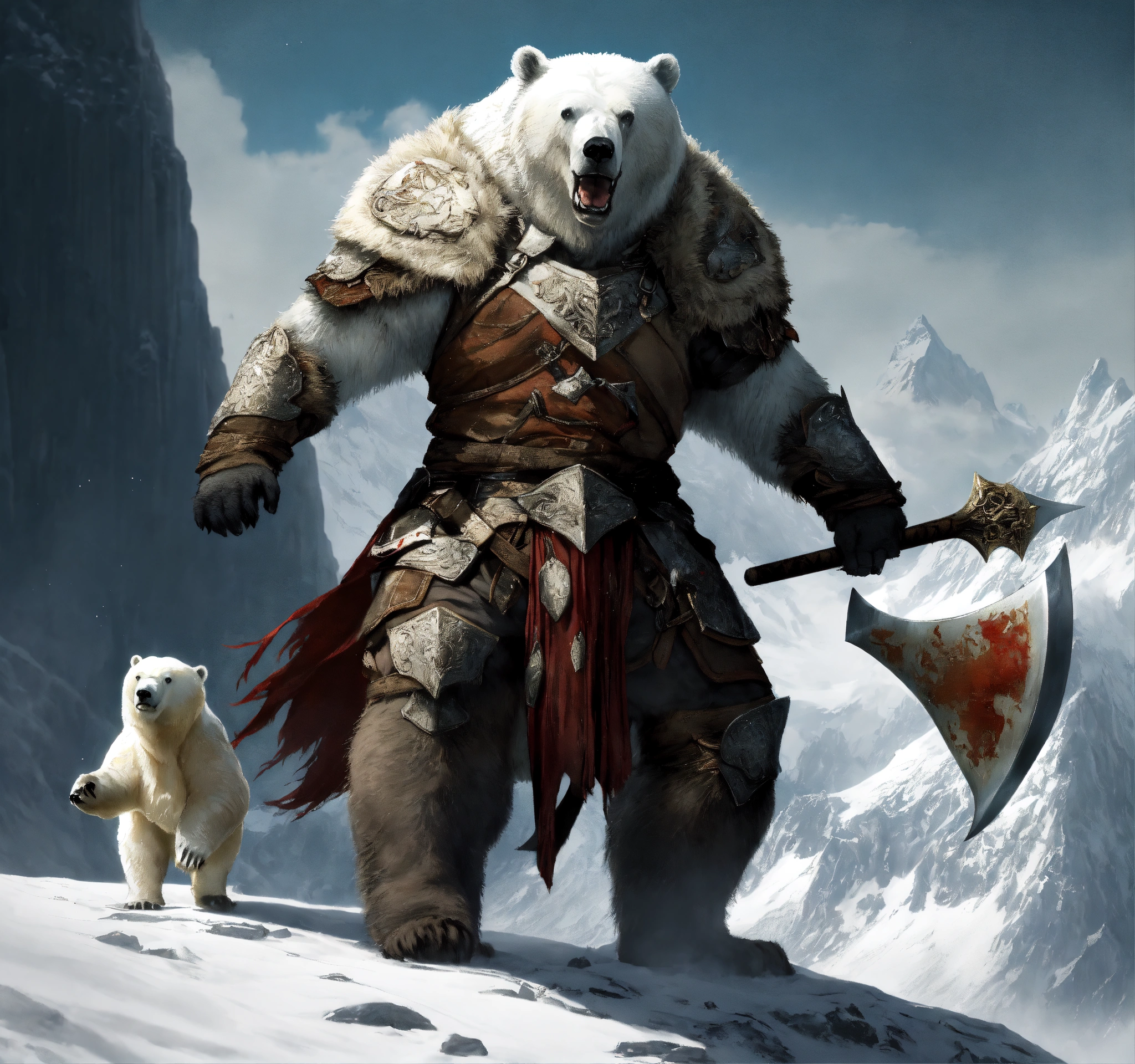 Fantasy setting, a sinister-looking human lord, wearing bear-skins, gray-ash hair wearing crude armor with a white tint, causing havoc, wielding a large axe, riding a polar bear, cold mountainous region in the background, highly detailed, digital graphic art, top-rated, sharp, no blur, edited, corrected