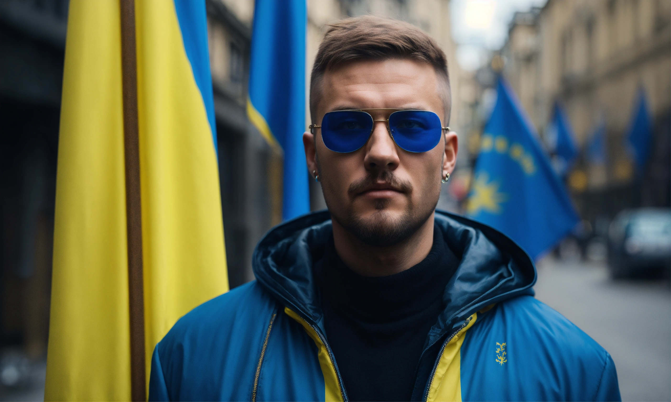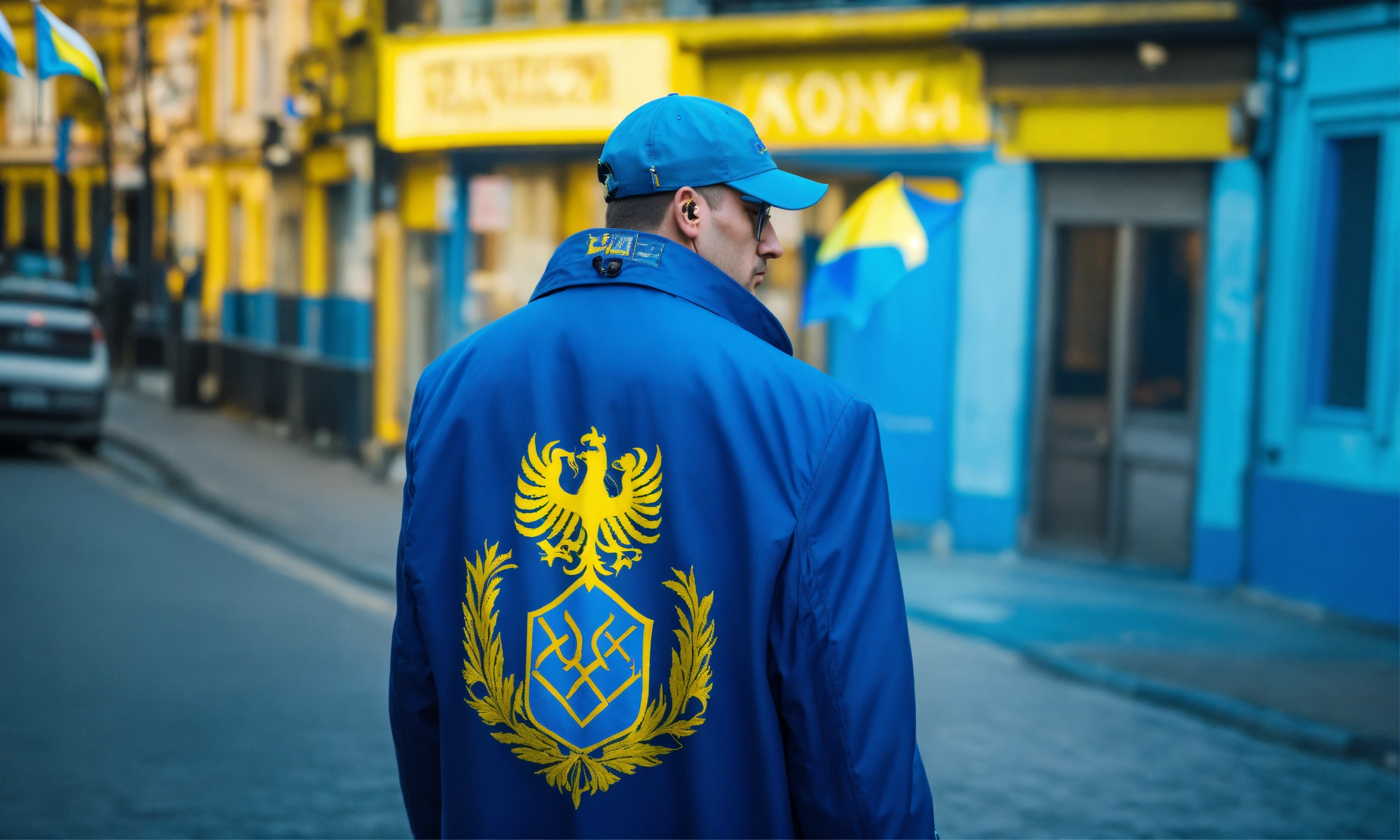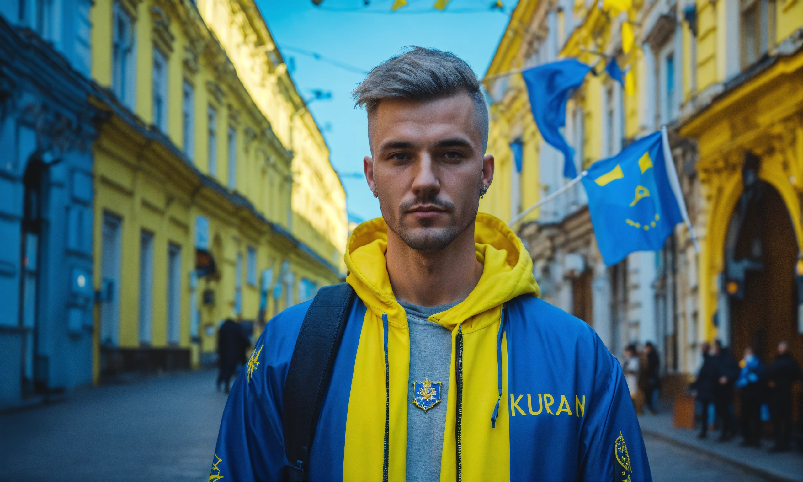 Cyberpunk сute man with ukraine flag, on street warshaw, without glasess, blue background, turism, light hair, coat of arms of ukraine, turism, cyberpunk style