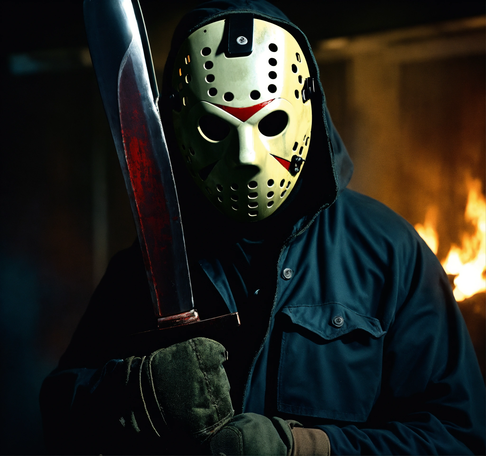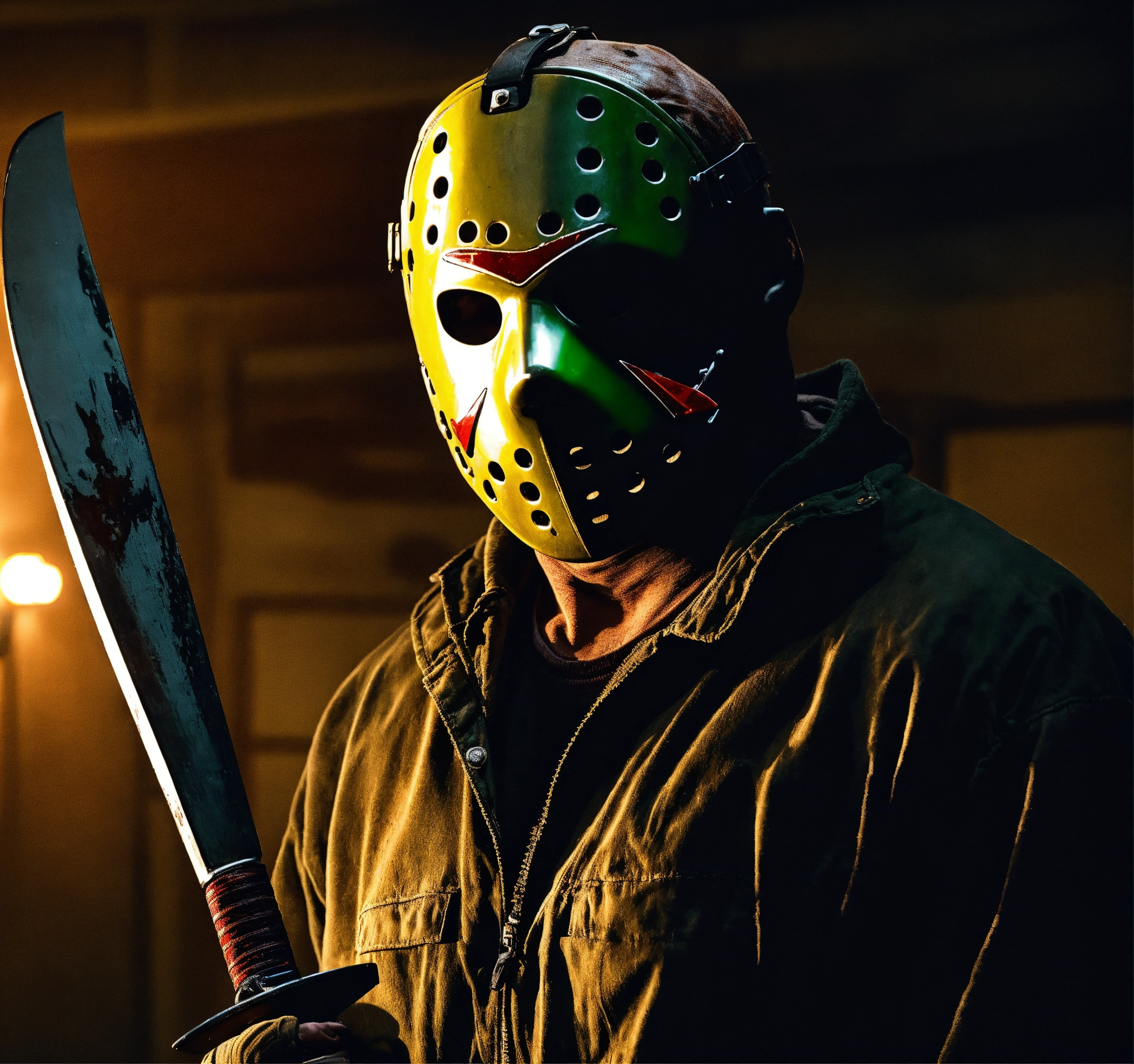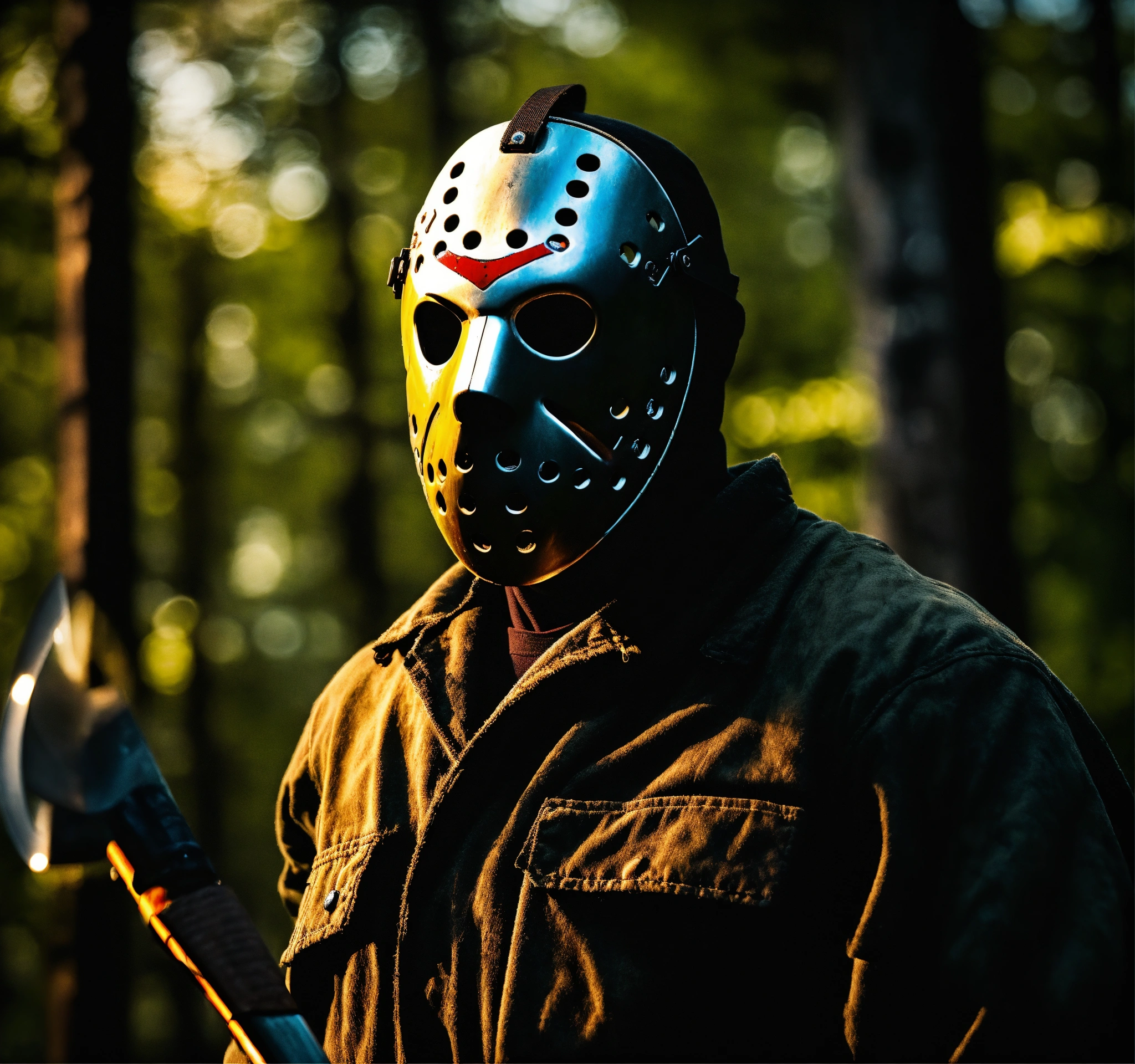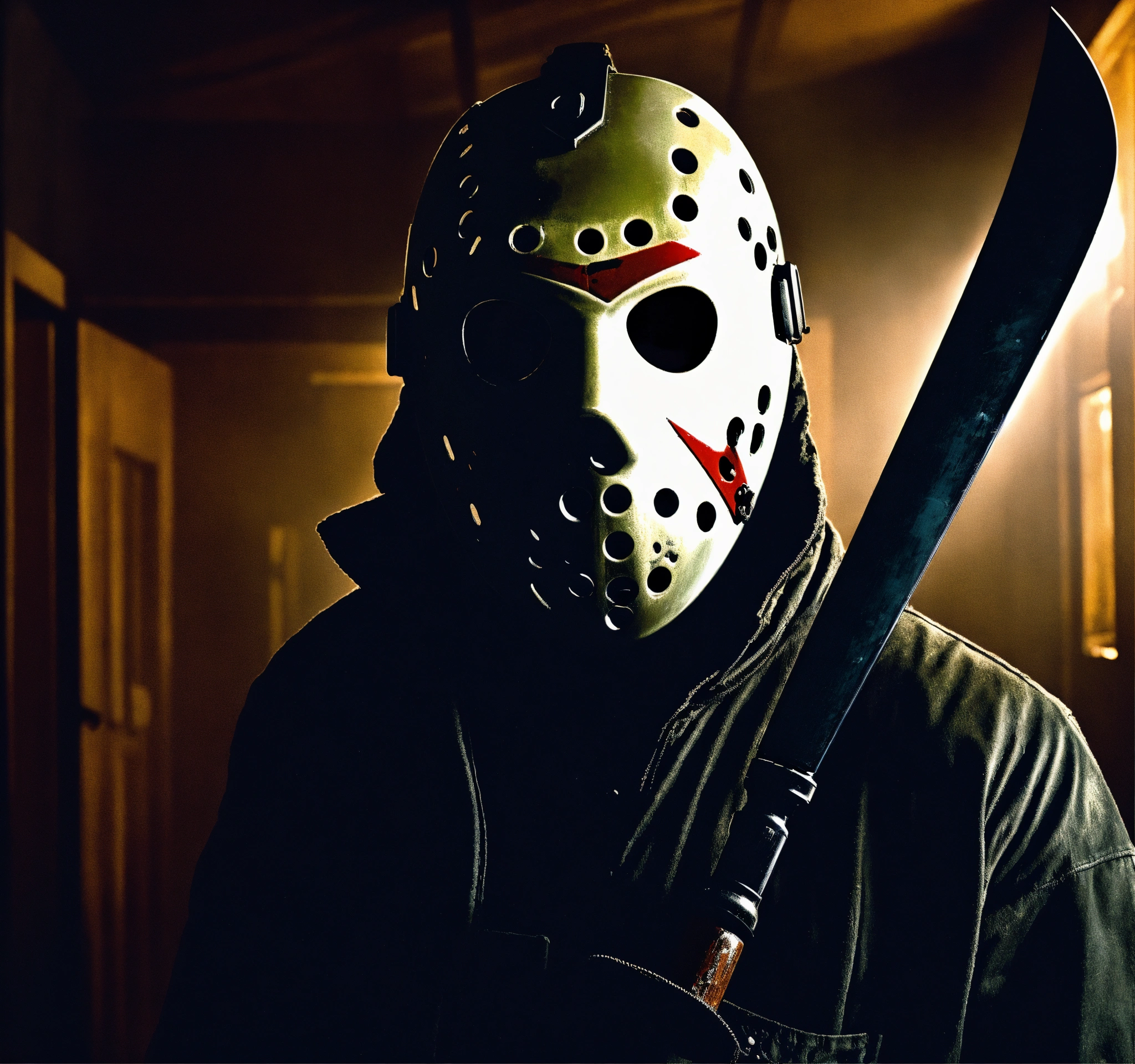 Realistic, cinematic photo of jason voorhees of friday the 13. very realistic photo of jason in his hockey mask holding a machete hiding in the shadows.
