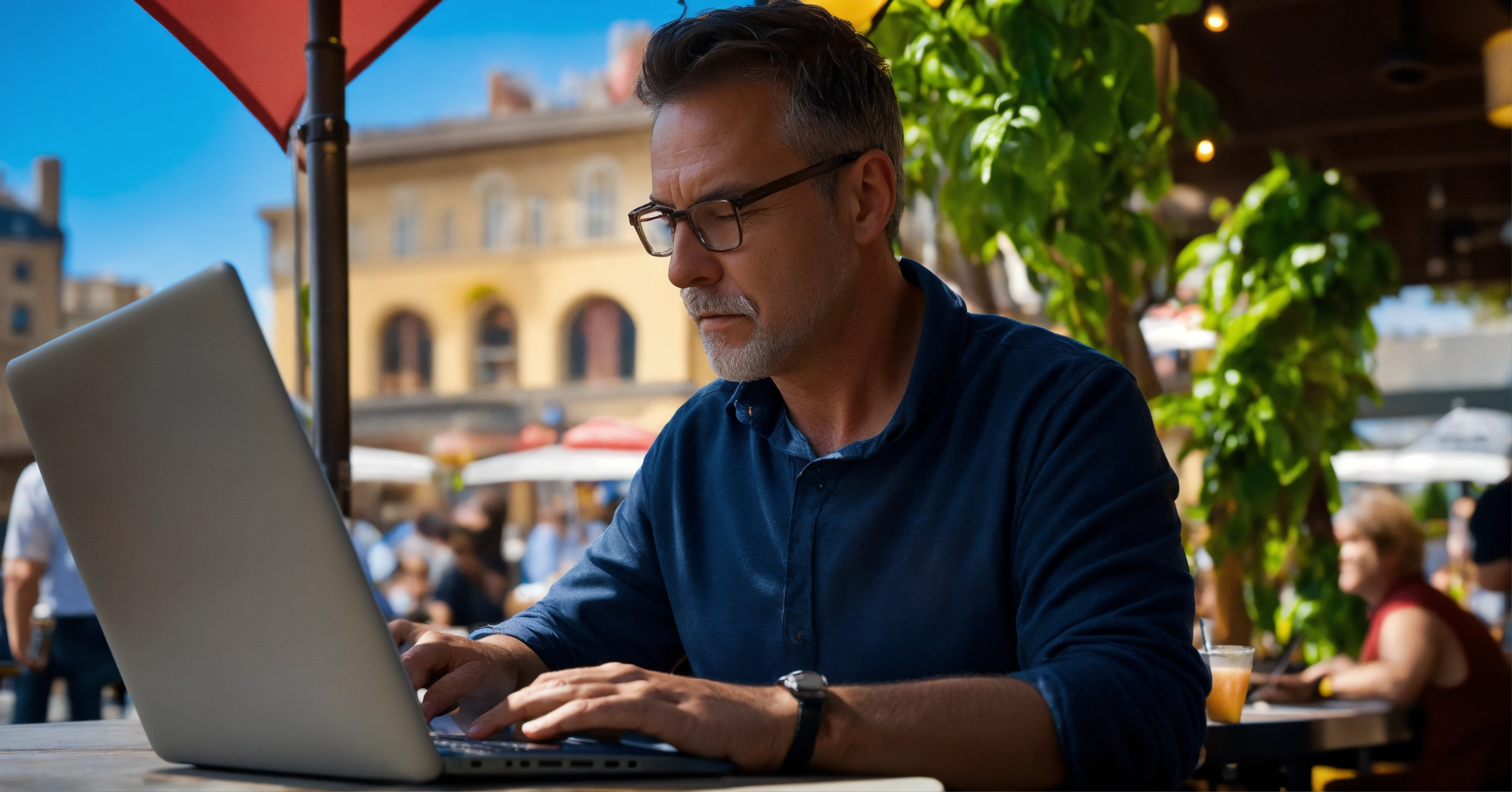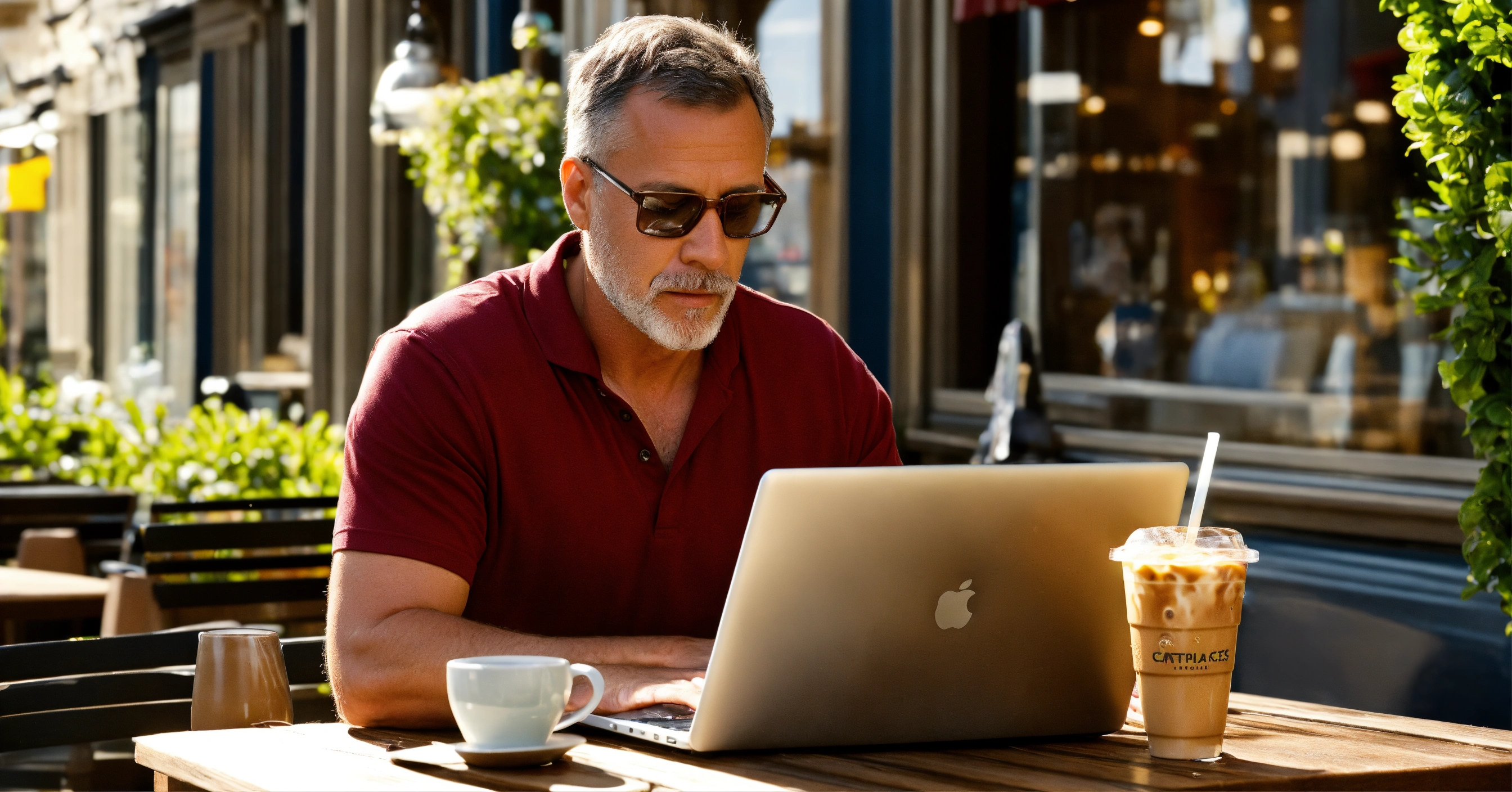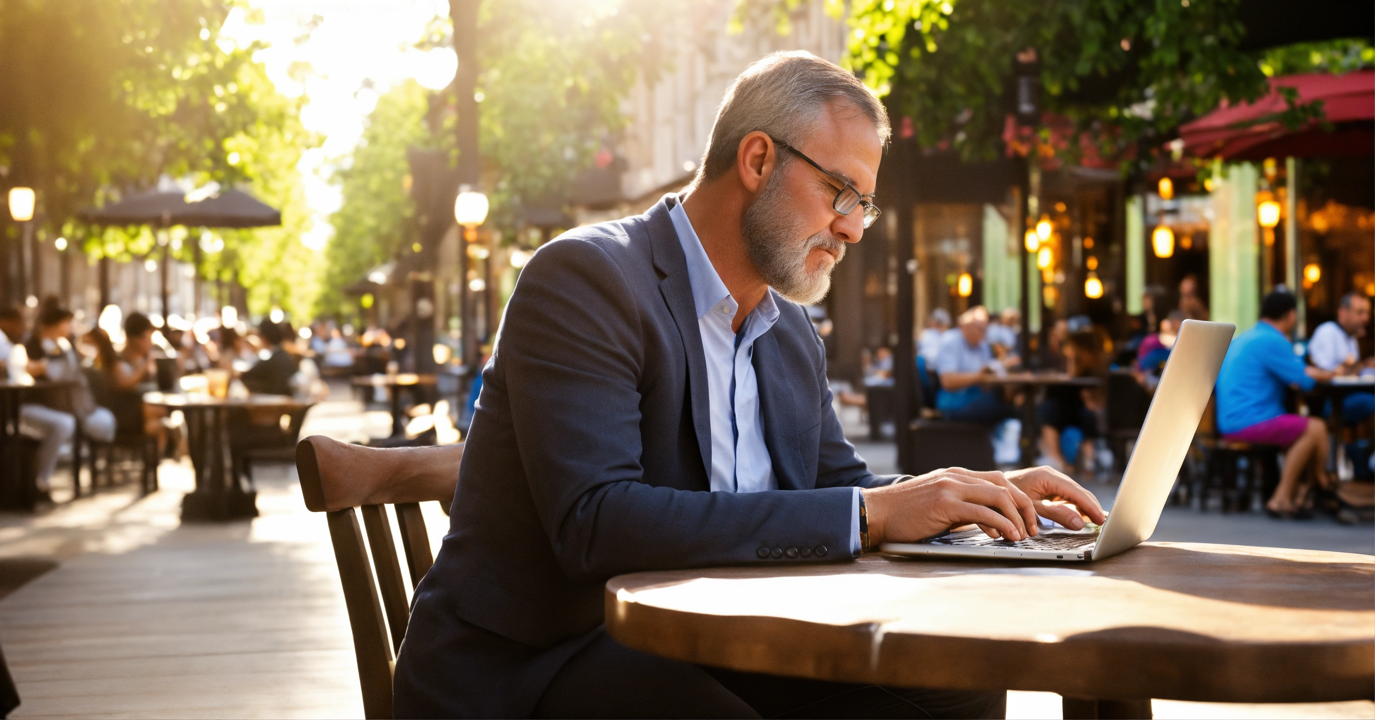 In a bustling café plaza, a clean-shaven, middle-aged man works diligently on his laptop. his face catches the midday sun as he reviews contracts, sipping on an iced latte.