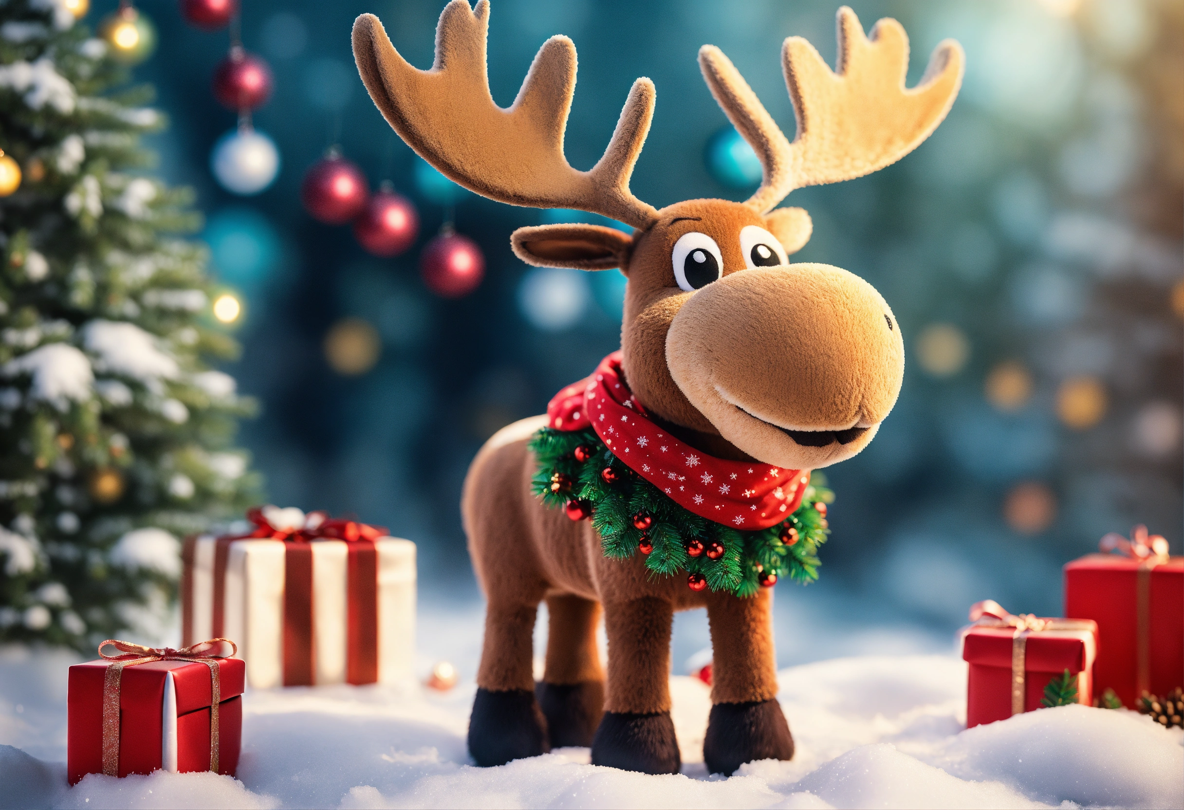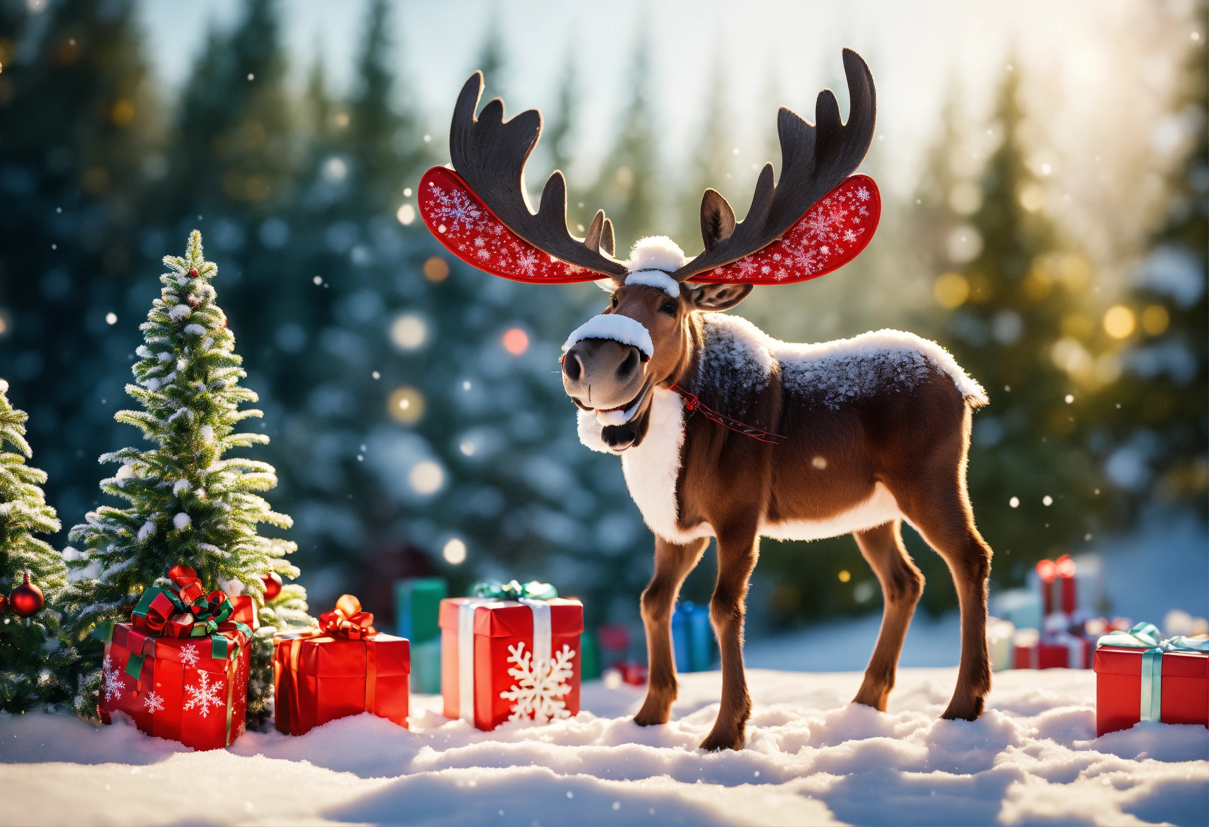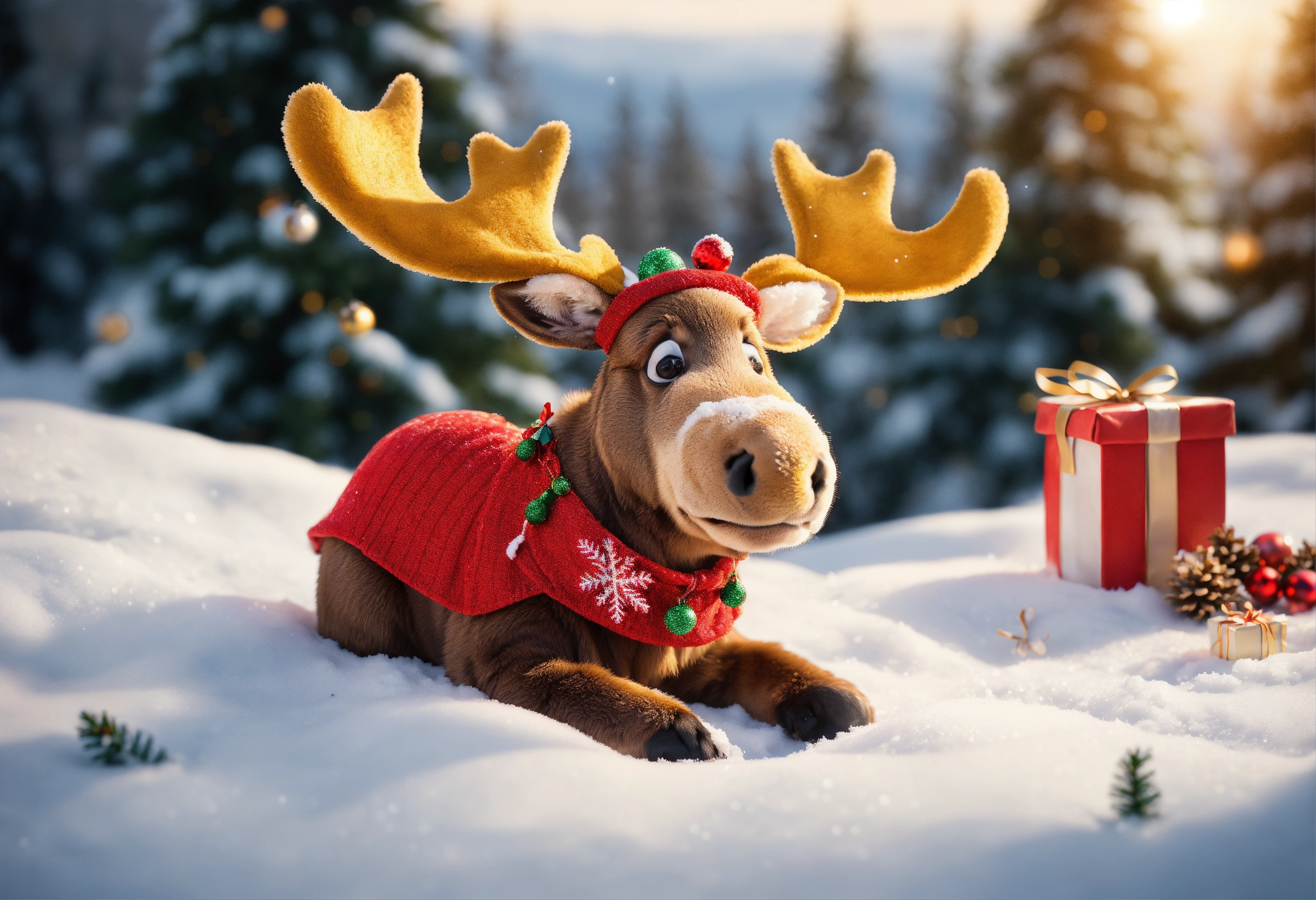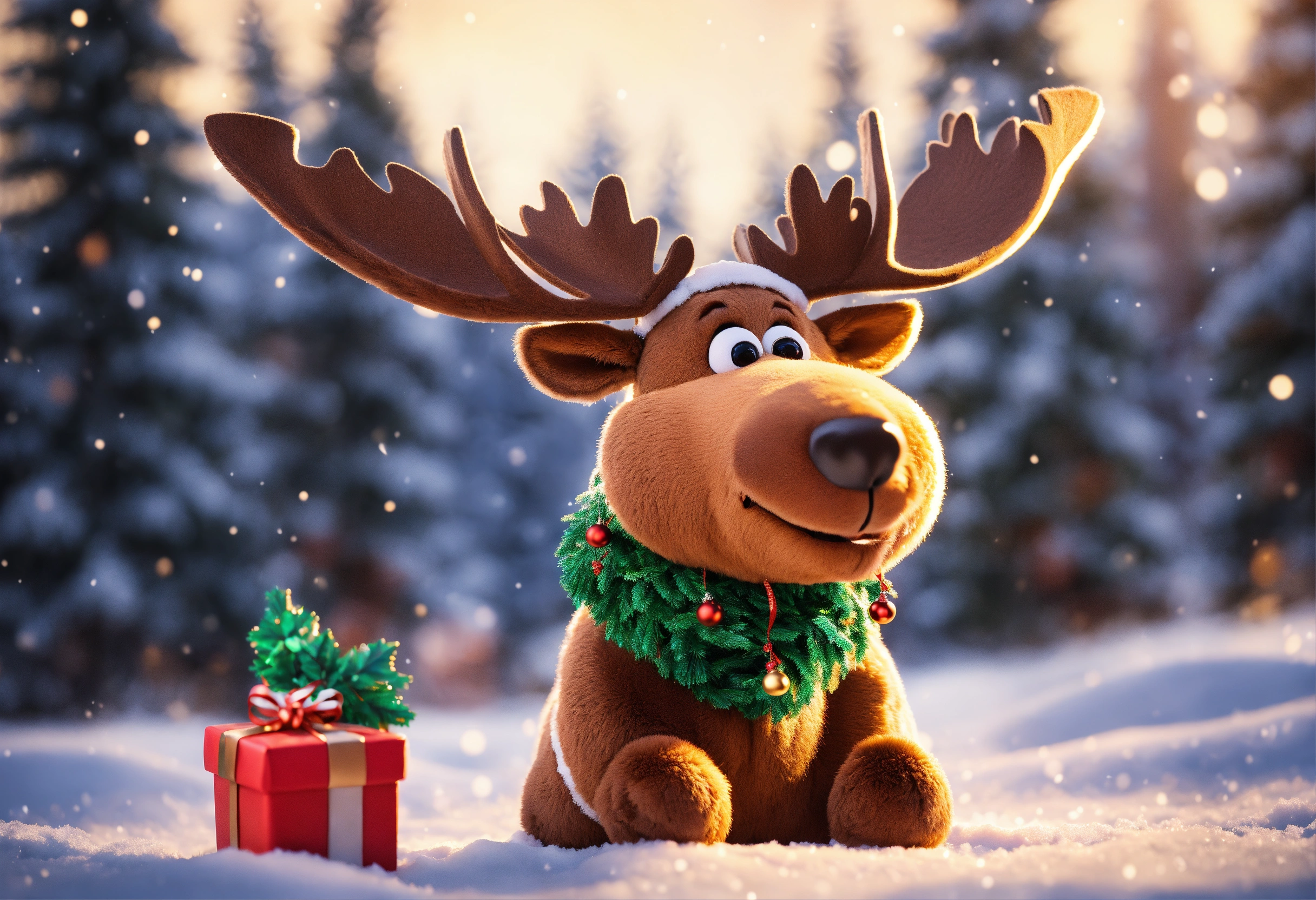 Create a photo-realistic image of a cute pixar-style, smiling moose with christmas accessories, sitting in the snow. the background should feature a bright and sunny, snowy forest with fir trees adorned with christmas garlands and decorations. this is for product photography, aiming for a whimsical and playful atmosphere within a sunny environment. it should be a medium shot with natural light, aiming for an ultra-realistic look.