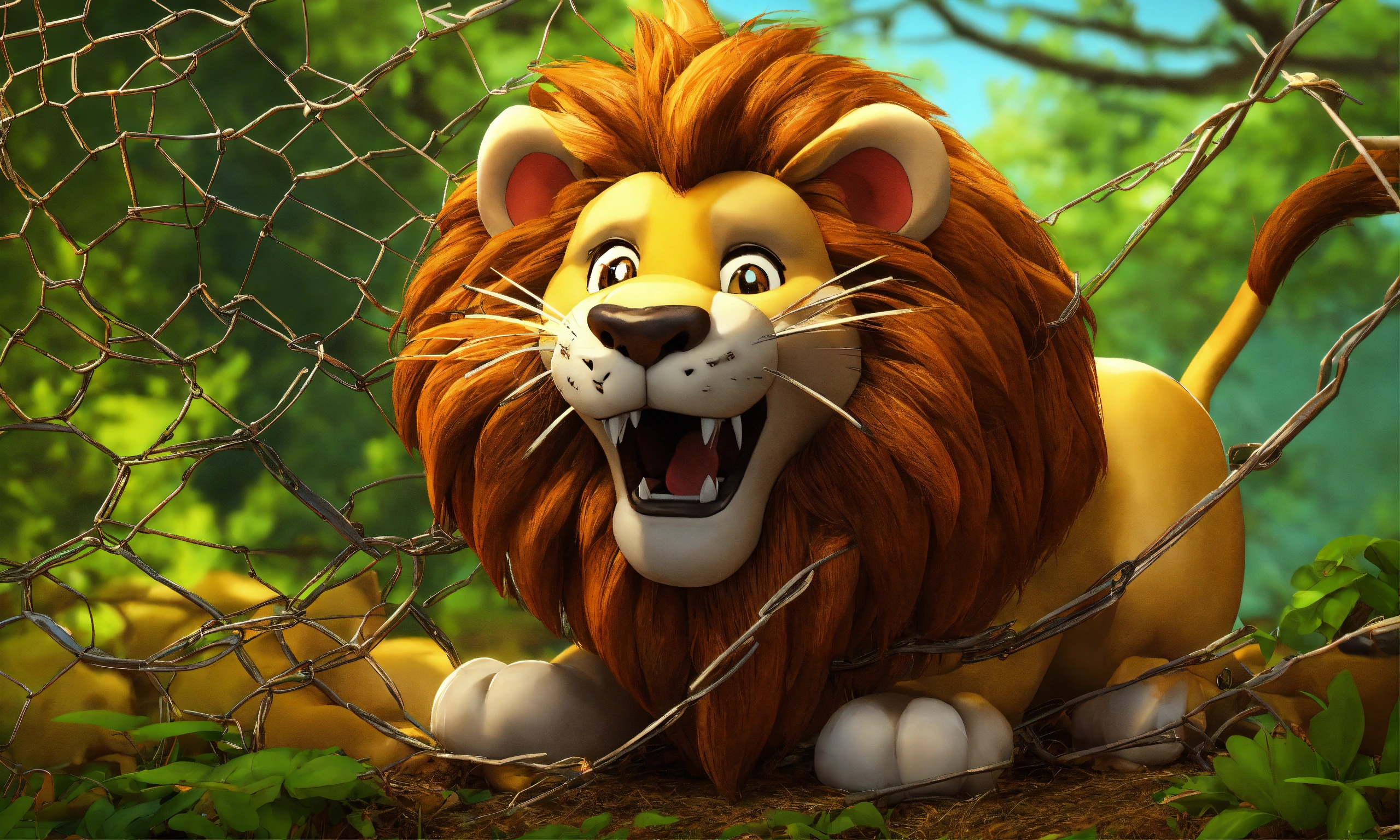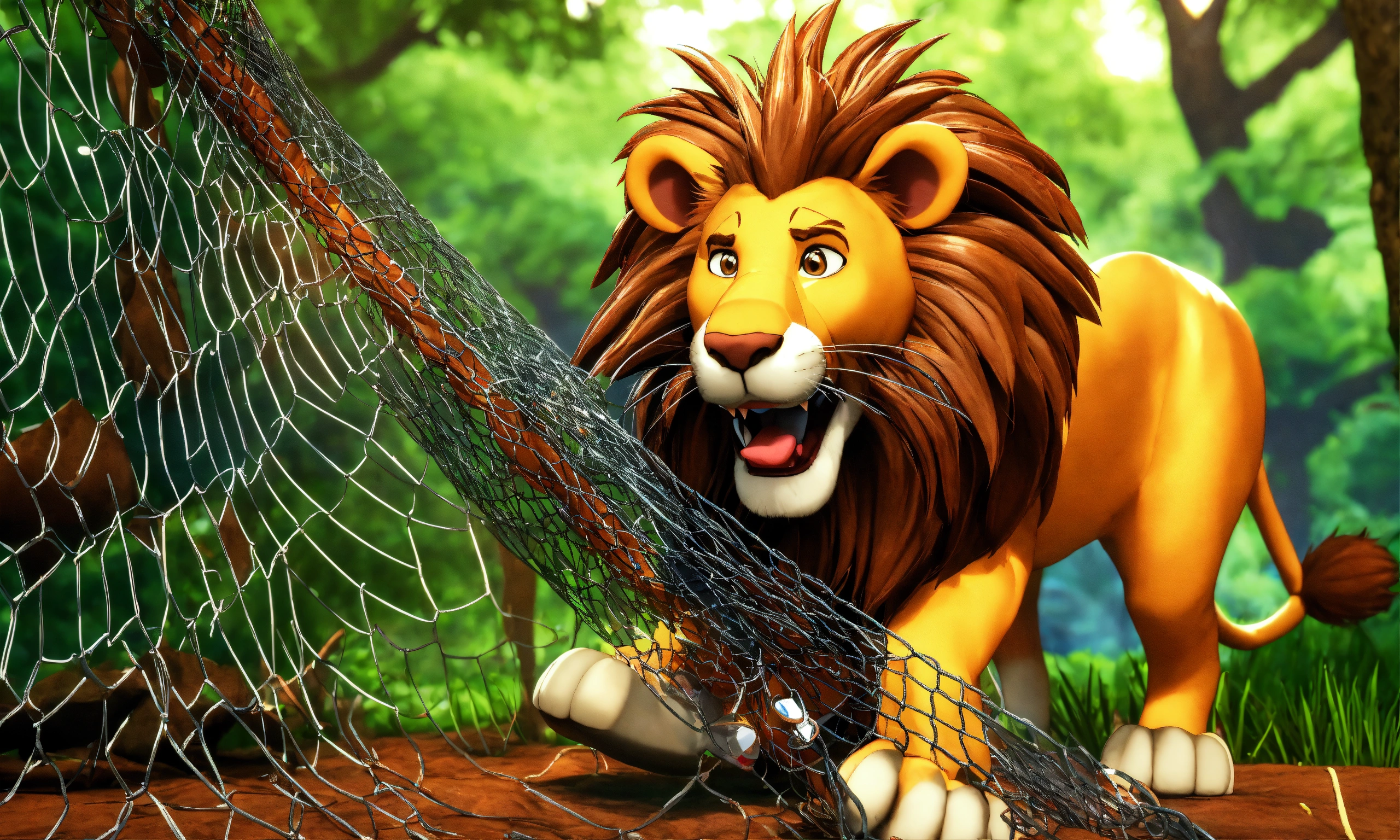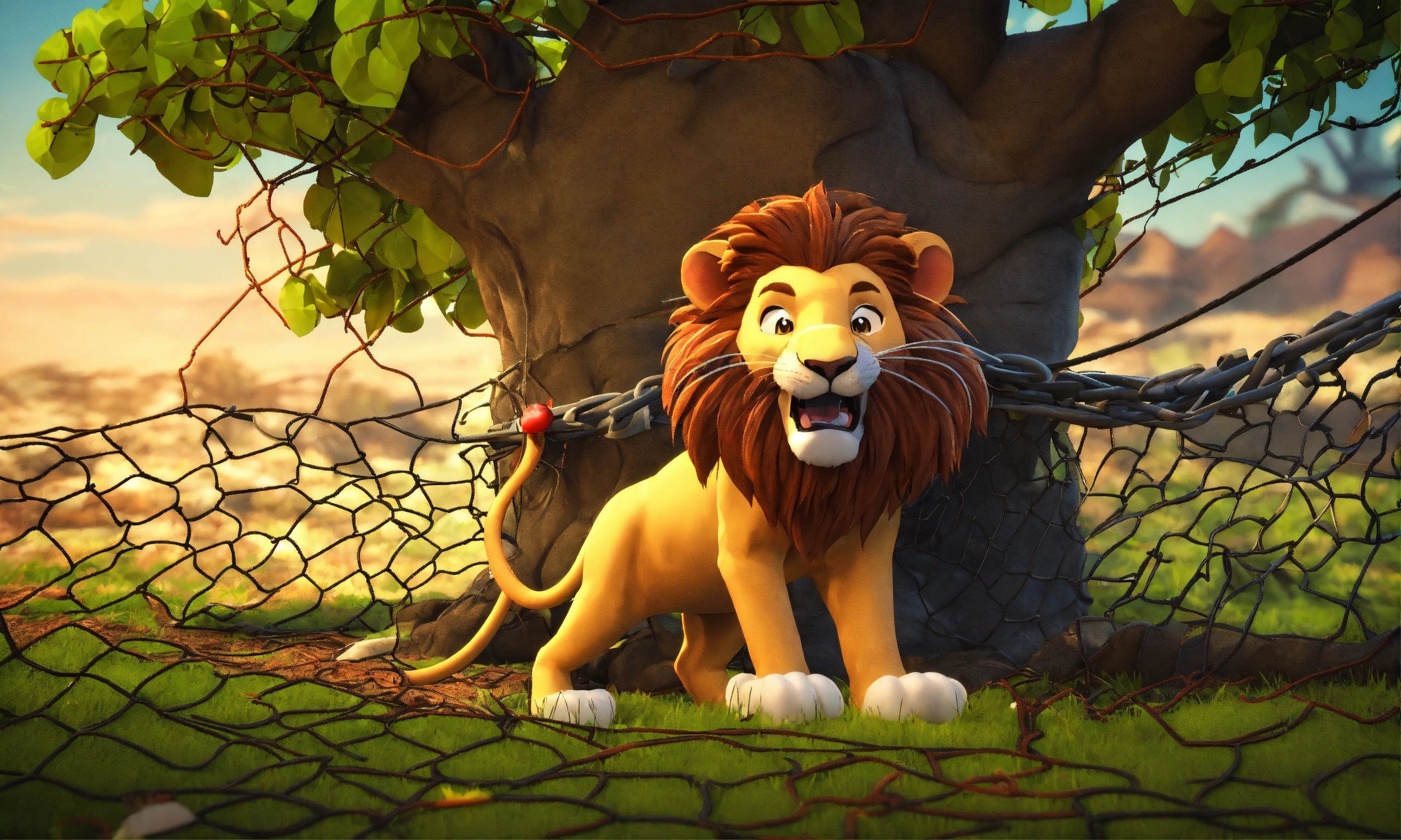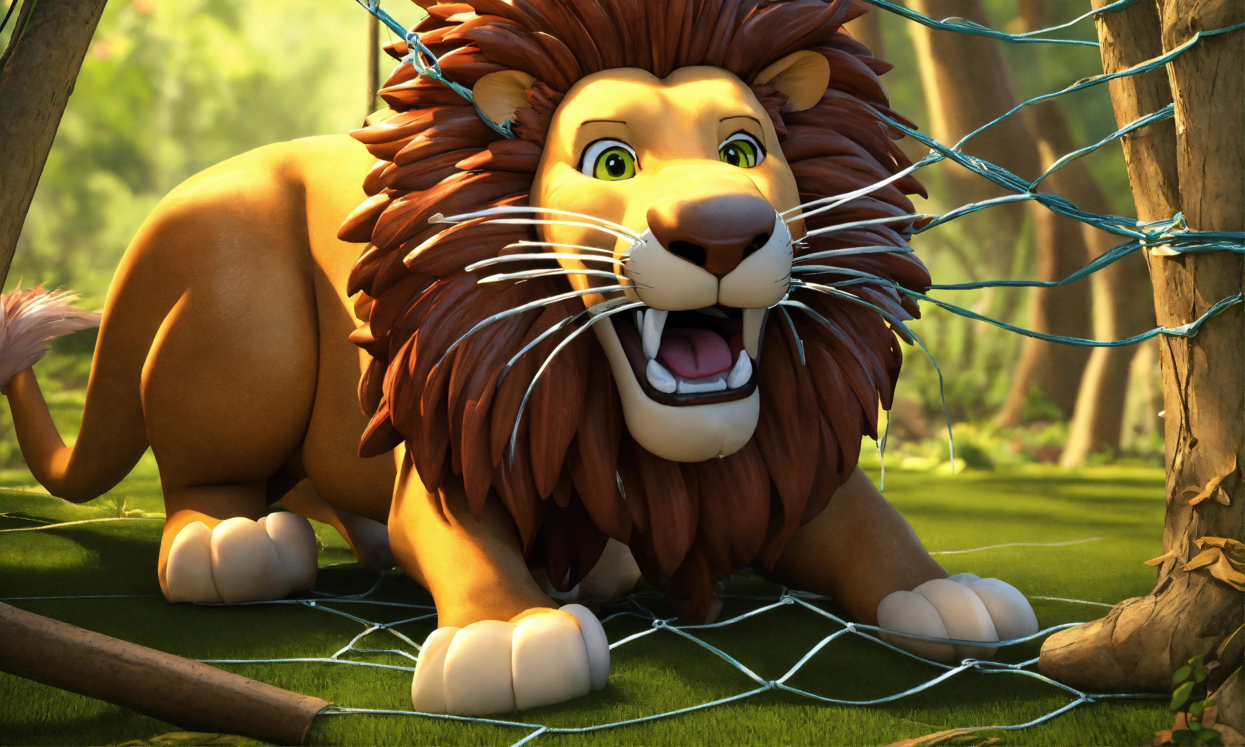 Cartoon 3d big lion was captured and trapped in a net and hooked to the tree and with mouse sharp teeth, the mouse nibbled through the net