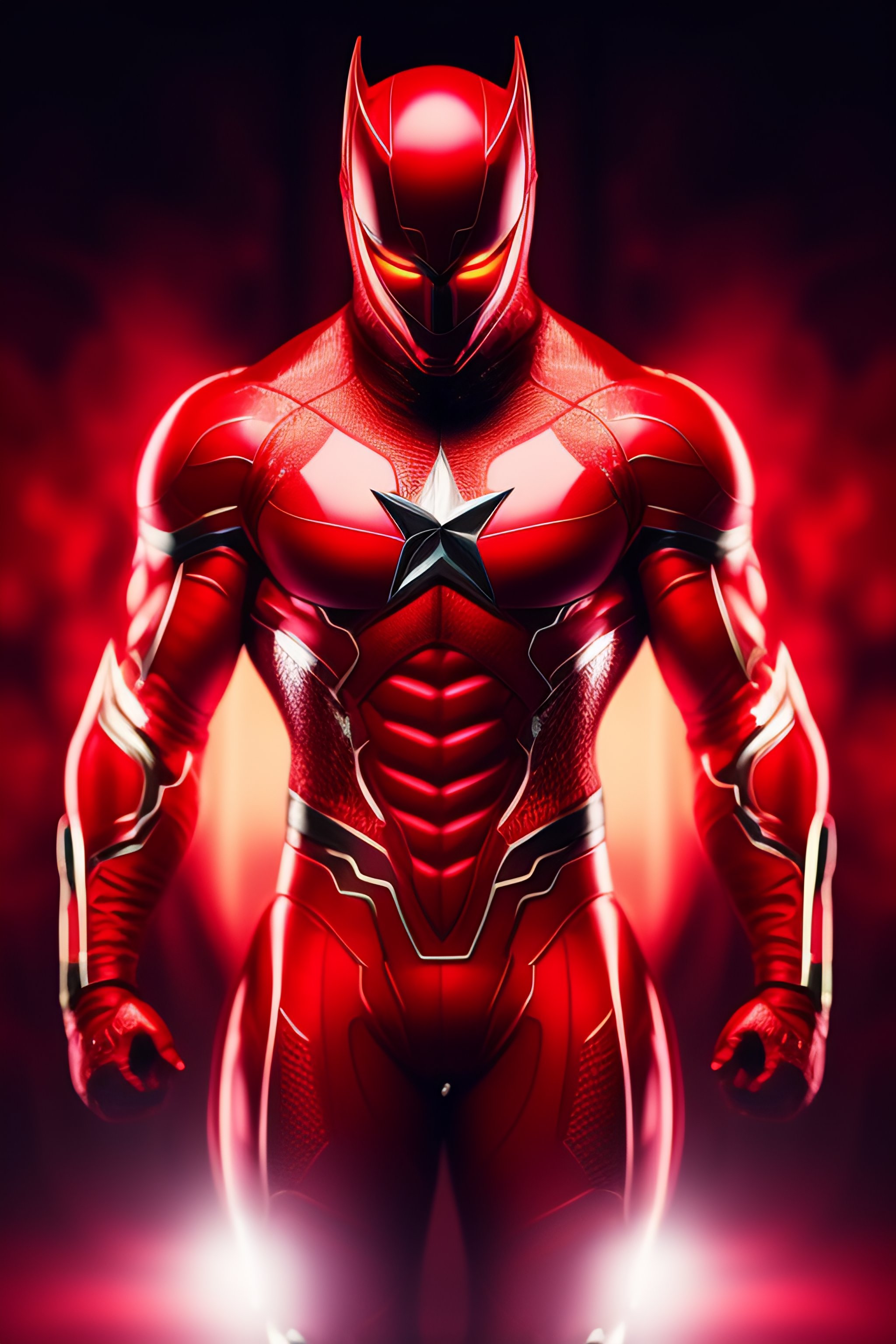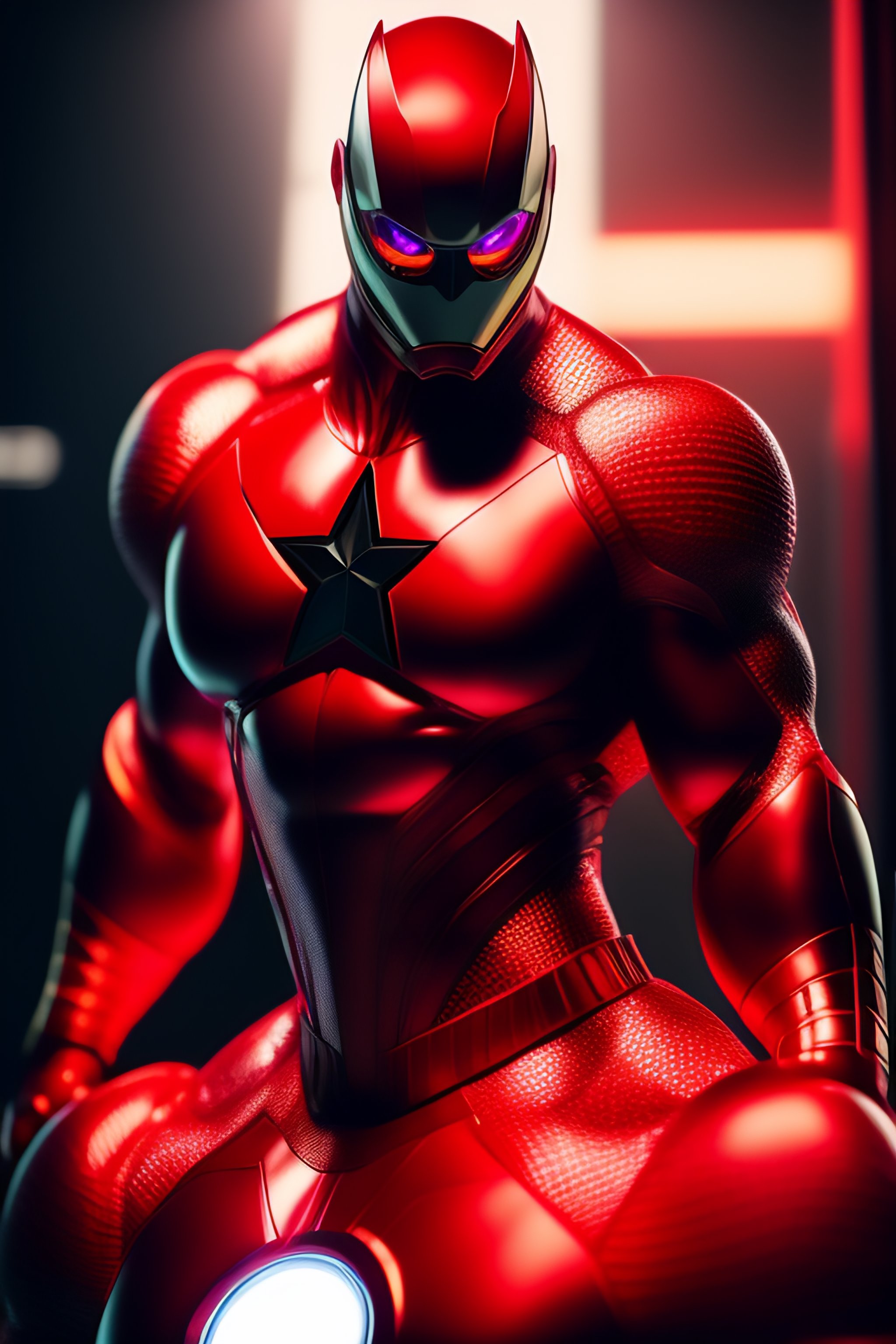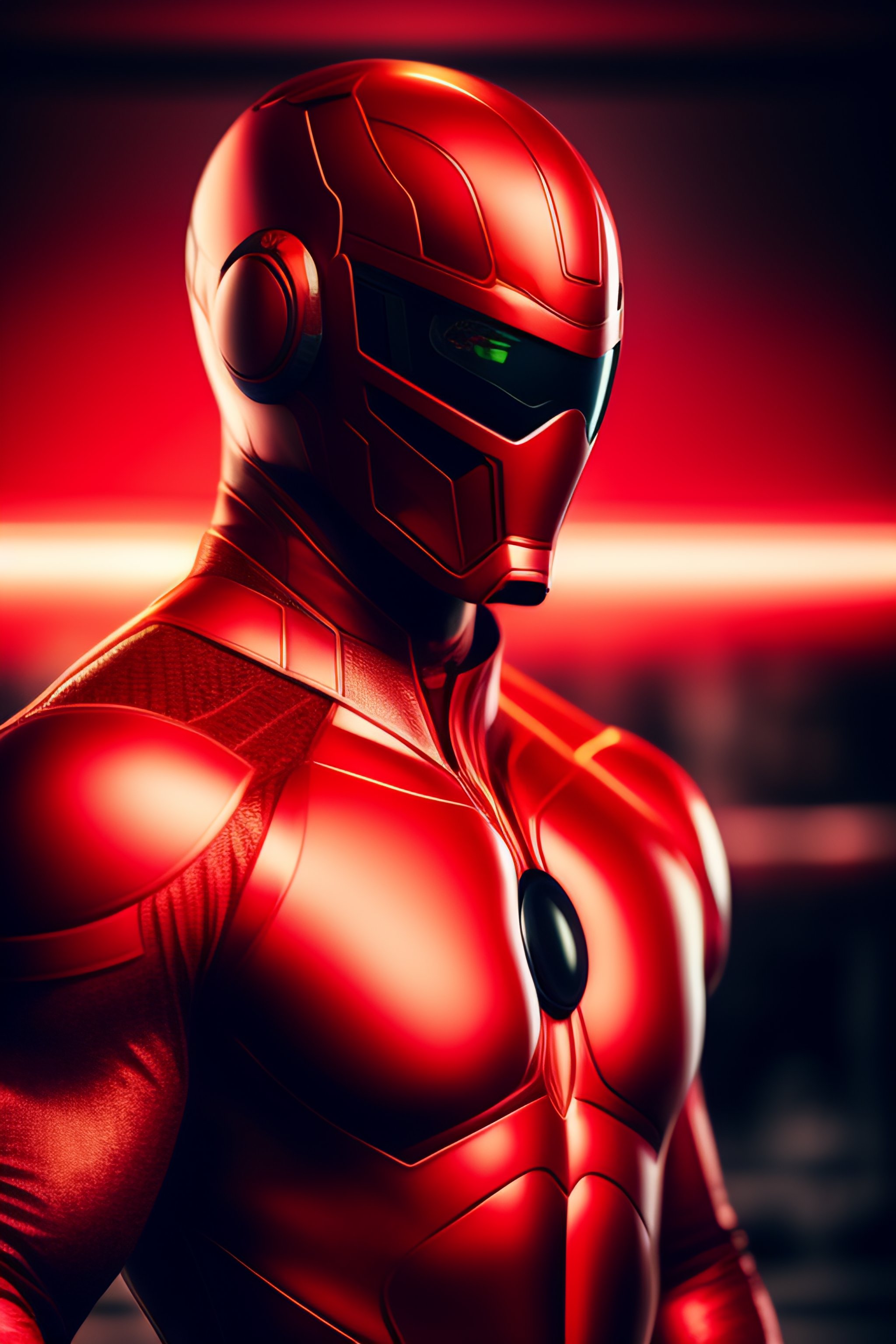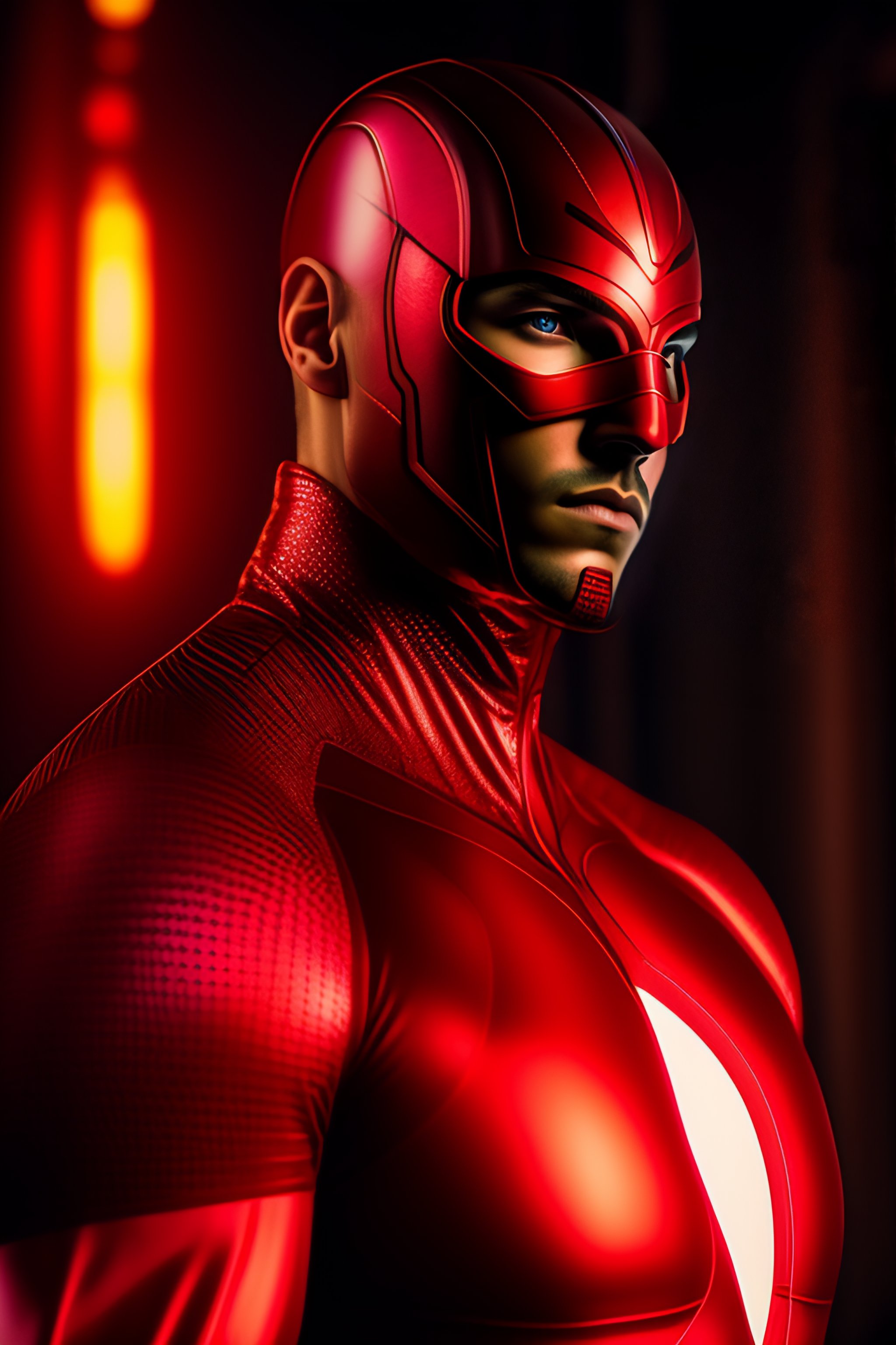 A ultradetailed beautiful panting of a male superhero in a red suit, full body, mcu style, superhero mask covering top of head, circle logo on chest, hyperrealistic, photo realistic, dramatic lighting
