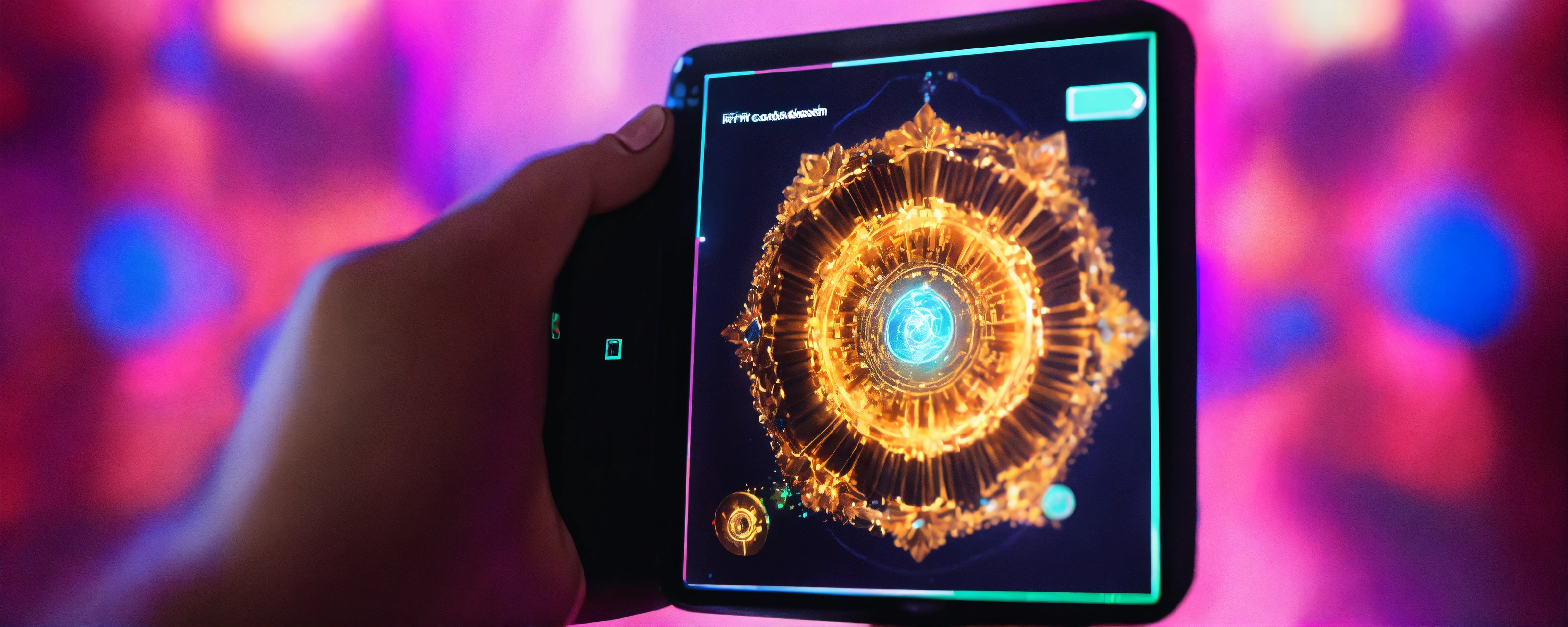 Visualize a hand, adorned with ar effects, holding a device displaying a radiant nft artwork against a contrasting backdrop, inviting viewers to commence their collection.