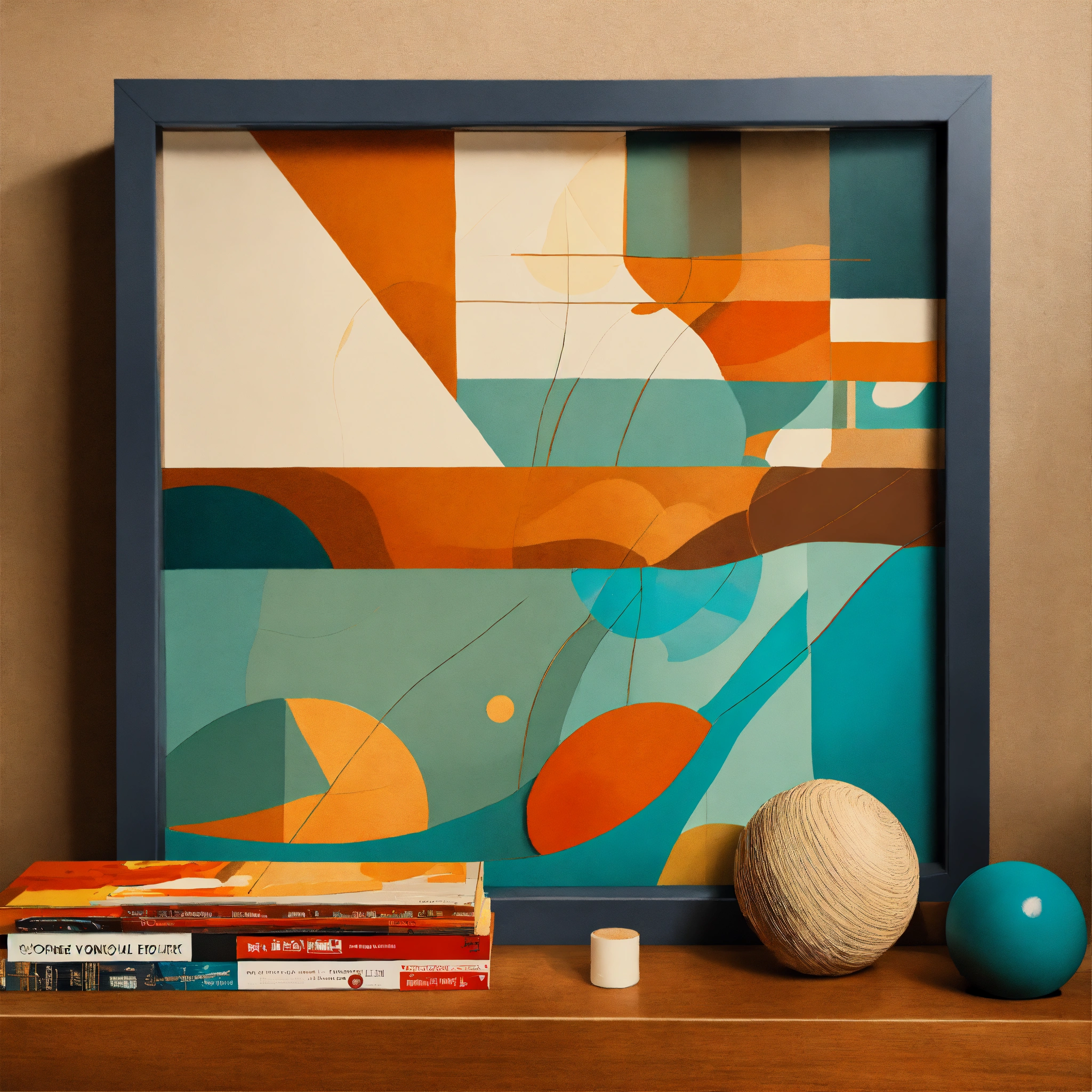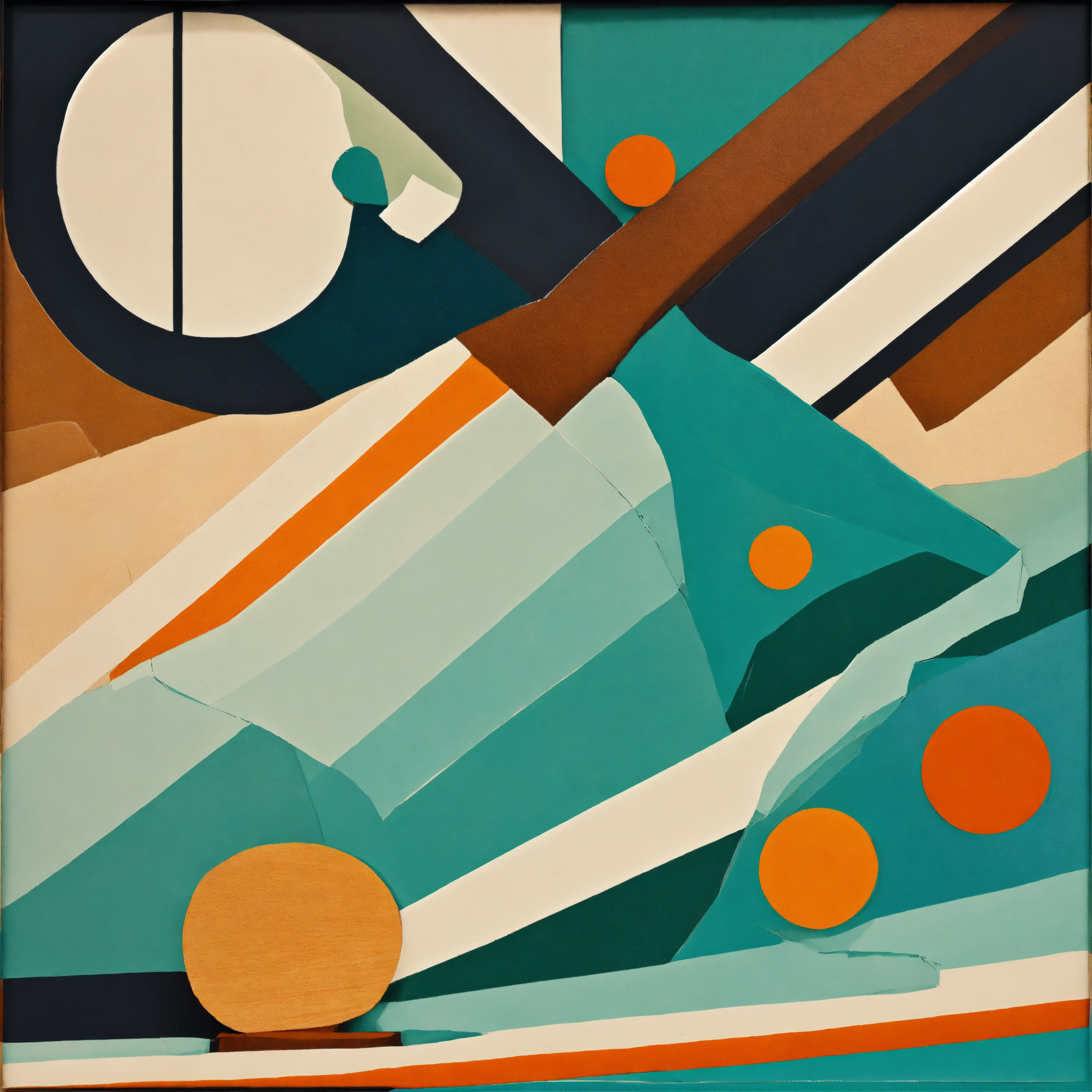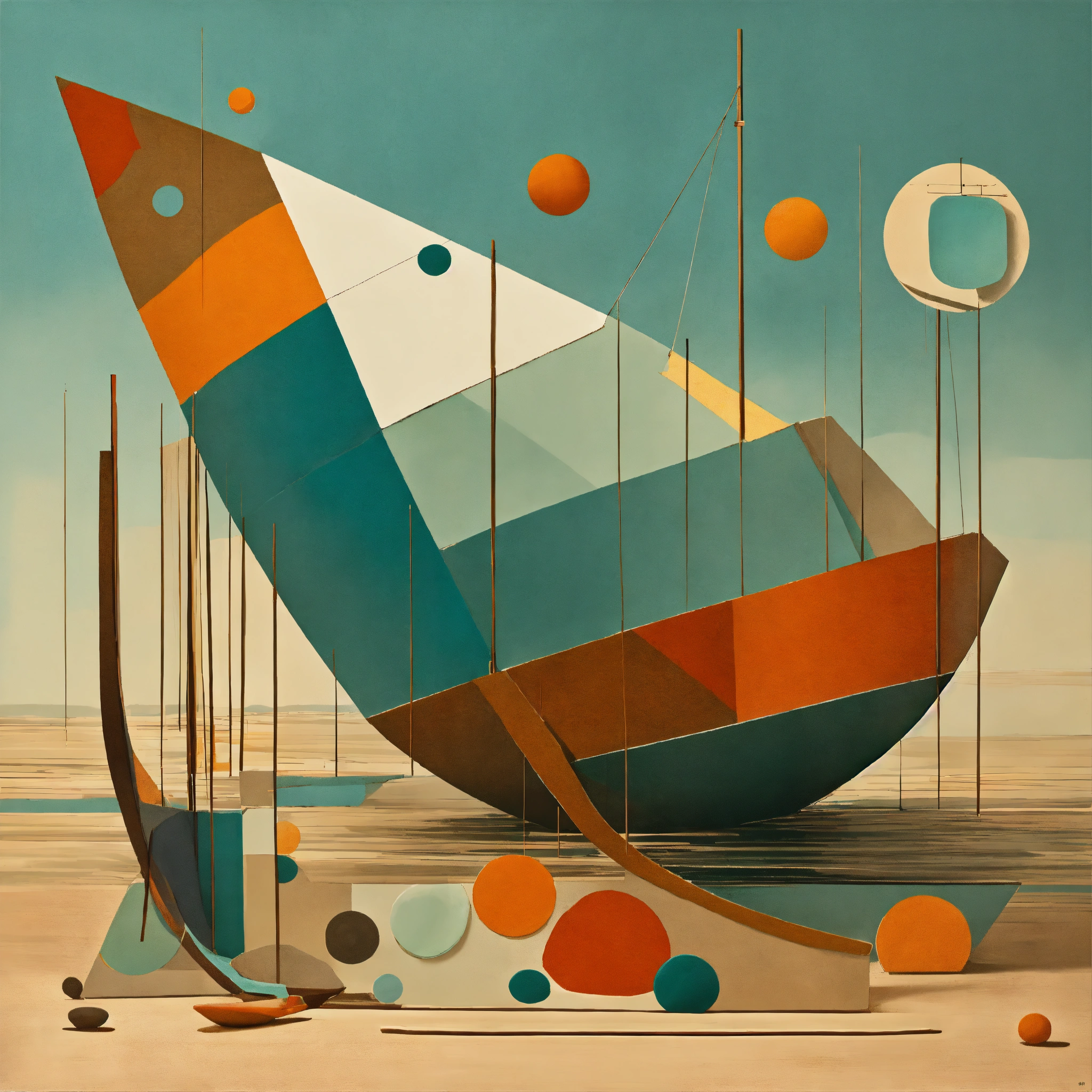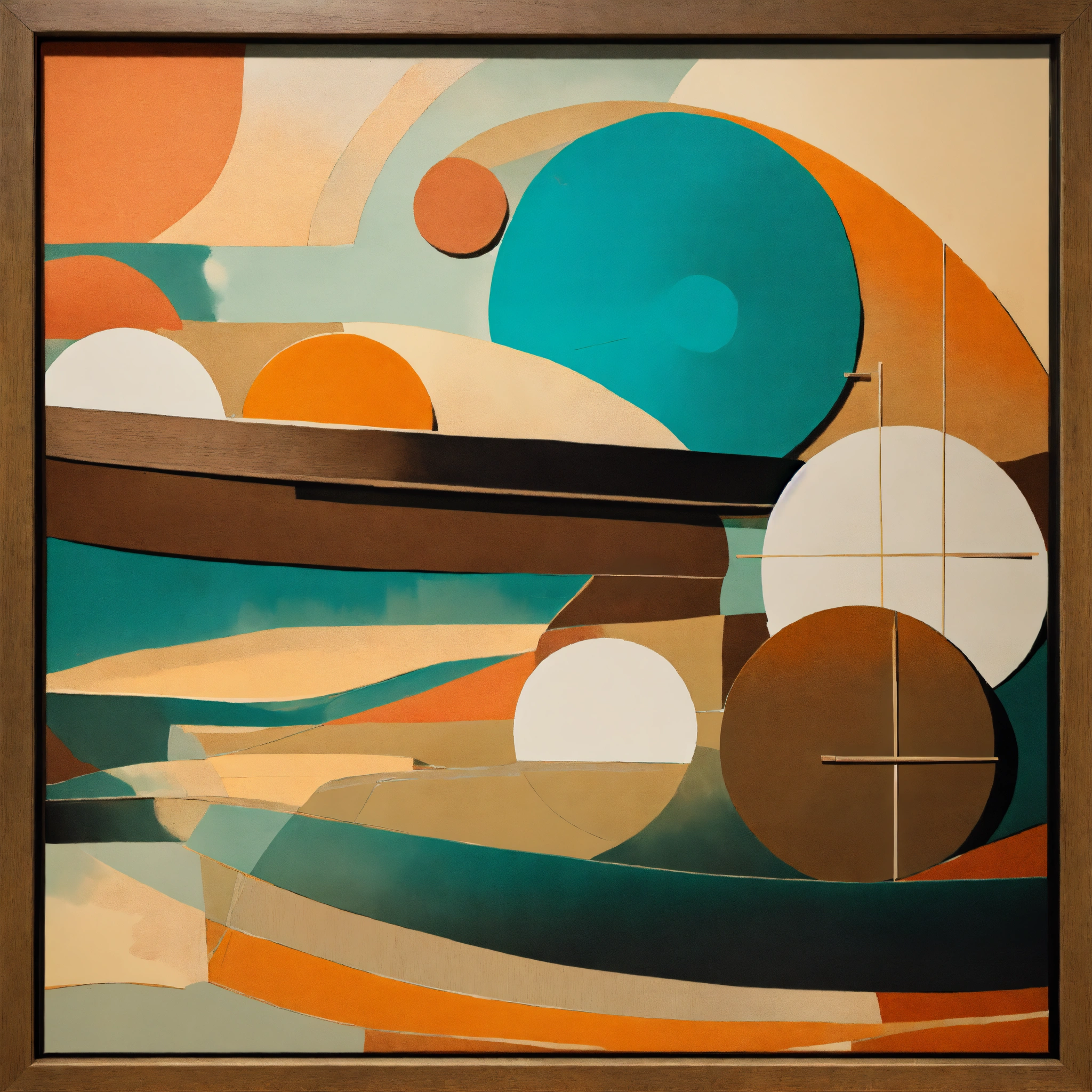 Vinyl-munny, framed sculpture, overlapping transparent color fields, smooth gradient transitions, rounded minimal kandinsky creation, heavy brush strokes and texture, natural colors of brown, ecru, white, orange (retro aesthetic poster), diagonal loose brushed lines, [[teal|slate highlights]], clever collage feel, rough edges, woodblock-letters peaking through composition, masterpiece evoking emotion, oars, nautical