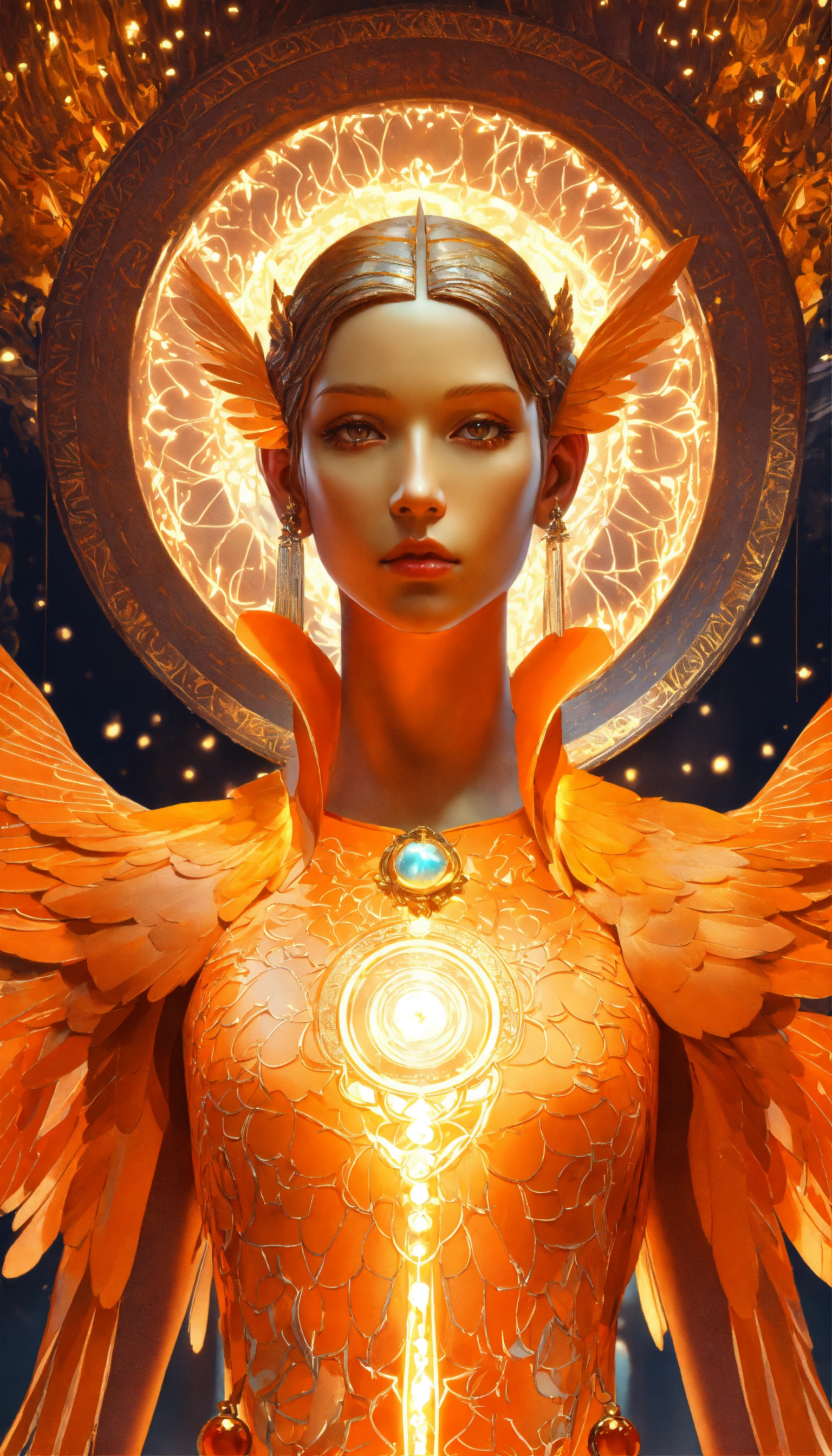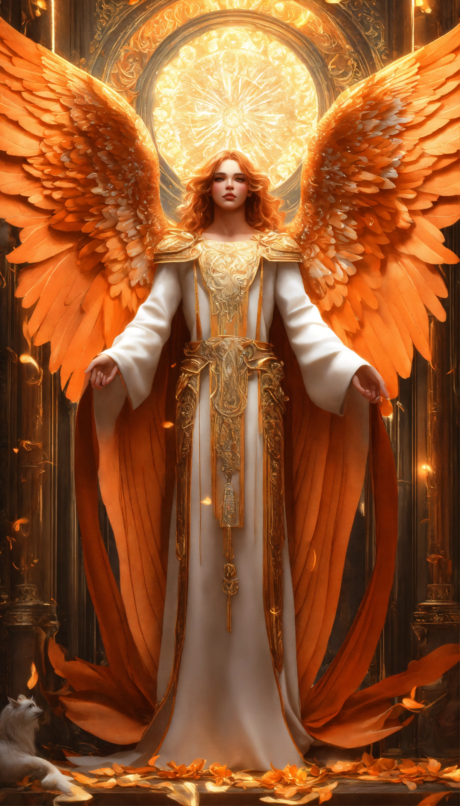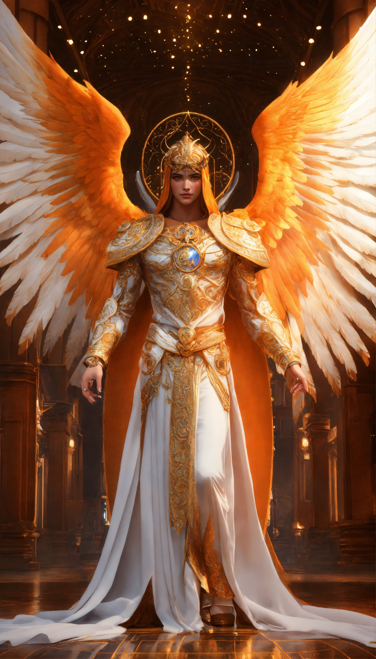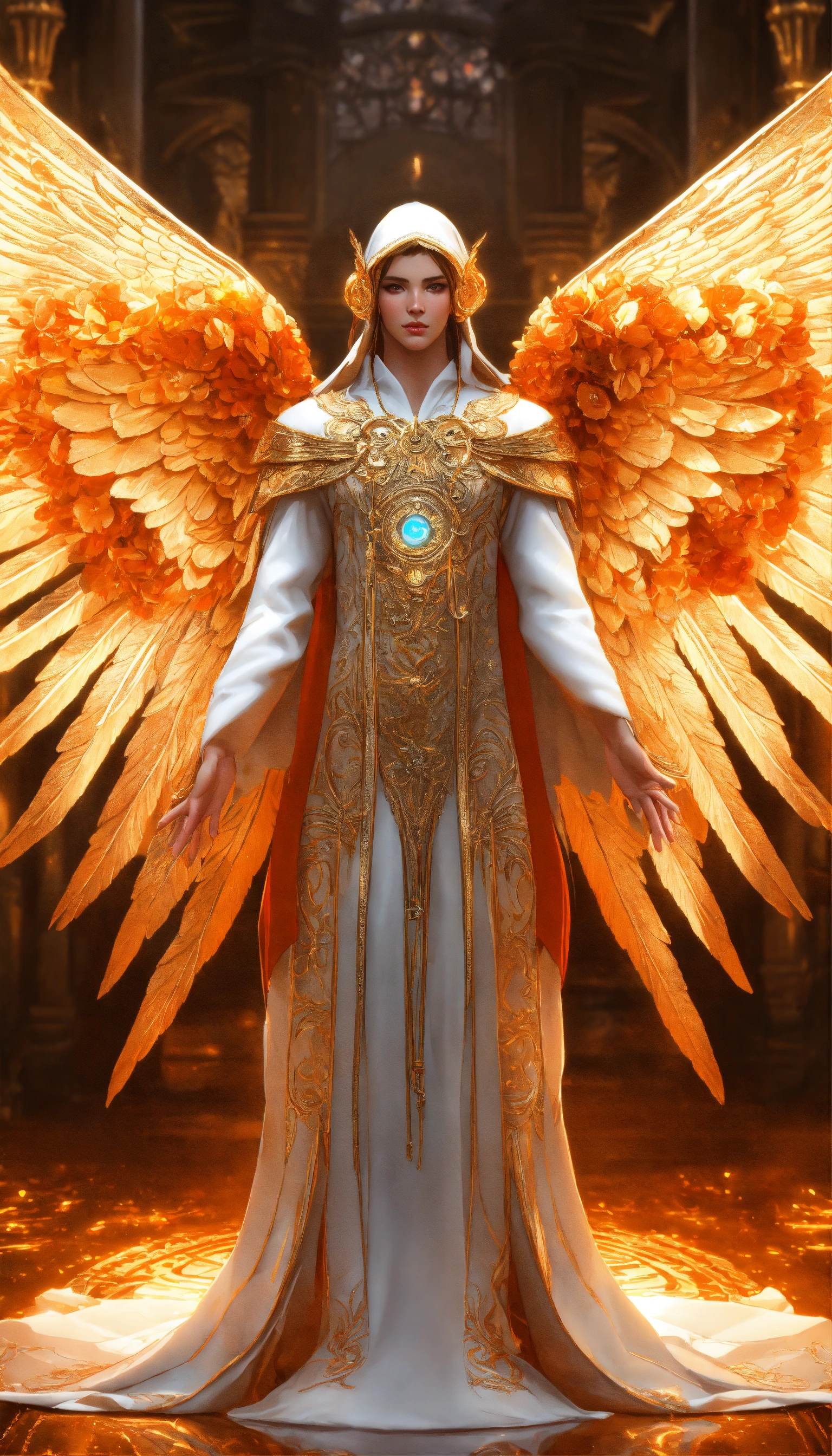 Text male angel, wings, intricate, highly detailed, photomanipulation, art station, real, 3d, orange wings with luminous white flashes, large and detailed wings, clear eyes and deep look, face perfect in beauty and detail, jewel in the third eye, orange robe with white and gold details, sacred, mystical, sharp focus, cinematic lighting, 8k, art by artgerm and greg rutkowski, alphonse mucha, cgsociety, high quality and resolution, hyper realistic