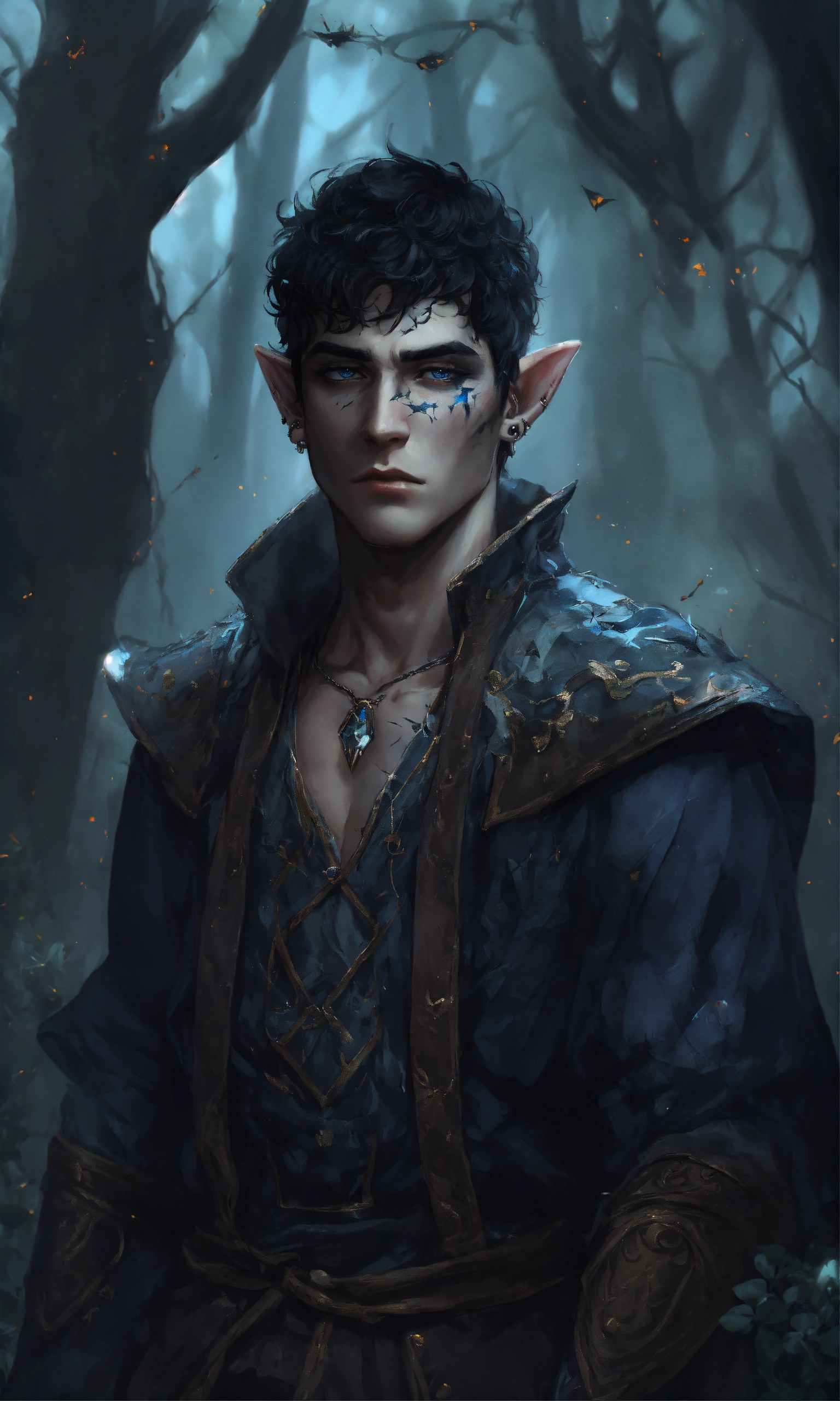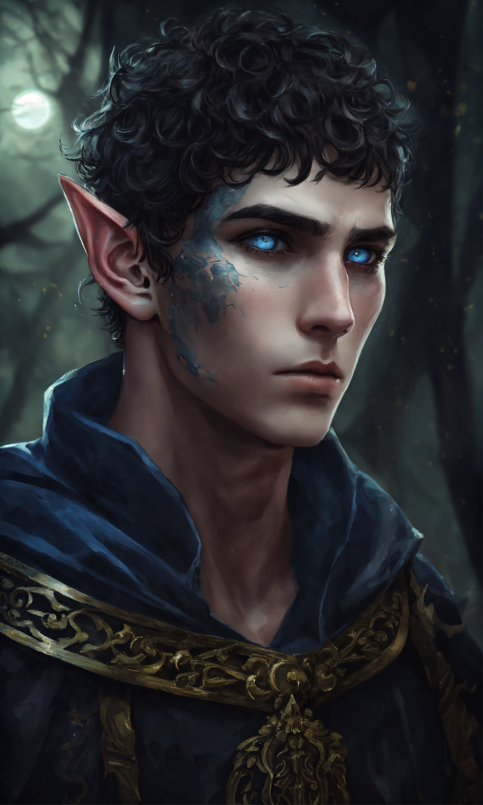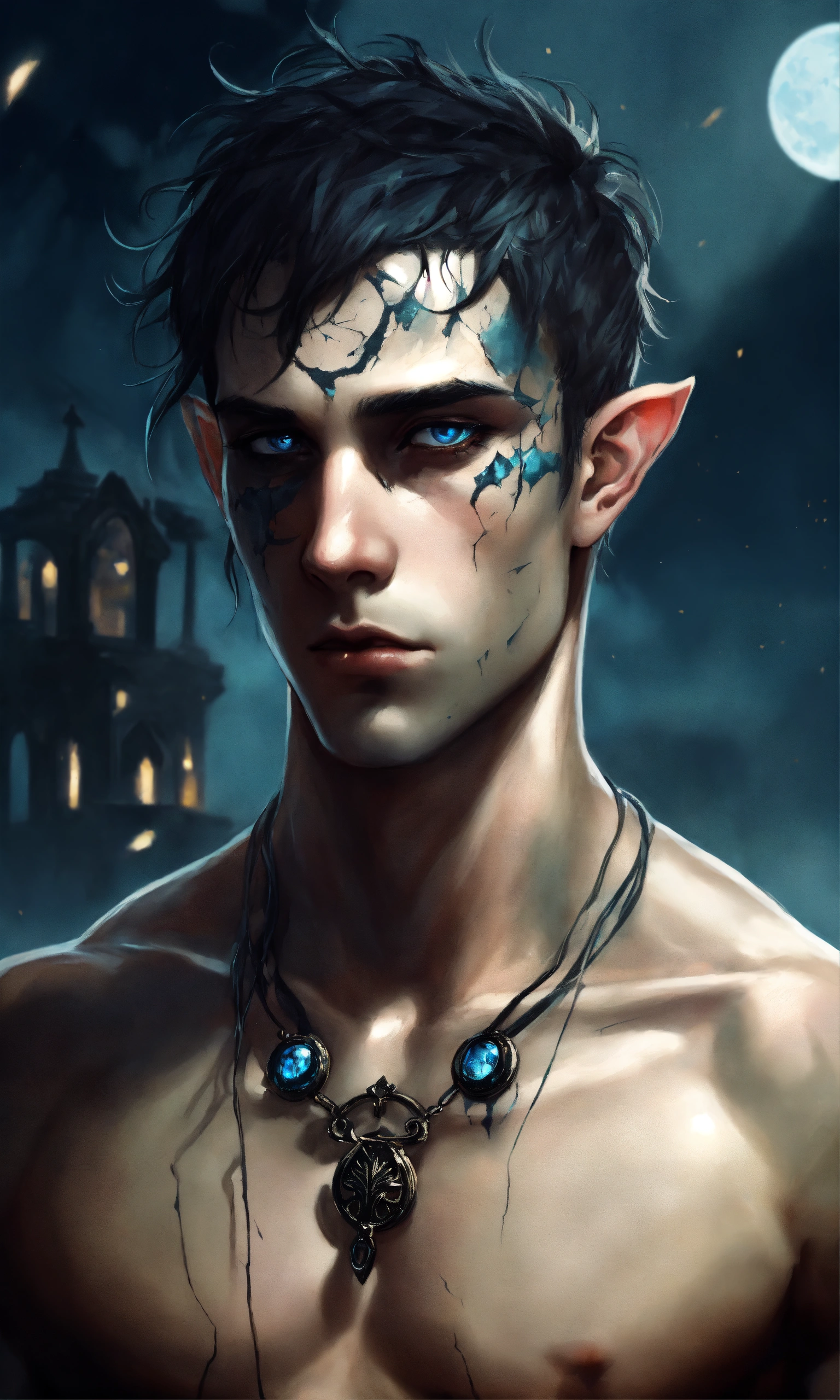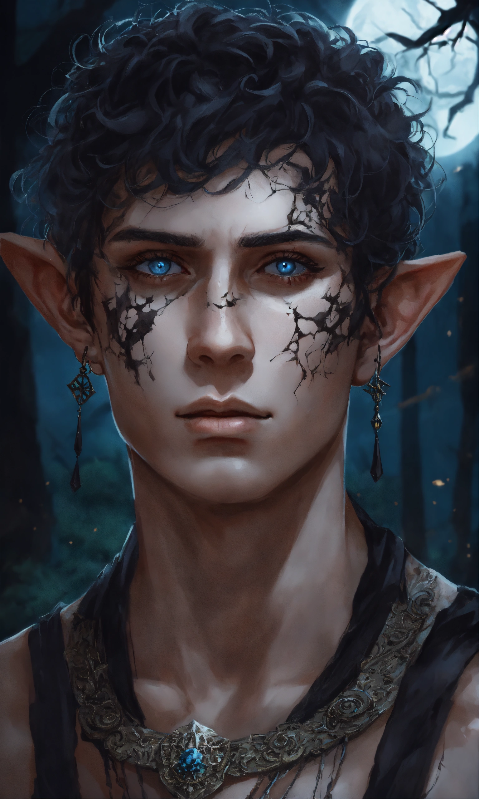 Fantasy portrait of a gaunt male elf, sickly thin, scrawny, shirtless monk, pale skin, black shattered skin, black cracked face, broken skin, inocent expression, chin up, lifted brow, pointy chin, short curly black hair, big blue eyes, lost expression, sad, open, black shadow magic, ultra detailed, piercings, moonlight graveyard background