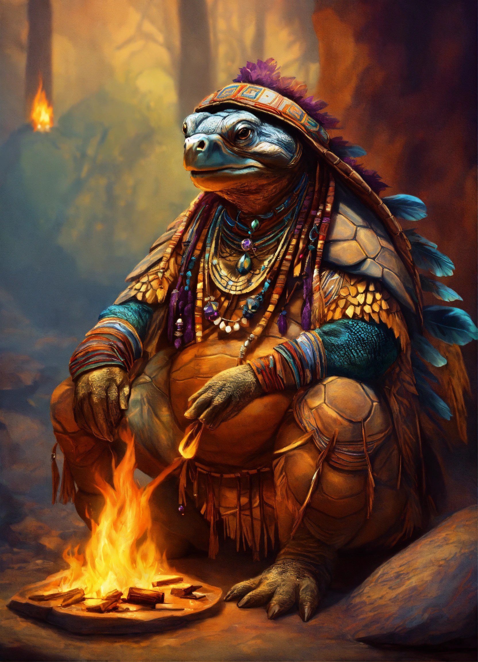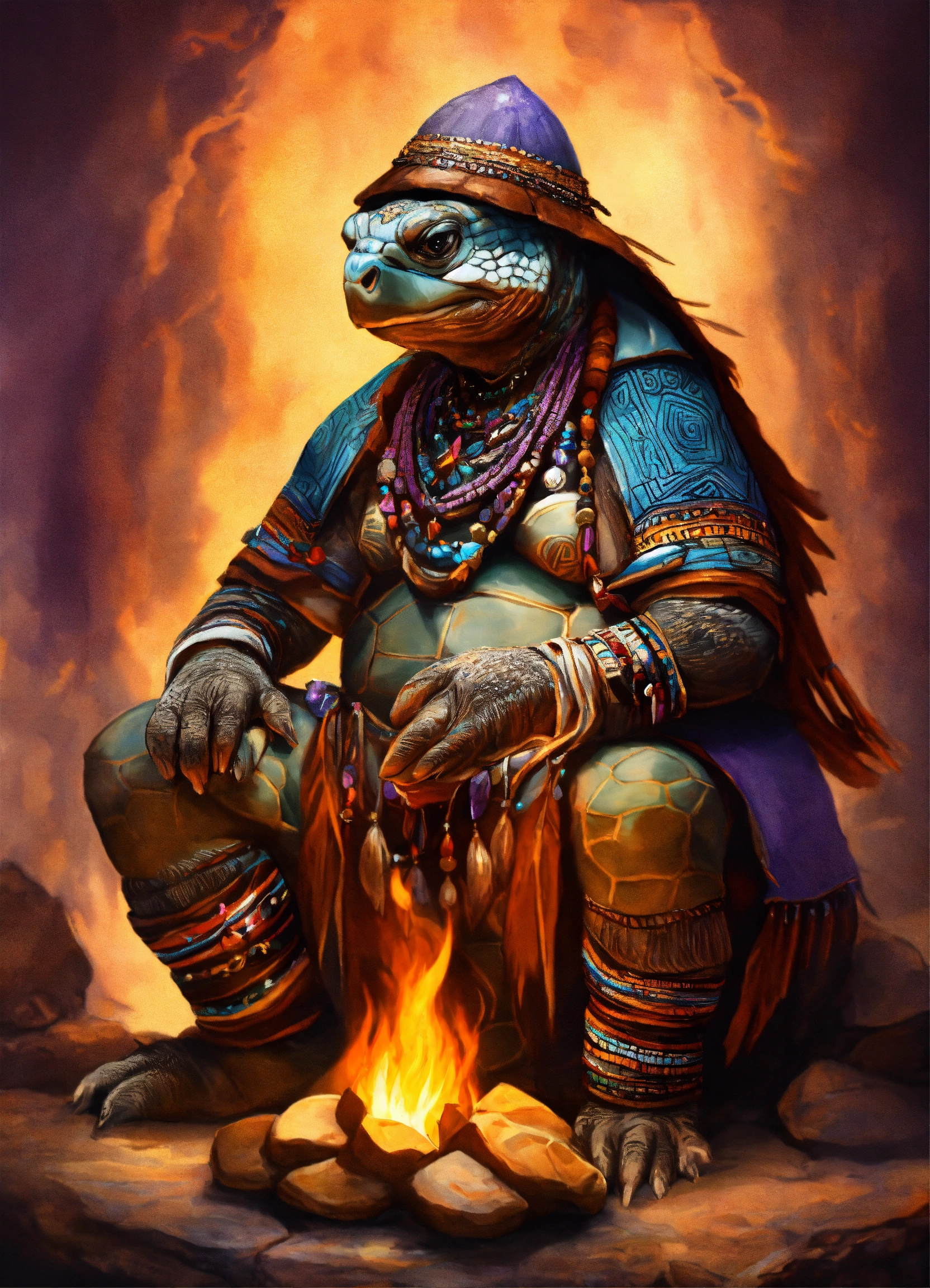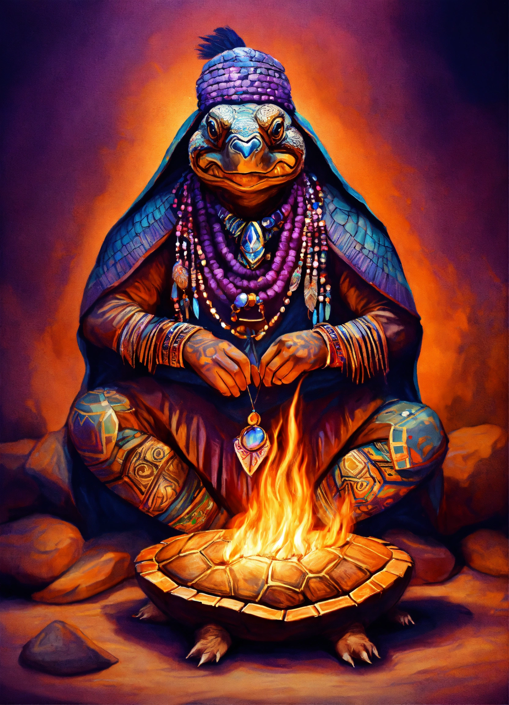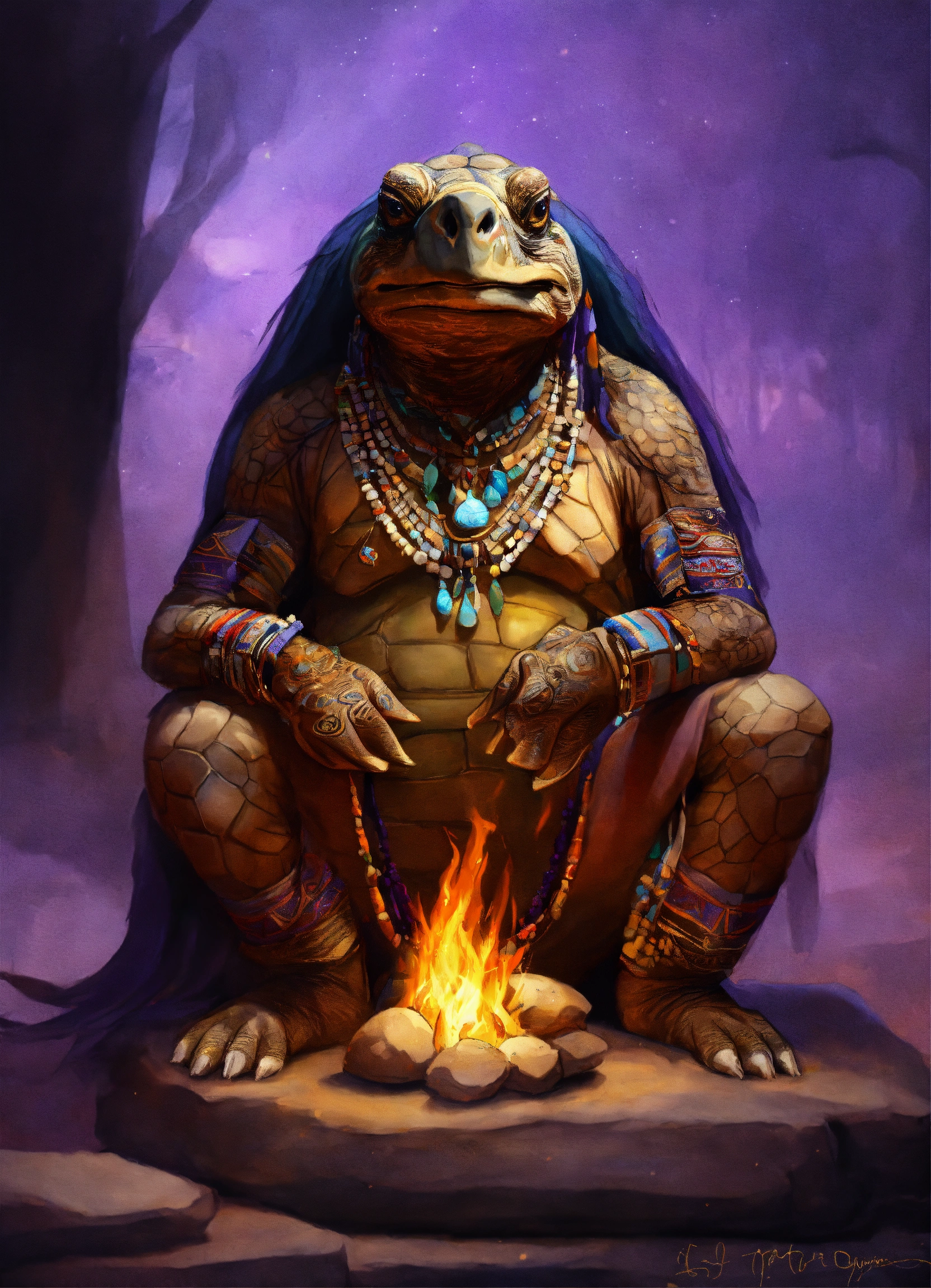 An old tortoise shaman, animal, sitting by the fire, beautiful drawing, native american style drawing, amethyst jewellery