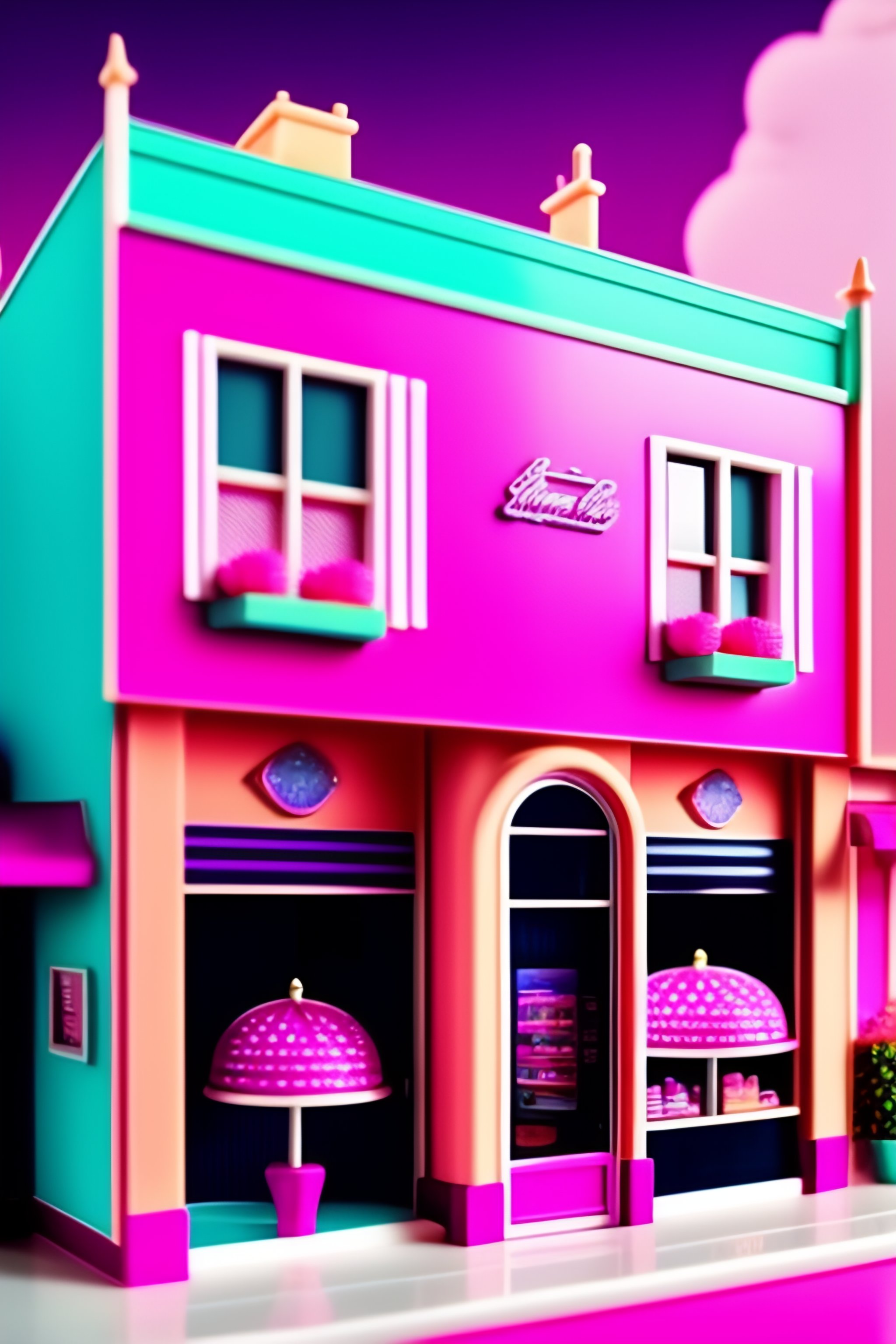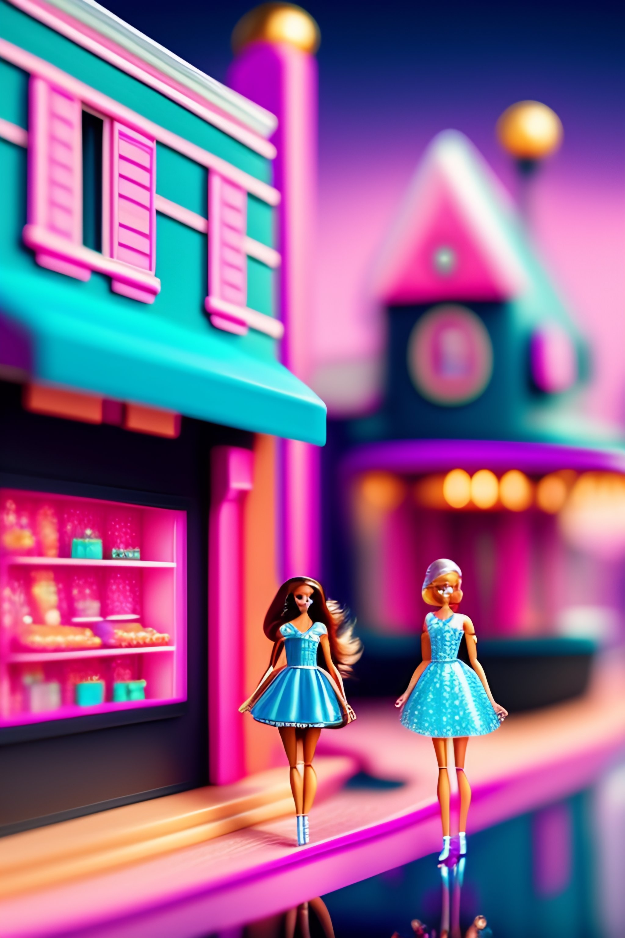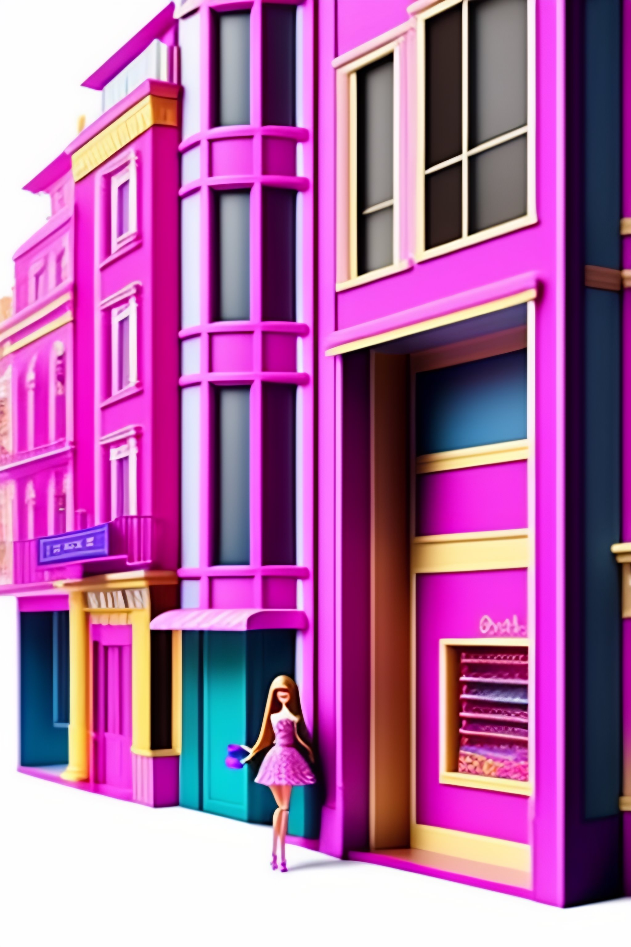 Vector barbie doll with barbie doll houses and shops on main street background in sparkly pink with the clear image of barbie doll and her friends in the image with the houses and the shops with a closeup image of the barbie dolls