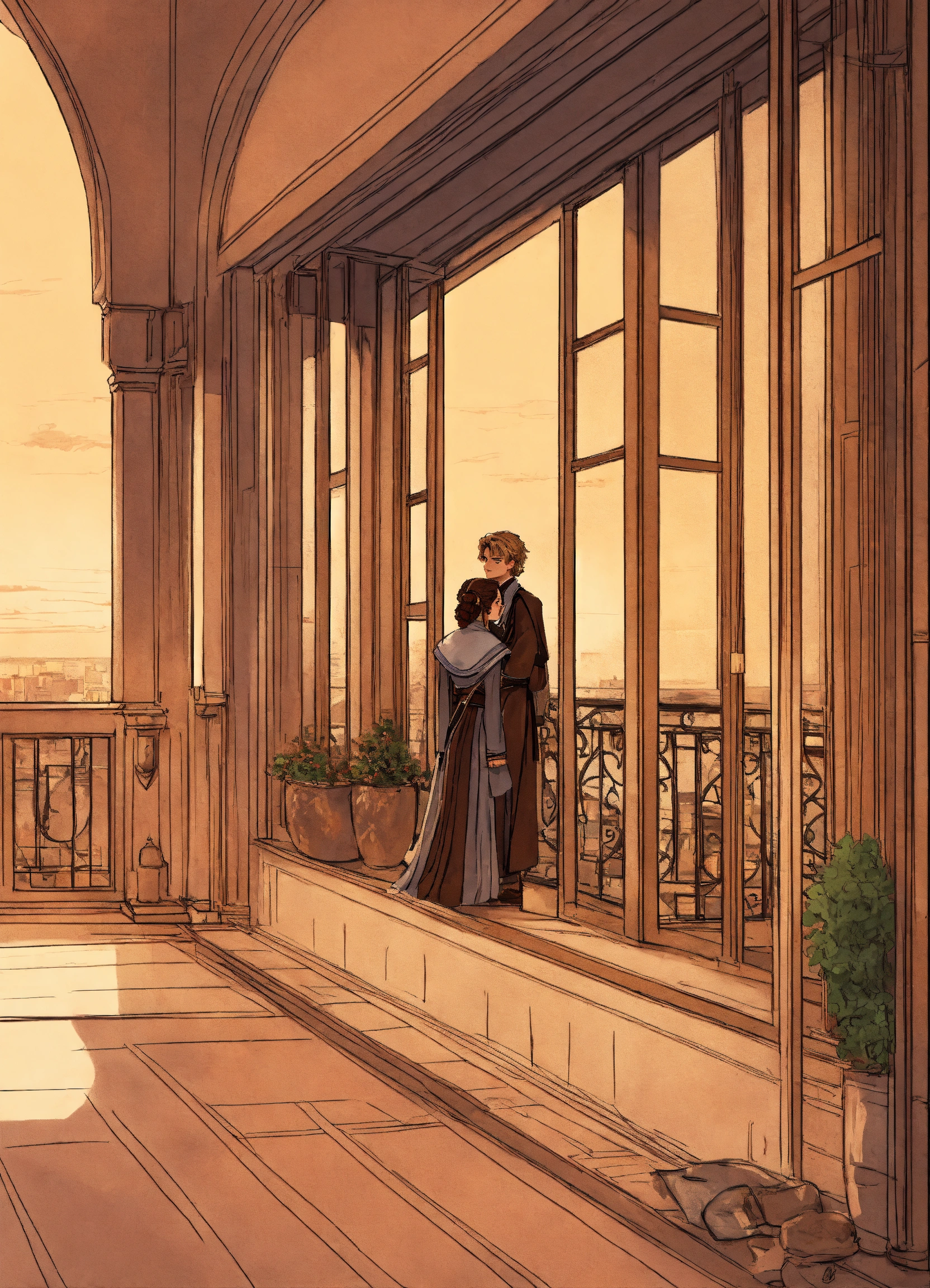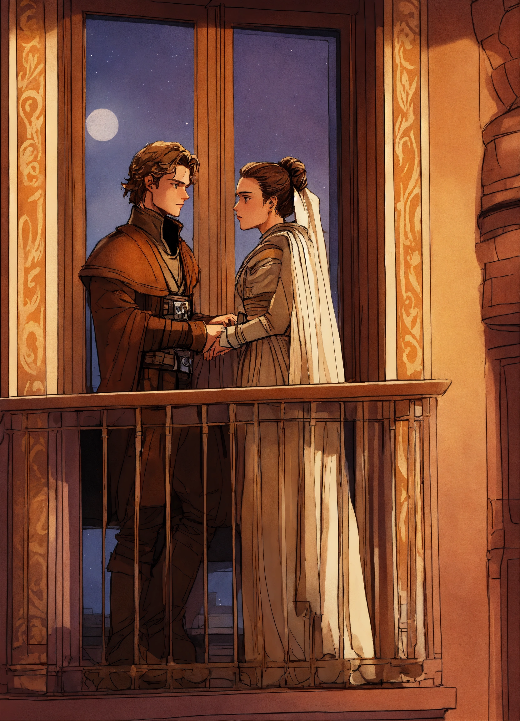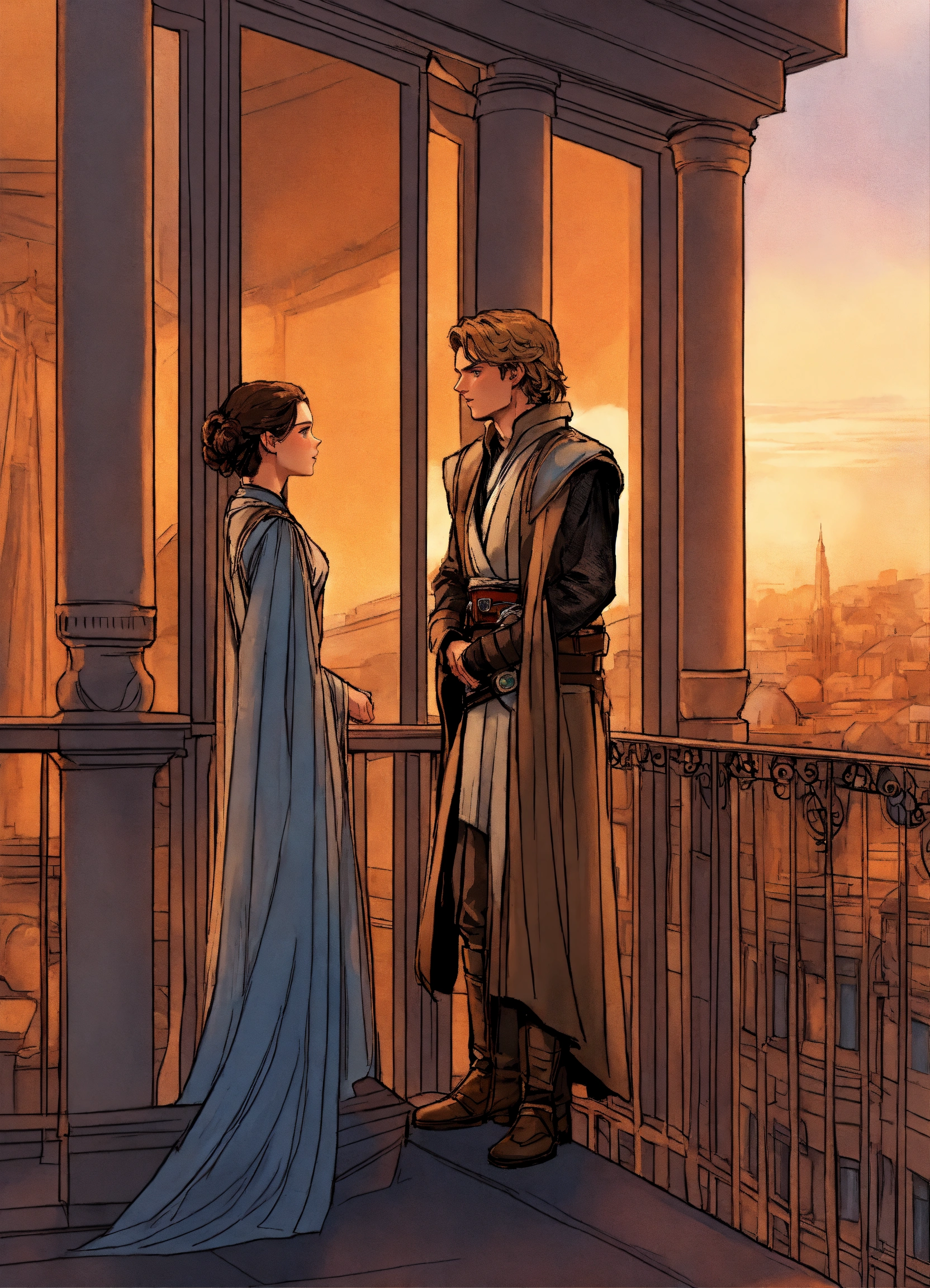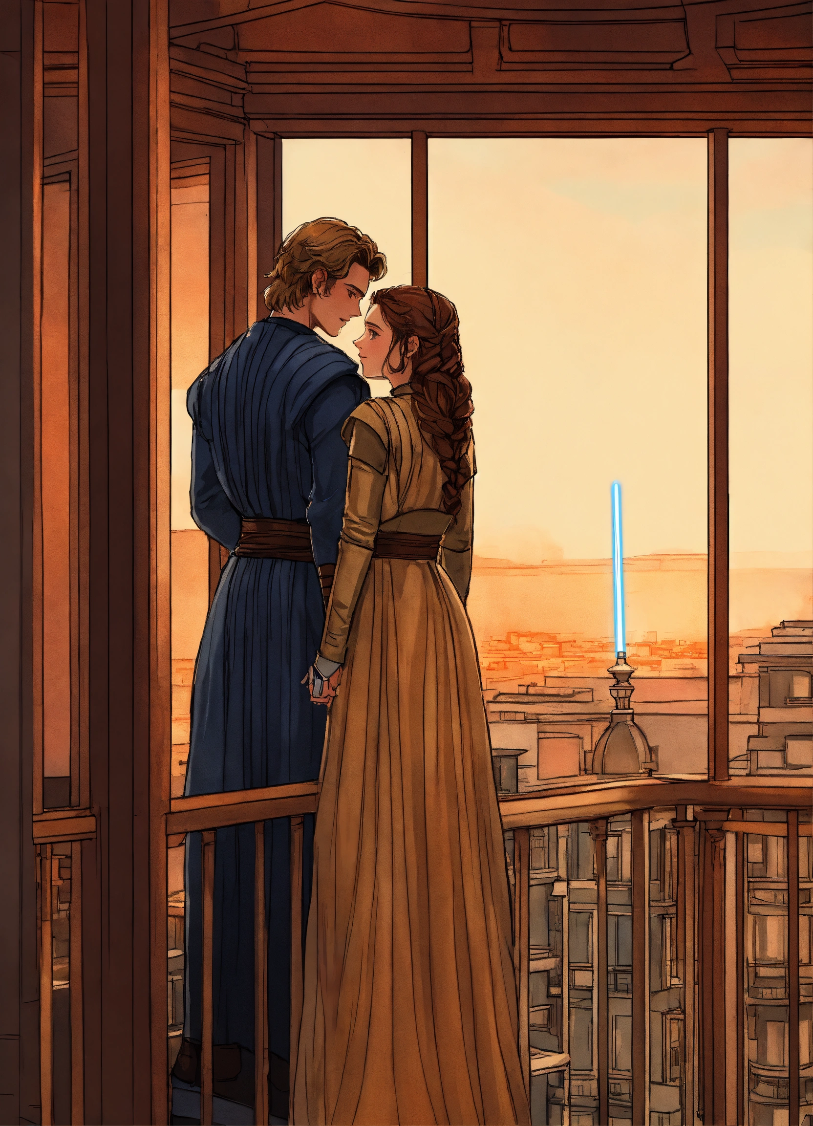 Anakin and padmé looking at each other on the balcony of their coruscante apartment