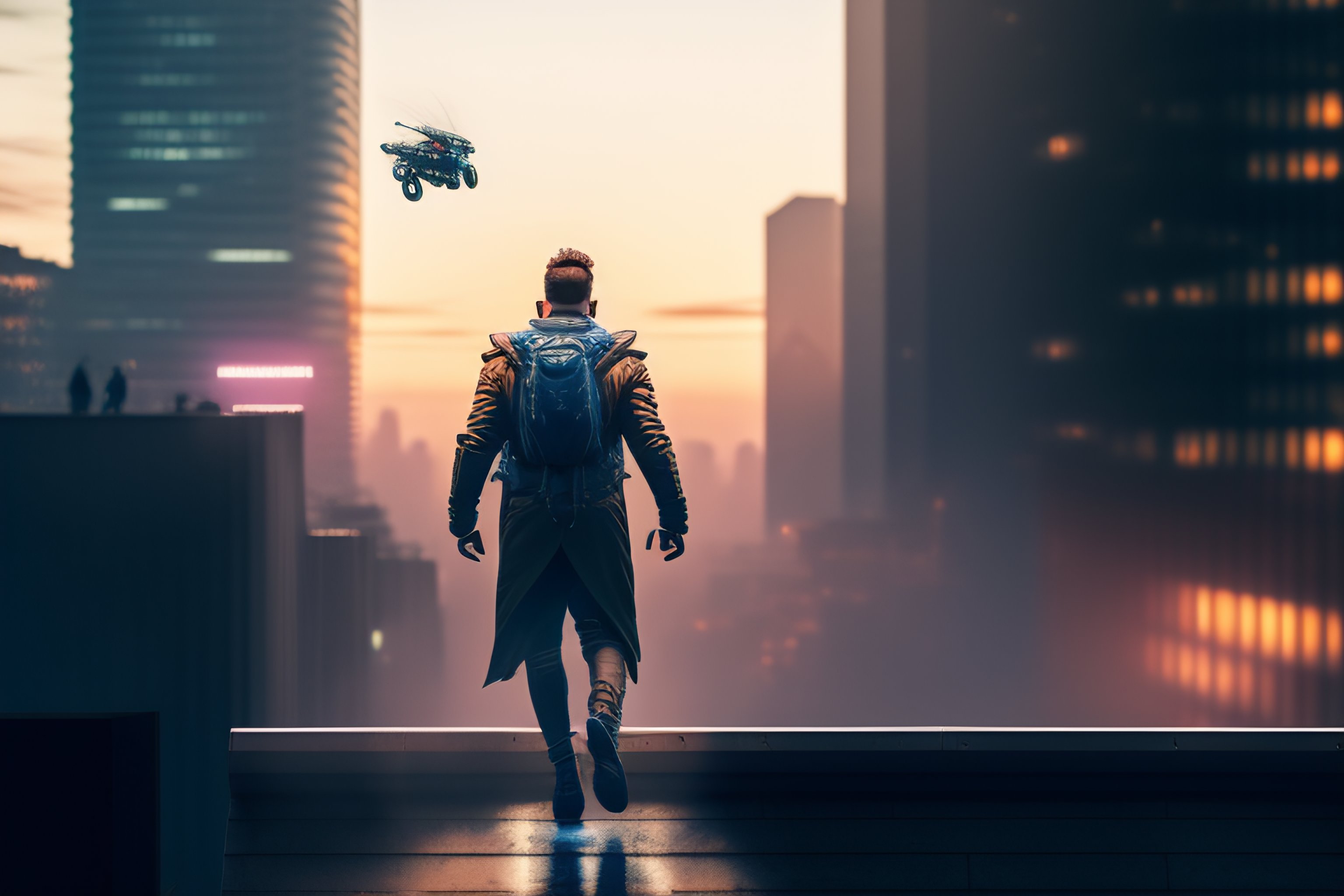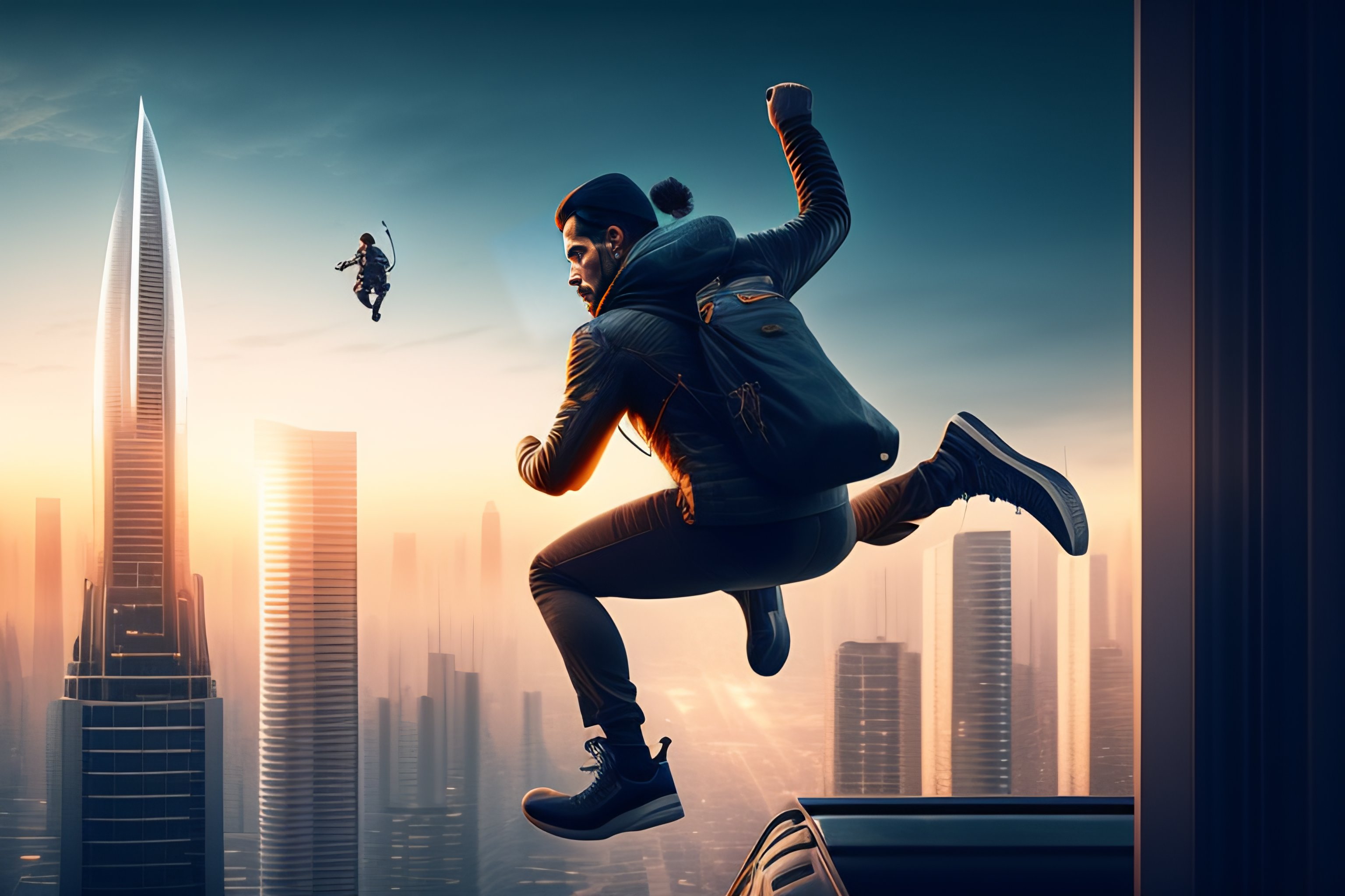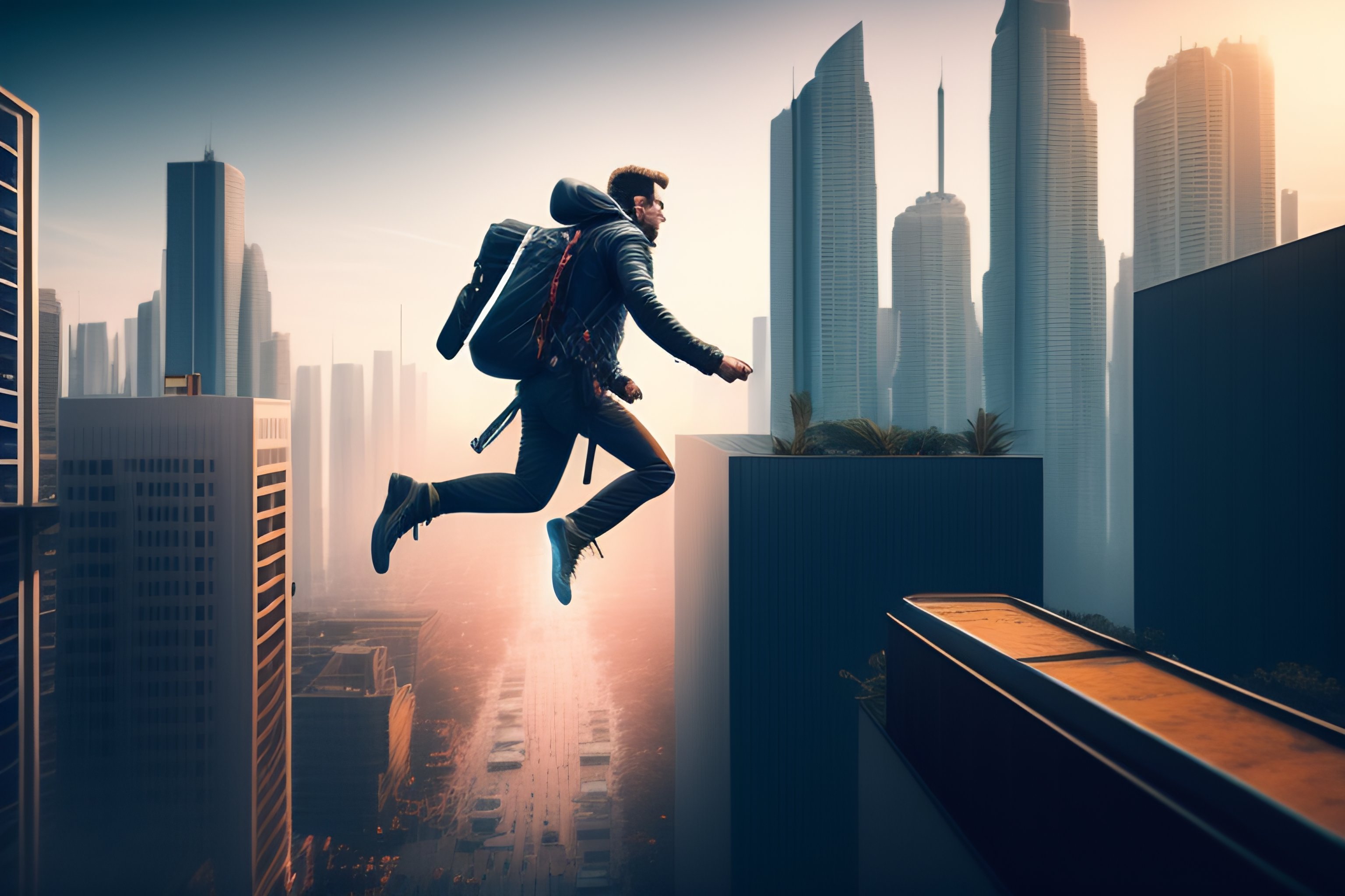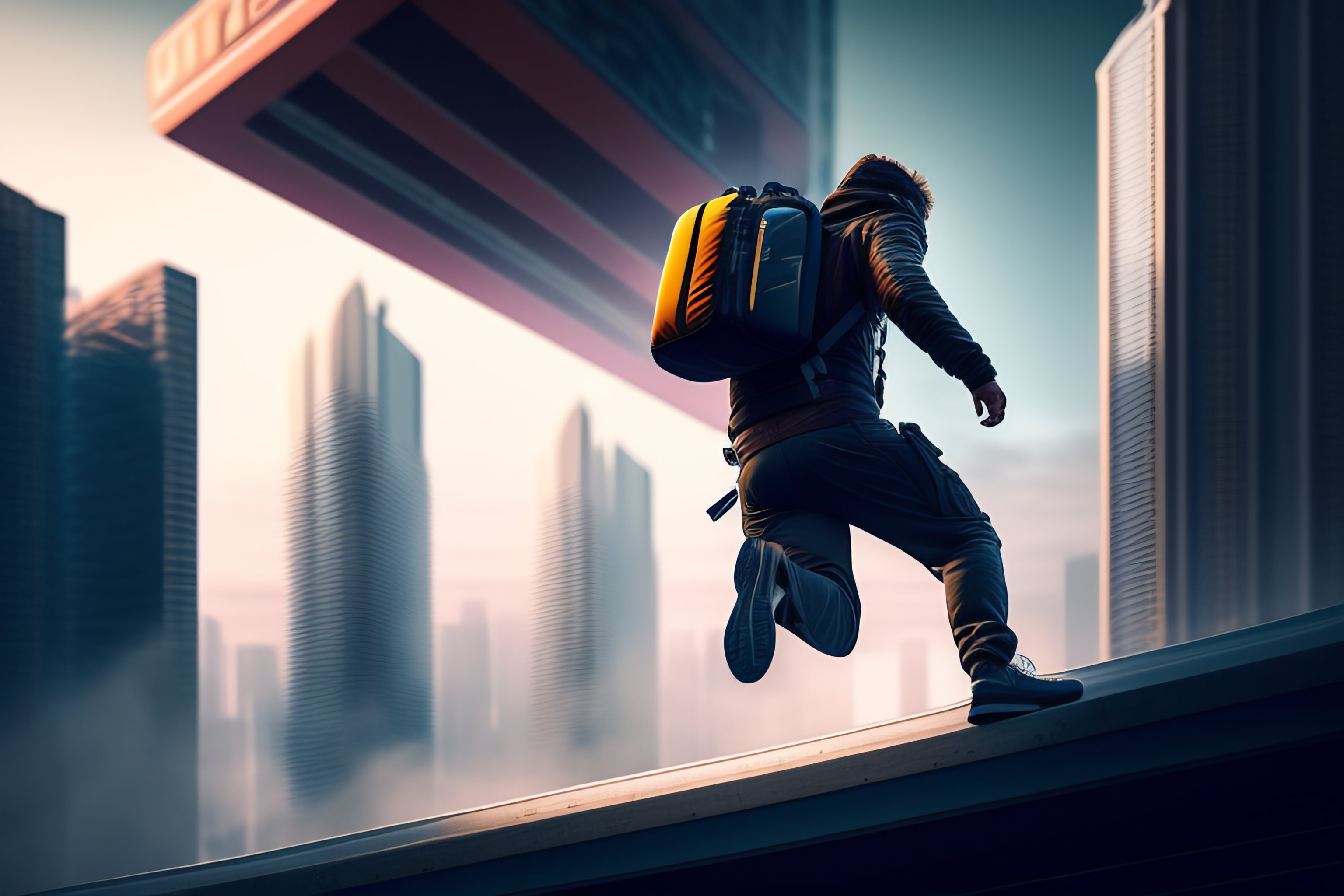A white man jumping from roof to roof in a cyberpunk city