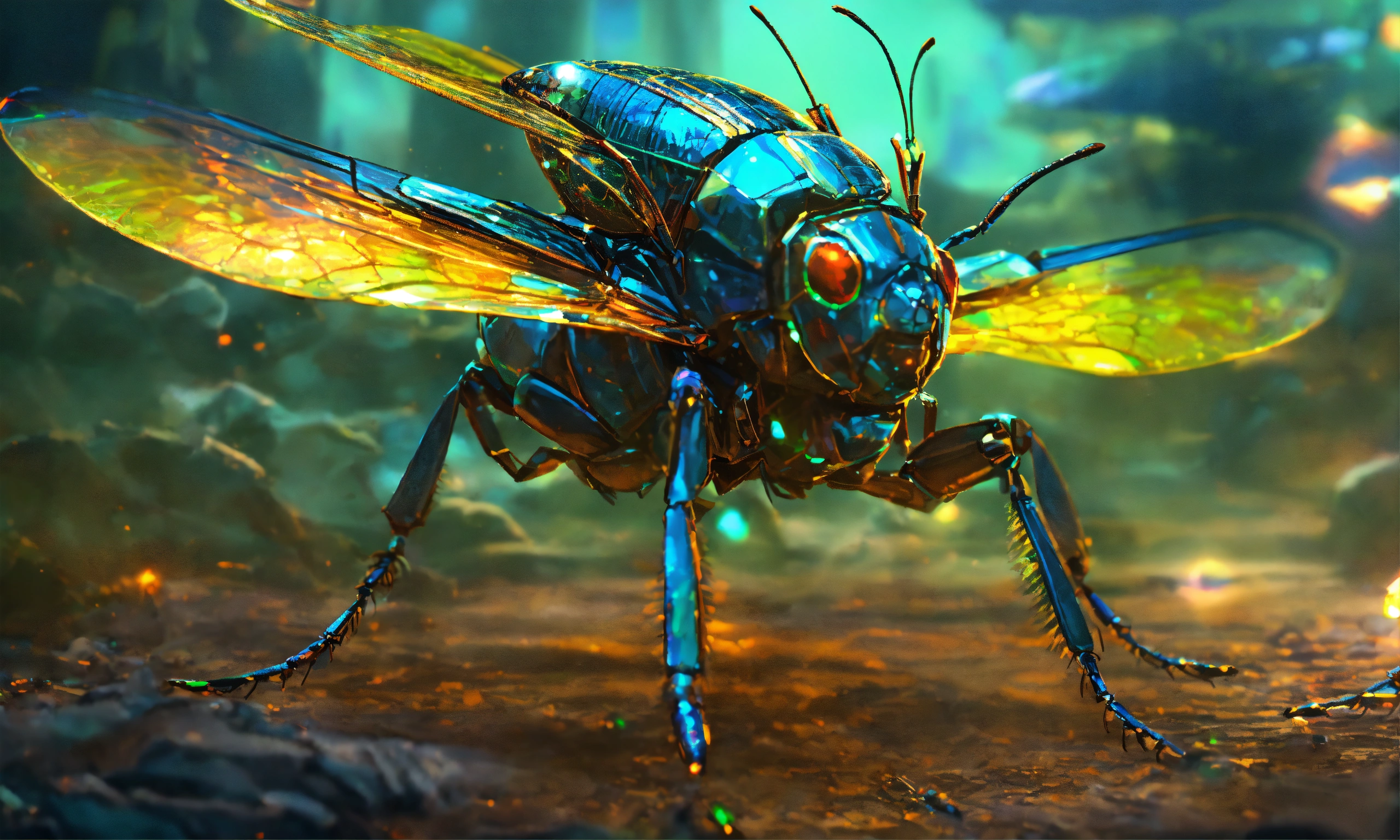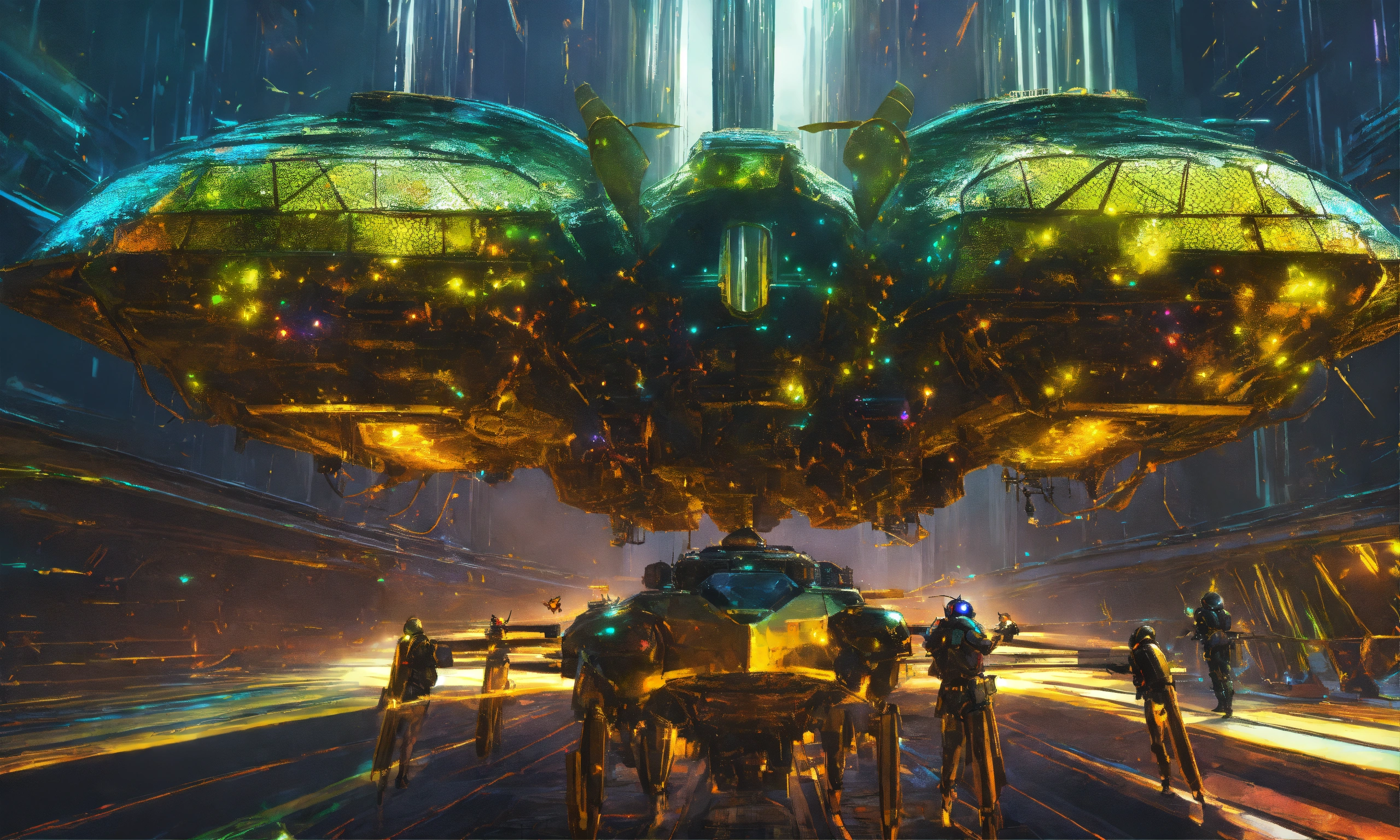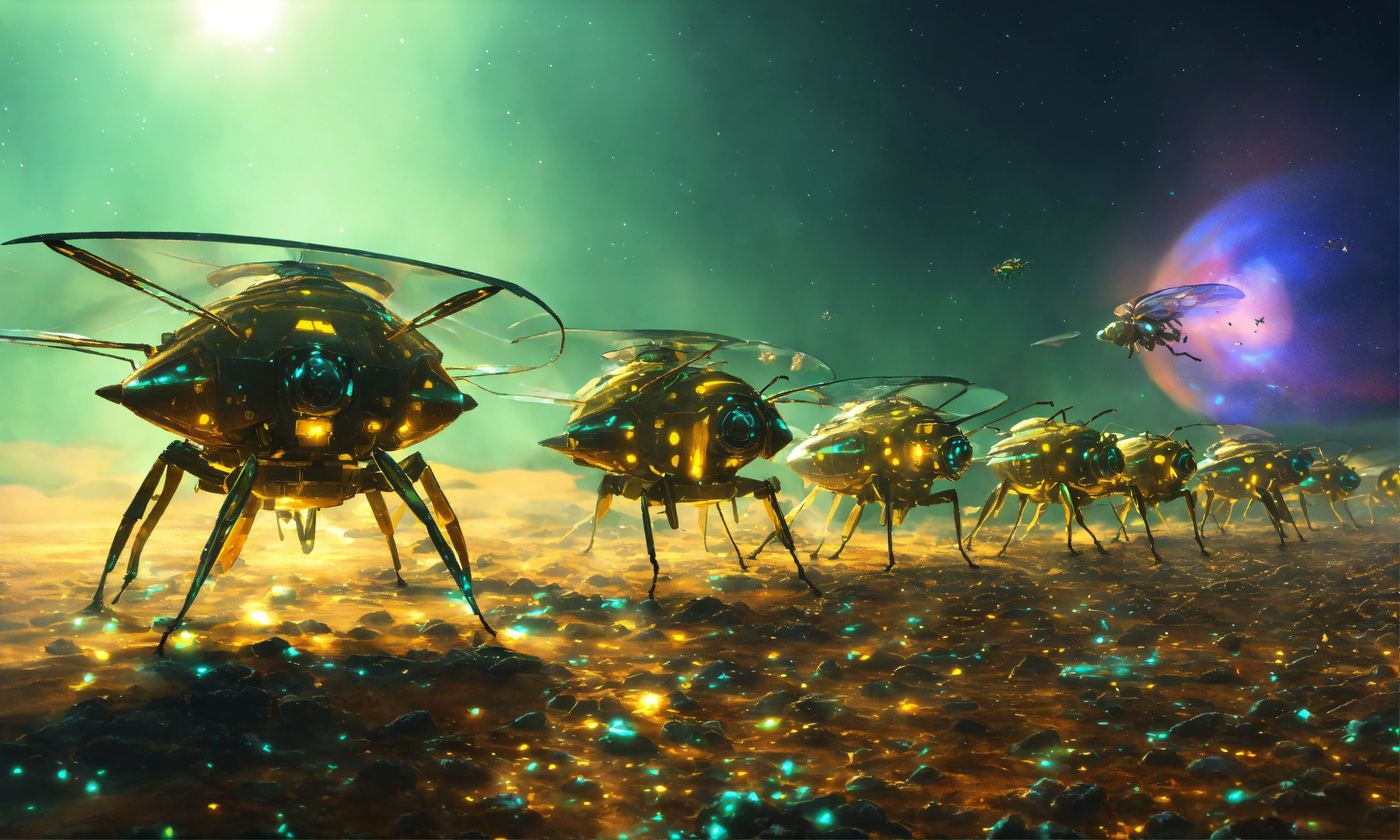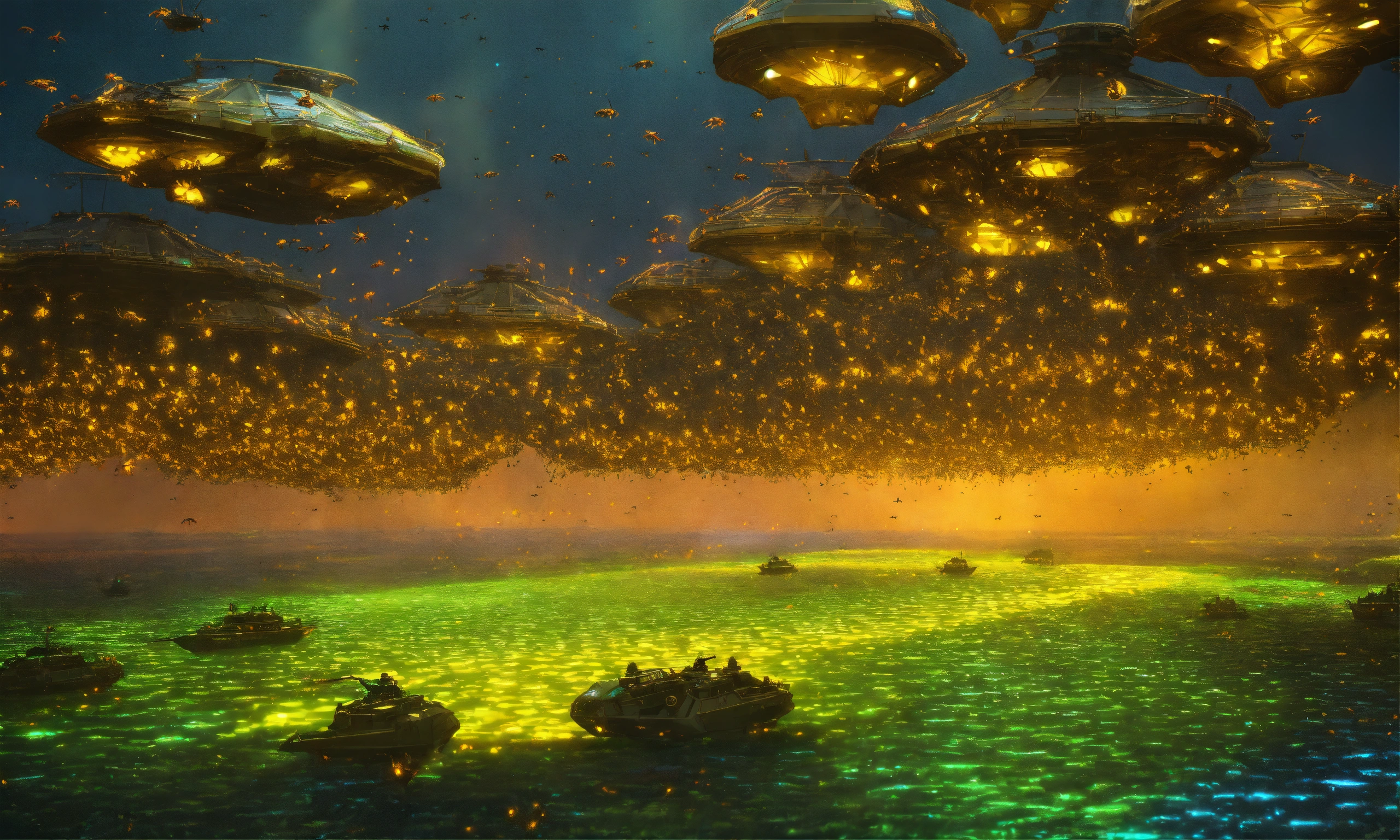 Holographic swarm of armored wasp insect like ships