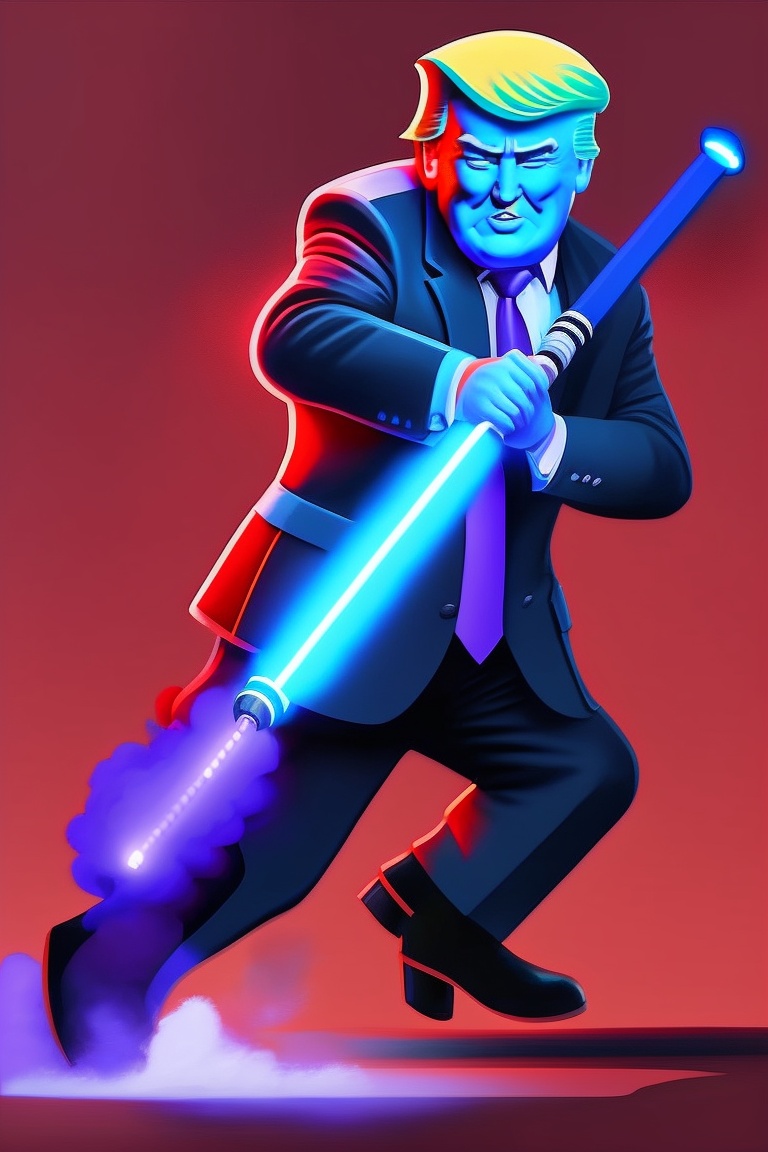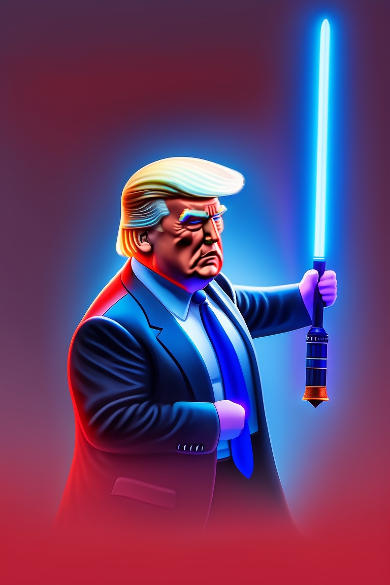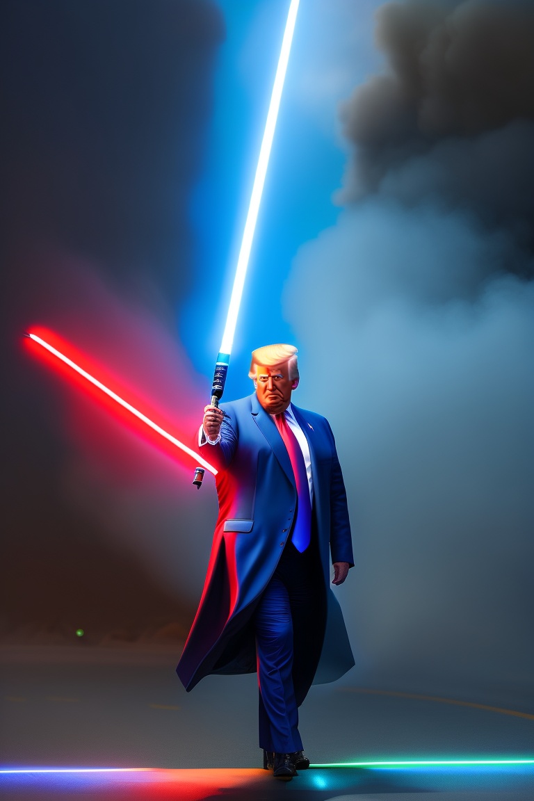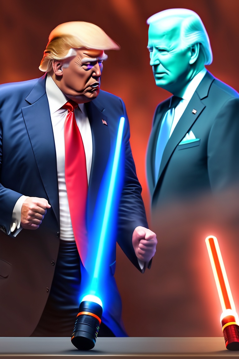 Donald trump, wielding a blue lightsaber, is battling against joe biden, who wields a red lightsaber.
