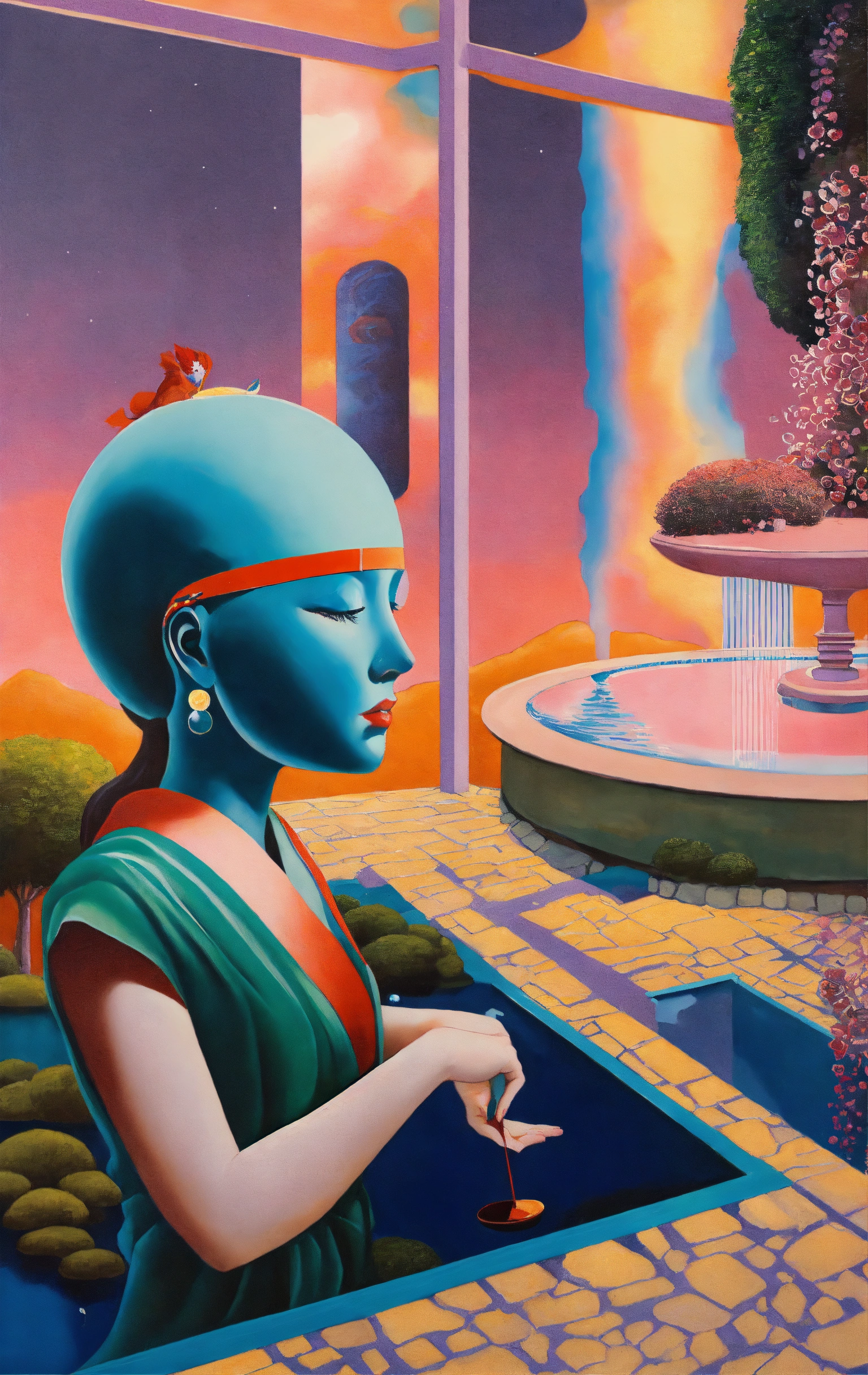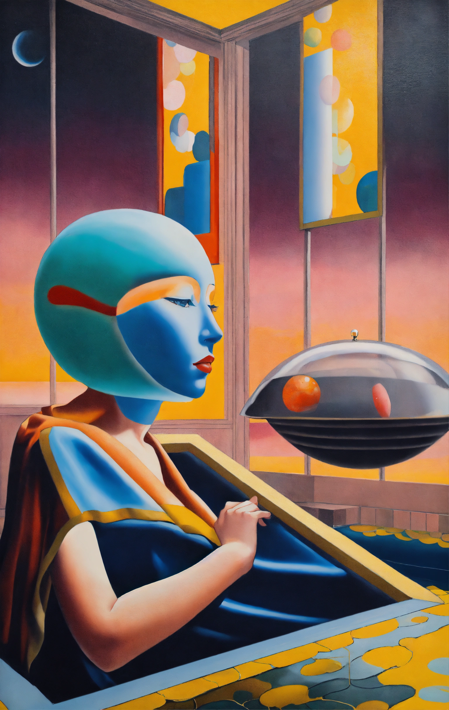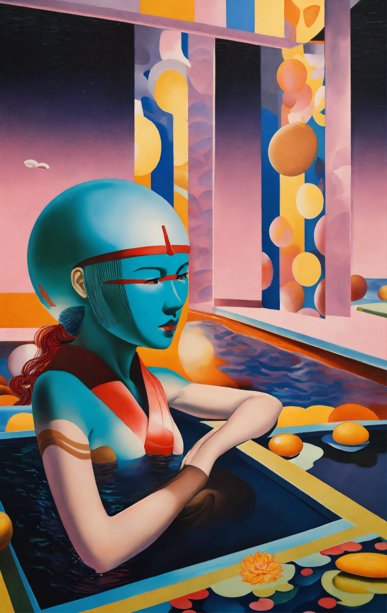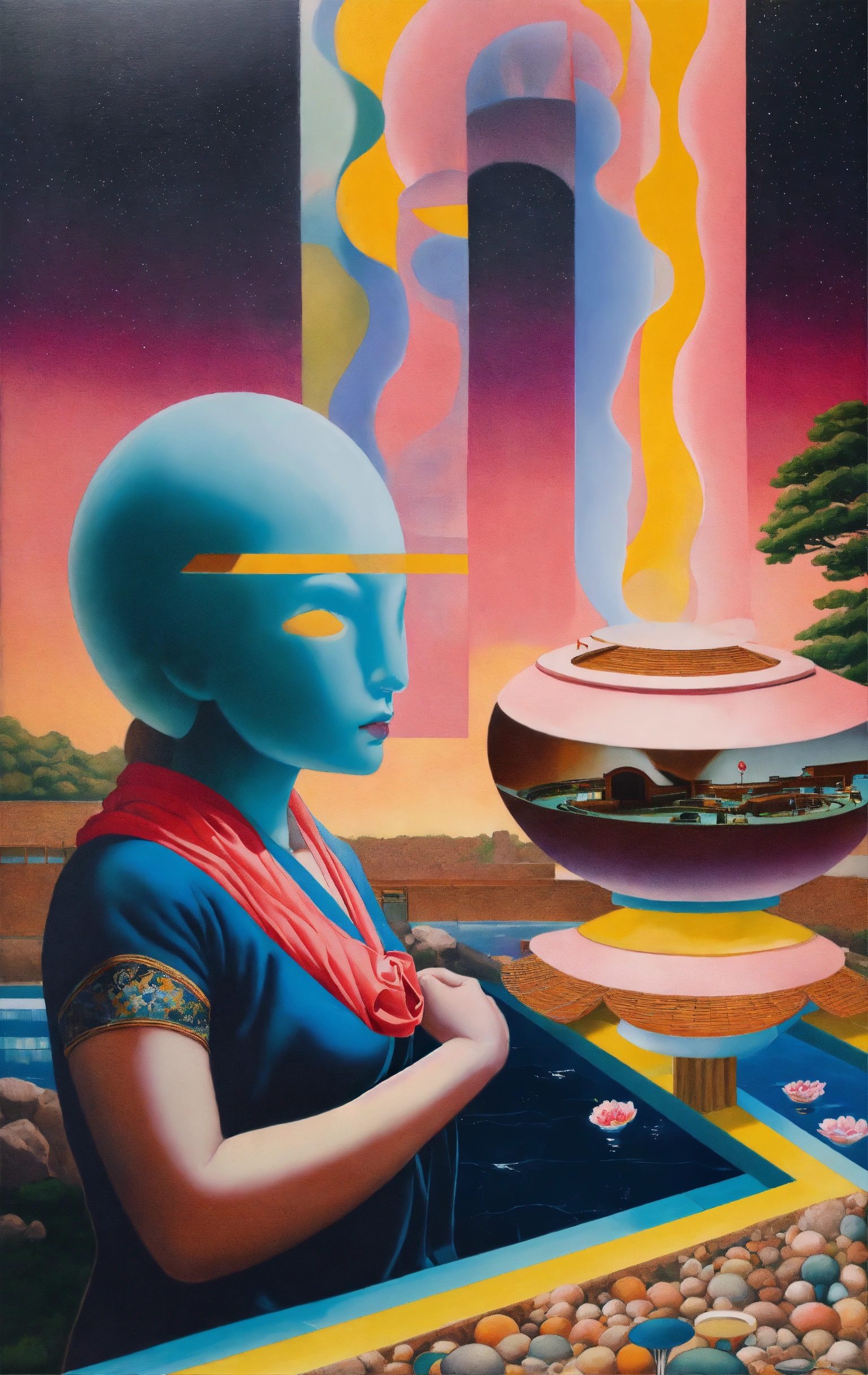 In a hyperrealistic optical illusion-based painting, the japanese venus offers a huge ufo to us and there is a swimming pool in her background, by rene magritte and raphael, a surrealistic setting, 64k cold colors, mute colors, optical illusion