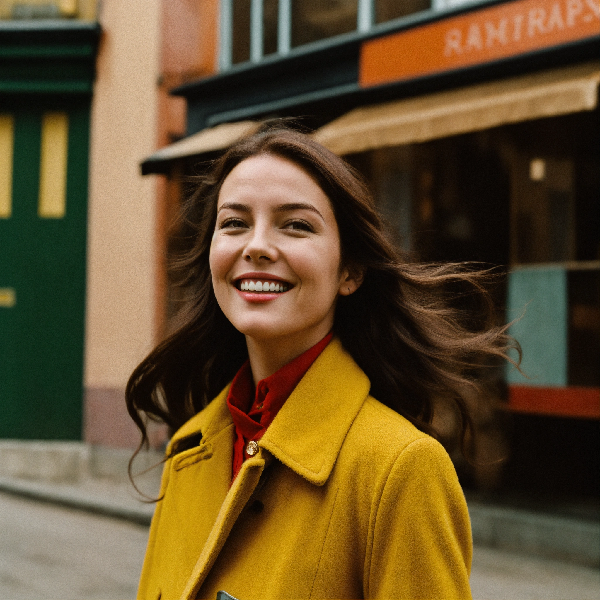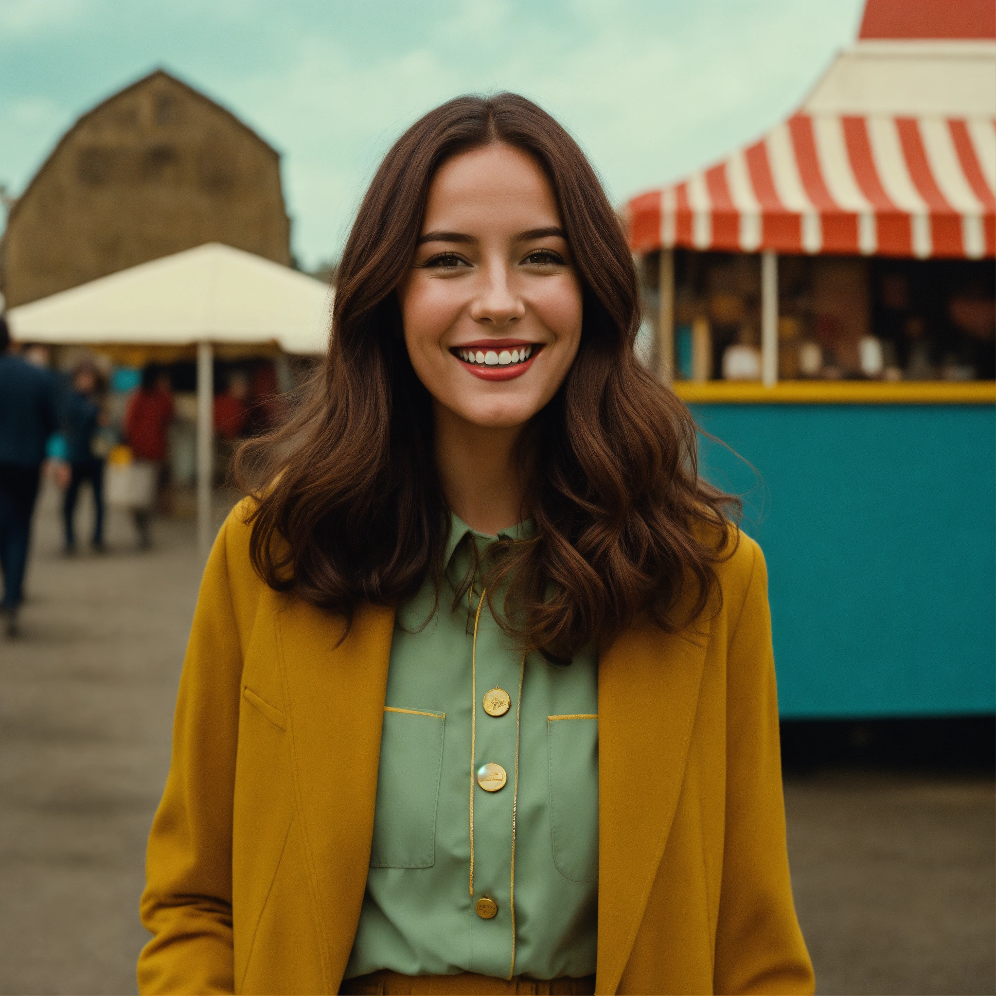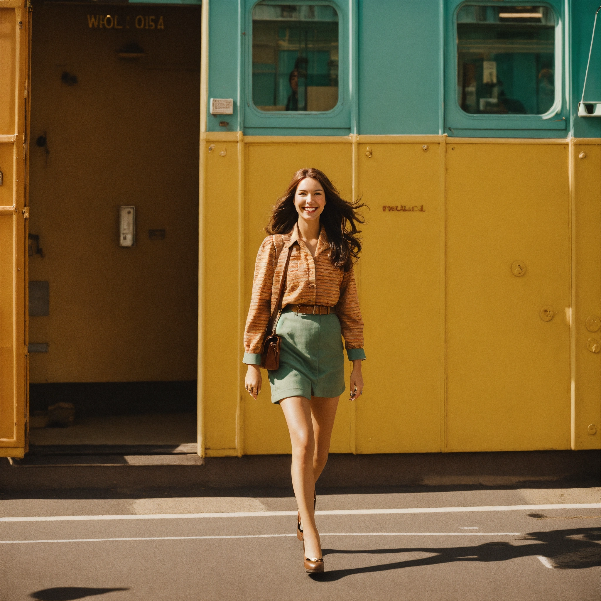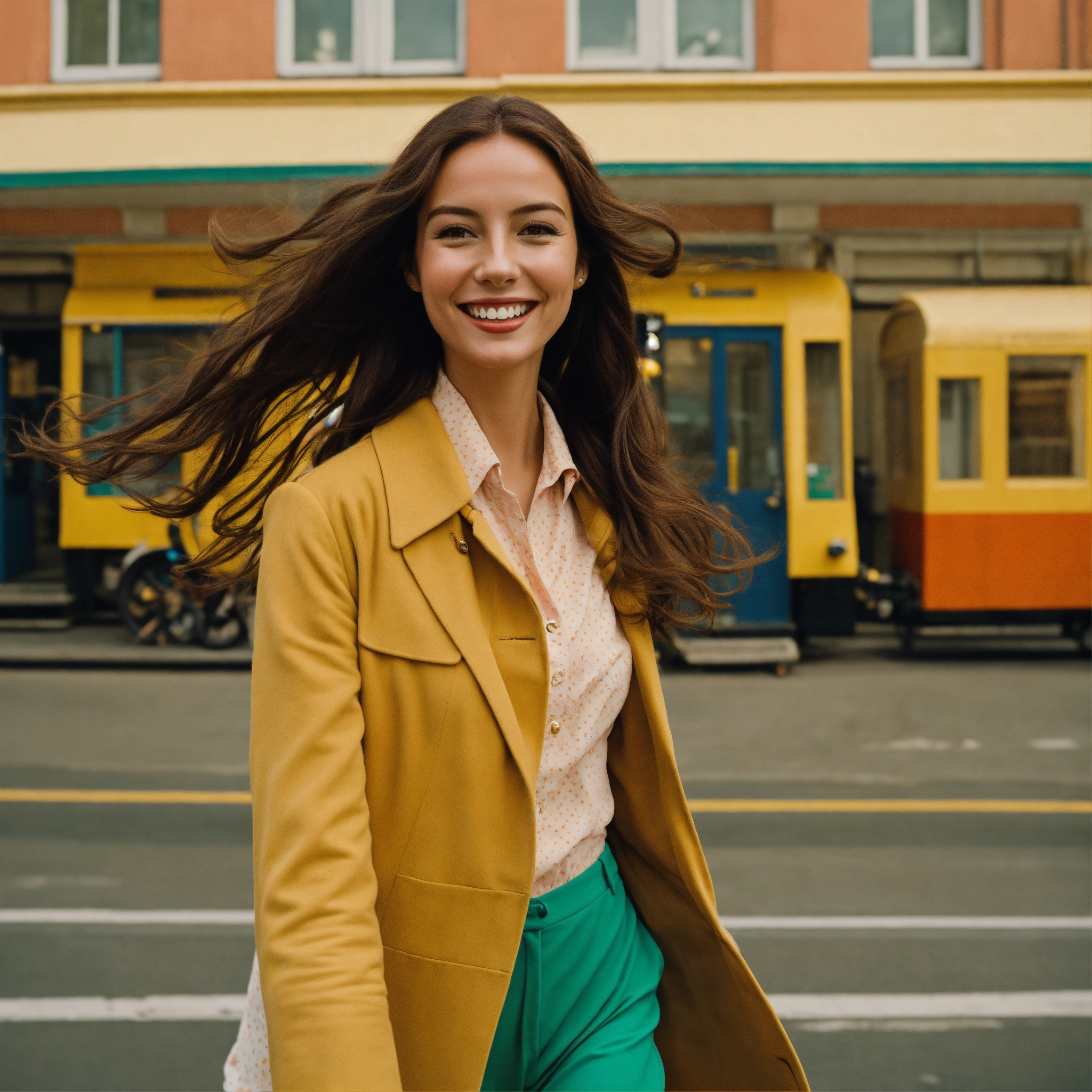 A photograph of a woman with long brown hair walking and smiling, wes anderson colour style, wide format