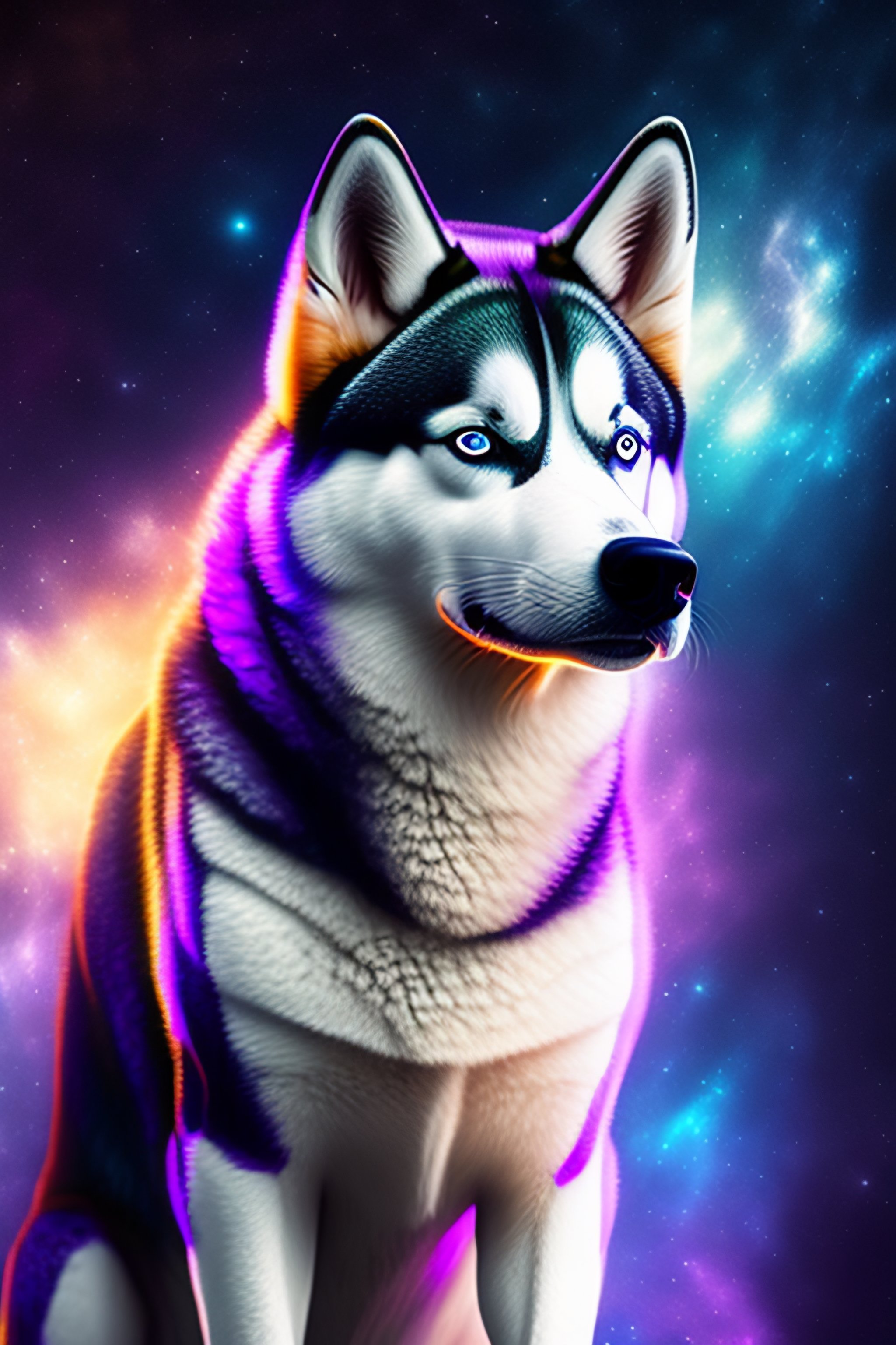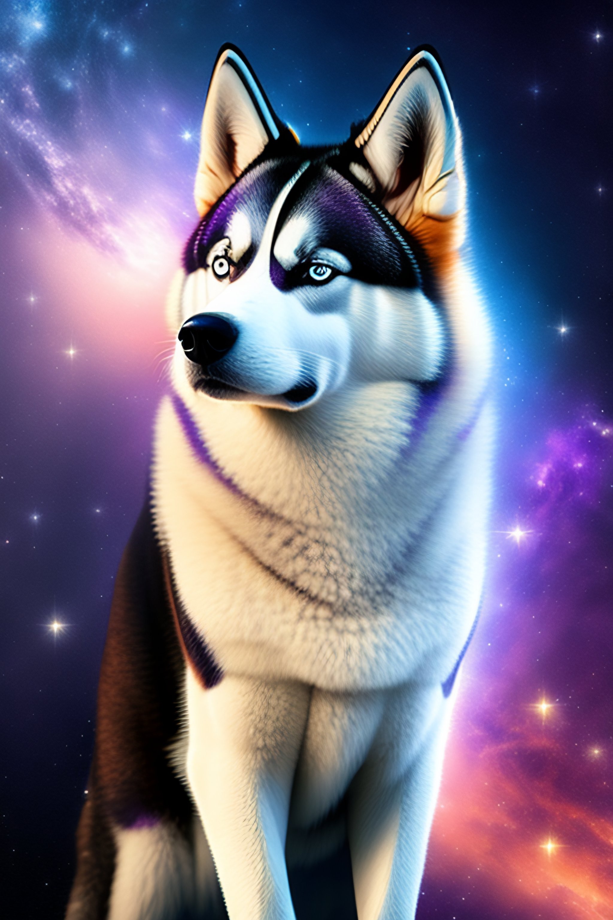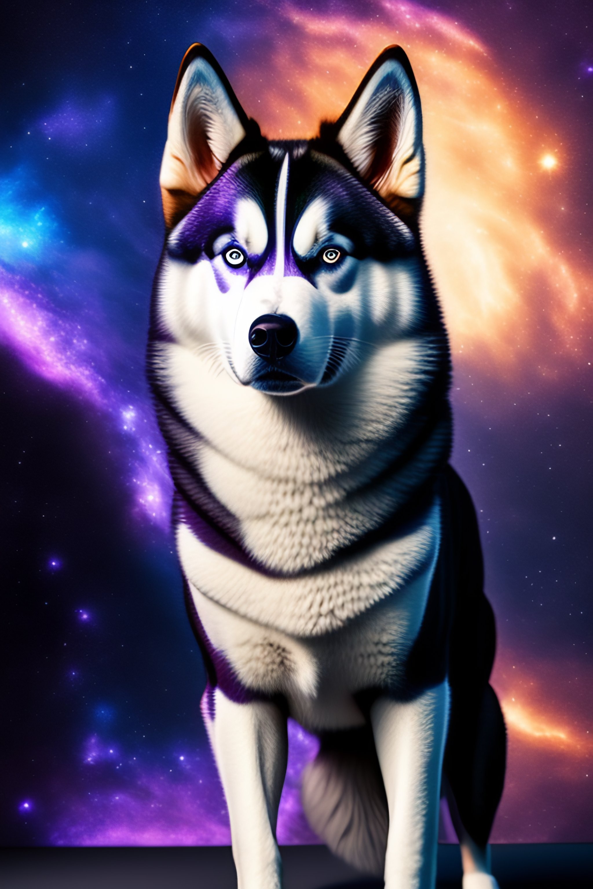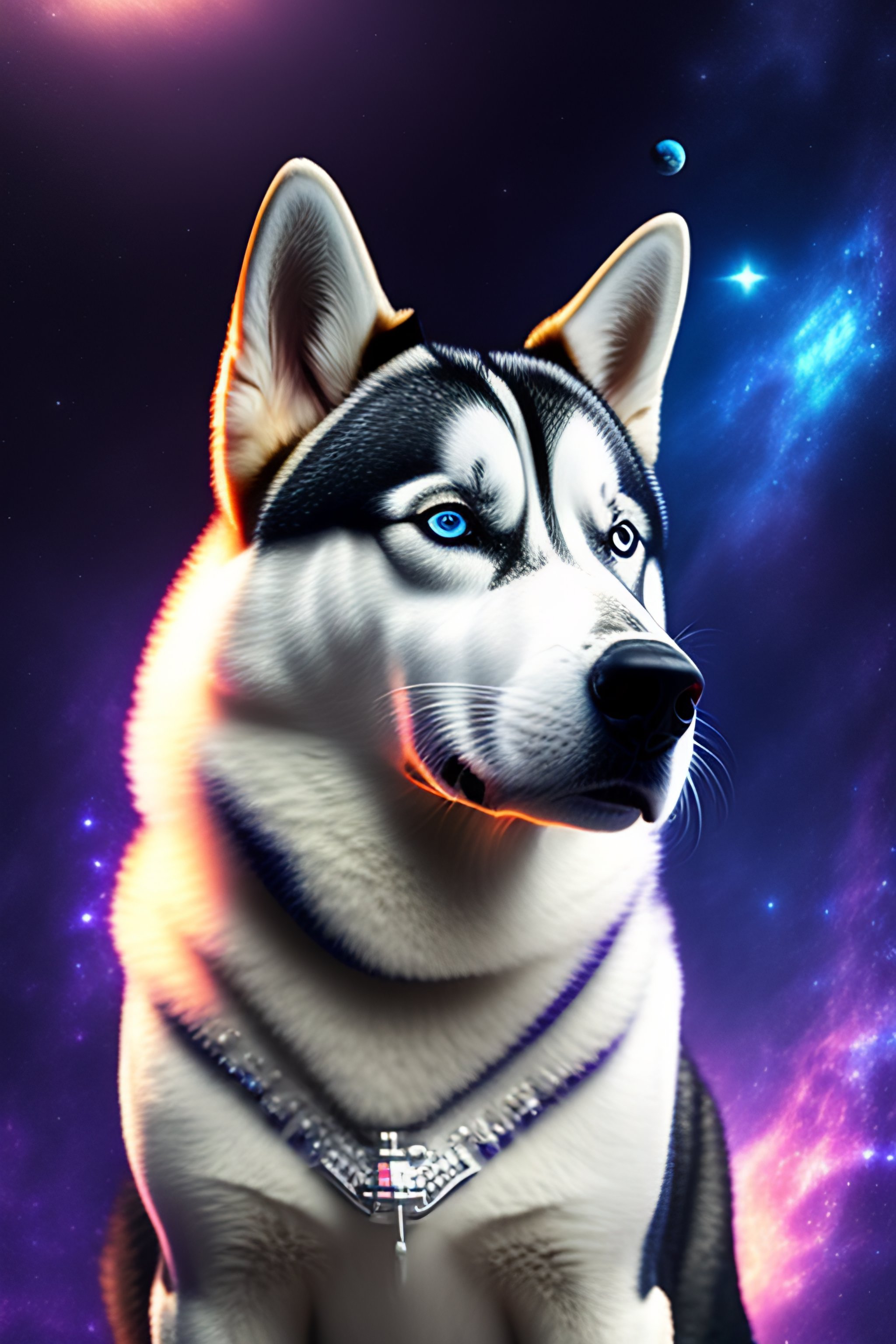 Husky in space, galaxy background, photo realistic, 3d, hyper realistic, highly detailed, studio lighting